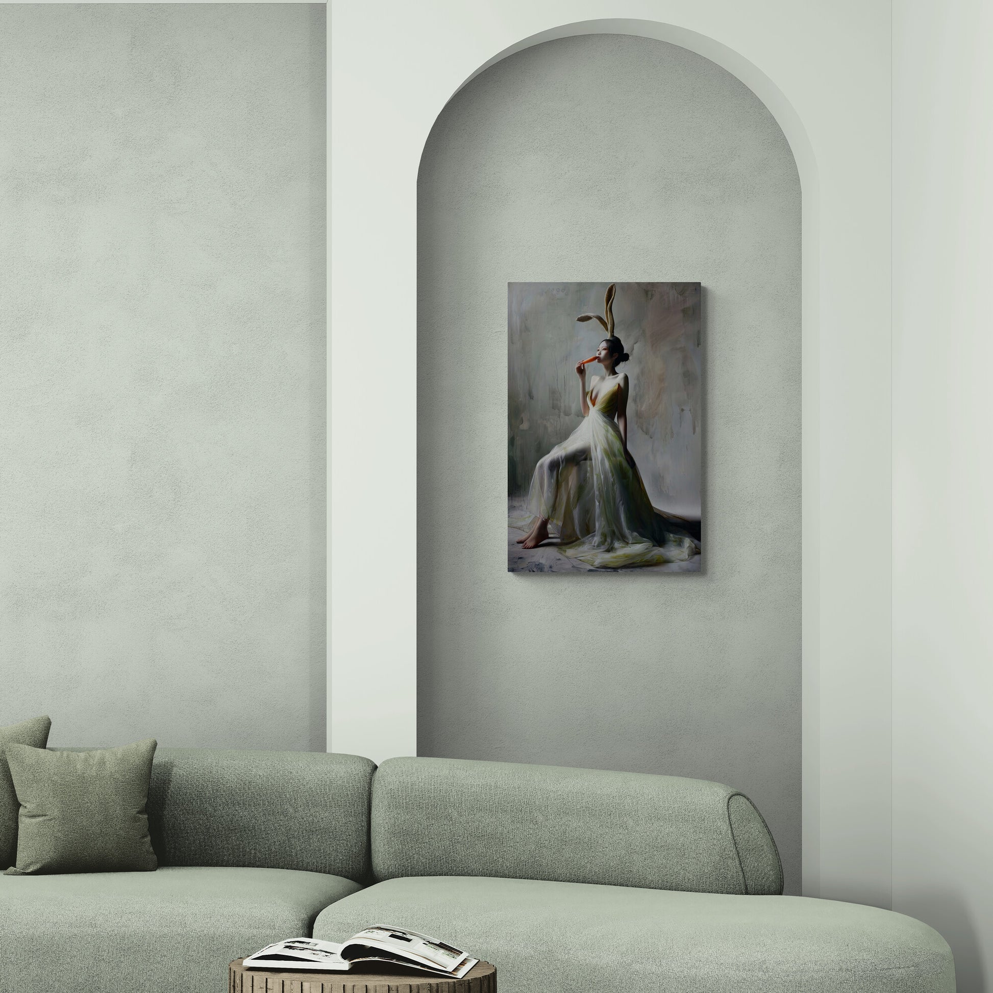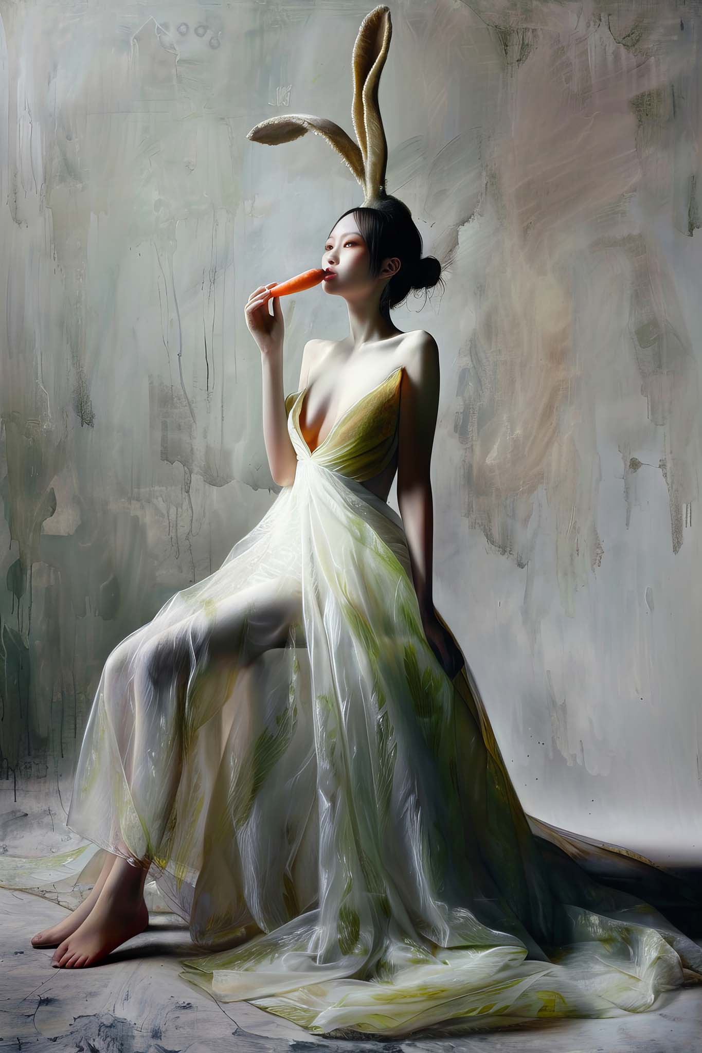 Eine stilisierte Frau in einem fließenden, durchscheinenden Kleid sitzt anmutig vor einer strukturierten Wand. Ihr elegantes Erscheinungsbild wird durch ein tief ausgeschnittenes Dekolleté und eine kunstvolle Pose betont. Auf dem Kopf trägt sie übergroße Hasenohren – eine ironische Anspielung auf die Osterhasenrolle. Mit geschlossenen Augen hält sie genüsslich eine Karotte an die Lippen – ein subtiler, fast humorvoller Kontrast zur ästhetischen Inszenierung. Die Farbpalette aus blassem Grün, Weiß und Beige schafft eine ätherische, fast malerische Atmosphäre.
