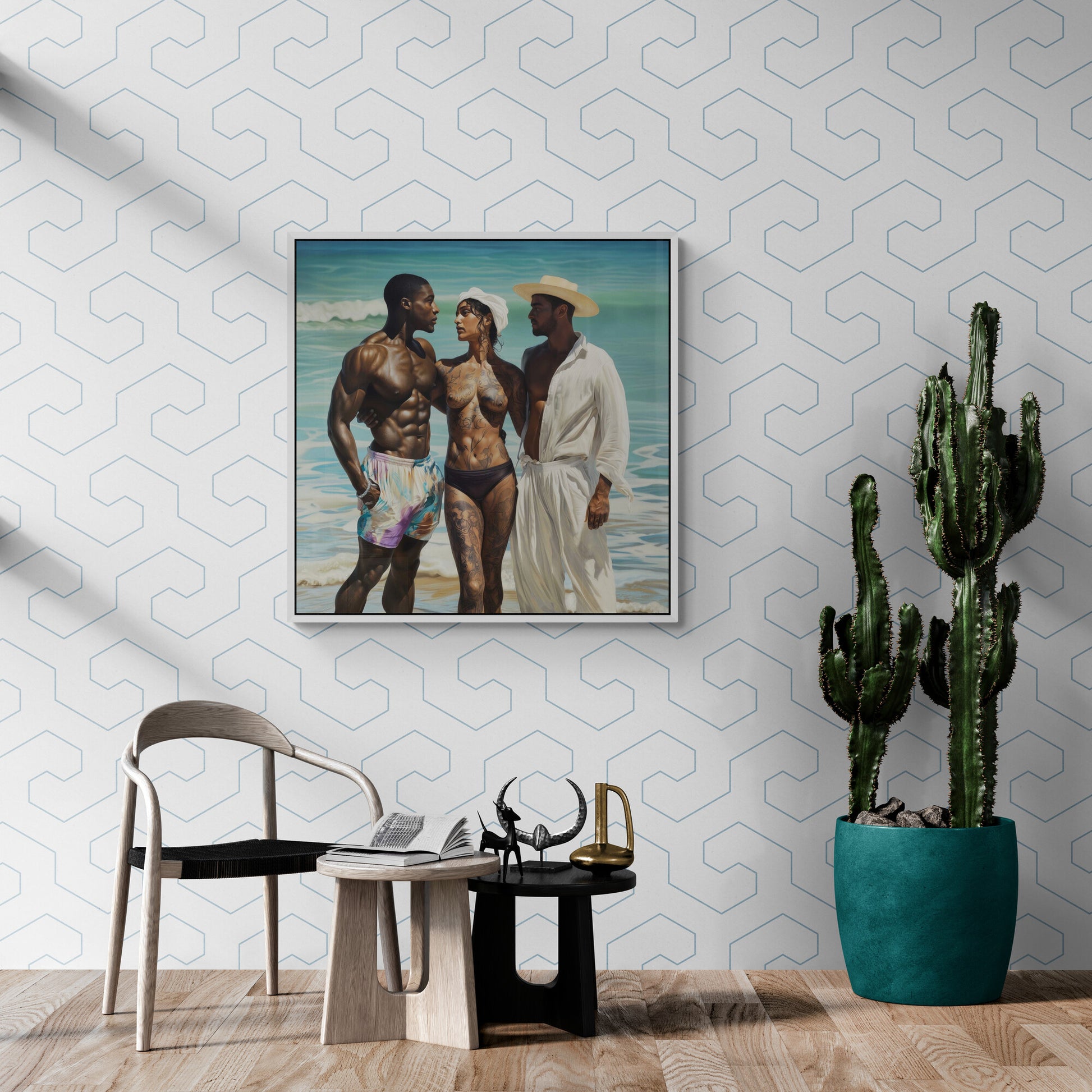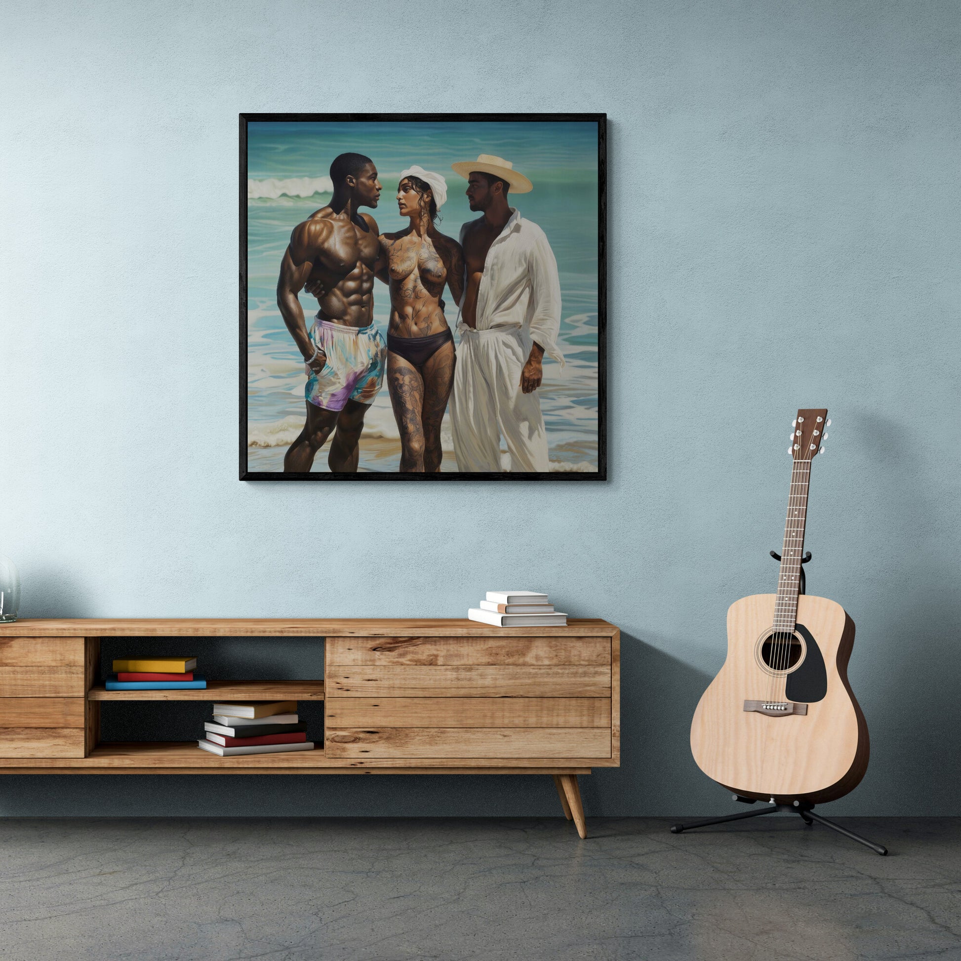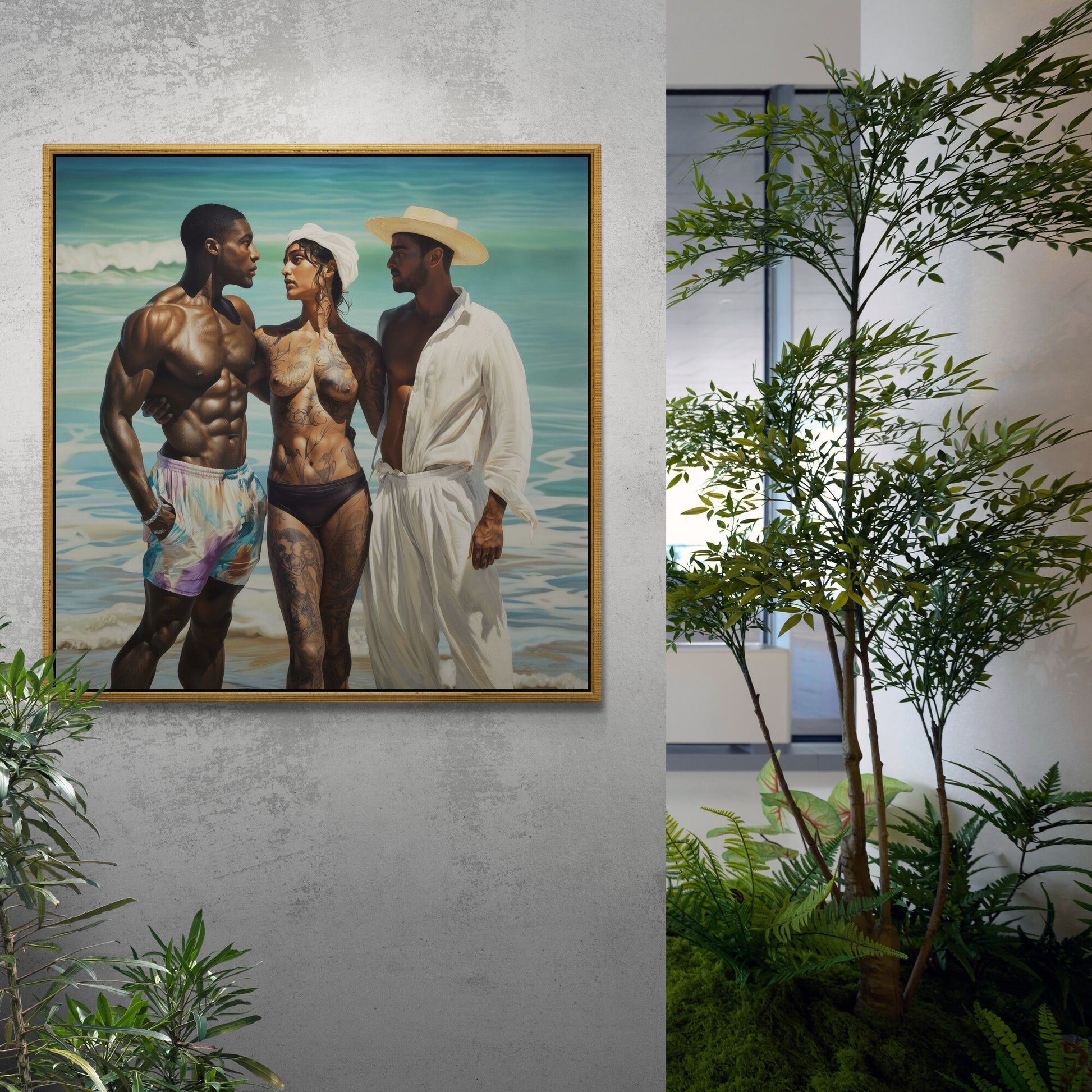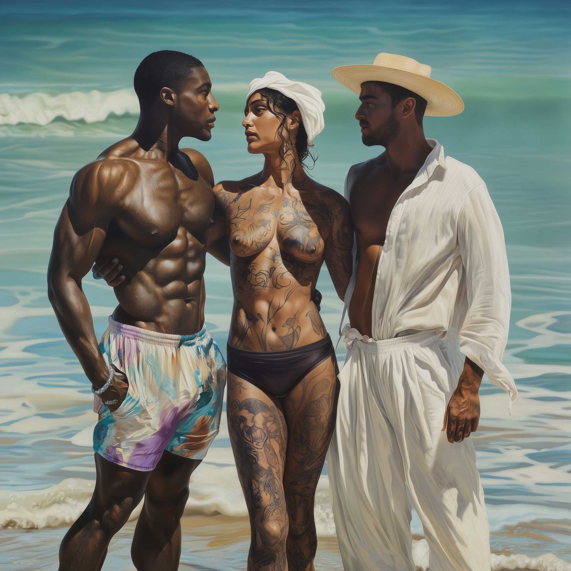 Drei stilvoll inszenierte Figuren stehen eng beieinander an einem sonnigen Strand. Links ein muskulöser Mann mit farbenfroher Badeshorts, mittig eine tätowierte Frau mit dunklem Bikinihöschen und weißem Kopftuch, rechts ein Mann in weiter weißer Sommerkleidung und Strohhut. Die Szene erinnert an Modefotografie der 60er-Jahre – durch Komposition, Farbgebung und das selbstbewusste Auftreten der Charaktere. Die Farben sind warm, das Licht weich, das Meer im Hintergrund ruhig. Ein Hauch Nostalgie trifft auf zeitgenössische Körperinszenierung.