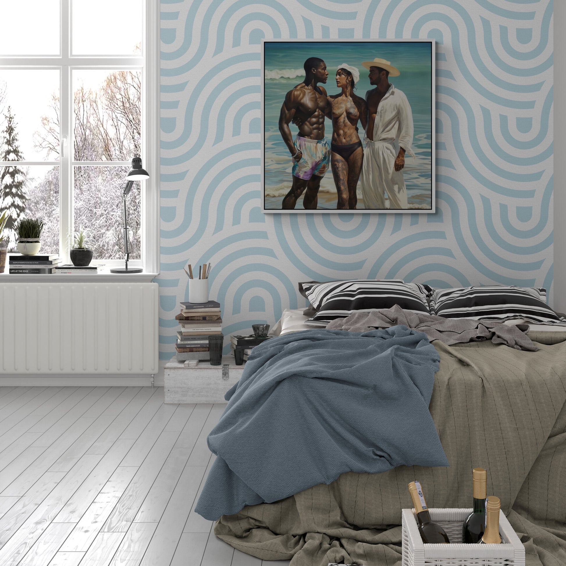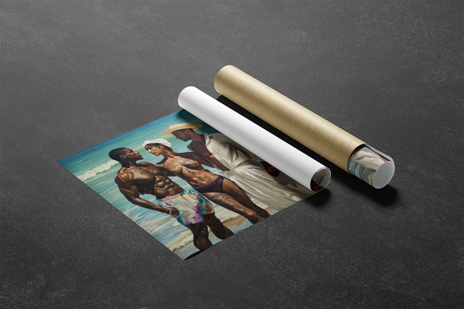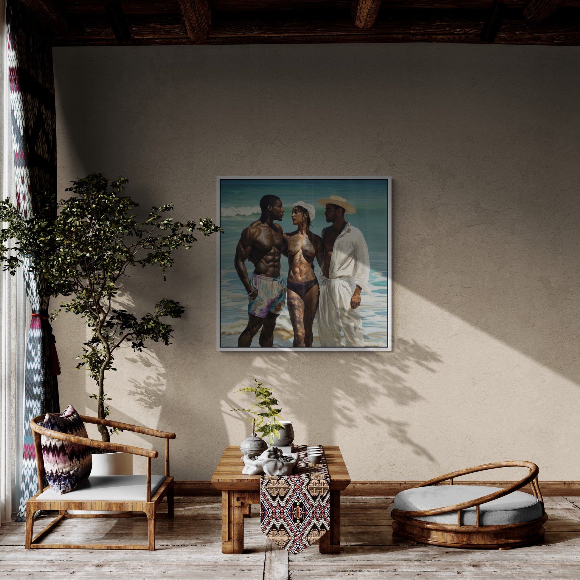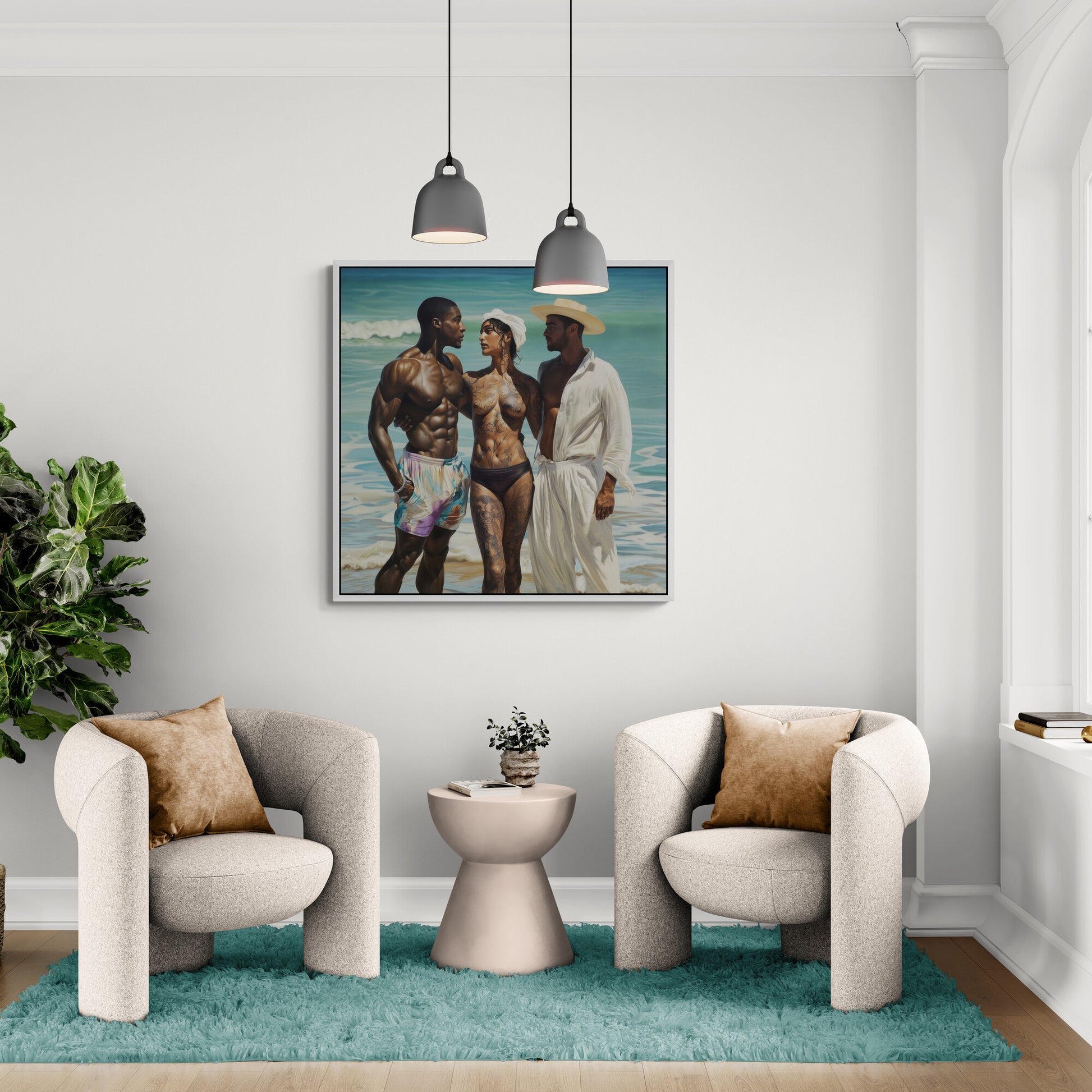 Drei stilvoll inszenierte Figuren stehen eng beieinander an einem sonnigen Strand. Links ein muskulöser Mann mit farbenfroher Badeshorts, mittig eine tätowierte Frau mit dunklem Bikinihöschen und weißem Kopftuch, rechts ein Mann in weiter weißer Sommerkleidung und Strohhut. Die Szene erinnert an Modefotografie der 60er-Jahre – durch Komposition, Farbgebung und das selbstbewusste Auftreten der Charaktere. Die Farben sind warm, das Licht weich, das Meer im Hintergrund ruhig. Ein Hauch Nostalgie trifft auf zeitgenössische Körperinszenierung.