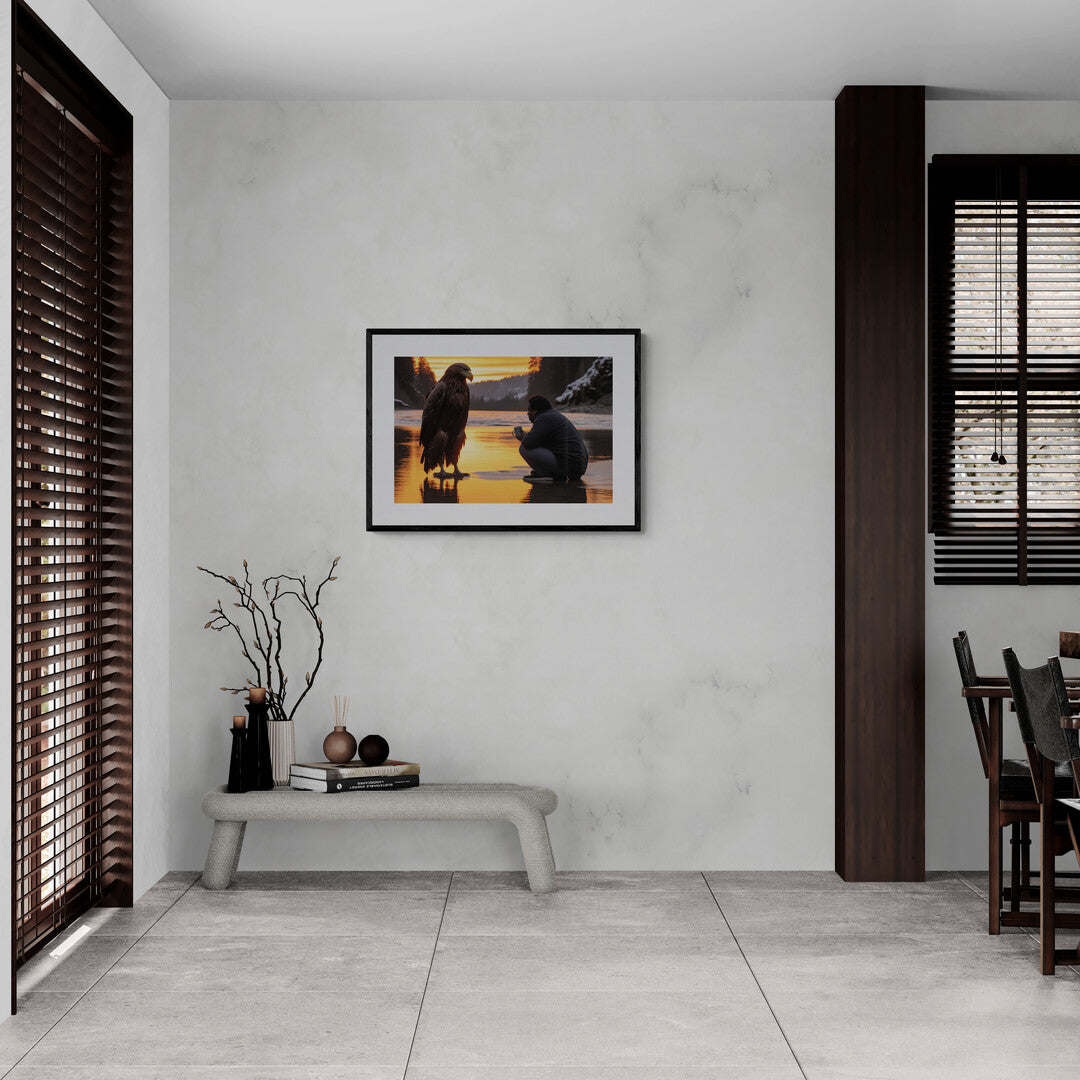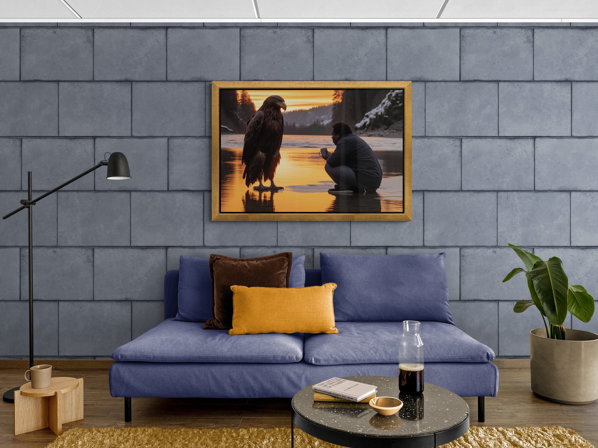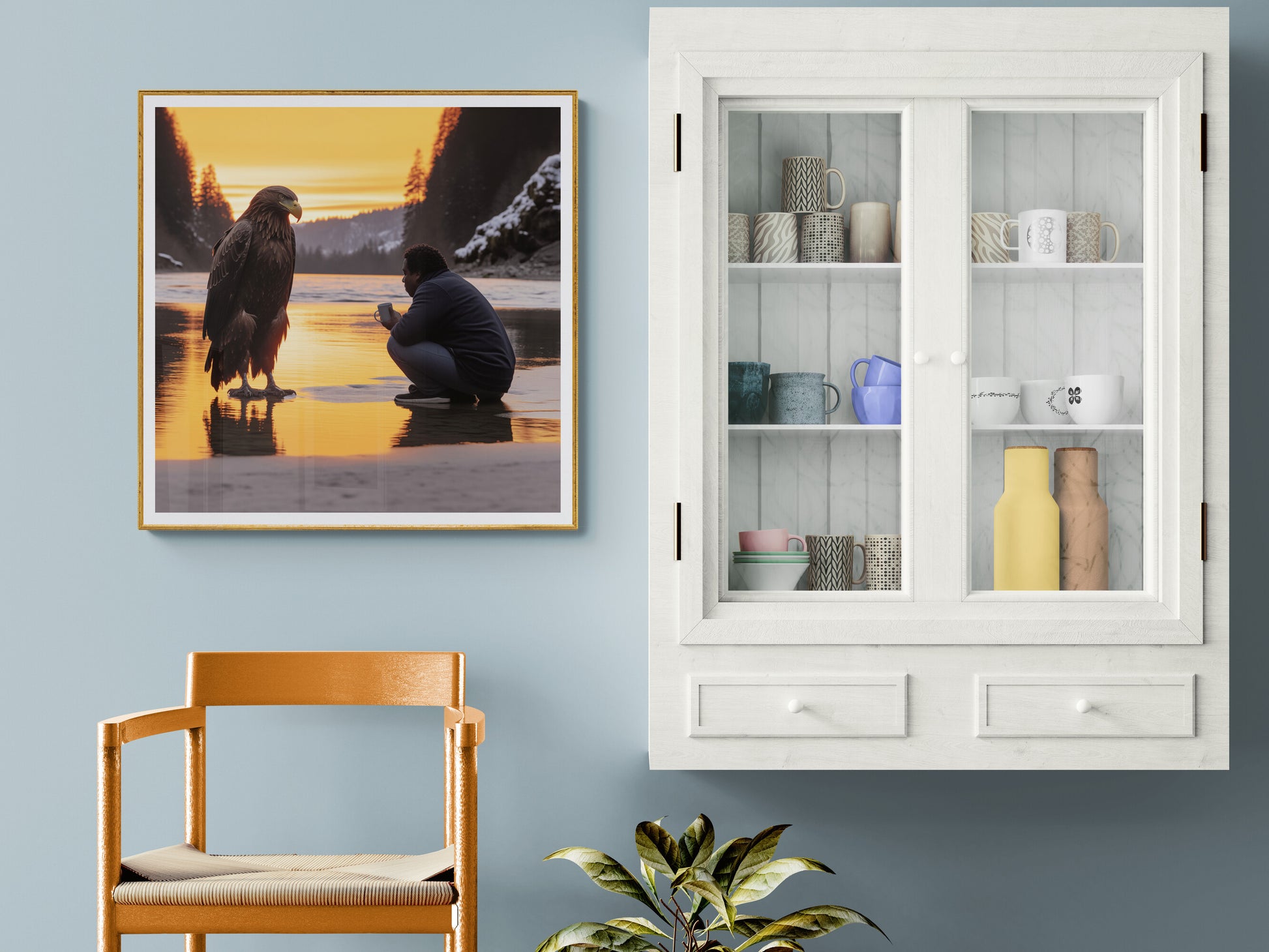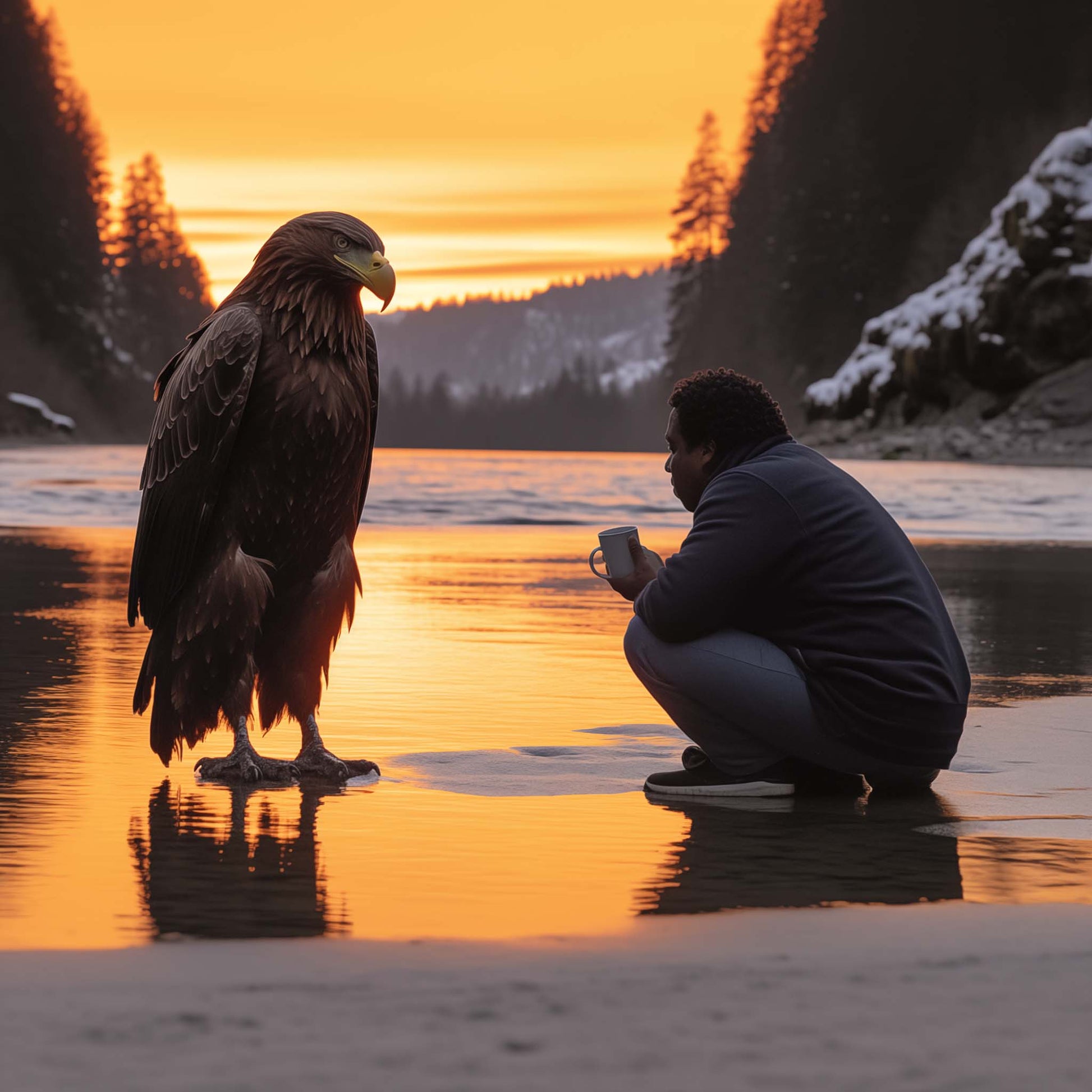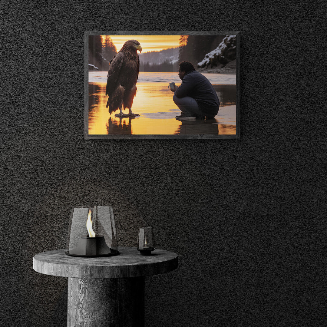 Ein majestätischer Adler steht im flachen Wasser eines ruhigen Sees, sein scharfer Blick trifft auf einen Buchhalter, der in die Hocke geht und seine erste Tasse in der Hand hält. Die warme Morgensonne taucht die Szenerie in goldene Farbtöne, während schneebedeckte Felsen und dichte Wälder im Hintergrund eine fast surreale Atmosphäre schaffen. Die Spiegelung im Wasser verstärkt die geheimnisvolle Stimmung und lässt den Moment zeitlos erscheinen. Auch quadratisch erhältlich.