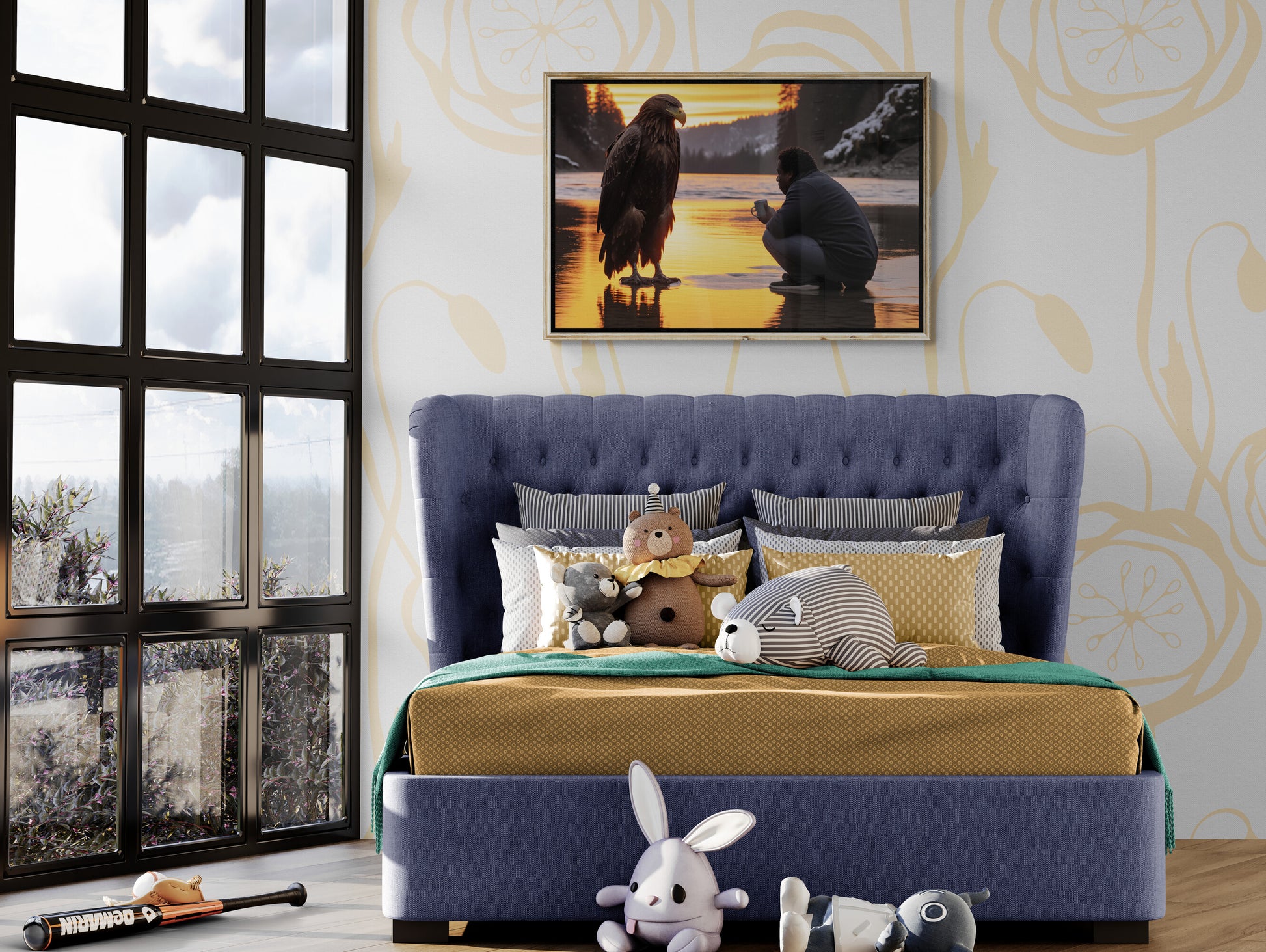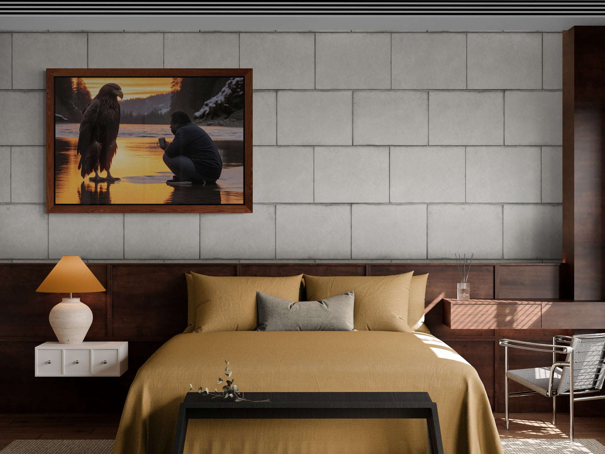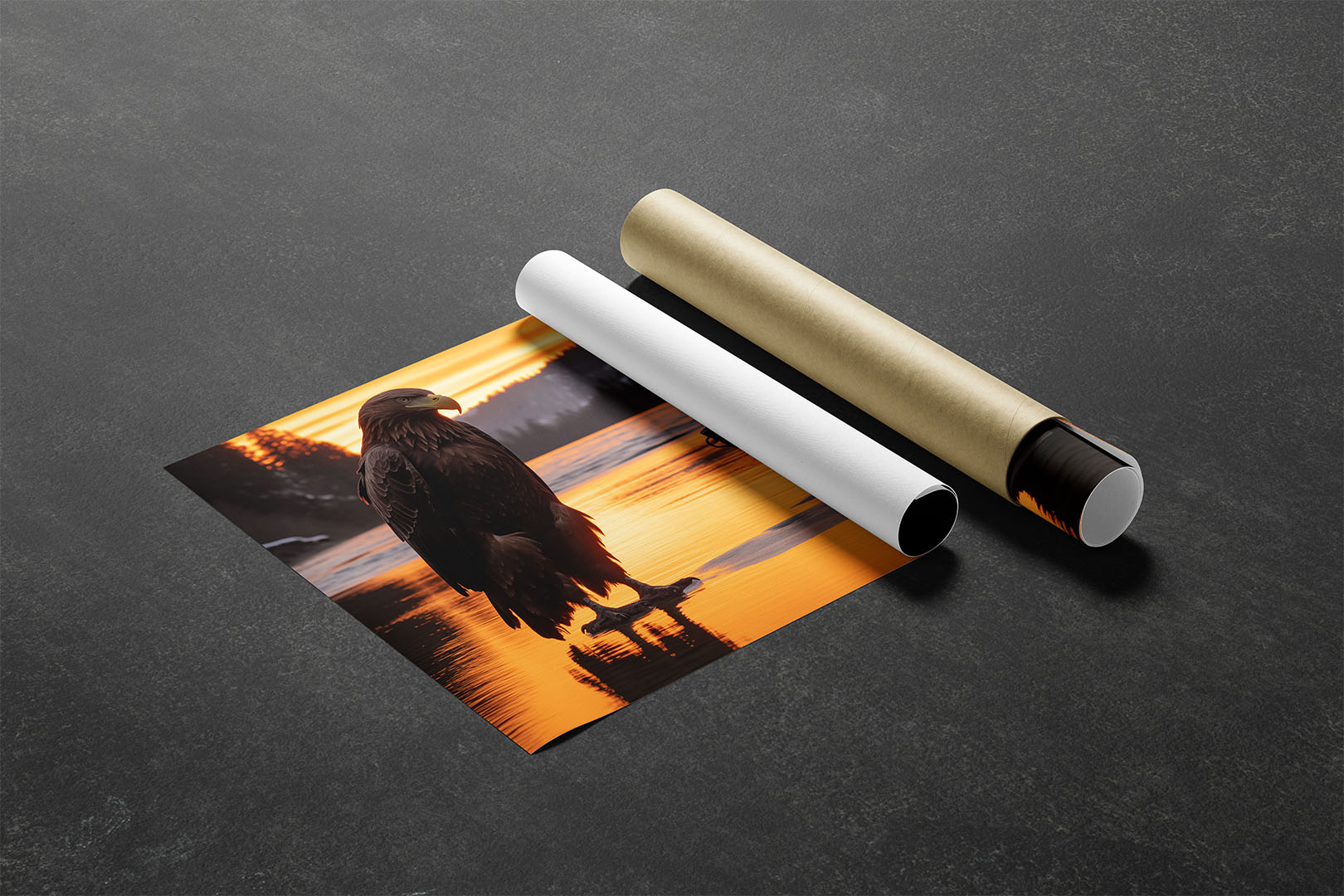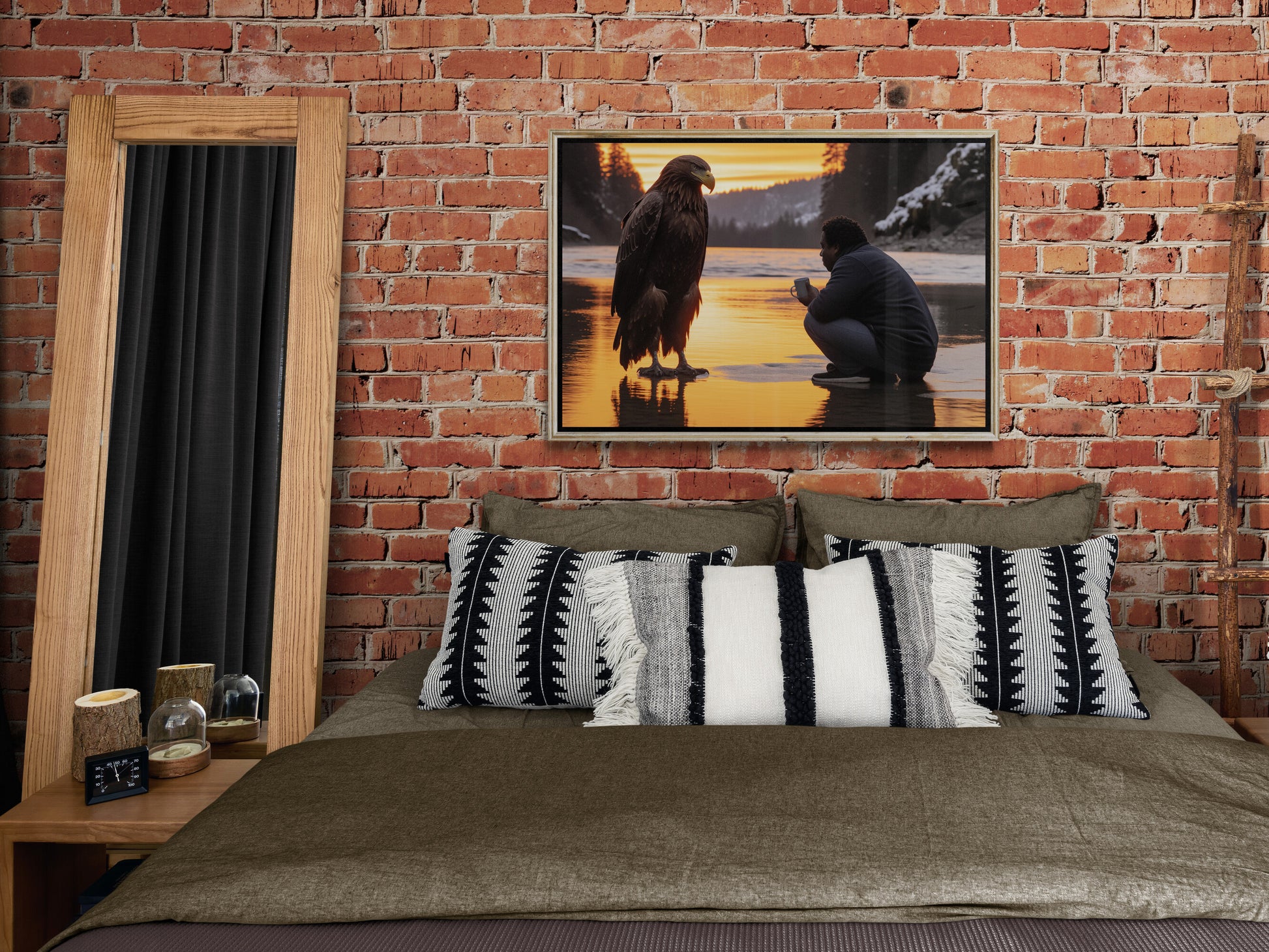 Ein majestätischer Adler steht im flachen Wasser eines ruhigen Sees, sein scharfer Blick trifft auf einen Buchhalter, der in die Hocke geht und seine erste Tasse in der Hand hält. Die warme Morgensonne taucht die Szenerie in goldene Farbtöne, während schneebedeckte Felsen und dichte Wälder im Hintergrund eine fast surreale Atmosphäre schaffen. Die Spiegelung im Wasser verstärkt die geheimnisvolle Stimmung und lässt den Moment zeitlos erscheinen. Auch quadratisch erhältlich.