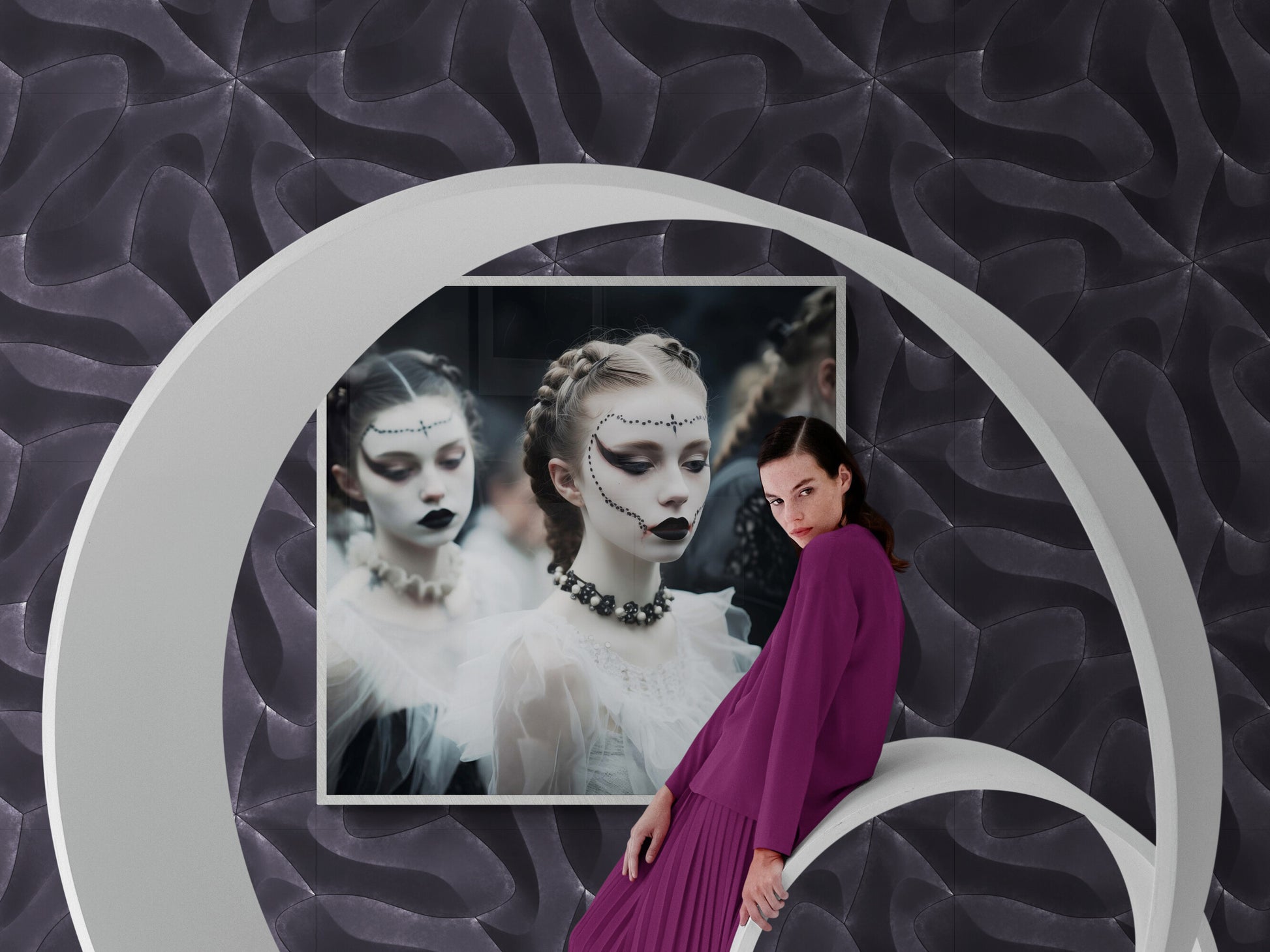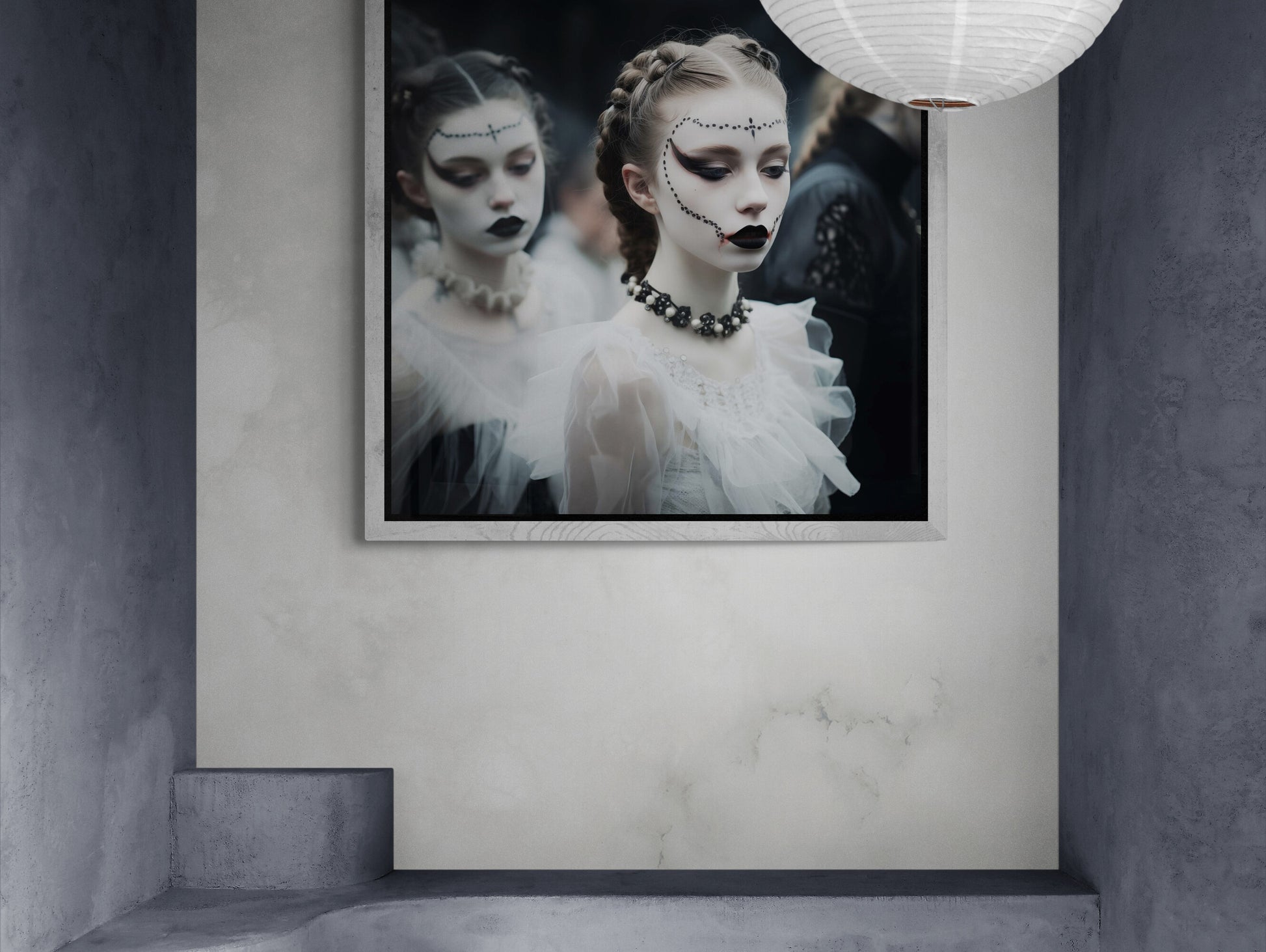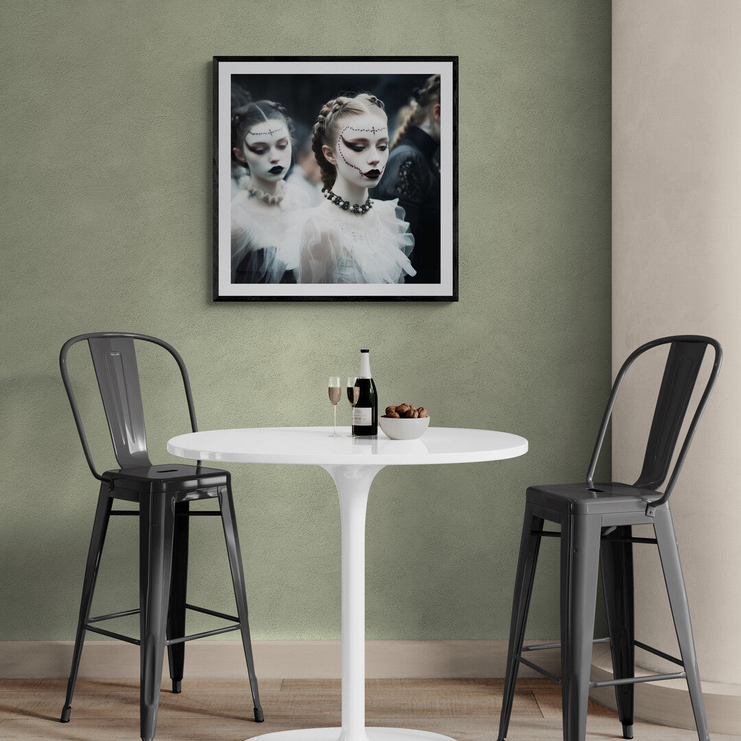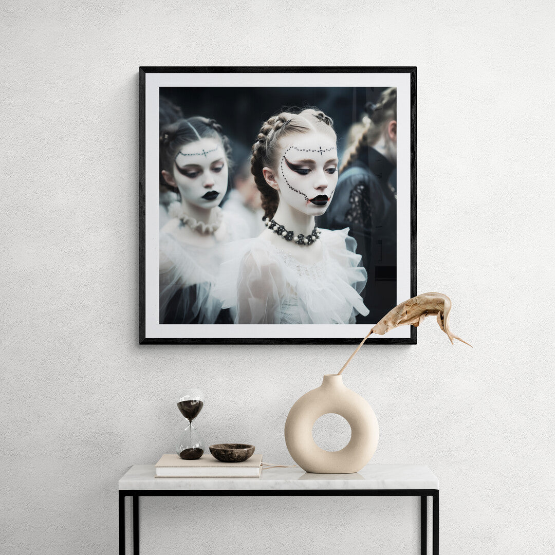 Eine junge Frau mit kunstvoll geschminktem Gesicht steht im Mittelpunkt dieser düsteren, ästhetischen Szene. Ihre bleiche Haut wird von dunklem Make-up kontrastiert – schwarze Lippen, dramatisch betonte Augen und filigrane Perlenverzierungen, die ihr Gesicht umrahmen. Ihr Haar ist kunstvoll zu Zöpfen geflochten, während ein schwarzes Choker-Kollier mit Perlen ihr elegantes Outfit ergänzt. Im Hintergrund verschwimmen weitere Gestalten in viktorianisch inspirierten Gewändern, gehüllt in Schwarz und Weiß. Die Atmosphäre ist geheimnisvoll, fast theatralisch, als wäre diese Szene einem gotischen Traum entsprungen.