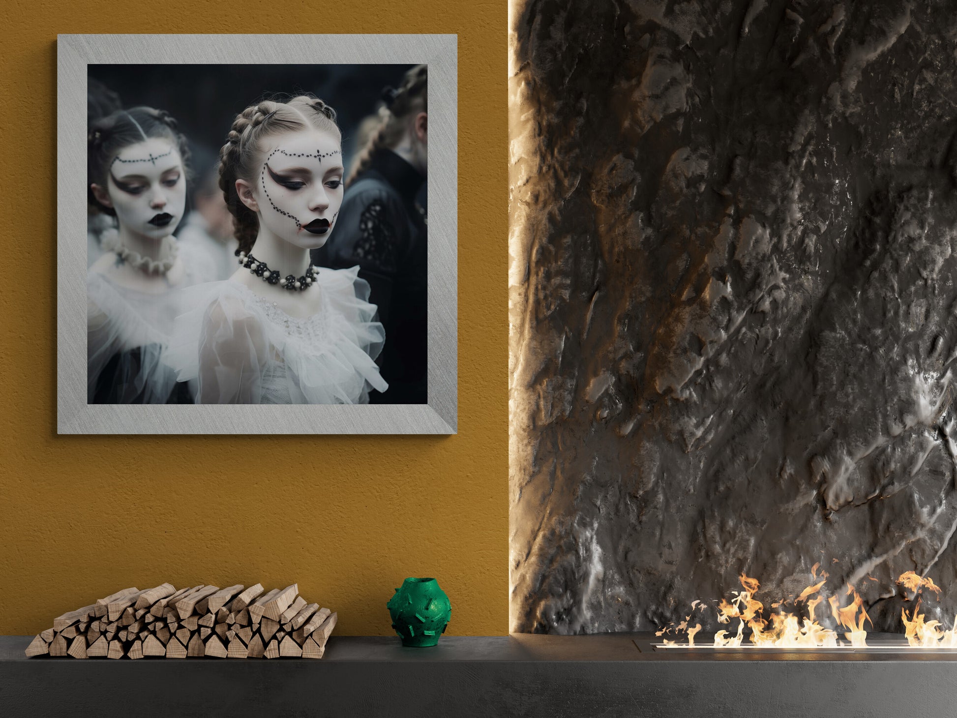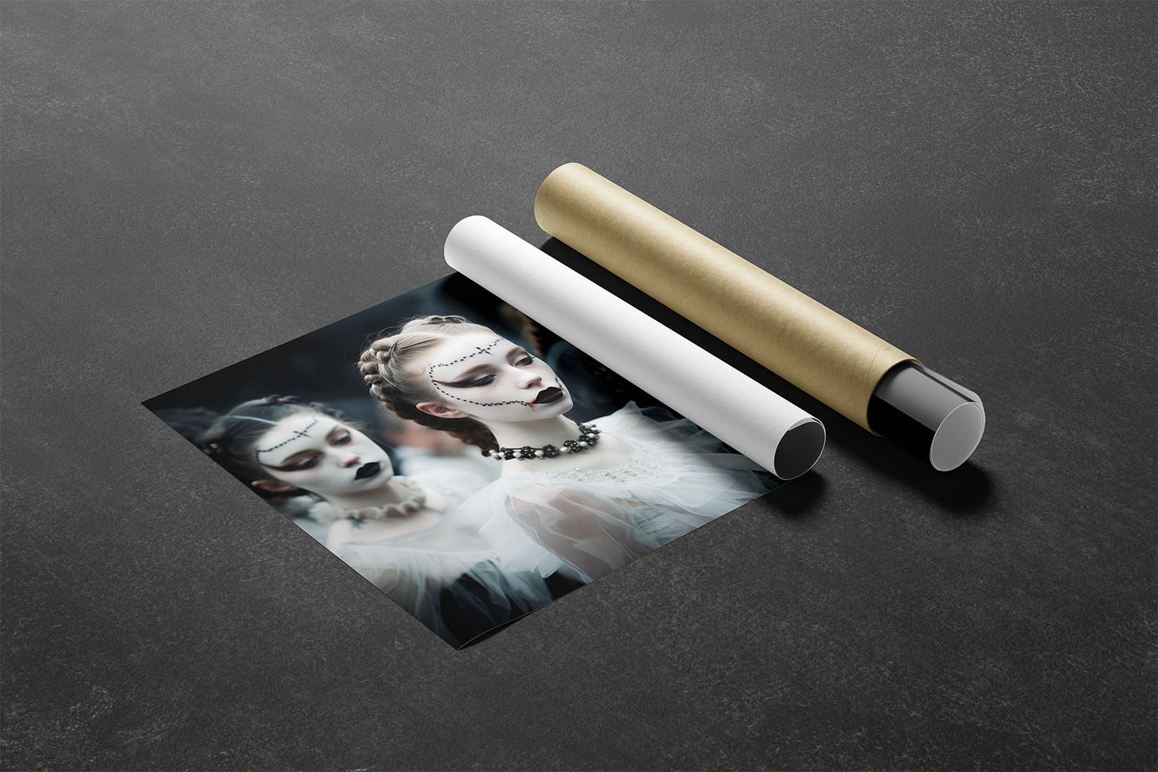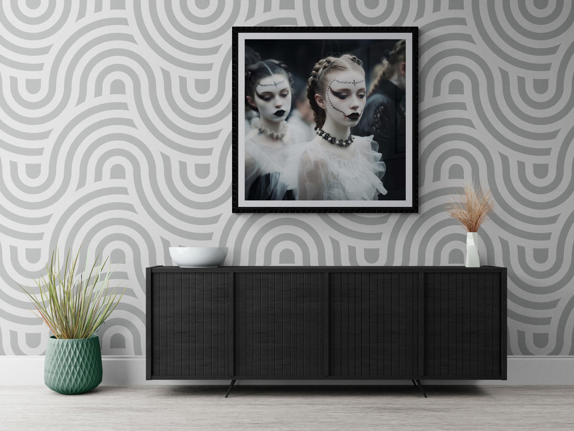 Eine junge Frau mit kunstvoll geschminktem Gesicht steht im Mittelpunkt dieser düsteren, ästhetischen Szene. Ihre bleiche Haut wird von dunklem Make-up kontrastiert – schwarze Lippen, dramatisch betonte Augen und filigrane Perlenverzierungen, die ihr Gesicht umrahmen. Ihr Haar ist kunstvoll zu Zöpfen geflochten, während ein schwarzes Choker-Kollier mit Perlen ihr elegantes Outfit ergänzt. Im Hintergrund verschwimmen weitere Gestalten in viktorianisch inspirierten Gewändern, gehüllt in Schwarz und Weiß. Die Atmosphäre ist geheimnisvoll, fast theatralisch, als wäre diese Szene einem gotischen Traum entsprungen.