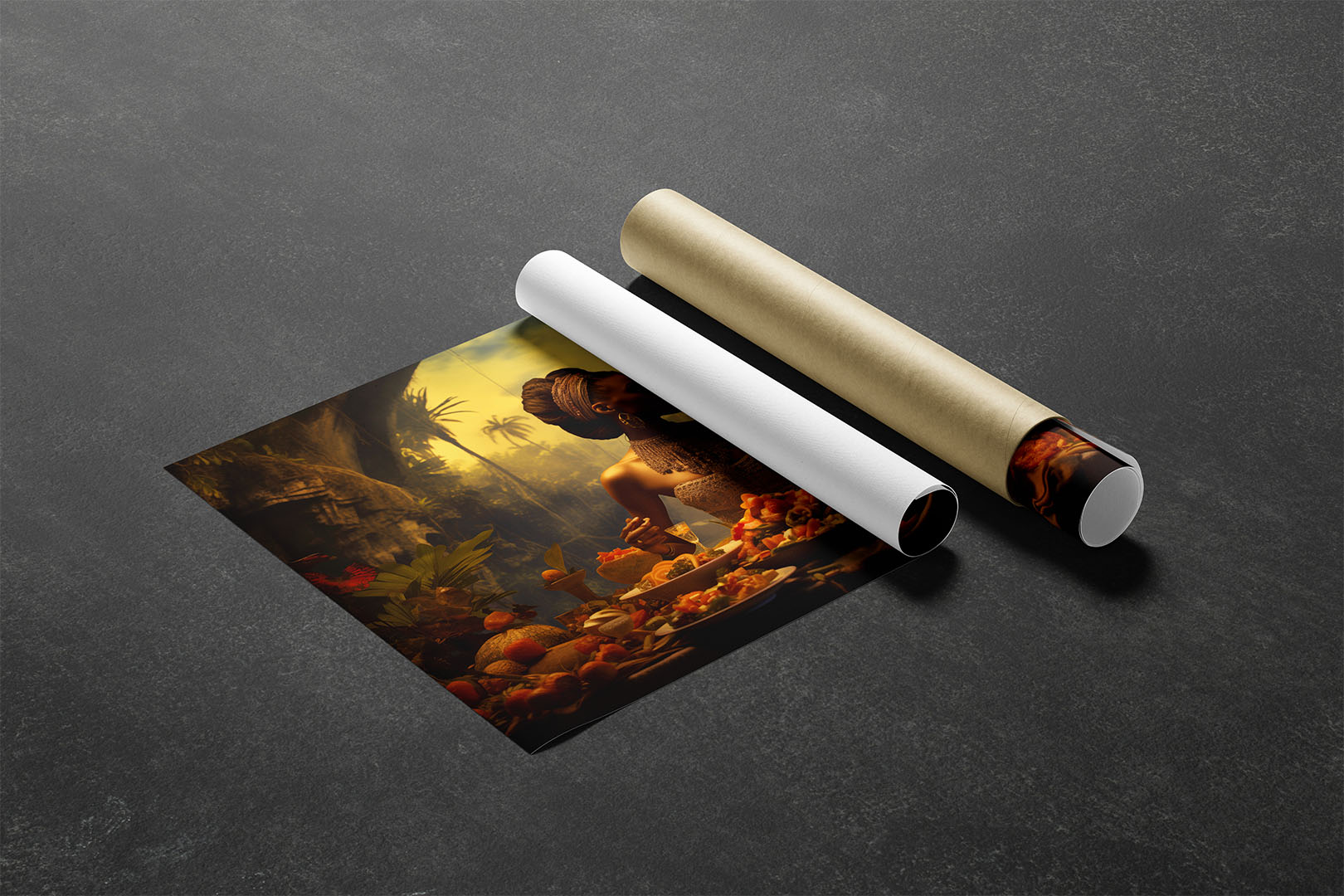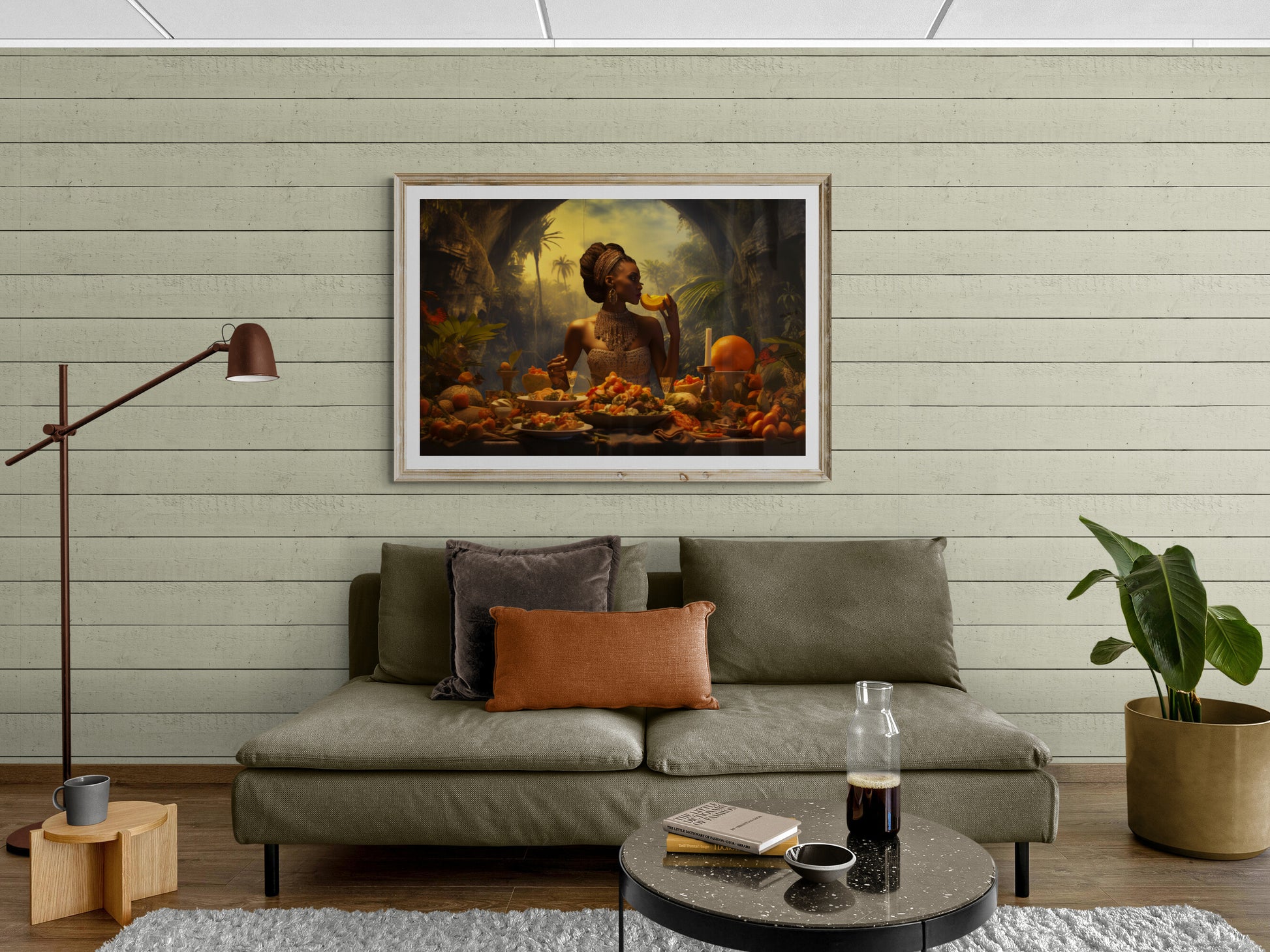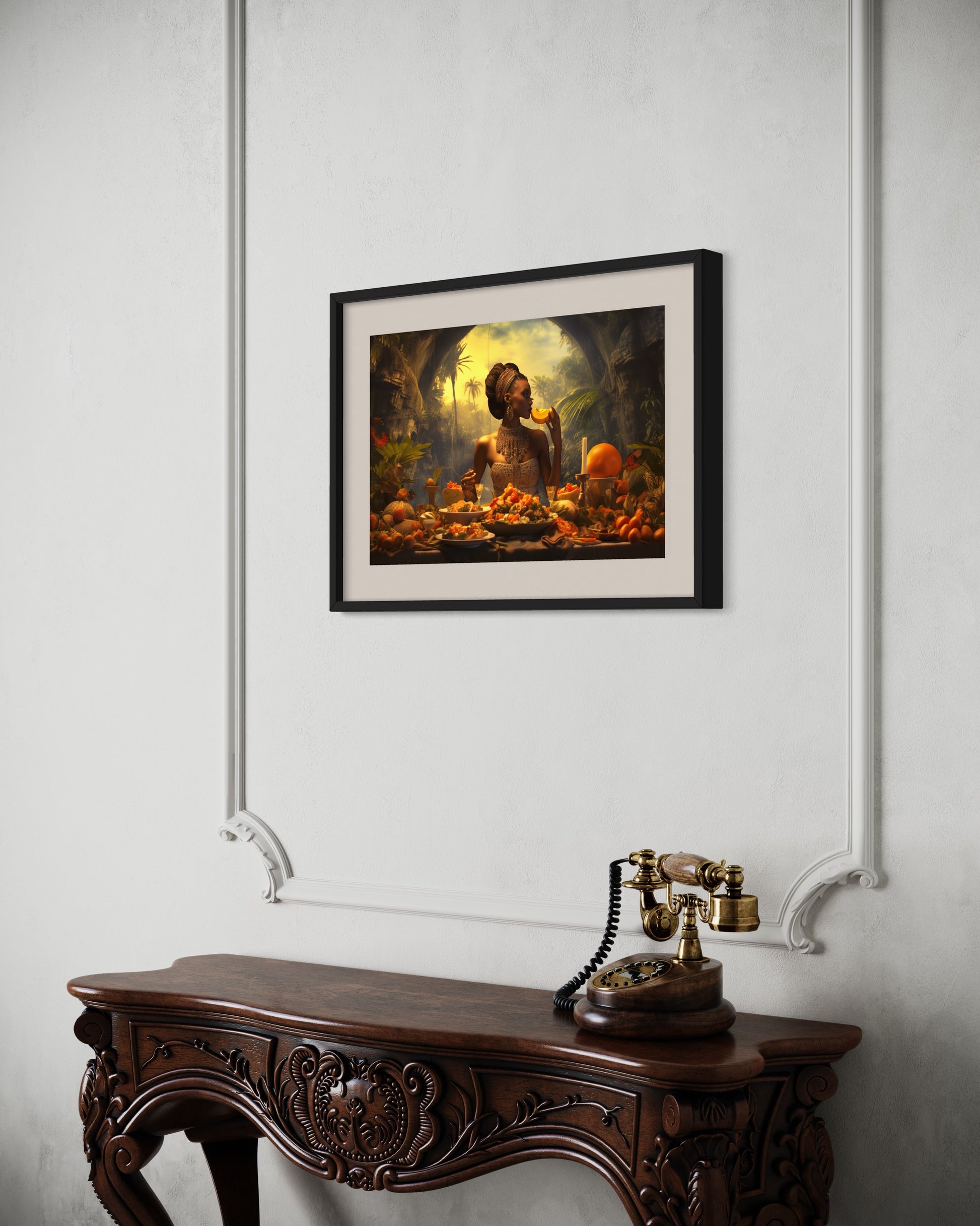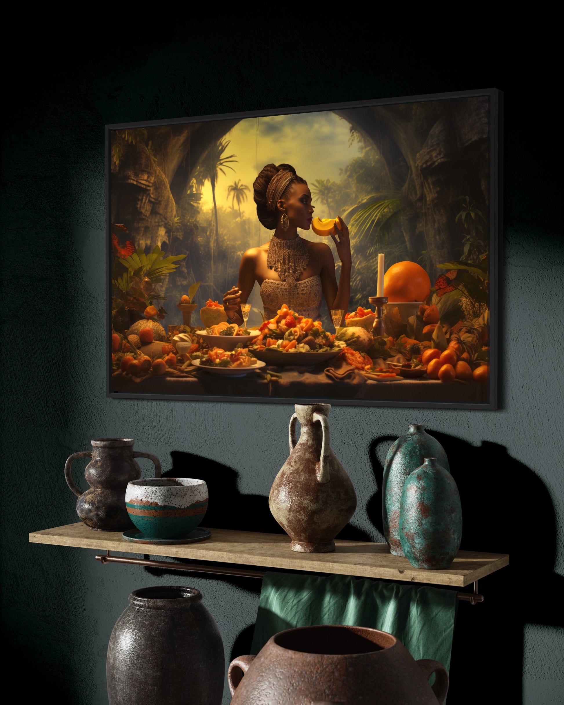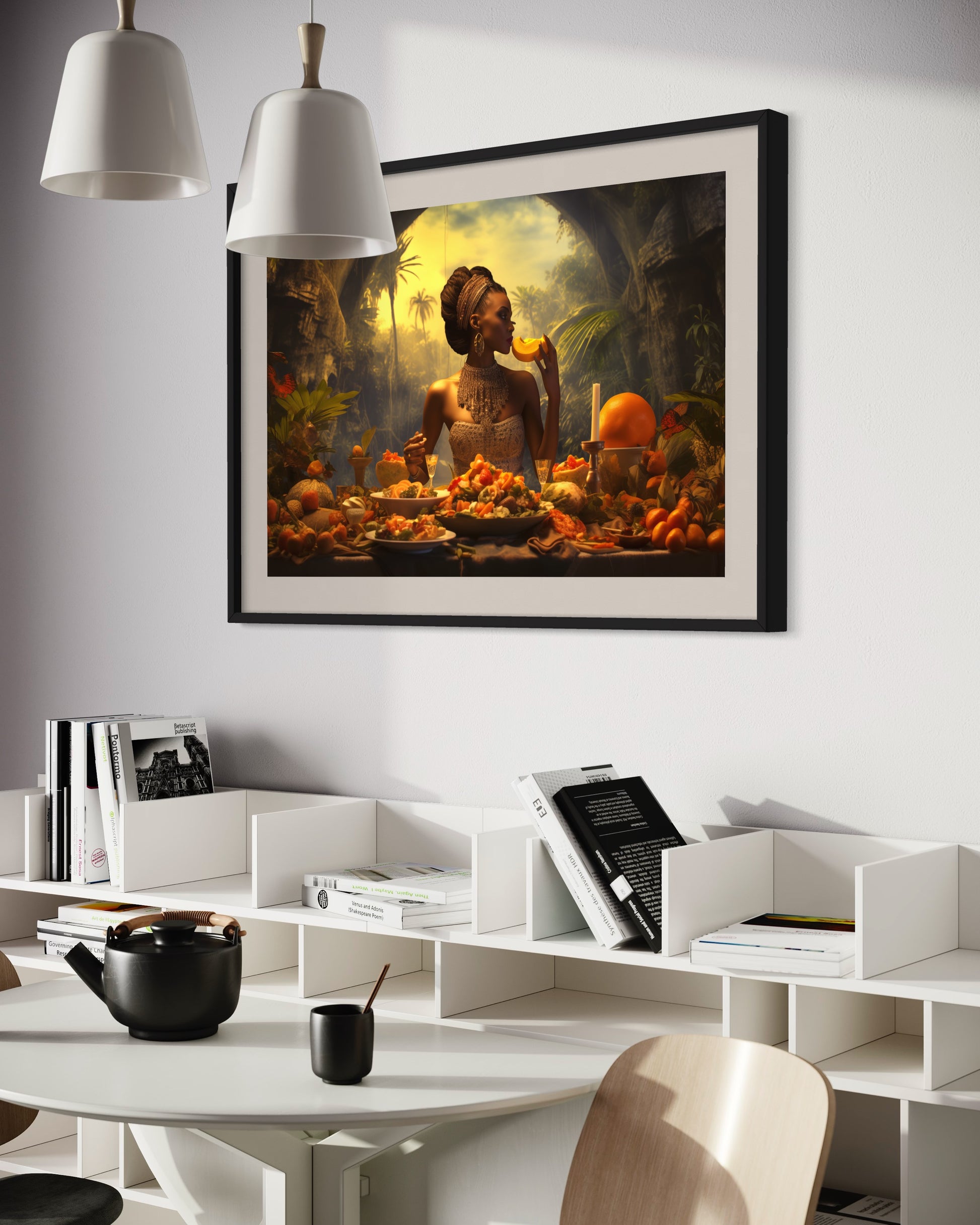 In einem üppigen, tropischen Dschungel sitzt eine elegante Frau an einer reich gedeckten Tafel. Ihr kunstvoll geflochtenes Haar, der opulente Halsschmuck und das detailreiche Spitzenkleid verleihen ihr eine königliche Ausstrahlung. Sie hält ein Stück Papaya an ihre Lippen, während die Tafel vor exotischen Früchten und raffinierten Speisen überquillt. Goldene Lichtstrahlen durchbrechen das dichte Blätterdach und tauchen die Szene in eine warme, mystische Atmosphäre. Das Bild erinnert an barocke Stillleben mit einem Hauch von afrikanischer Eleganz.