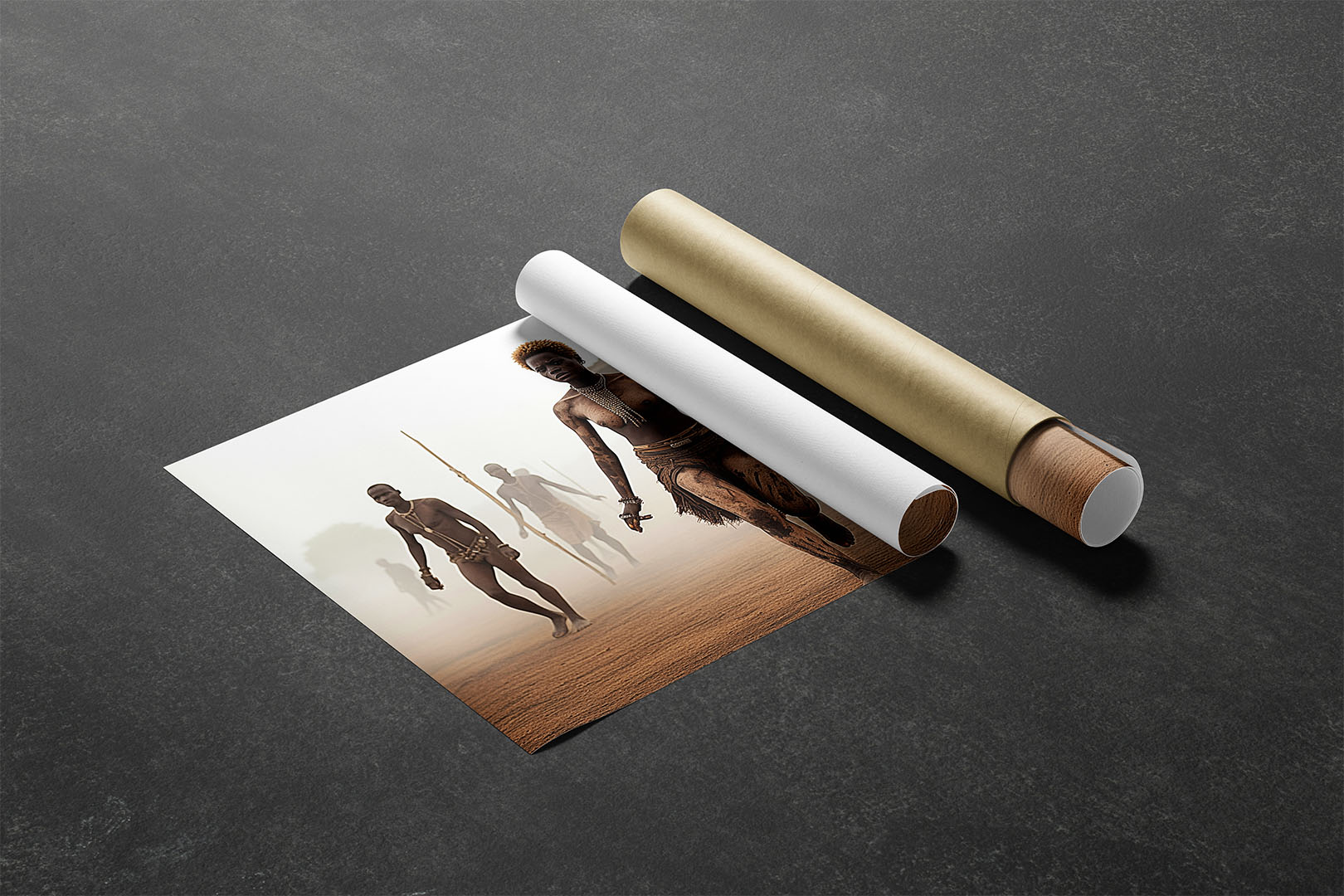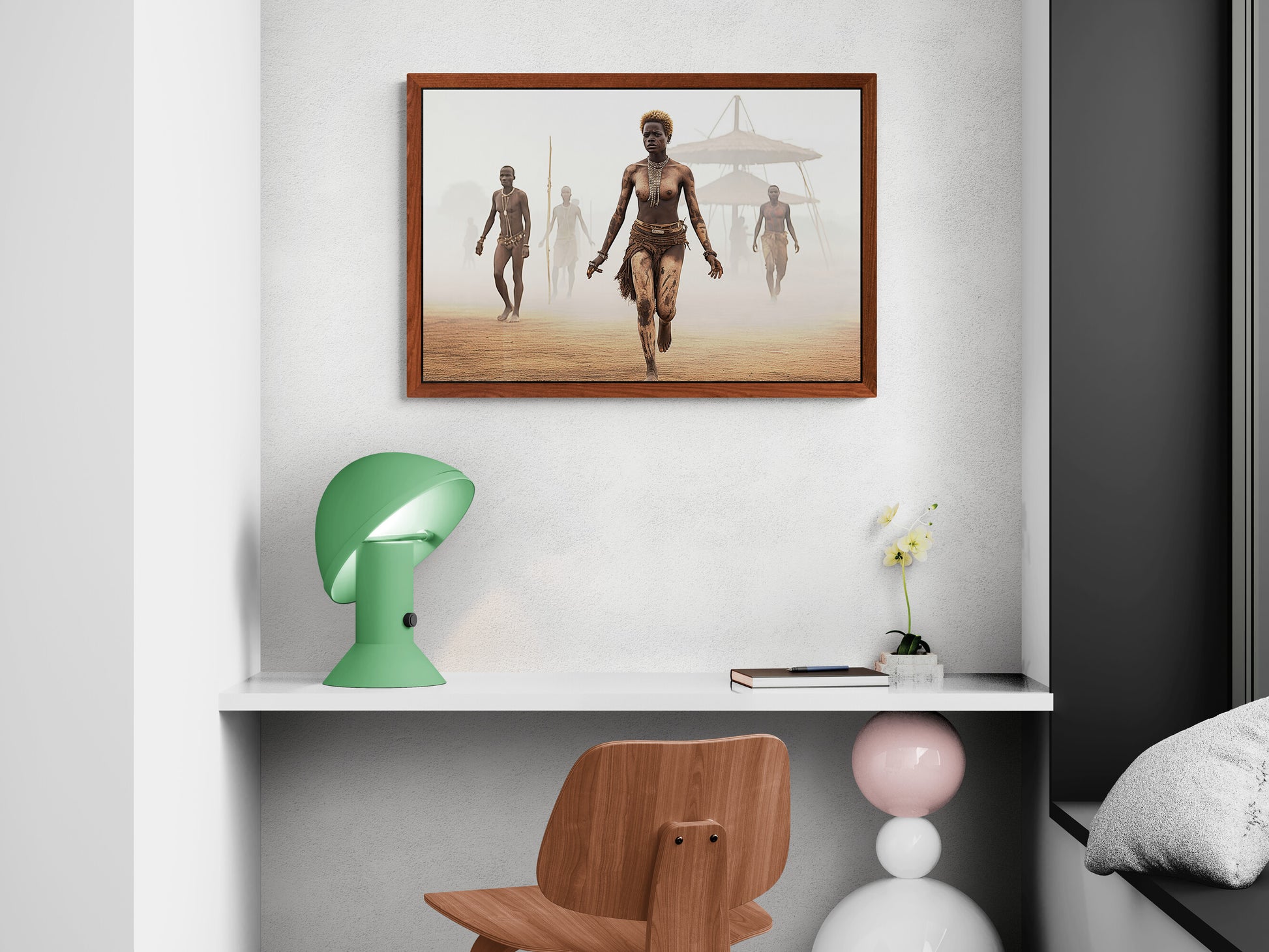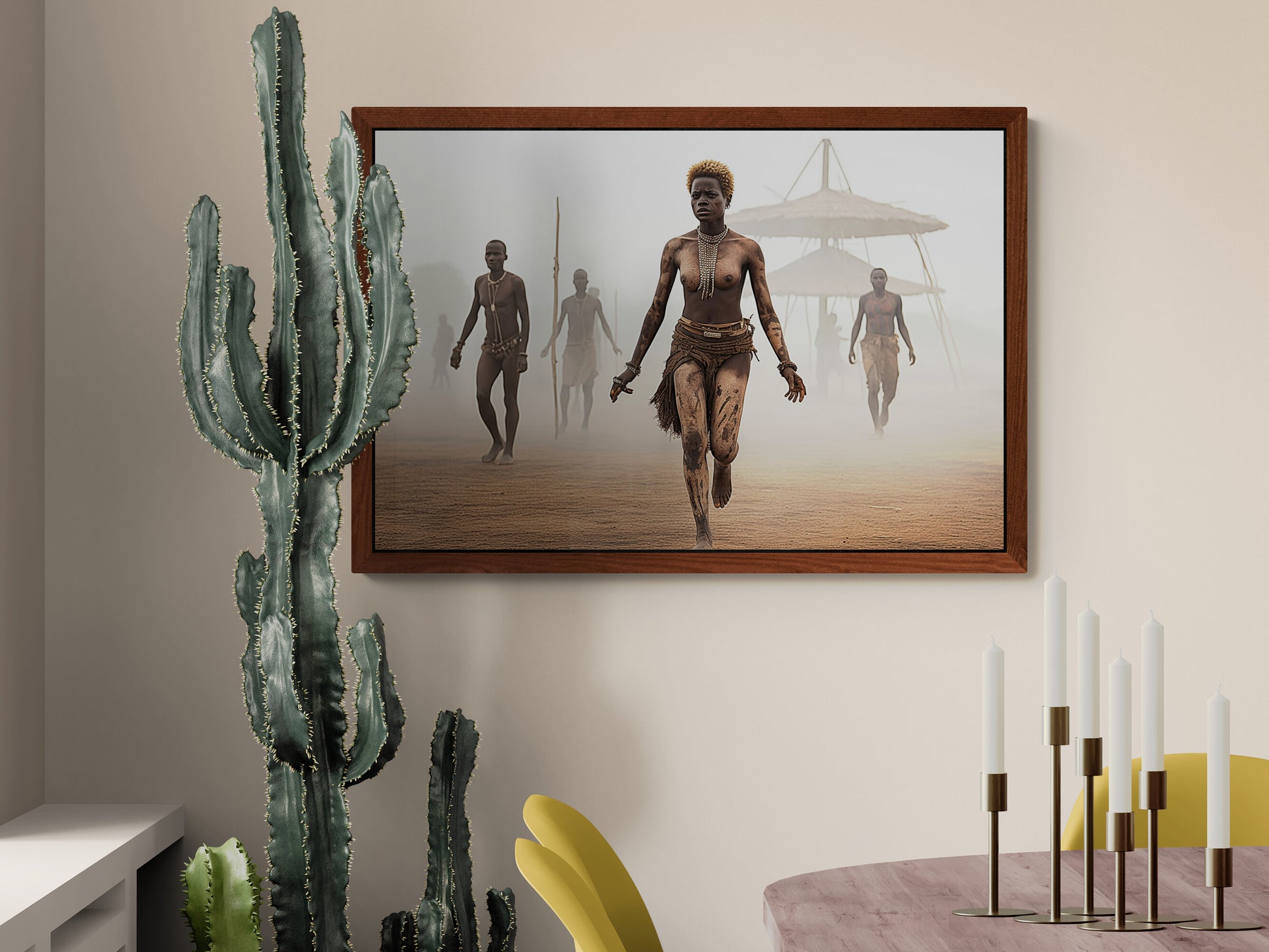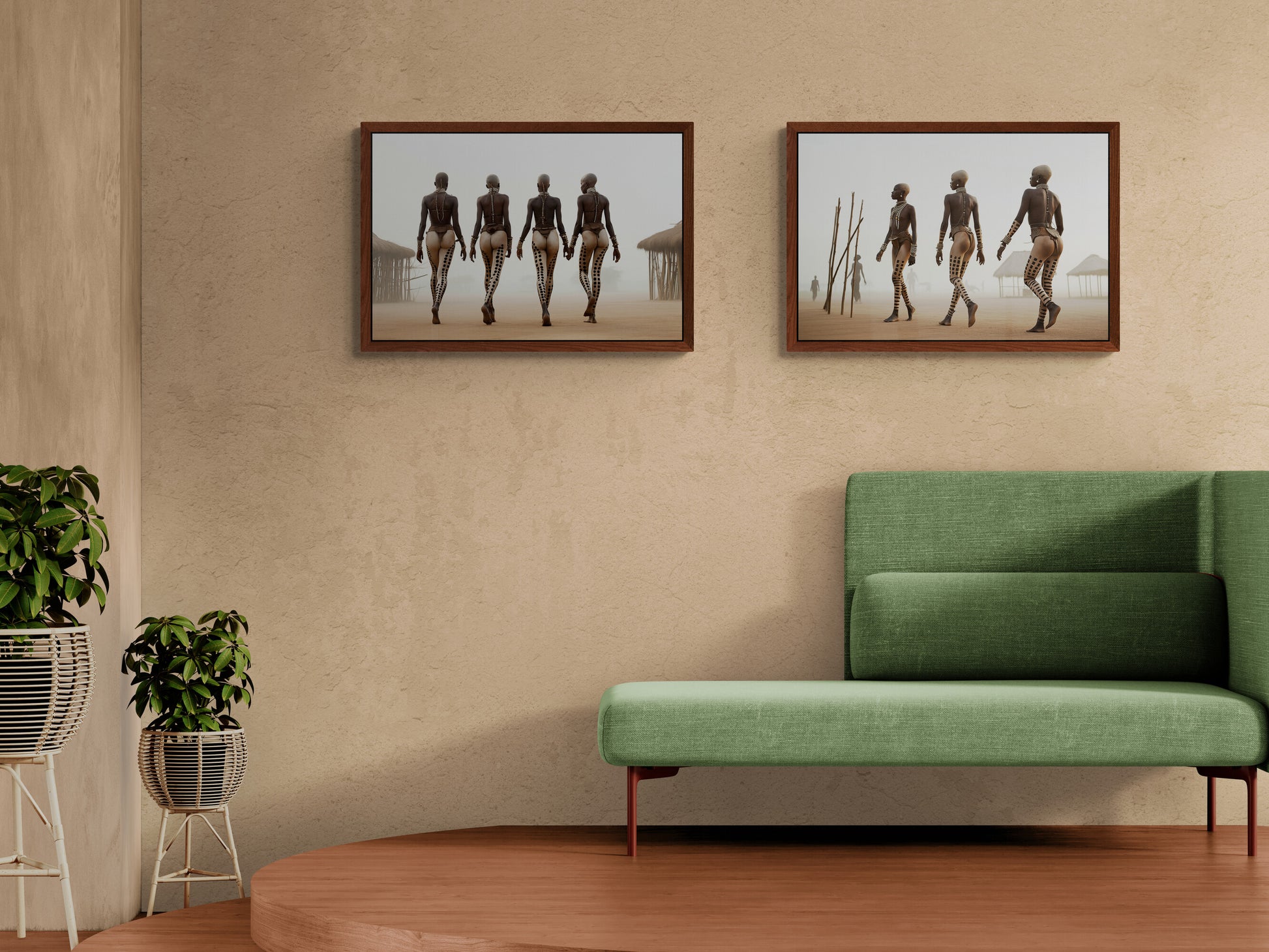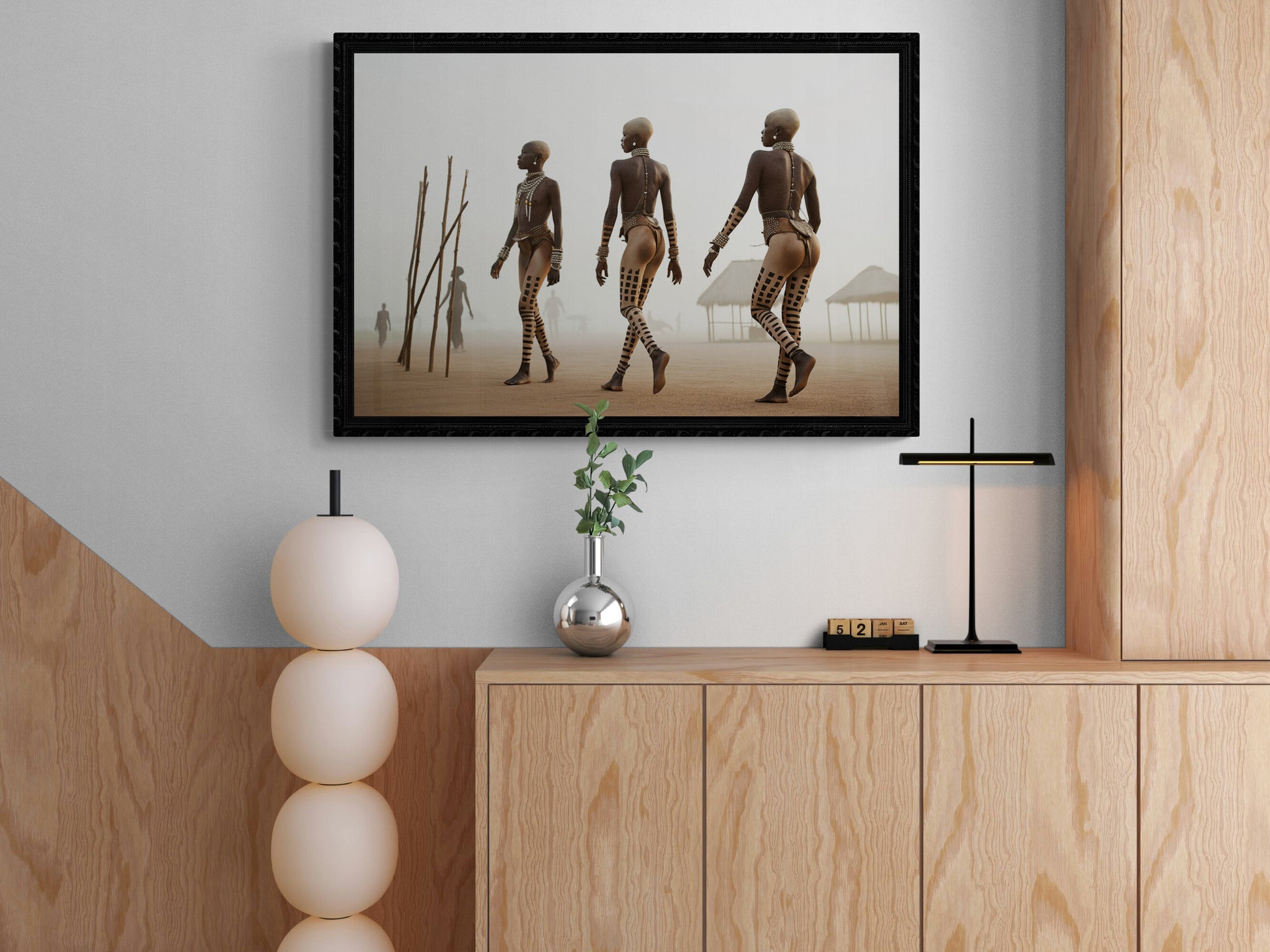 „Nuba Queen #4“ zeigt eine einzelne Frau, deren Körper mit grafischen Ornamenten überzogen ist. Die Bemalung erinnert an die Rituale des Nuba-Stammes, bei denen Körperbemalung ein zentrales Ausdrucksmittel war – Zeichen von Schönheit, Stärke und sozialer Zugehörigkeit. In dieser digitalen Neuinterpretation erscheinen die Muster zugleich traditionell und futuristisch, entstanden aus der technischen Notwendigkeit der KI, Nacktheit zu verschleiern. So verbindet sich kulturelle Erinnerung mit einem modernen ästhetischen Zugriff.