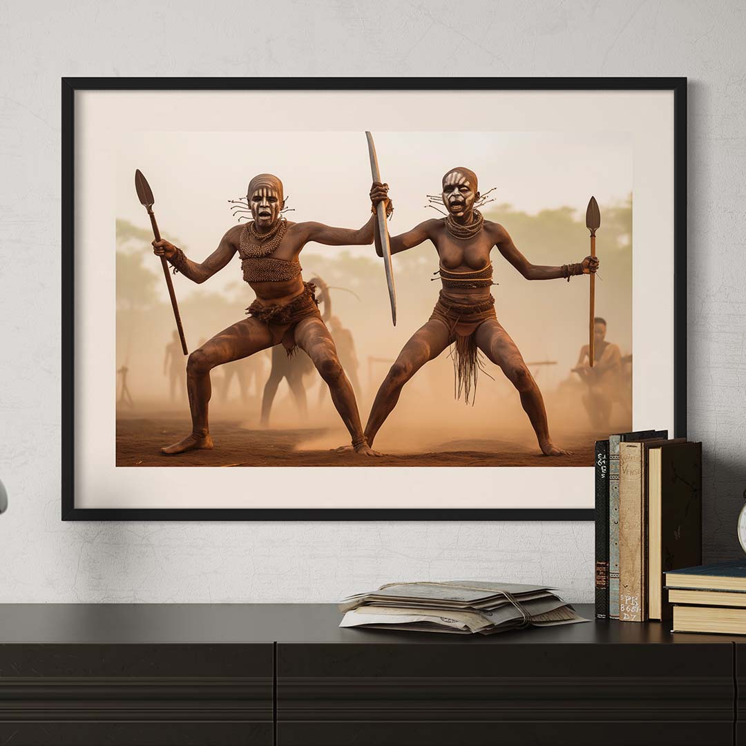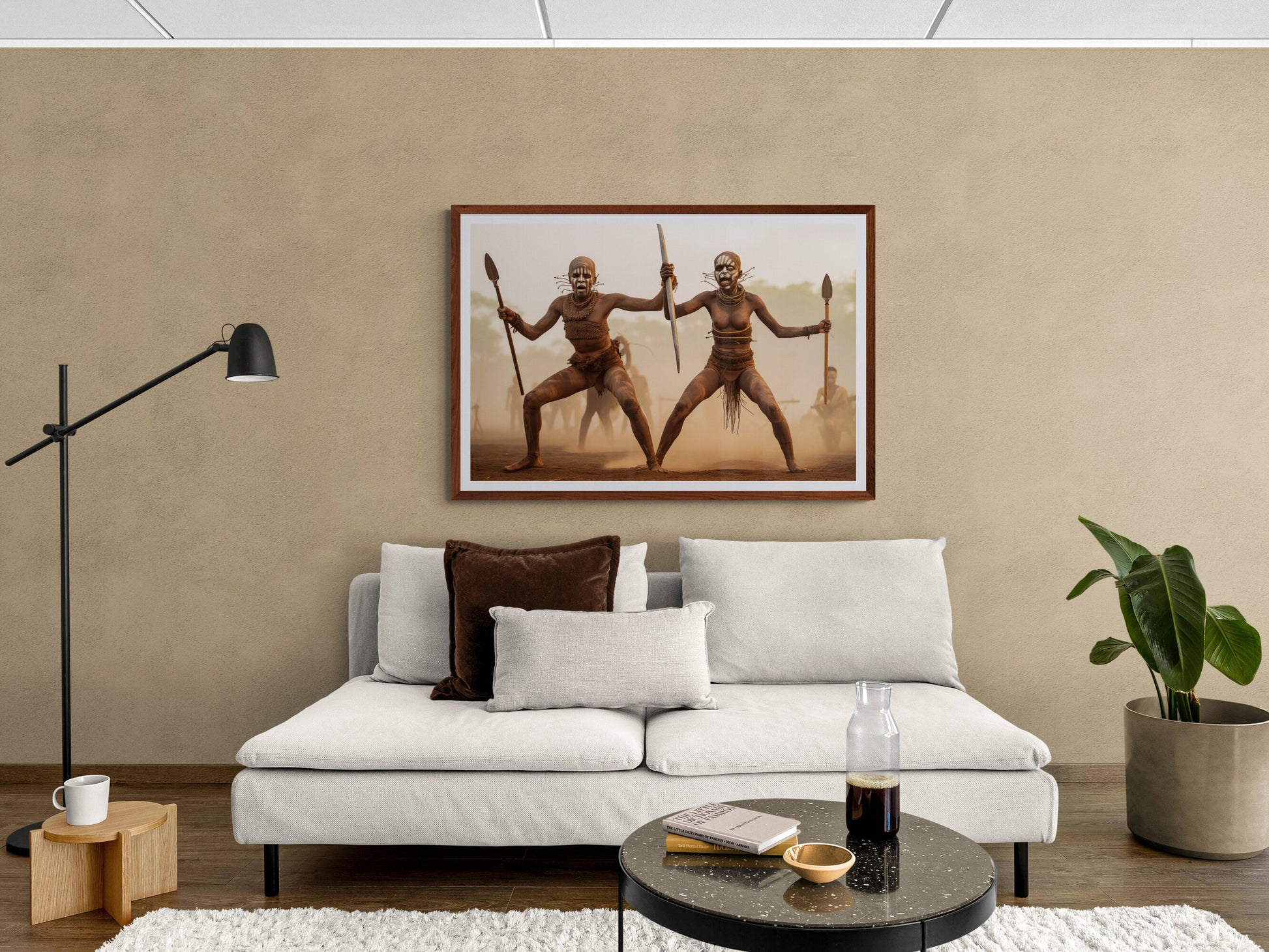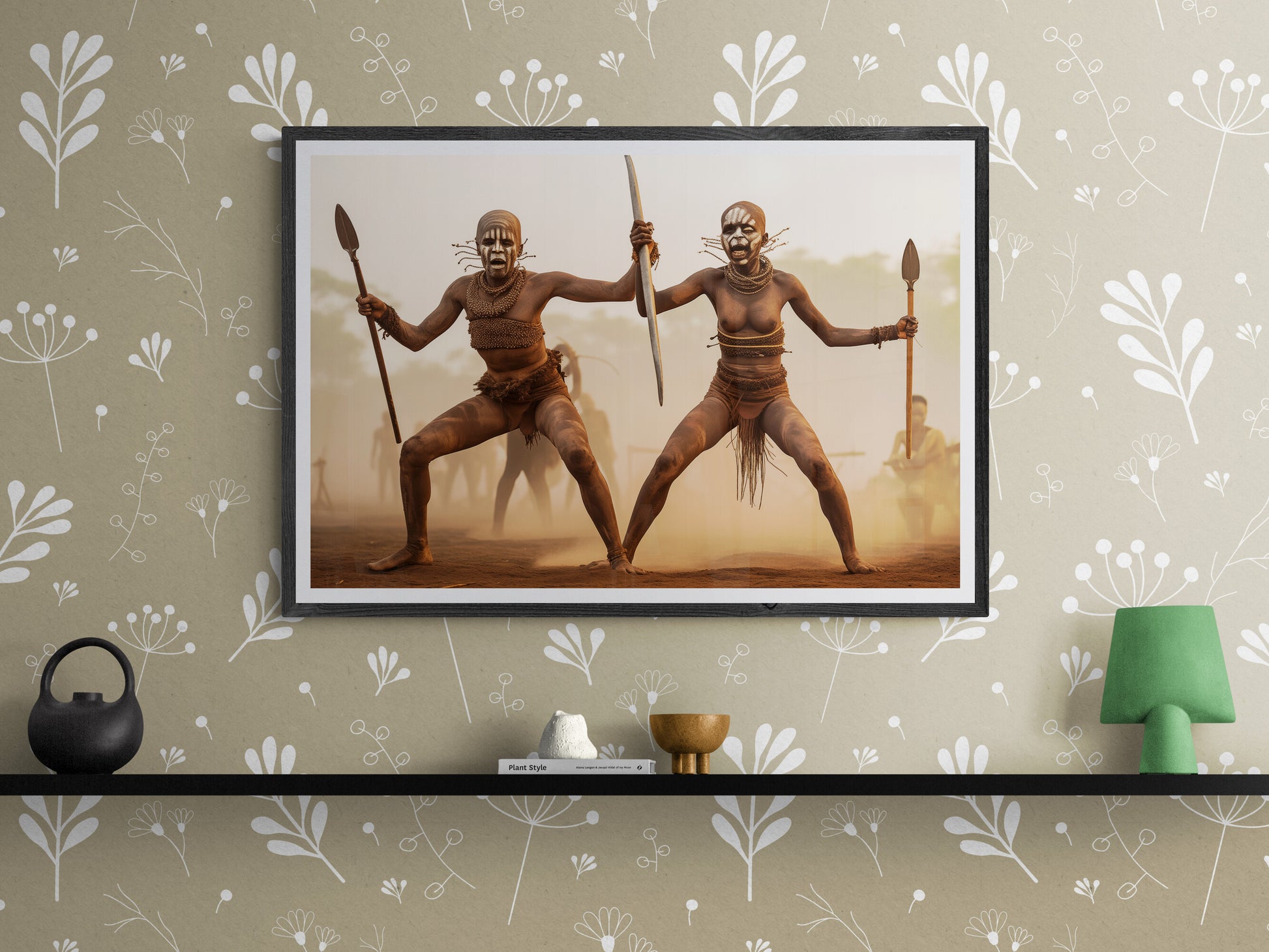 „Nuba Queen #5“ zeigt zwei Frauen in einer kämpferischen Pose, Speere in der Hand, die Körper mit ornamentalen Mustern überzogen. Die Szene verweist auf die Tradition des Ringkampfs bei den Nuba, der weit mehr als ein Sport war: ein rituelles Schauspiel von Stärke, Schönheit und sozialem Rang. Körperbemalung diente dabei als Ausdruck von Identität und Stolz. In der digitalen Neuinterpretation verschmelzen diese kulturellen Anklänge mit modernen Ornamenten, die aus den KI-Beschränkungen entstanden und dem Bild zugleich einen futuristischen Reiz verleihen.