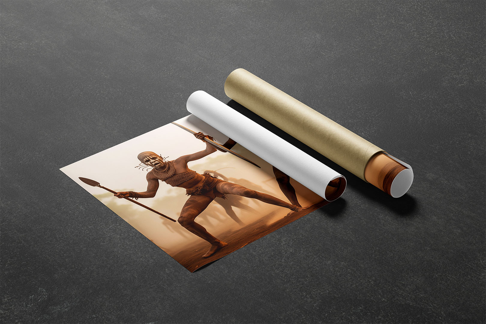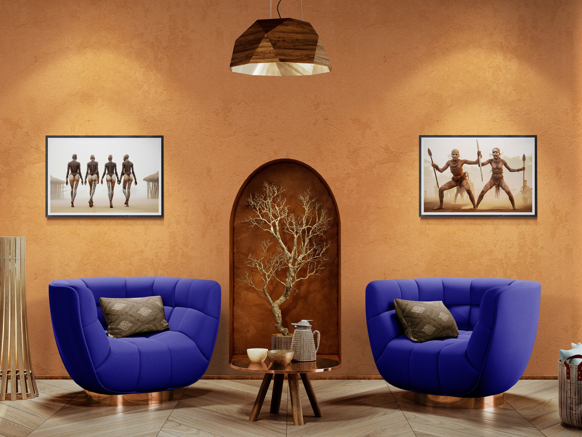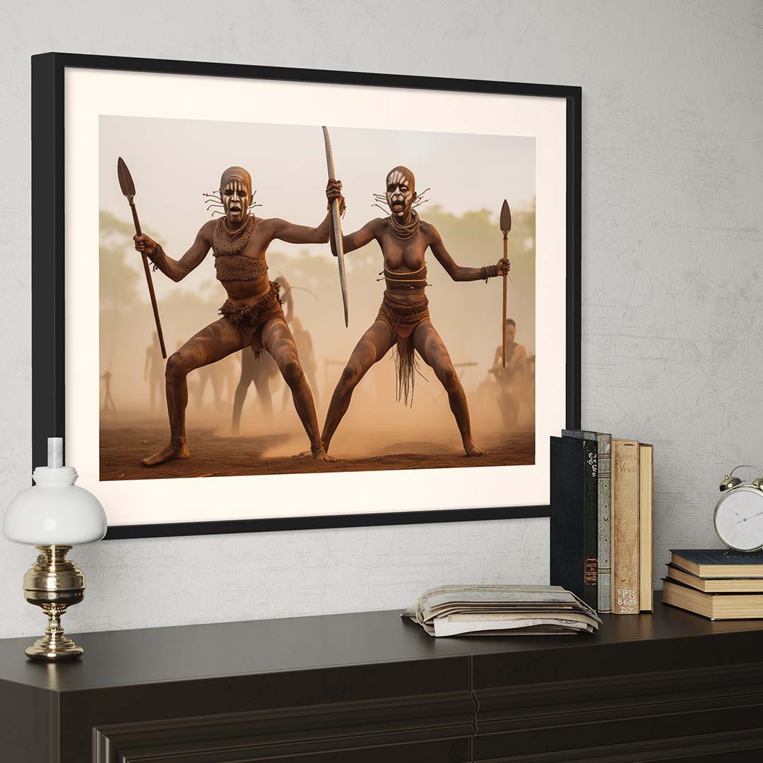 „Nuba Queen #5“ zeigt zwei Frauen in einer kämpferischen Pose, Speere in der Hand, die Körper mit ornamentalen Mustern überzogen. Die Szene verweist auf die Tradition des Ringkampfs bei den Nuba, der weit mehr als ein Sport war: ein rituelles Schauspiel von Stärke, Schönheit und sozialem Rang. Körperbemalung diente dabei als Ausdruck von Identität und Stolz. In der digitalen Neuinterpretation verschmelzen diese kulturellen Anklänge mit modernen Ornamenten, die aus den KI-Beschränkungen entstanden und dem Bild zugleich einen futuristischen Reiz verleihen.