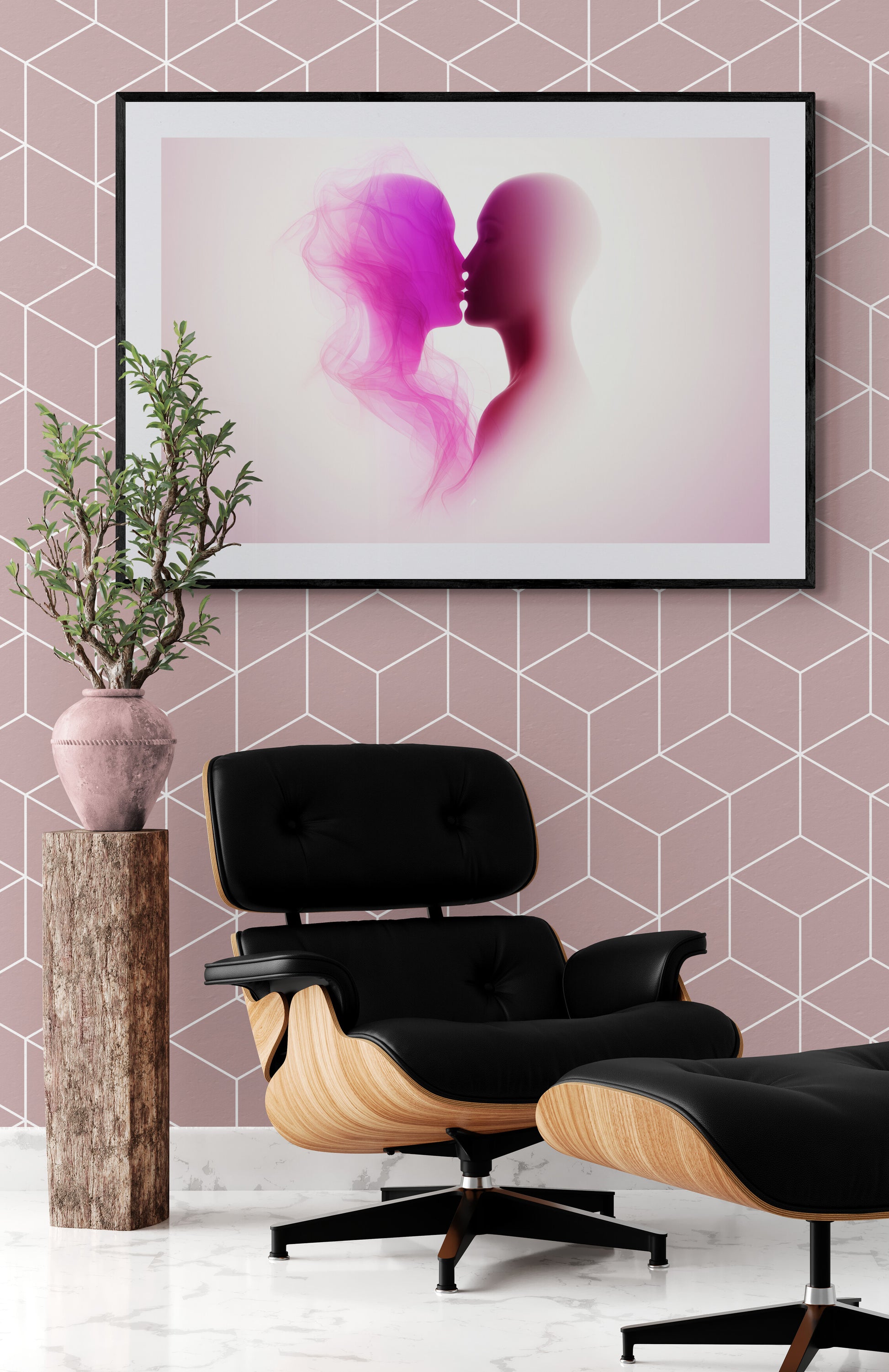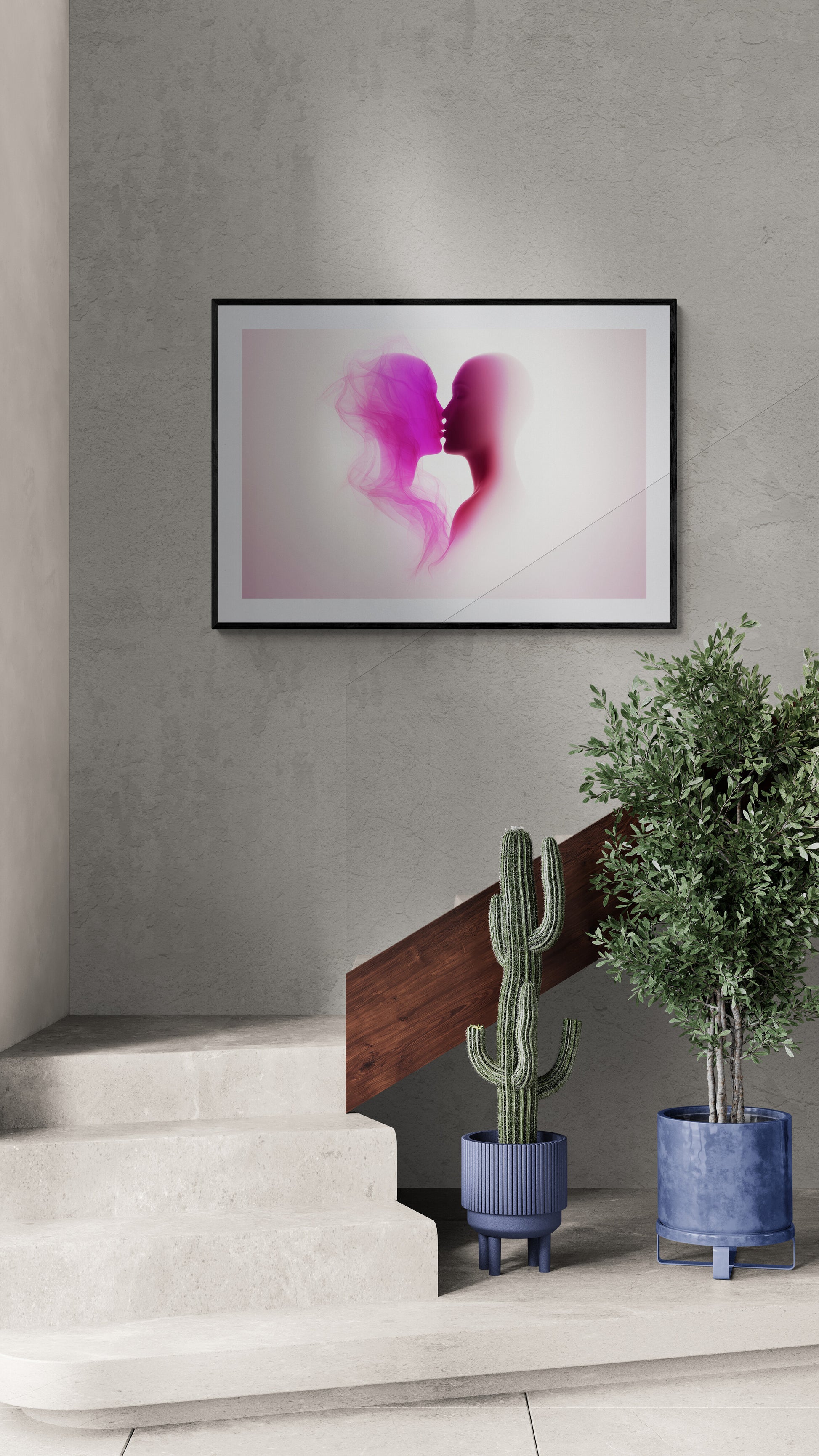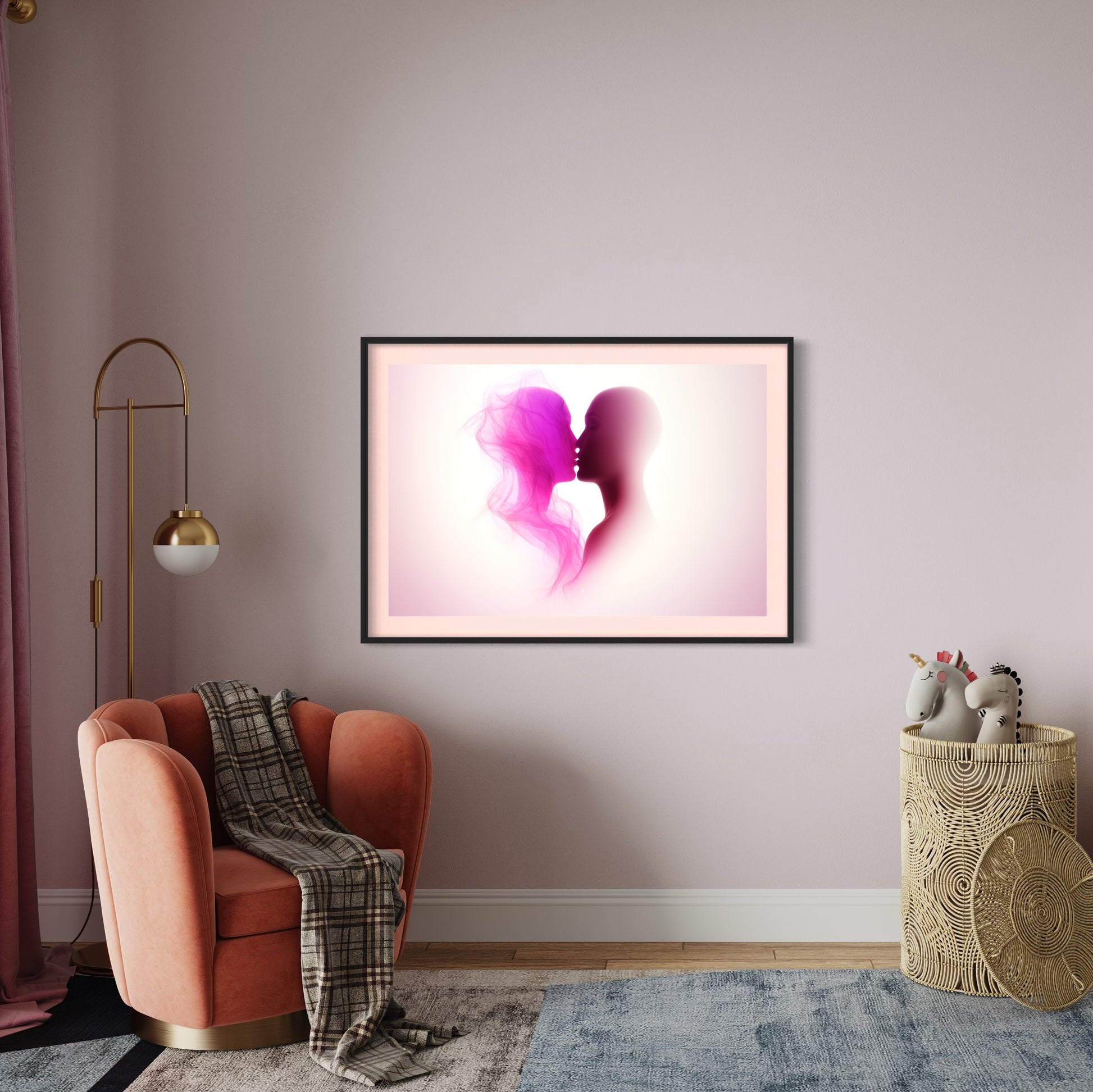 Ein faszinierendes Kunstwerk, das zwei sich küssende Silhouetten darstellt. Die eine Figur erscheint als feste Form, während die andere aus einem ätherischen, rosa Nebel besteht. Die sanften Farbverläufe und die weichen Konturen erzeugen eine traumhafte, fast surreale Atmosphäre. Das Motiv symbolisiert Liebe, Sehnsucht und die Verschmelzung von Realität und Vorstellung.