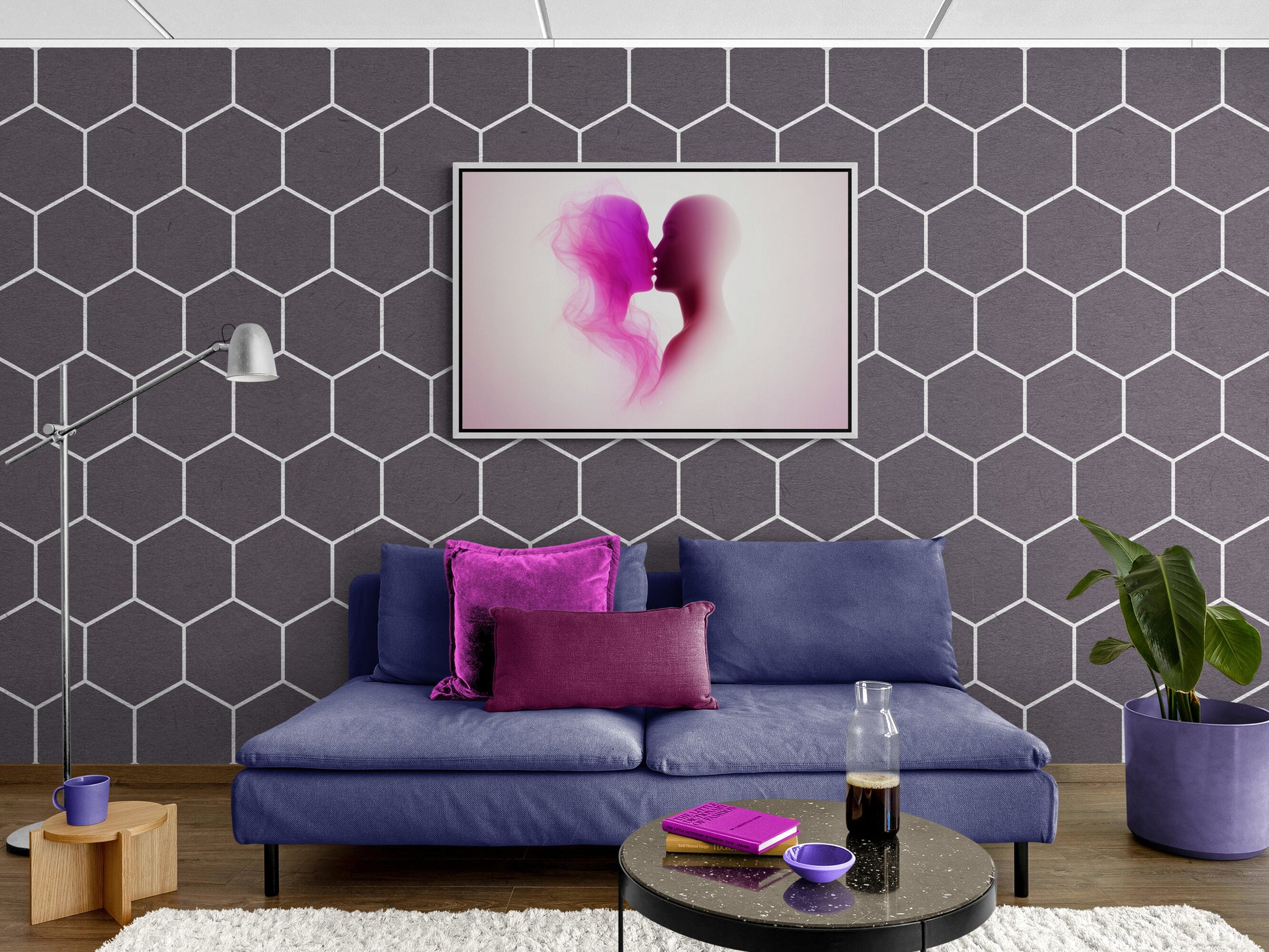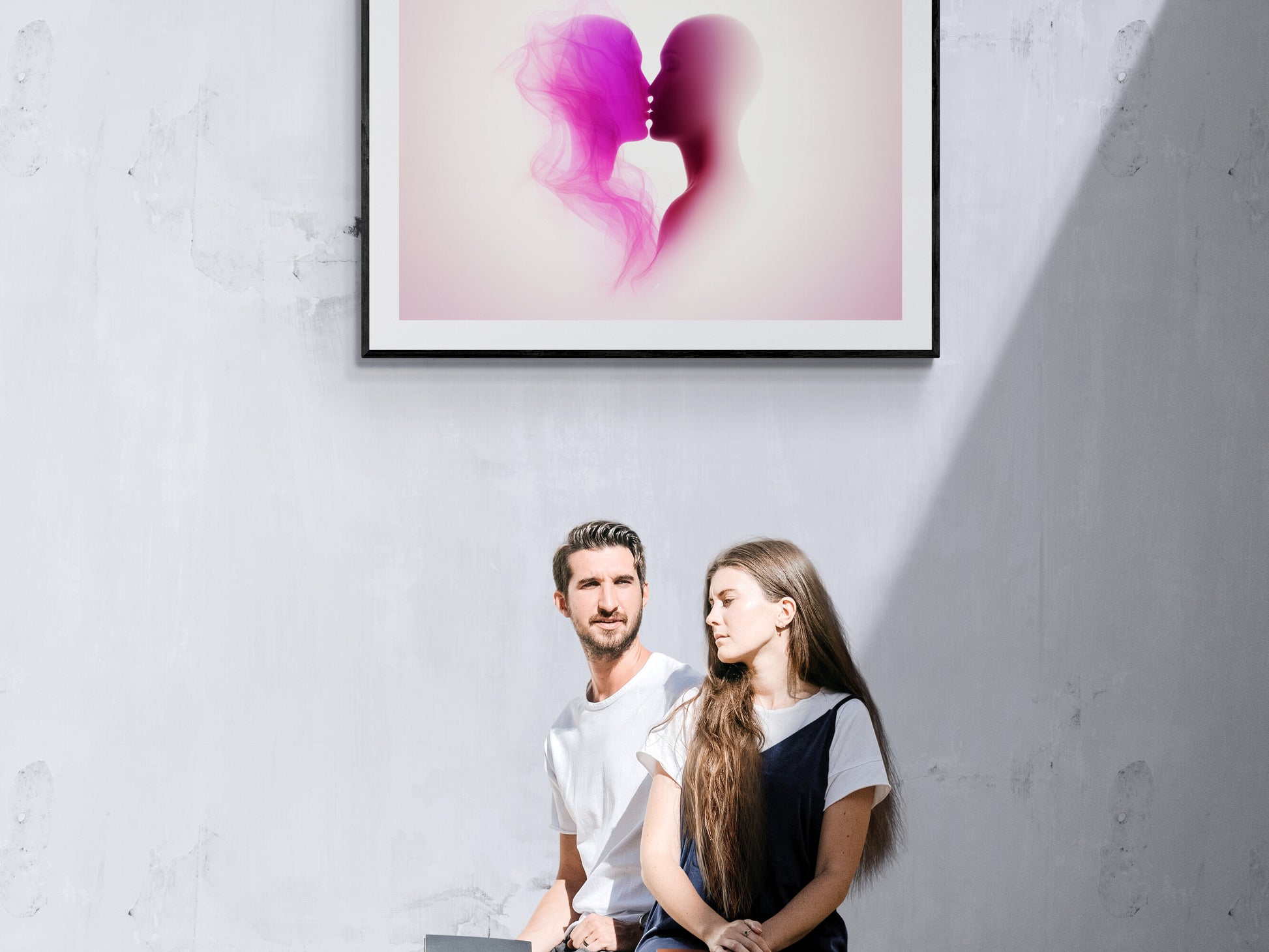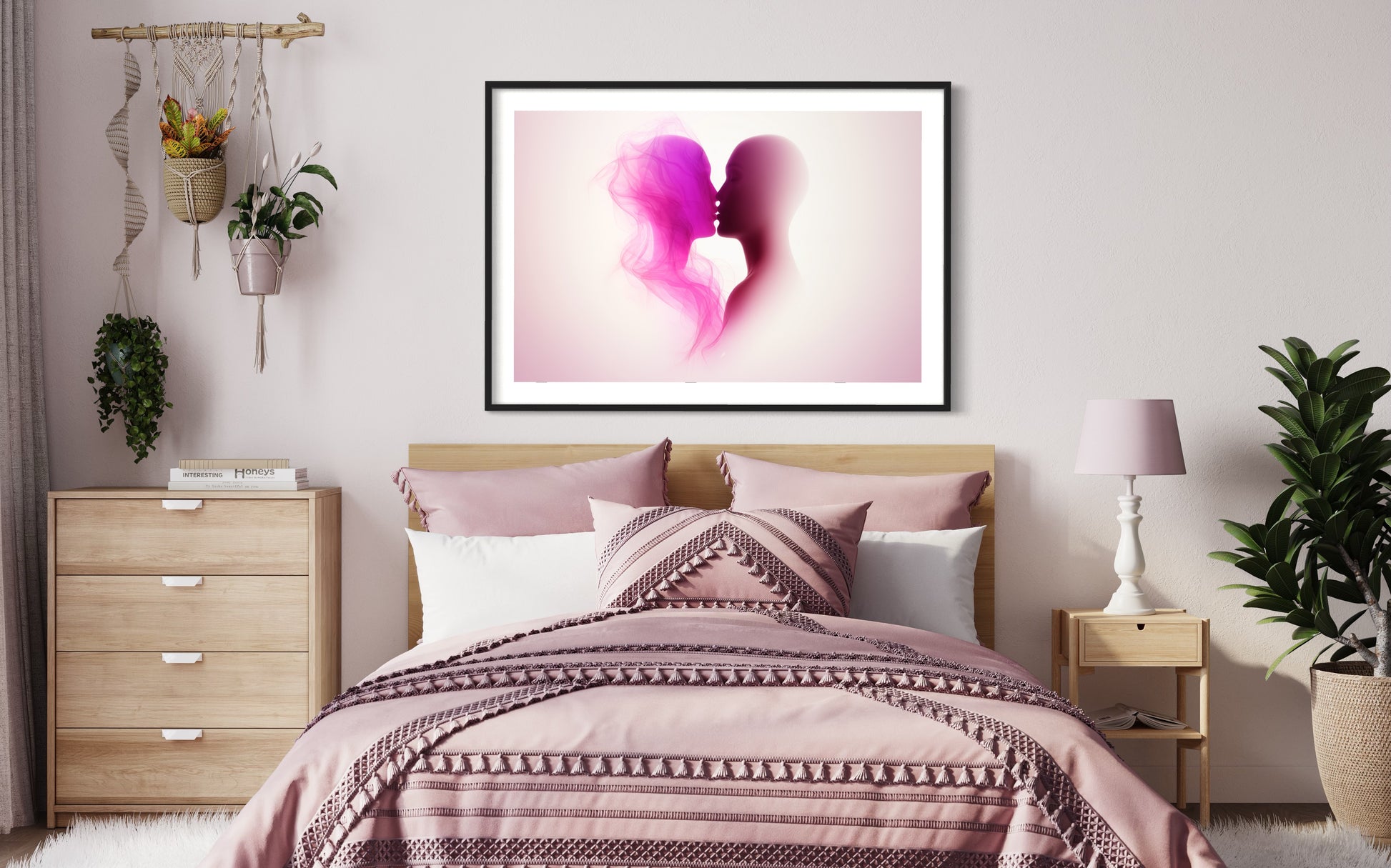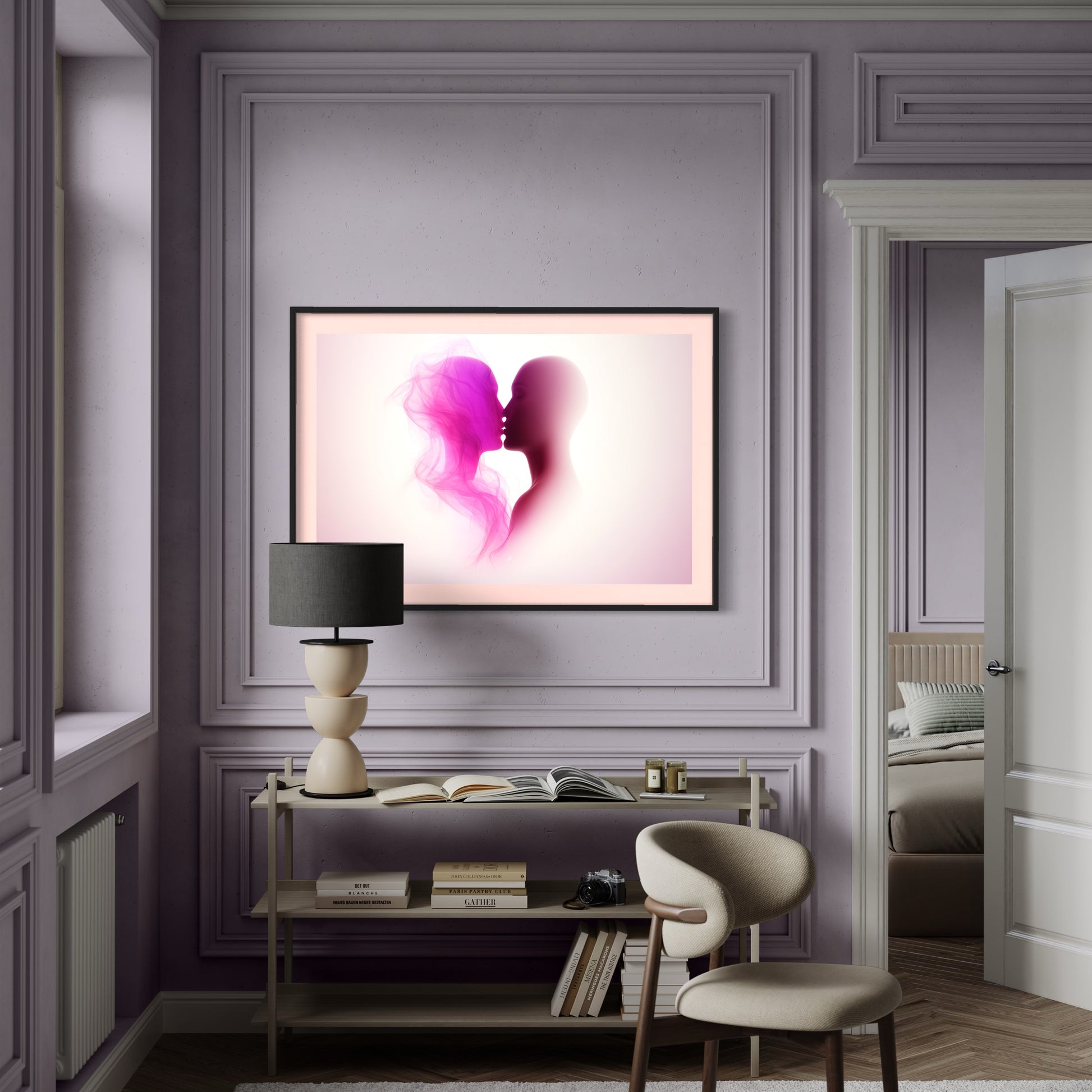 Ein faszinierendes Kunstwerk, das zwei sich küssende Silhouetten darstellt. Die eine Figur erscheint als feste Form, während die andere aus einem ätherischen, rosa Nebel besteht. Die sanften Farbverläufe und die weichen Konturen erzeugen eine traumhafte, fast surreale Atmosphäre. Das Motiv symbolisiert Liebe, Sehnsucht und die Verschmelzung von Realität und Vorstellung.