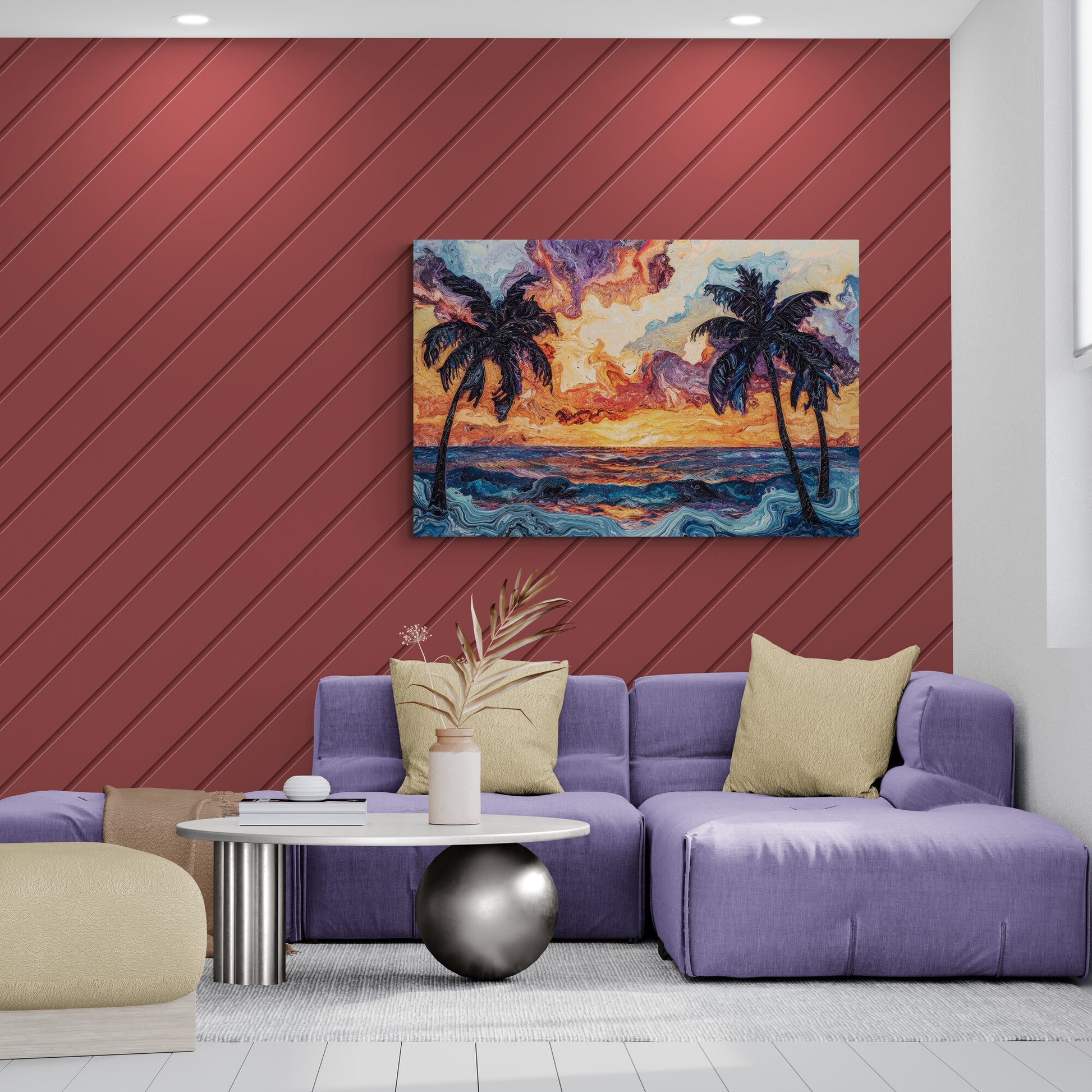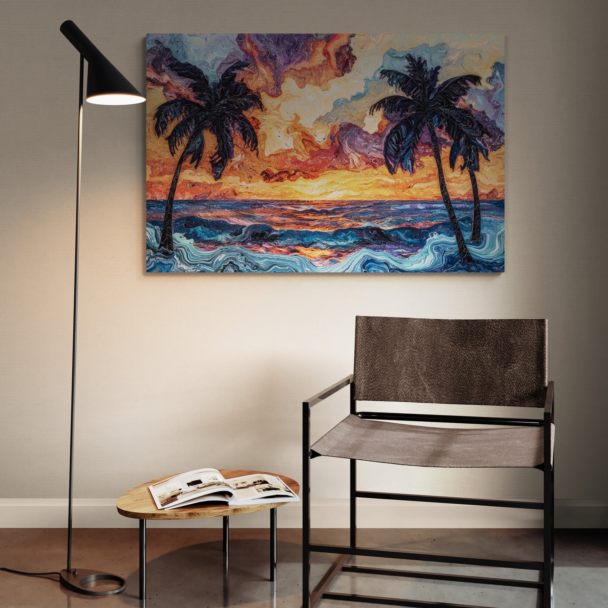 Zwei Palmen rahmen einen dramatischen Sonnenuntergang über dem Ozean ein. Die Szene ist in einem pastos wirkenden Stil gehalten, der an Ölgemälde erinnert. Flammende Orange-, Rot- und Gelbtöne dominieren den Himmel, kontrastiert von lila und blauen Wolken. Die Wellen des Meeres wirken lebendig und strukturiert, mit Farbverläufen in Türkis, Blau und Violett. Die dunklen Palmensilhouetten setzen einen klaren Kontrapunkt zu den leuchtenden Farben des Himmels.