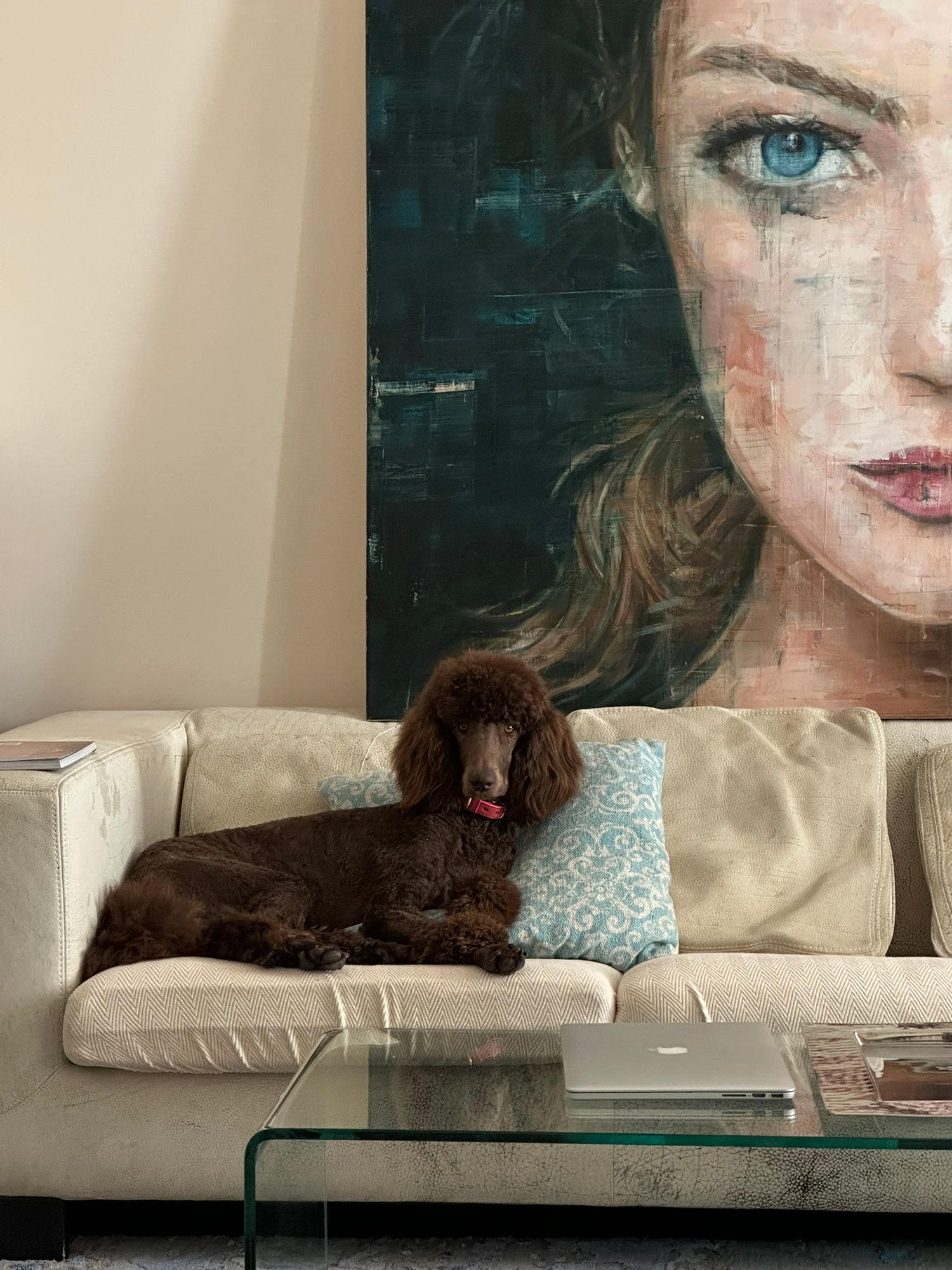 Ich persönlich neige zu großen Bildern – zu jenen, die ein Statement an der Wand sind. Das größte Werk in meinem Besitz misst rund 150 × 220 cm und hängt nicht zufällig im Wohnzimmer: Es spricht mit den anderen, und gemeinsam entsteht eine Art Dialog in Farbe.