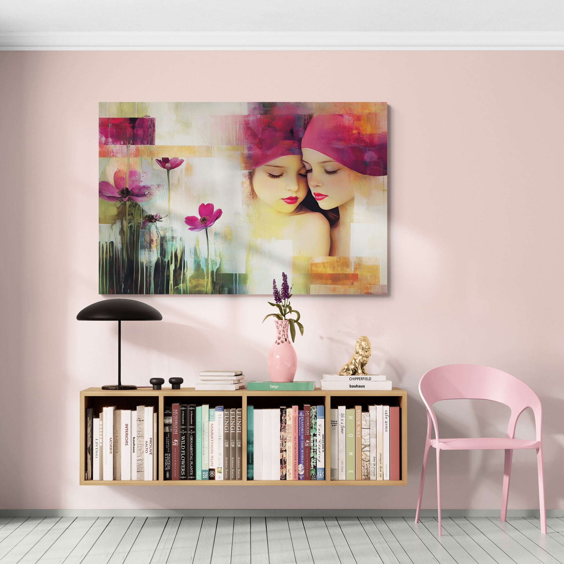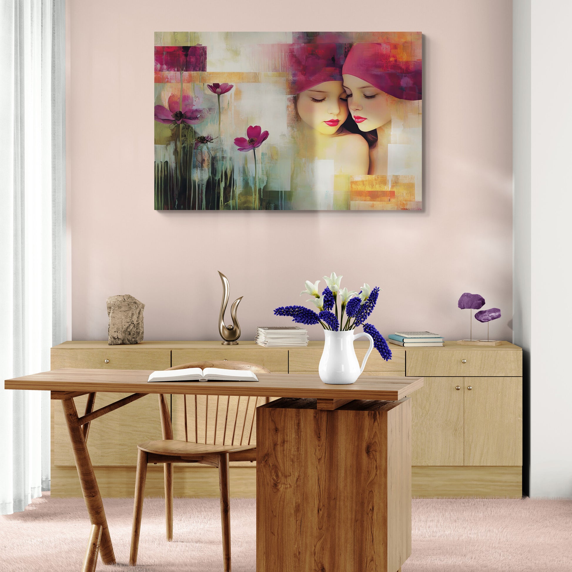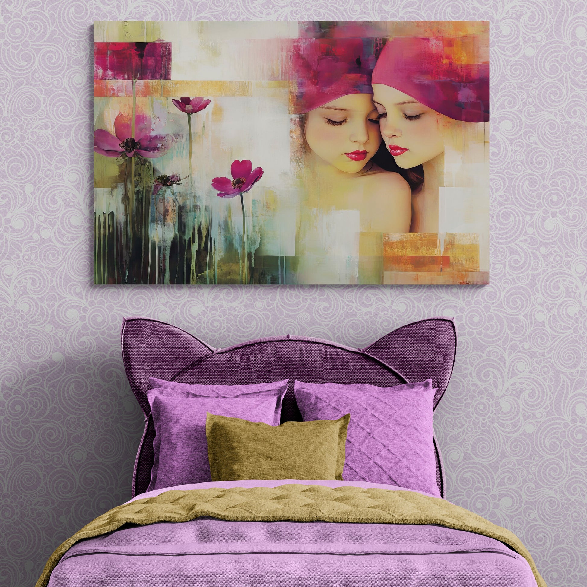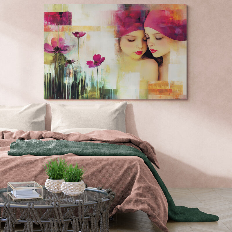 Zwei junge Mädchen mit geschlossenen Augen lehnen sanft aneinander, fast wie Spiegelbilder. Ihre rosaroten Kopftücher gehen nahtlos in einen abstrakt gestalteten Hintergrund aus warmen Farbfeldern über. Die linke Bildhälfte zeigt stilisierte Blumen mit violetten Blüten und fließenden, grünlich-dunklen Stielen. Das Werk kombiniert fotorealistische Porträtdarstellung mit impressionistisch-abstrakter Malweise.