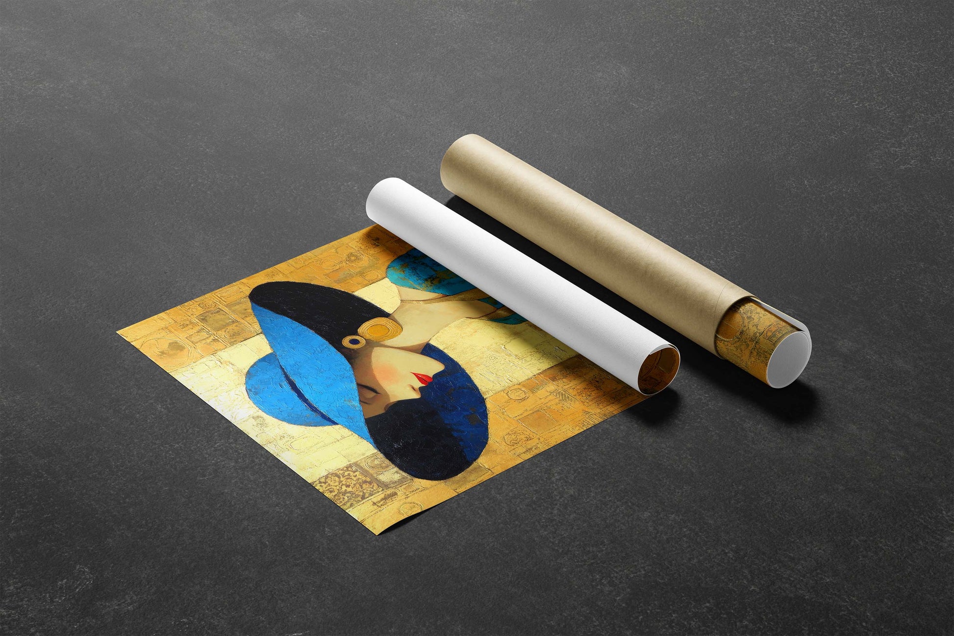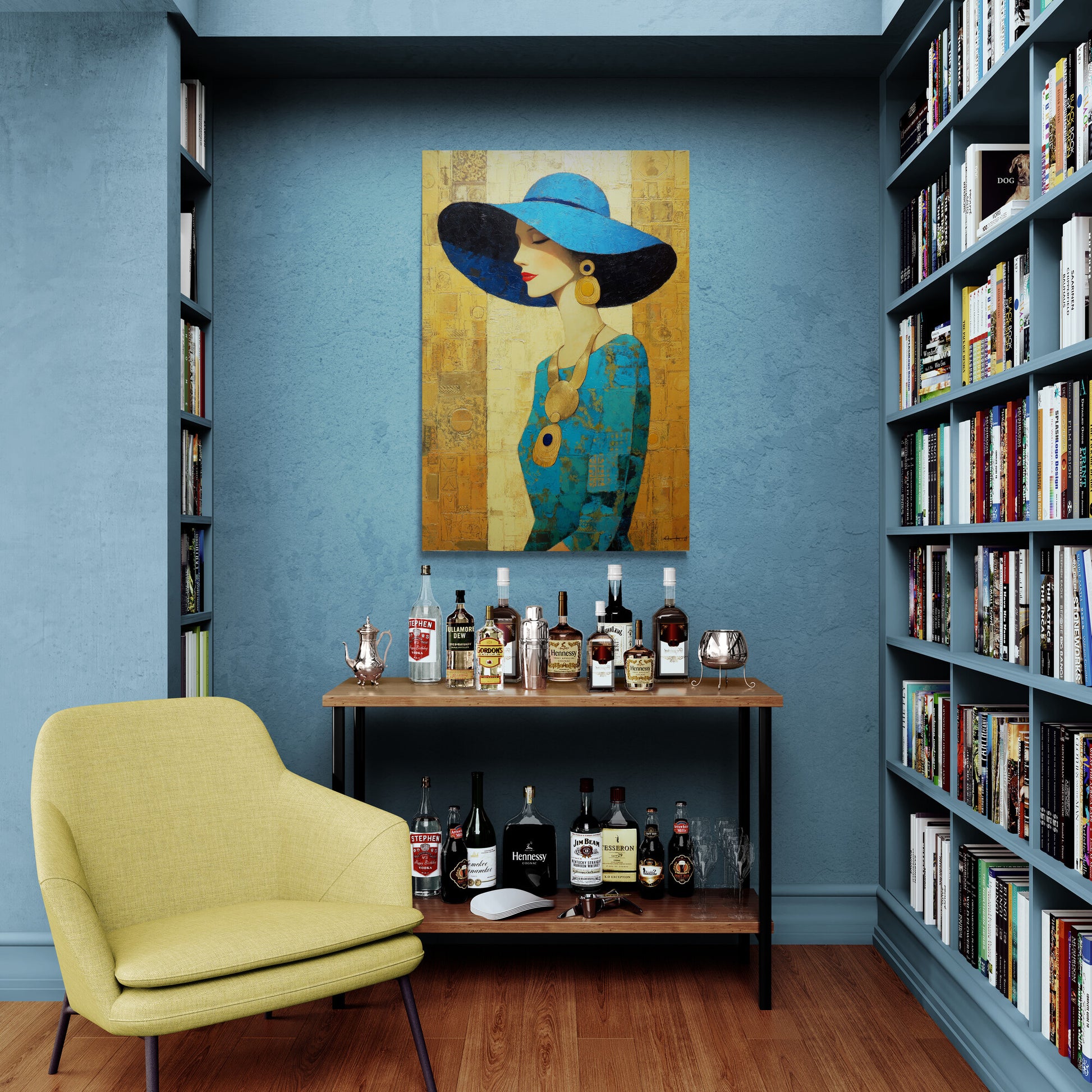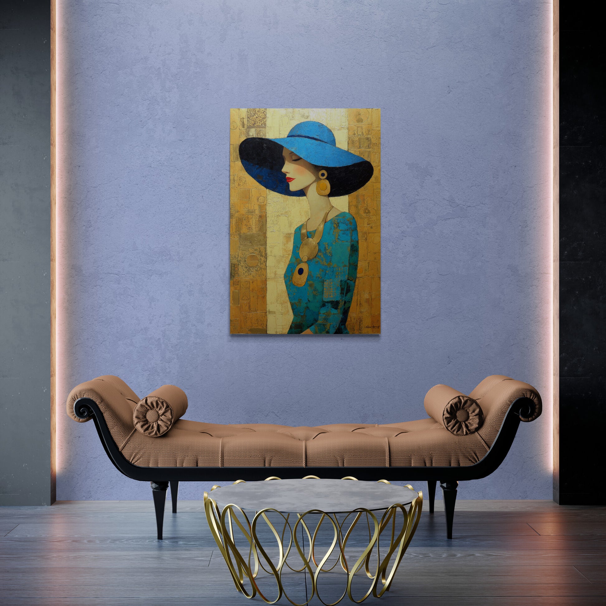 Ein stilisiertes Porträt einer eleganten Frau mit geschlossenen Augen, die einen großen blauen Hut und auffälligen goldfarbenen Schmuck trägt. Ihr türkisfarbenes Kleid harmoniert mit dem strukturreichen, gelb-goldenen Hintergrund, der an byzantinische Mosaike erinnert. Bitte beachten: Im Kunstdruck wird Gold als Gelb dargestellt. Die Komposition vereint klare Konturen mit abstrahierten Texturen und erzeugt eine ruhige, fast meditative Atmosphäre.