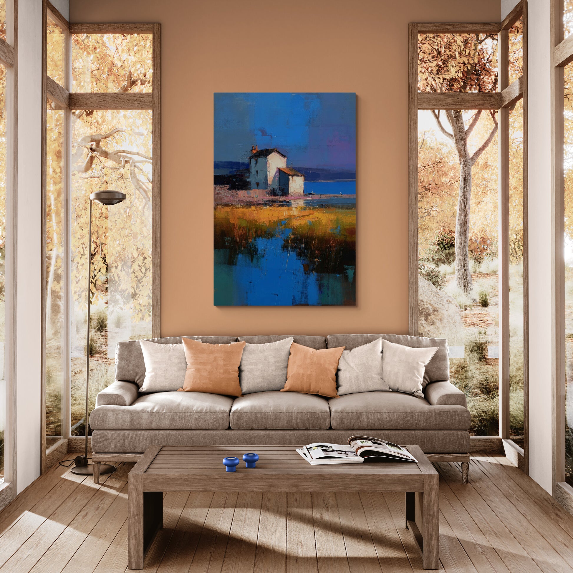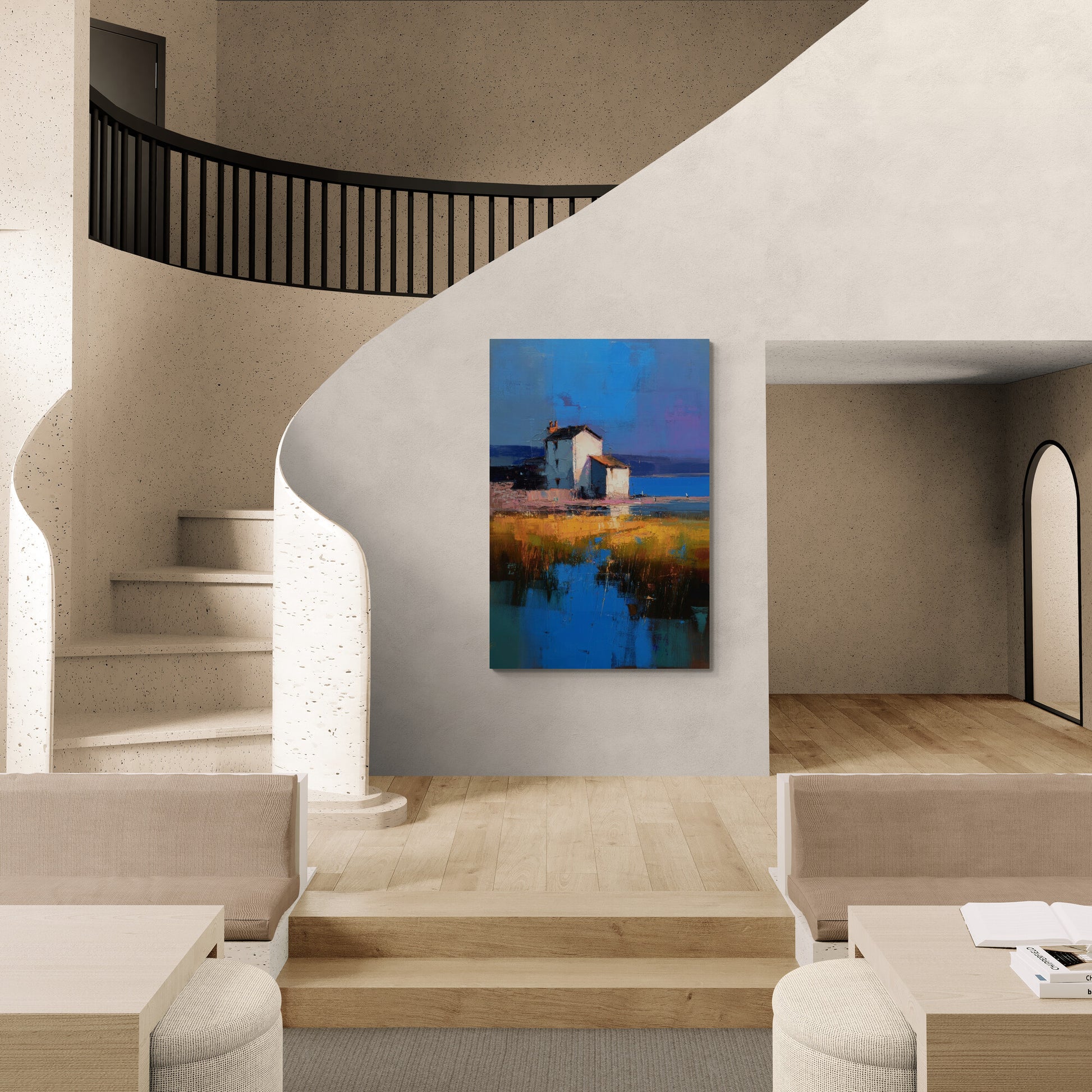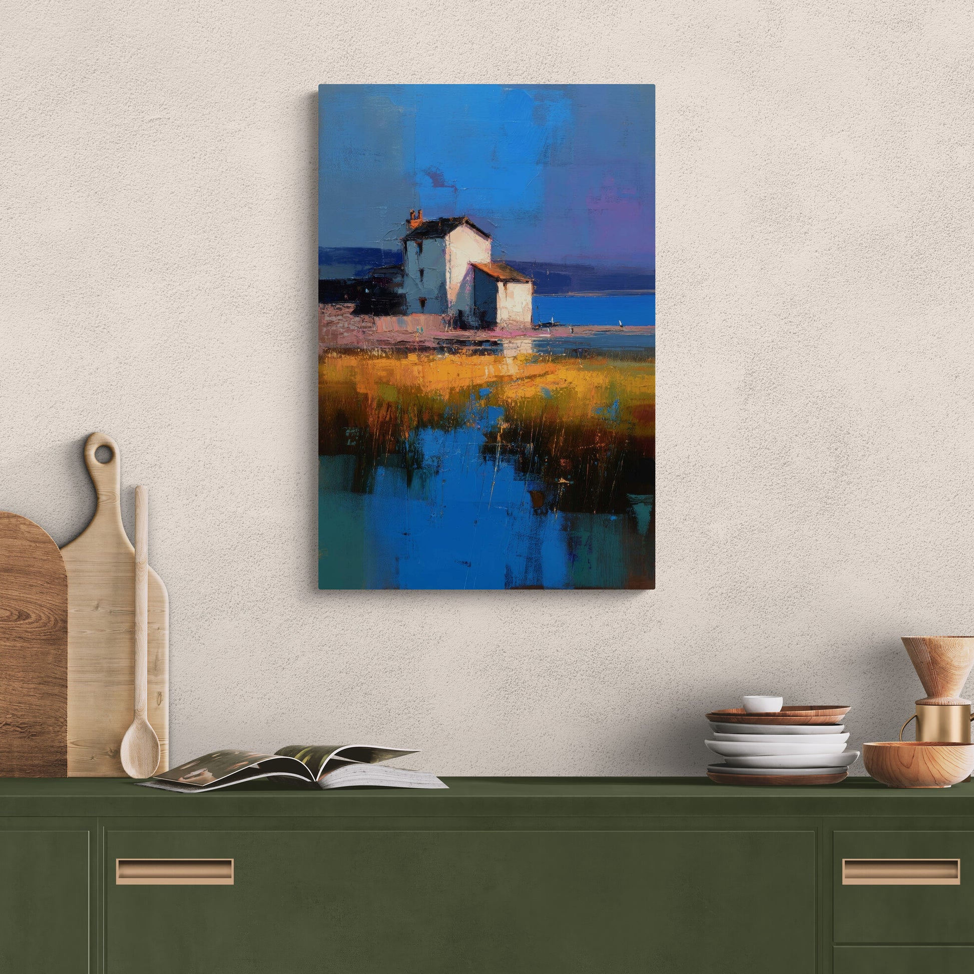 Ein impressionistischer Küstenblick zeigt ein helles, weißes Haus mit ziegelrotem Dach, das sich markant vor einem intensiven Blau des Himmels und des Meeres abhebt. Der Vordergrund ist geprägt von goldgelbem Marschgras und Wasserflächen, die die kräftigen Farben des Himmels reflektieren. Die Komposition kombiniert pastose Pinselstriche mit abstrahierter Farbfläche und vermittelt eine ruhige, fast zeitlose Atmosphäre.