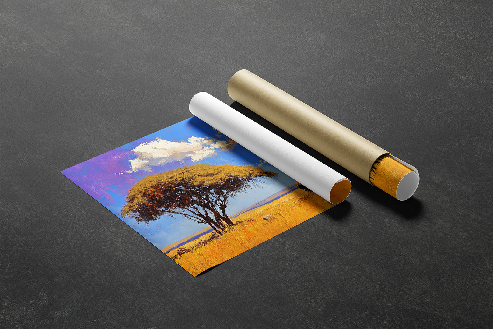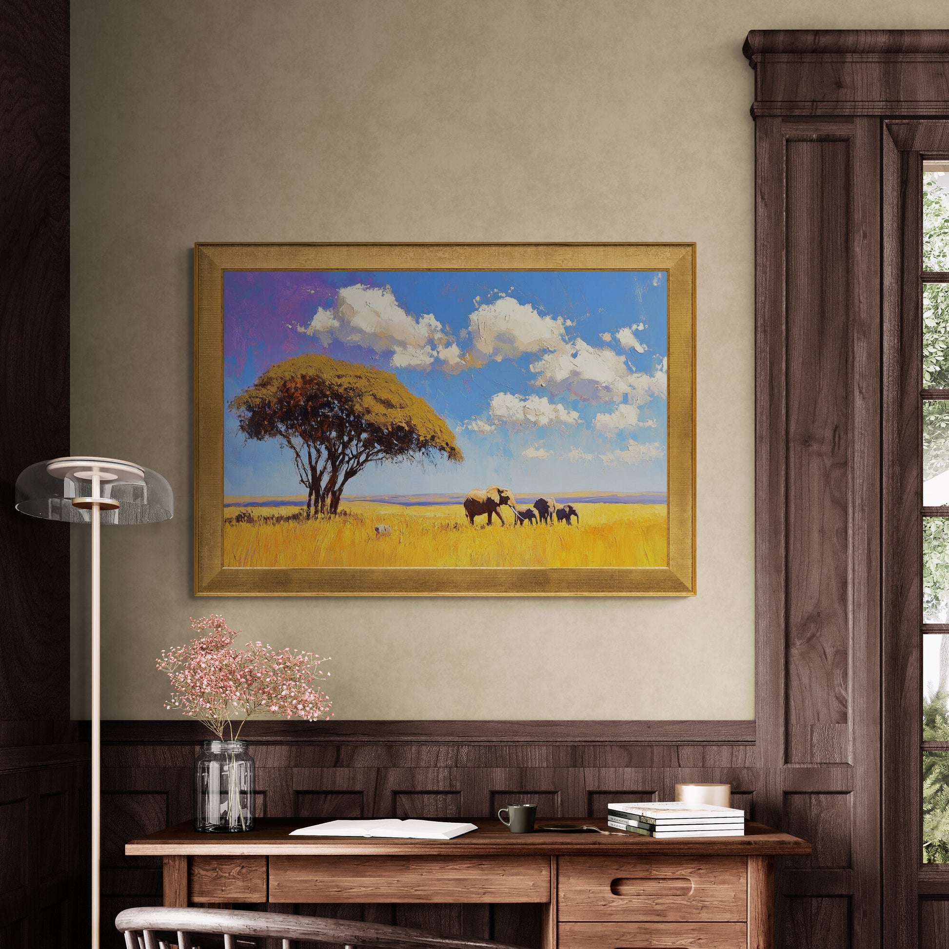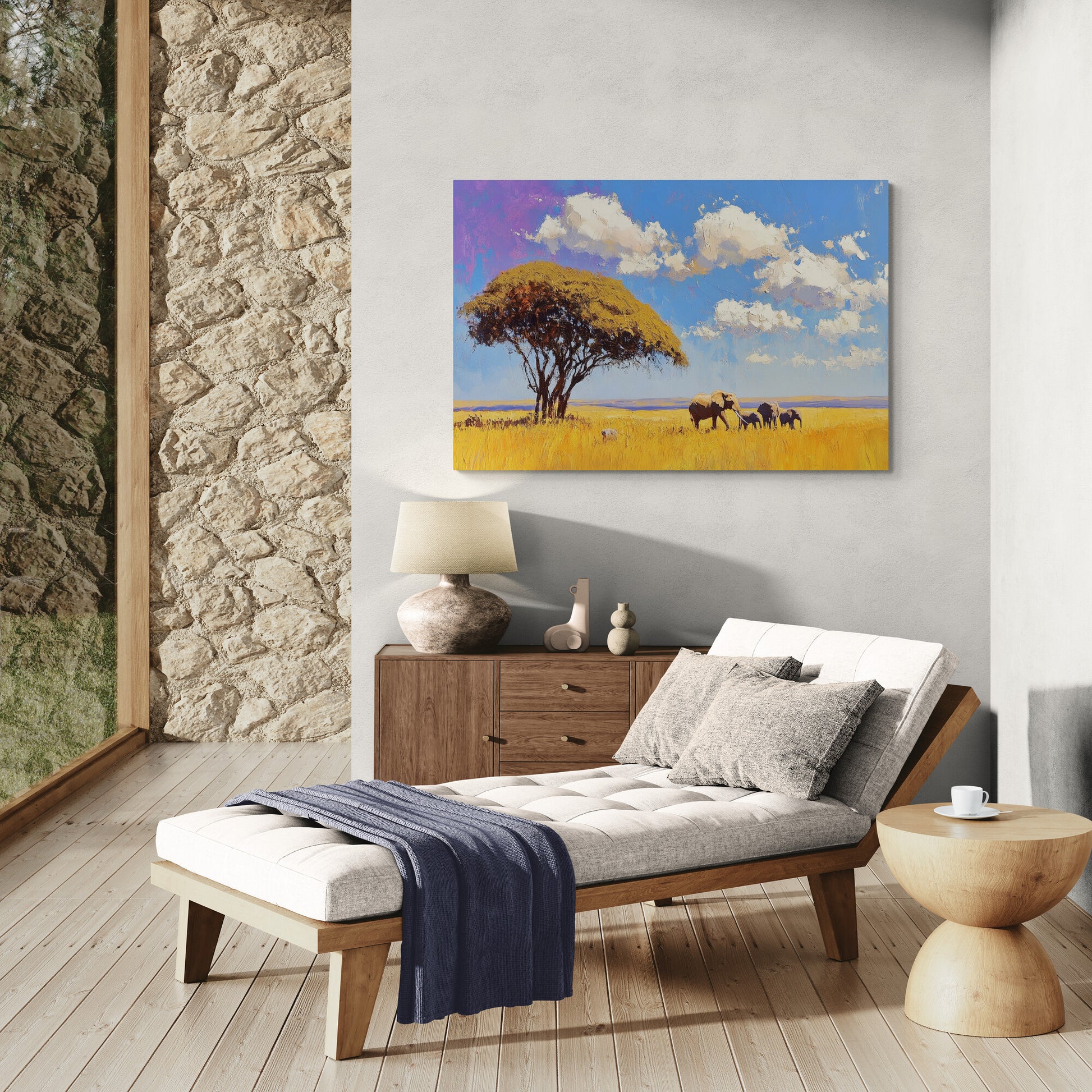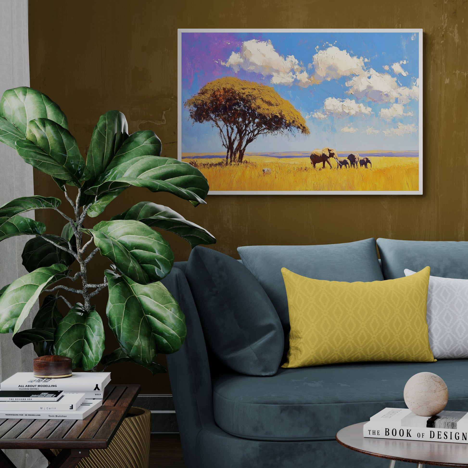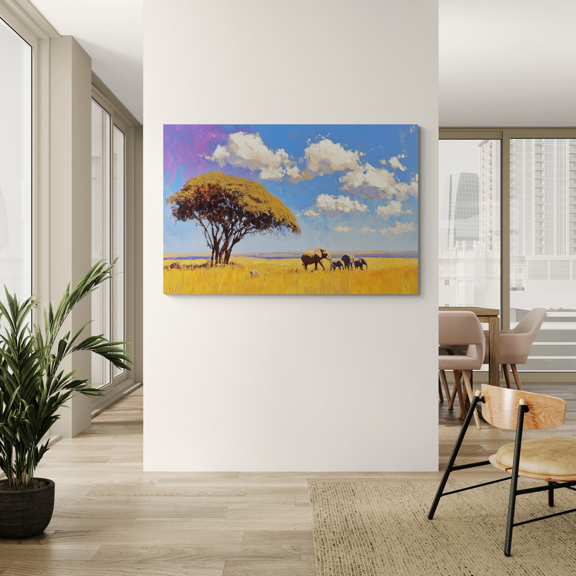 Diese digital gemalte Szene zeigt eine Savannenlandschaft in Kenya unter einem weiten Himmel mit lebendigen Pinselstrichen. Links im Bild steht eine markante Schirmakazie mit dichter, ockerfarbener Krone, die Schatten auf das goldene Gras wirft. Rechts davon zieht eine Elefantenfamilie gemächlich durch die Steppe – vier Tiere, darunter ein Junges. Die leuchtenden Farben – Blau, Gelb und Violett – betonen die Hitze, Weite und Ruhe dieses afrikanischen Nachmittags. Die stilisierte Darstellung verleiht der Szene eine künstlerische Tiefe, ohne ihren natürlichen Charme zu verlieren.
