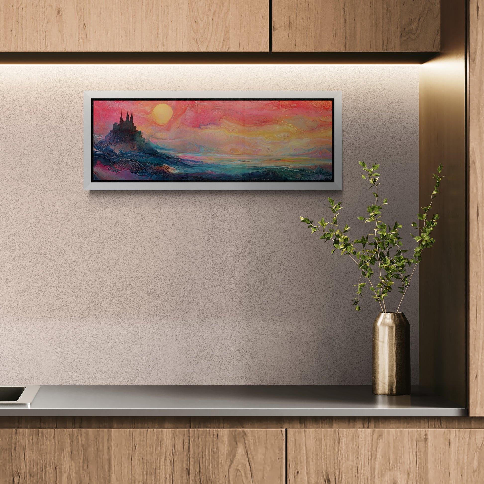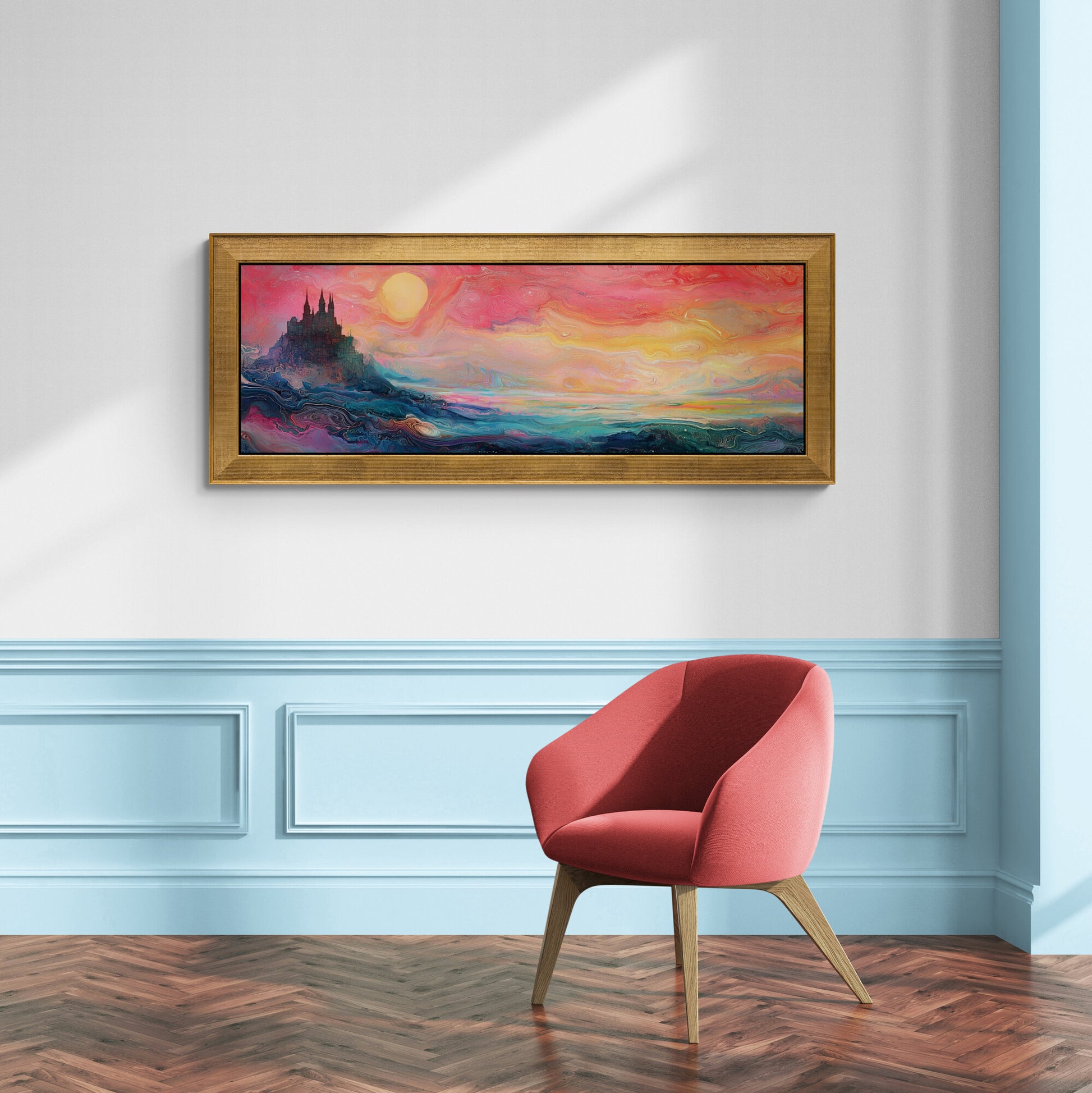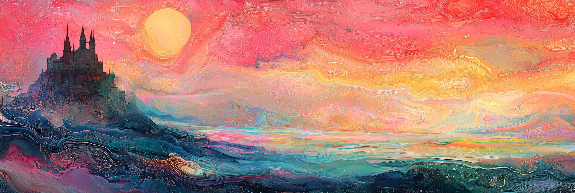Ein märchenhafter Sonnenuntergang über einem See, eingefasst in eine wirbelnde, farbintensive Komposition. Links erhebt sich eine düstere Burg mit spitzen Türmen auf einem Felsen, während sich rechts das Licht des Himmels in flüssigen Strukturen von Rosa, Orange, Gelb und Türkis über das Wasser ergießt. Die Struktur erinnert an marmorierte Tinte oder gegossene Acrylfarbe, wodurch das gesamte Bild eine surreale Tiefe und Bewegung erhält. Die Szene wirkt wie ein Blick in ein Traumreich – zwischen Romantik und Magie.