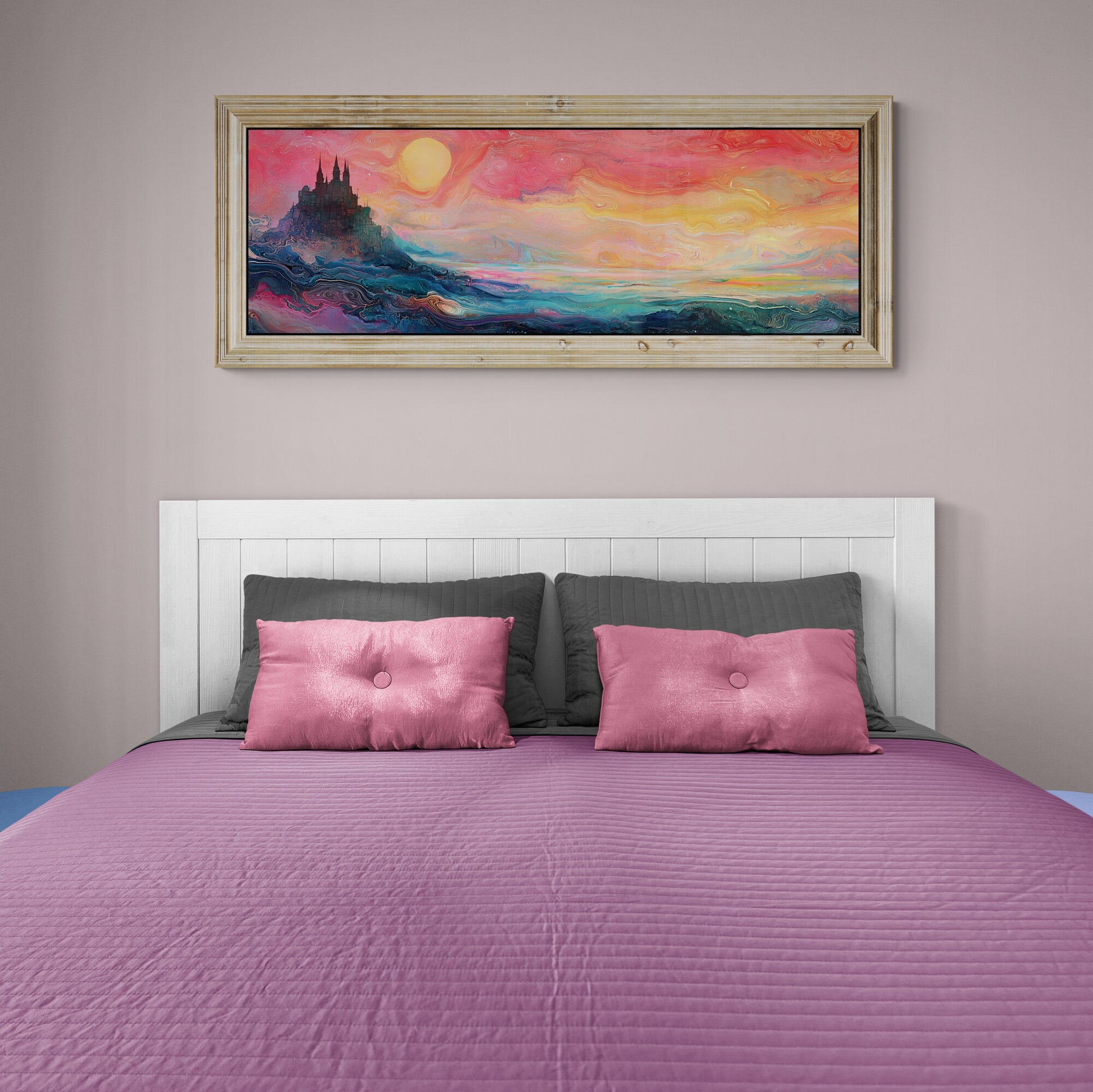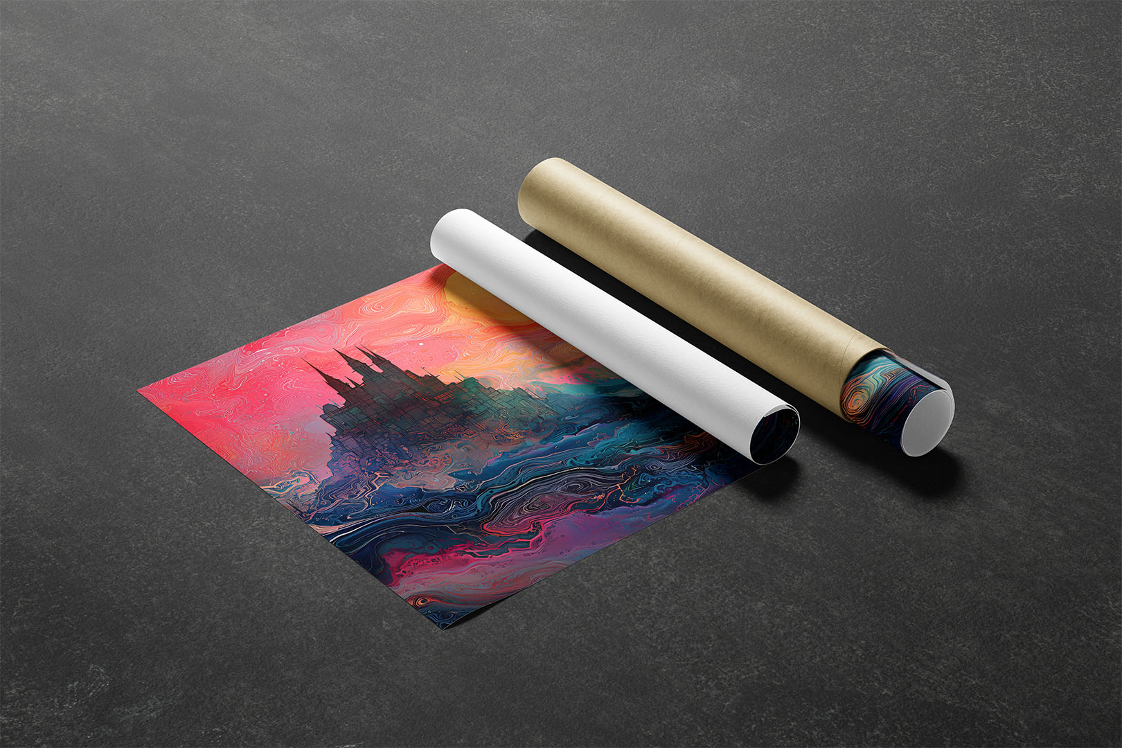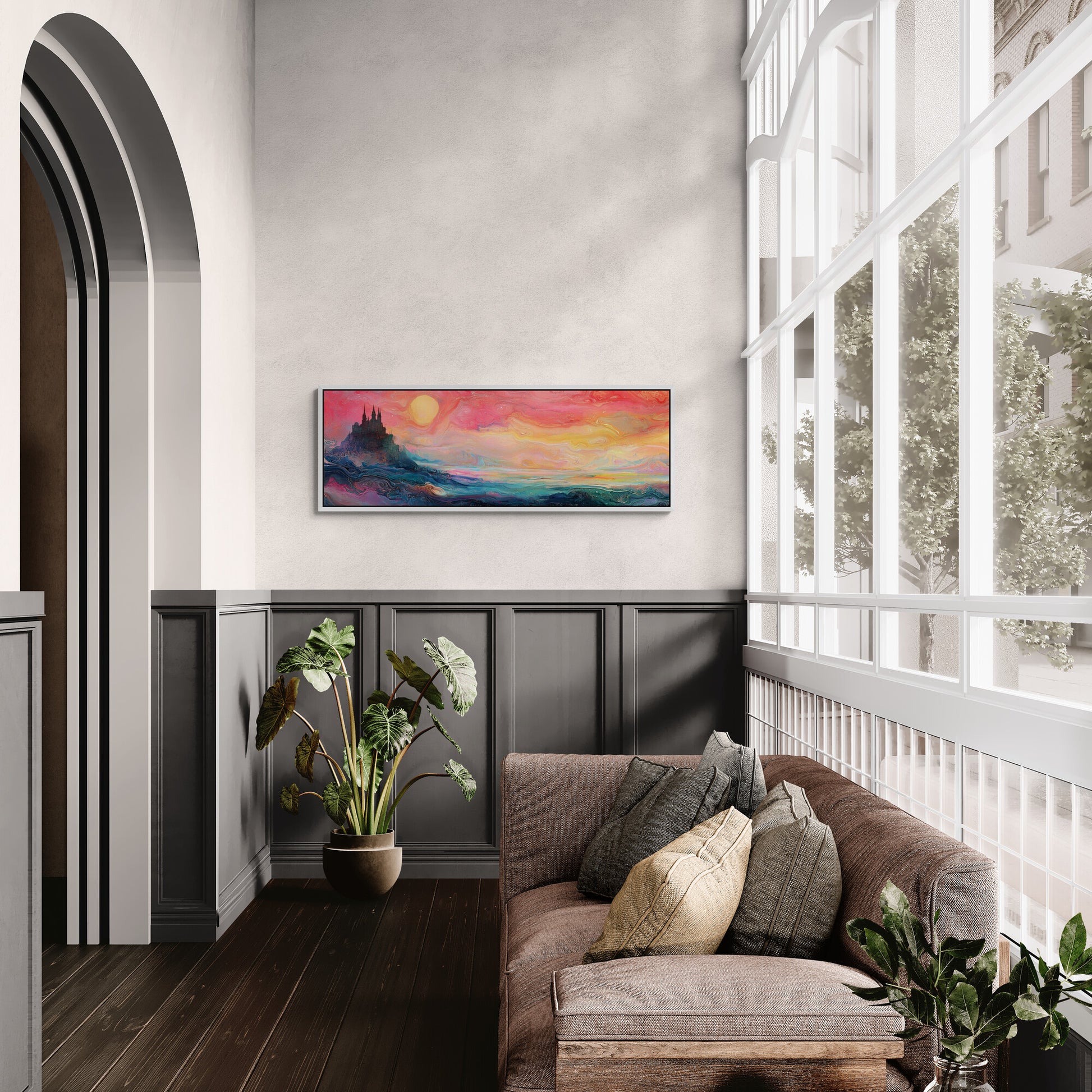 Ein märchenhafter Sonnenuntergang über einem See, eingefasst in eine wirbelnde, farbintensive Komposition. Links erhebt sich eine düstere Burg mit spitzen Türmen auf einem Felsen, während sich rechts das Licht des Himmels in flüssigen Strukturen von Rosa, Orange, Gelb und Türkis über das Wasser ergießt. Die Struktur erinnert an marmorierte Tinte oder gegossene Acrylfarbe, wodurch das gesamte Bild eine surreale Tiefe und Bewegung erhält. Die Szene wirkt wie ein Blick in ein Traumreich – zwischen Romantik und Magie.
