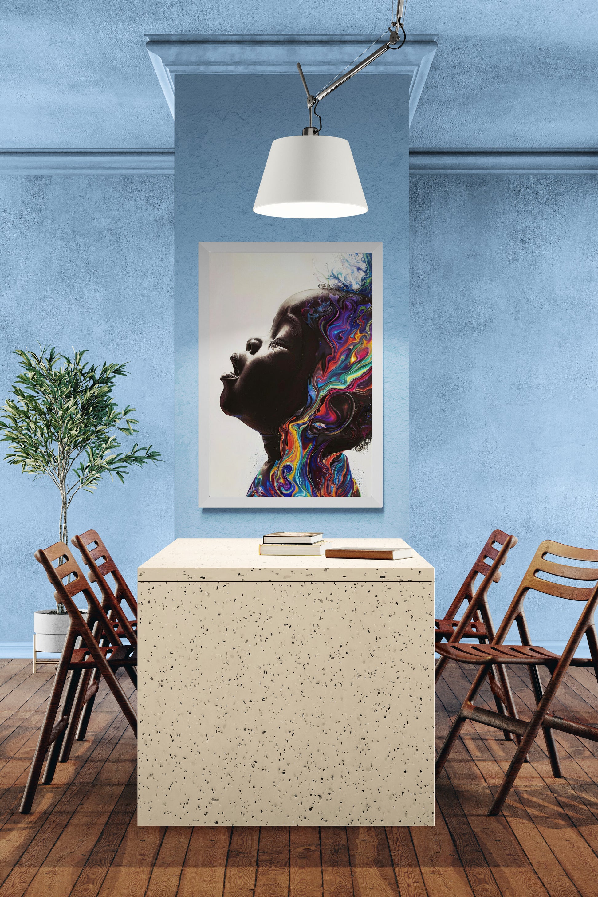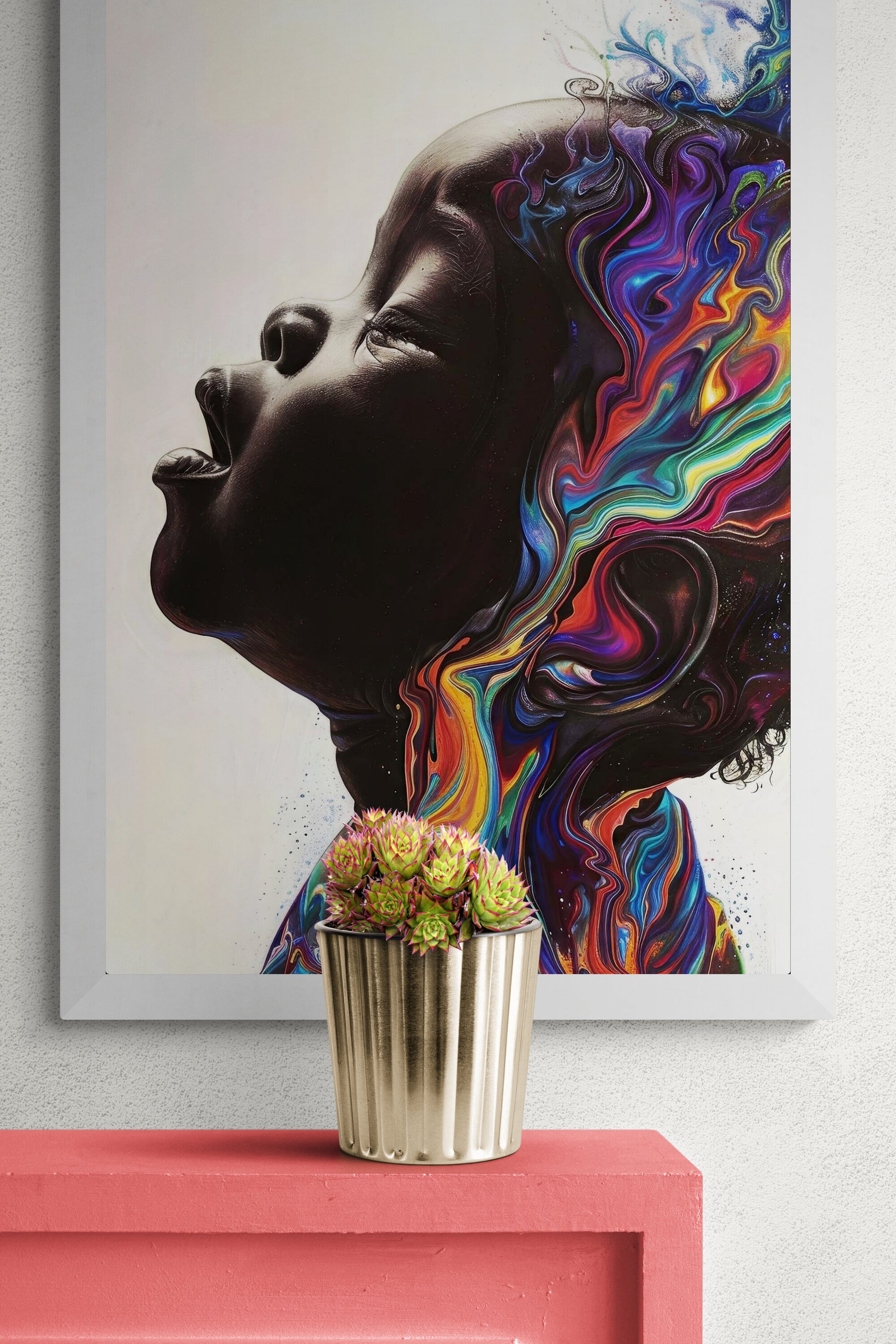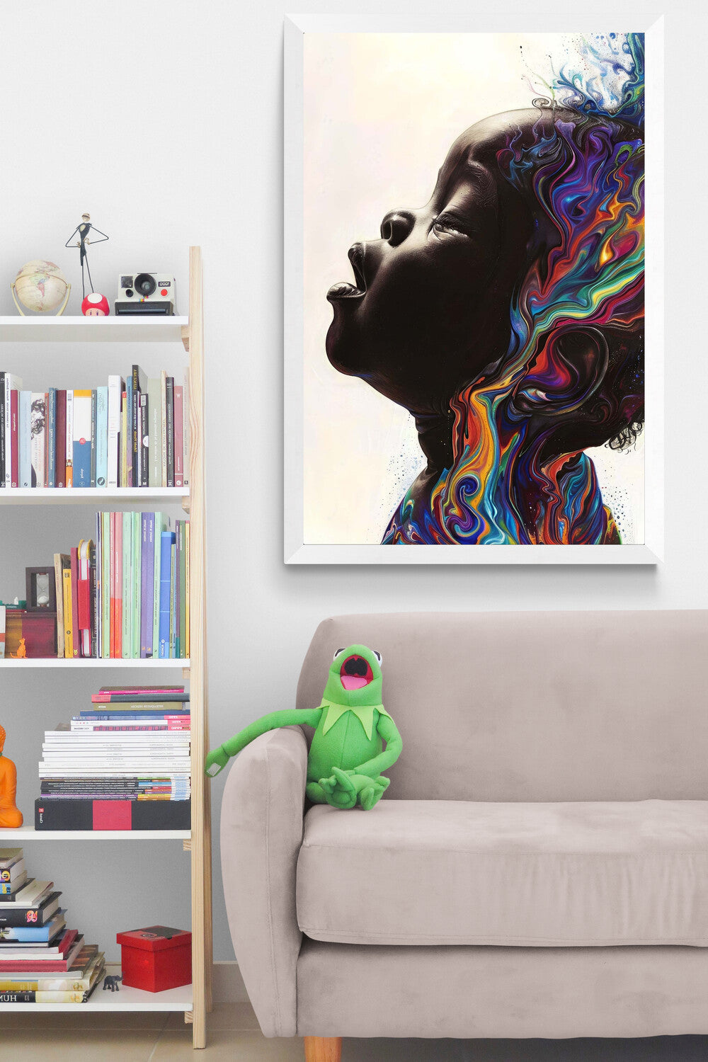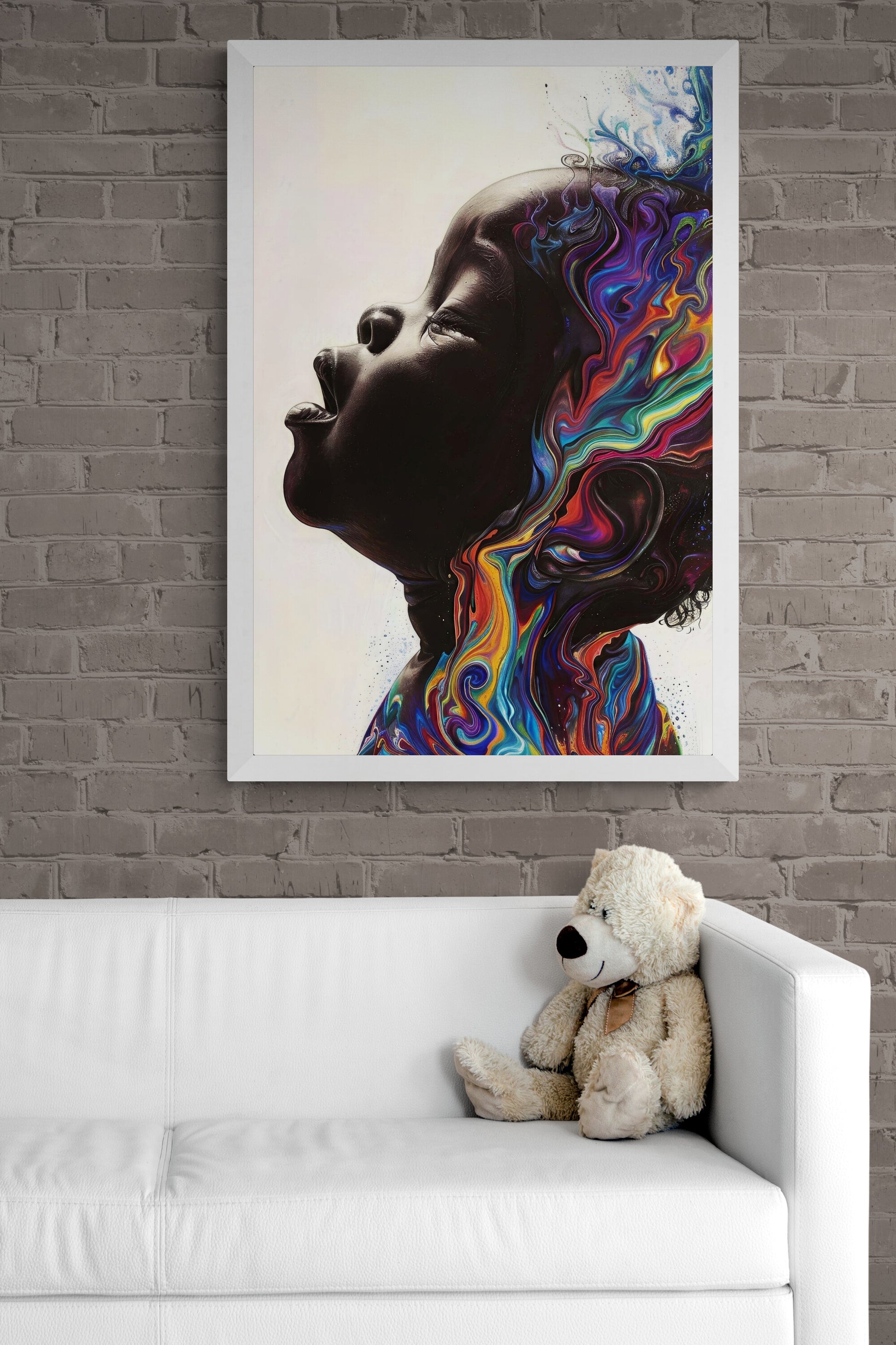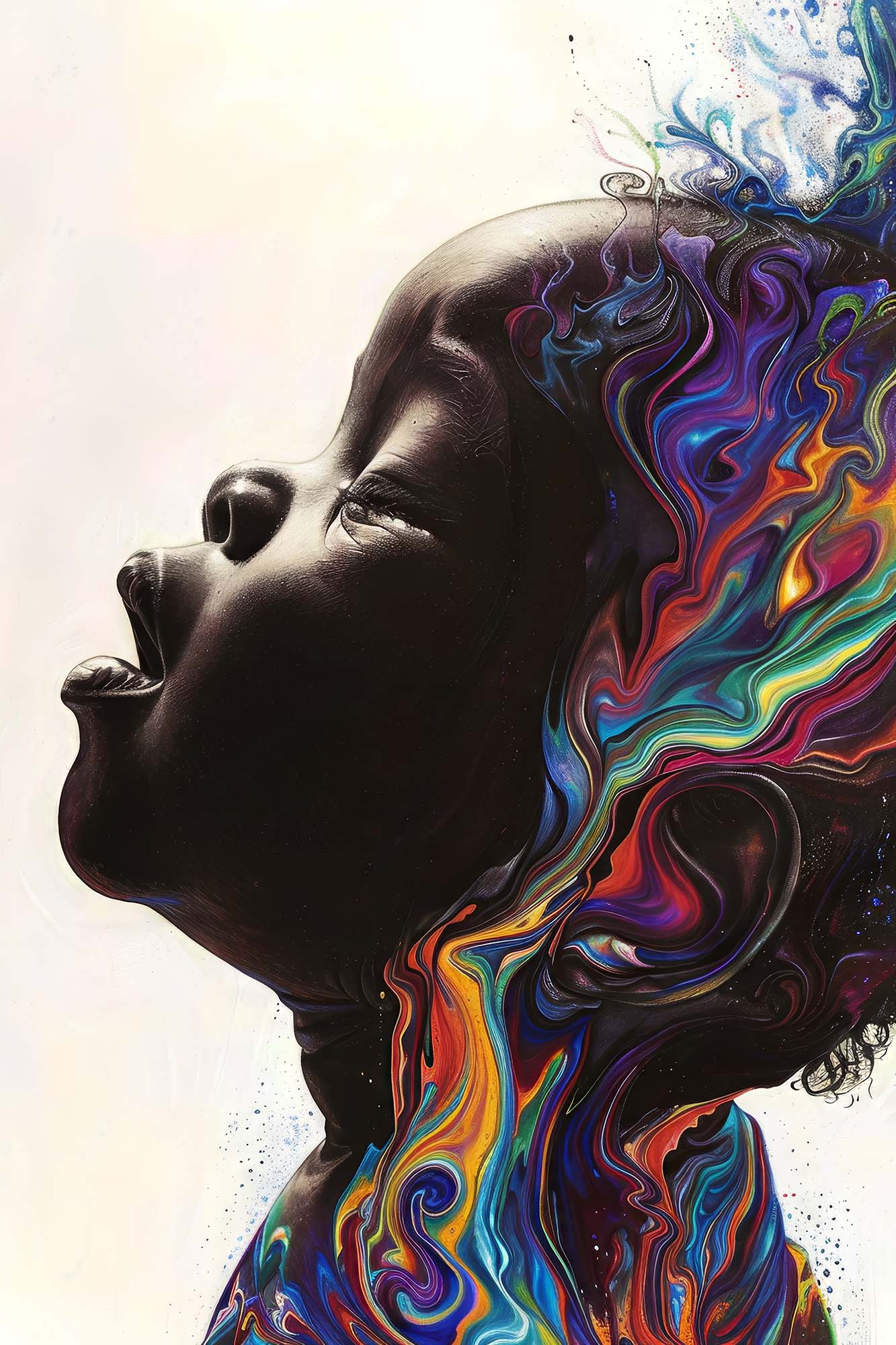 Ein Moment reiner Energie. Das Profil eines Kindes, der Kopf leicht nach oben geneigt, als würde ein Lied in den Raum hinausgetragen. Aus dem Inneren strömen Farben hervor: leuchtende Linien, fließende Wirbel, vibrierende Töne aus Blau, Magenta, Gelb und Grün. Es wirkt, als würde die Stimme selbst sichtbar werden.