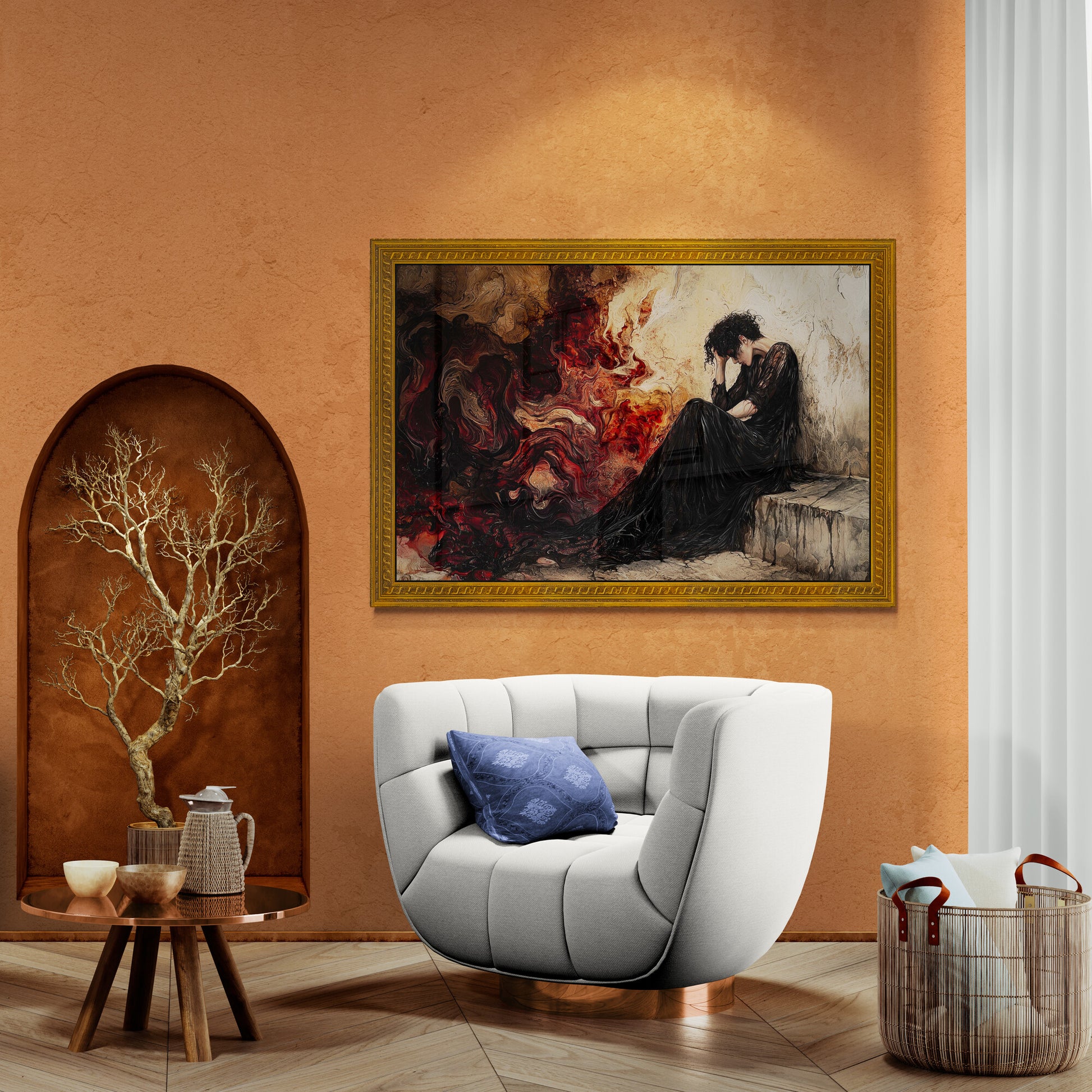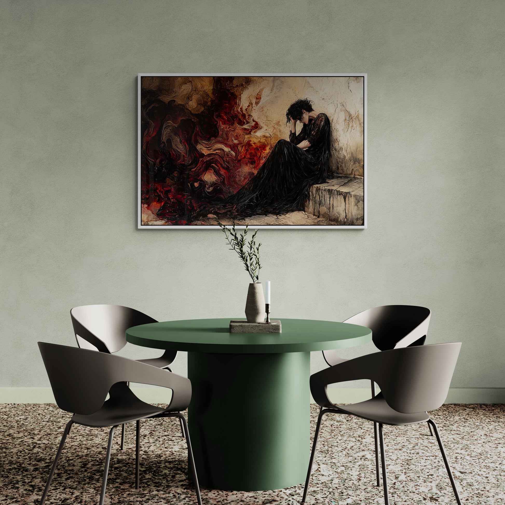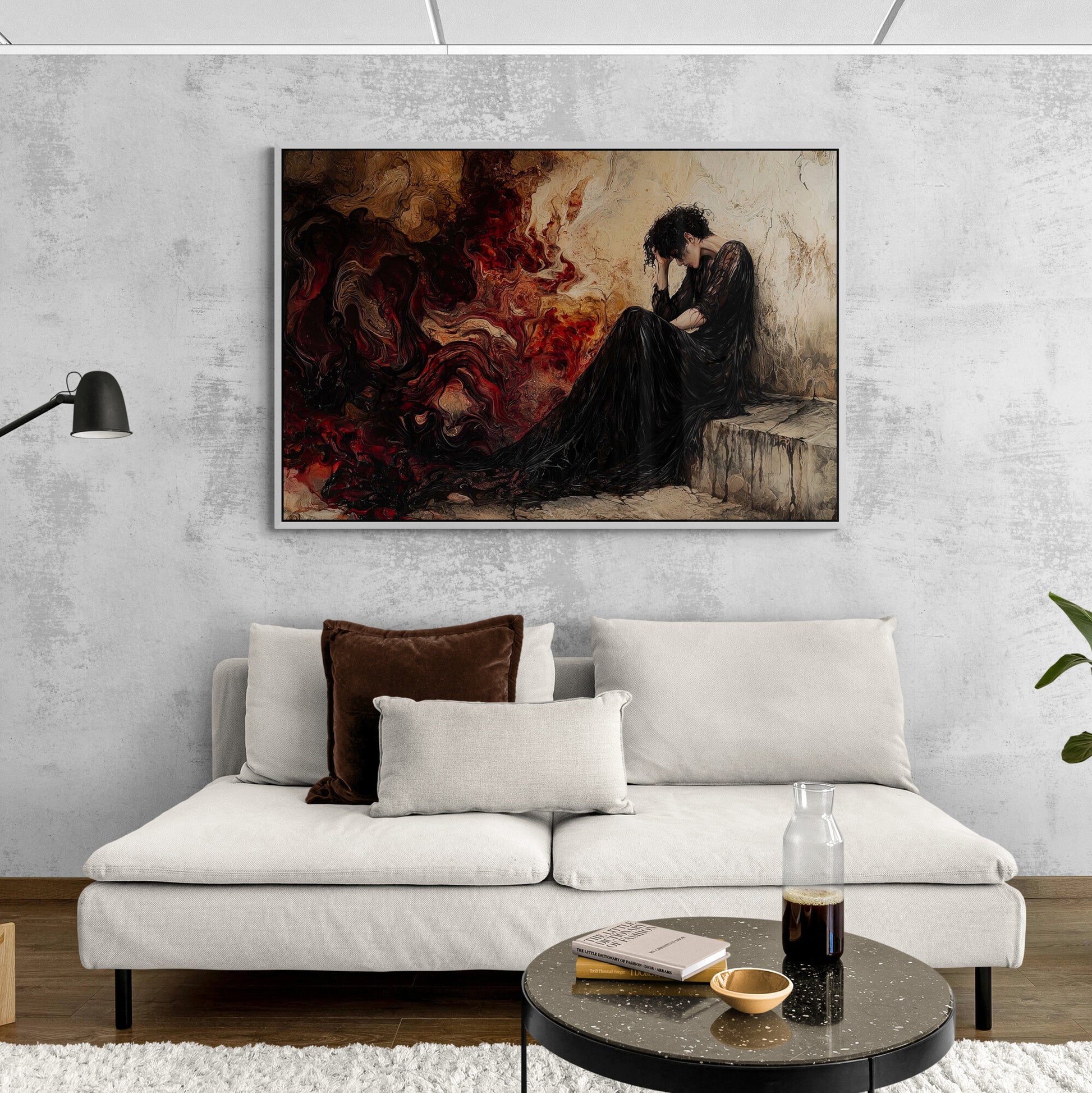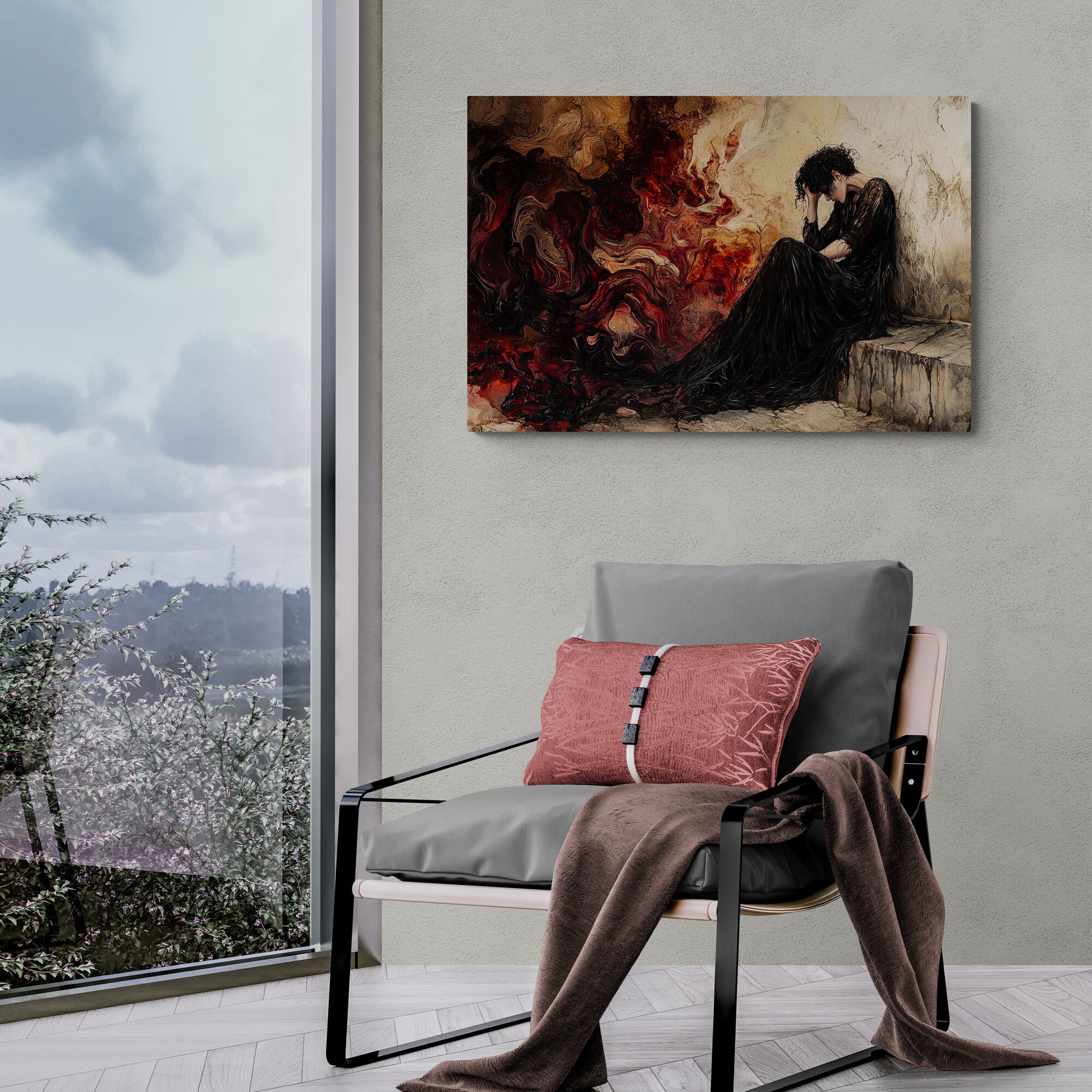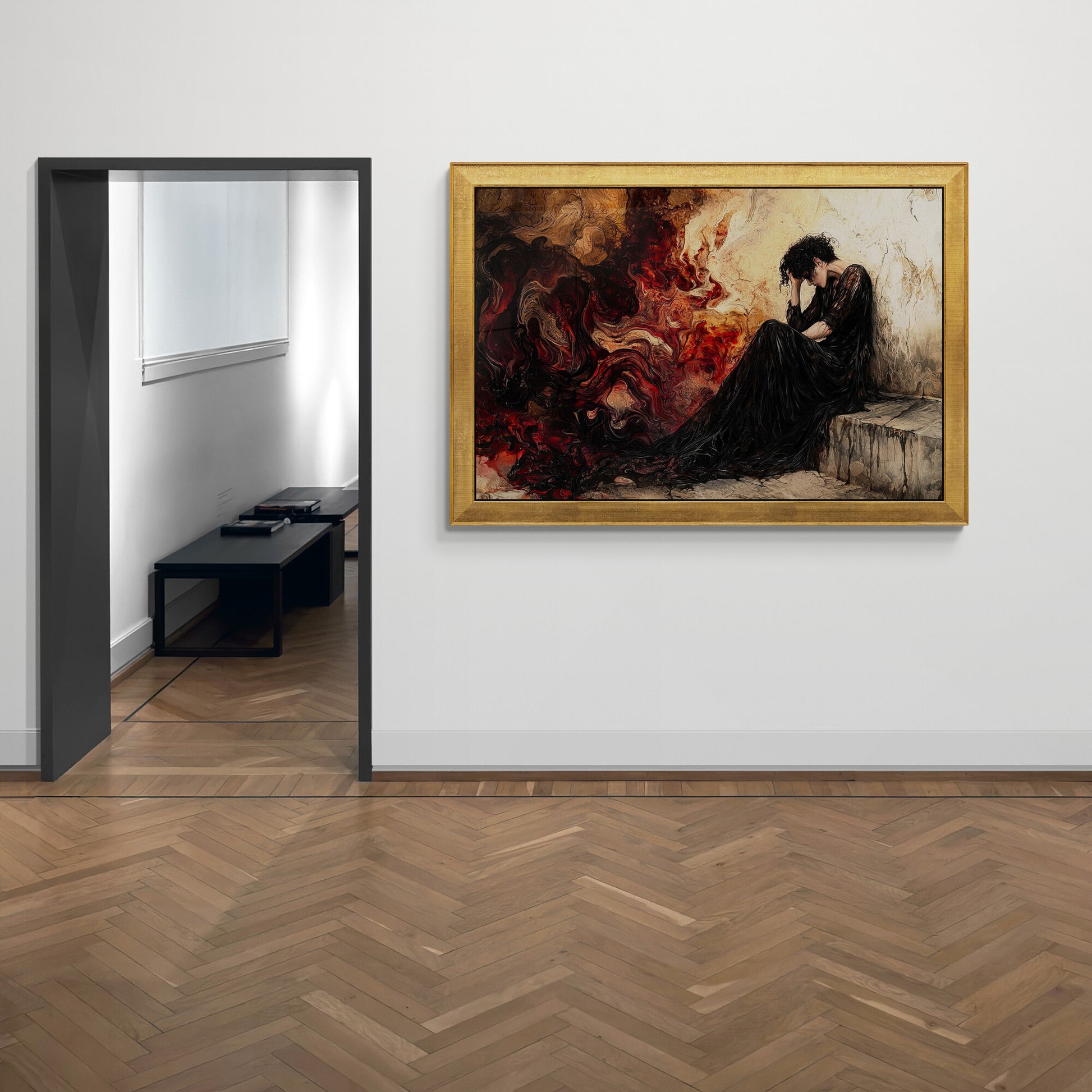 Eine schwarz gekleidete, androgyn wirkende Gestalt sitzt in nachdenklicher Haltung auf einer verwitterten Steinstufe. Das schwarze Gewand fließt wie zähes Öl über den Boden und verschmilzt nahtlos mit einem abstrakten, rot-schwarzen Strudel aus Farbe und Form. Die linke Bildhälfte wird von dieser expressiven Struktur dominiert, während die rechte Seite eine bröckelnde, helle Wand zeigt – ein Kontrast zwischen innerem Aufruhr und äußerer Stille.