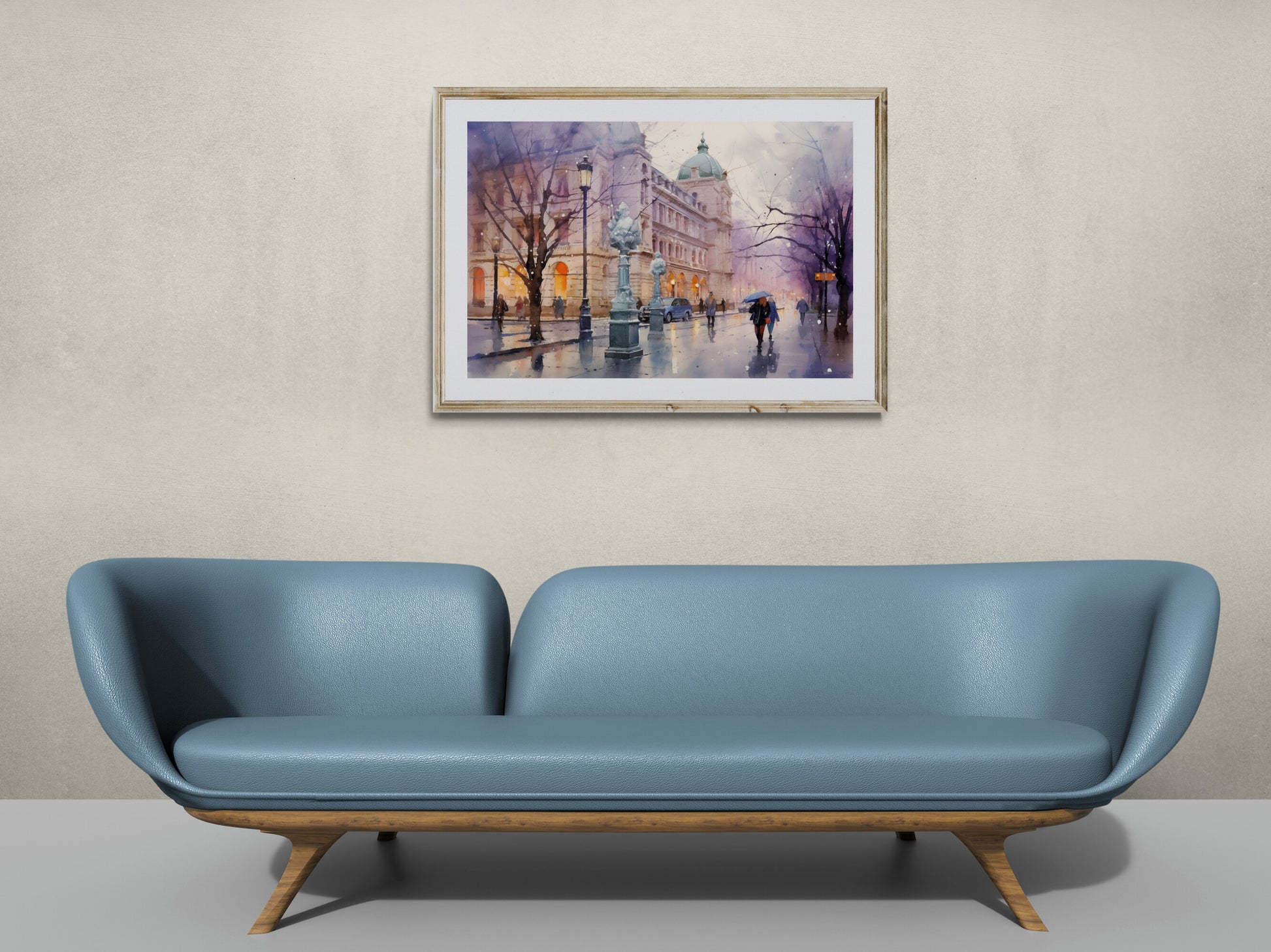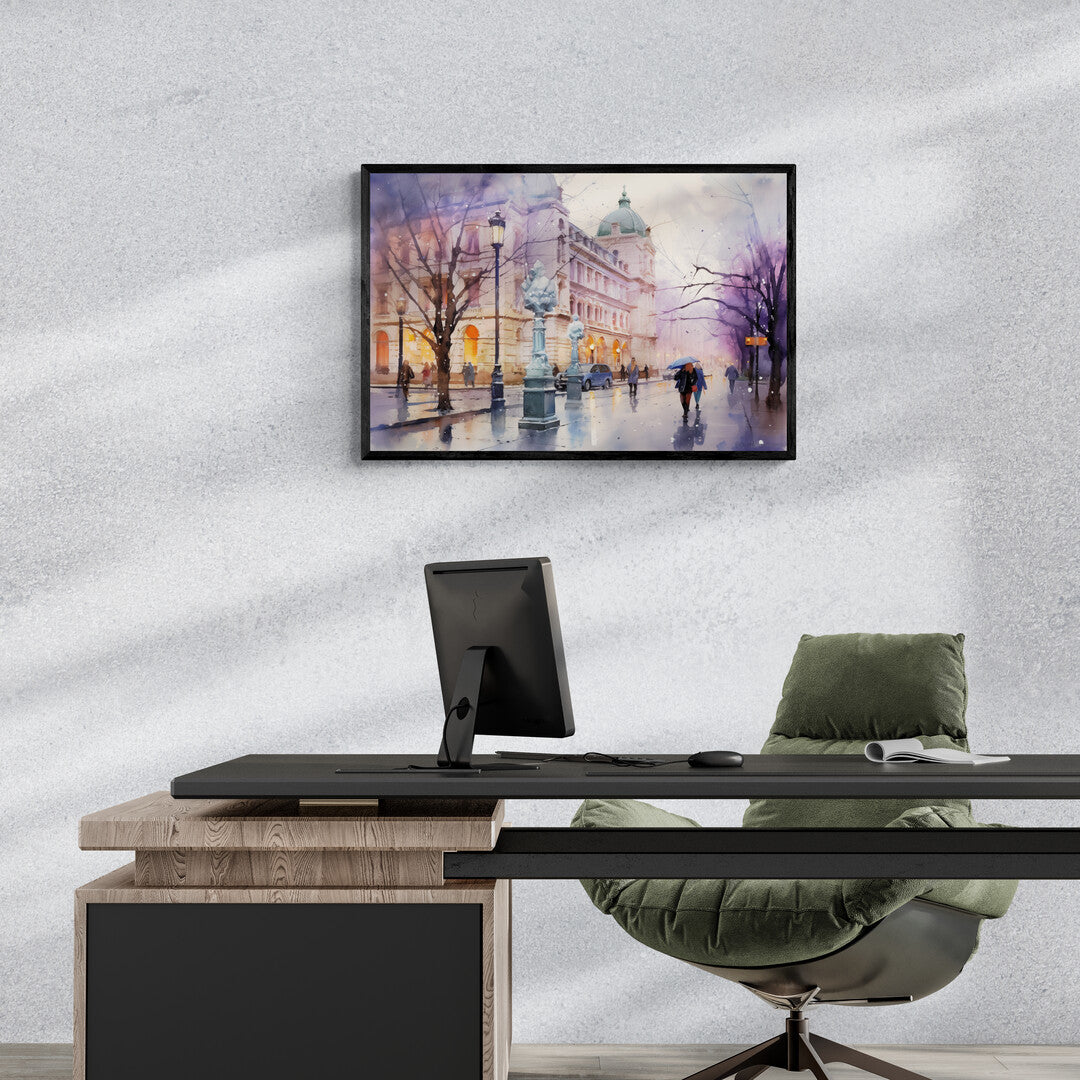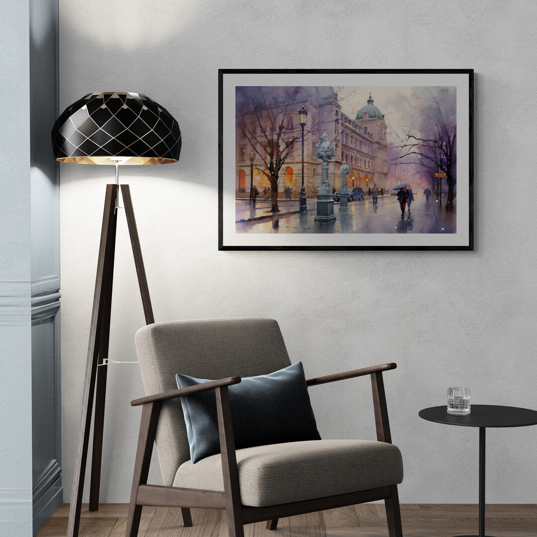 Ein regnerischer Abend in Berlin: Die nassen Straßen spiegeln das warme Licht der Laternen wider, während Passanten mit Regenschirmen vorbeieilen. Vor der prächtigen Architektur eines historischen Gebäudes mit grüner Kuppel entfaltet sich eine melancholische, doch lebendige Szene. Die kahlen Bäume und das sanfte Farbenspiel aus Blau, Lila und Gold verleihen dem Bild eine stimmungsvolle Tiefe.