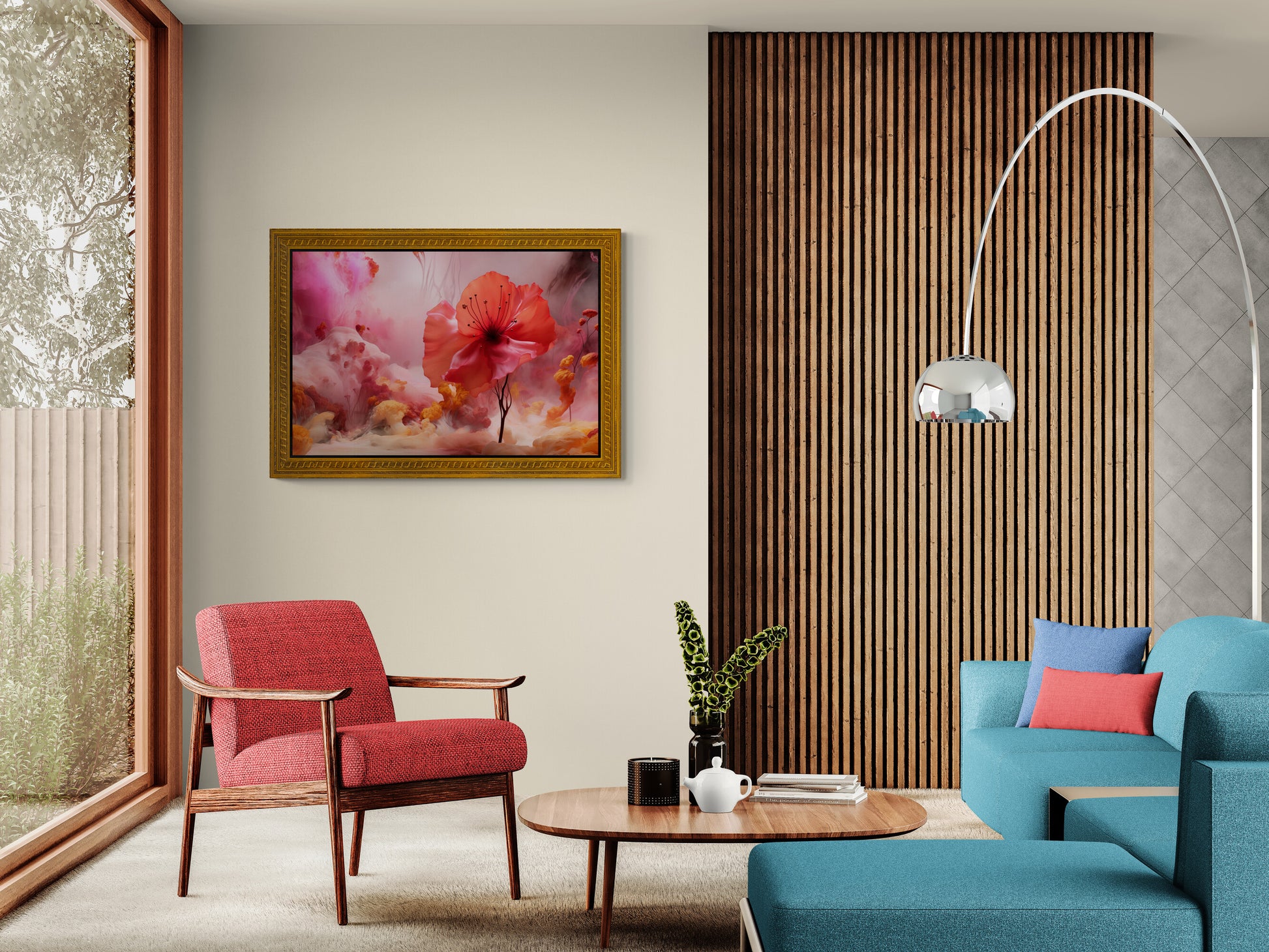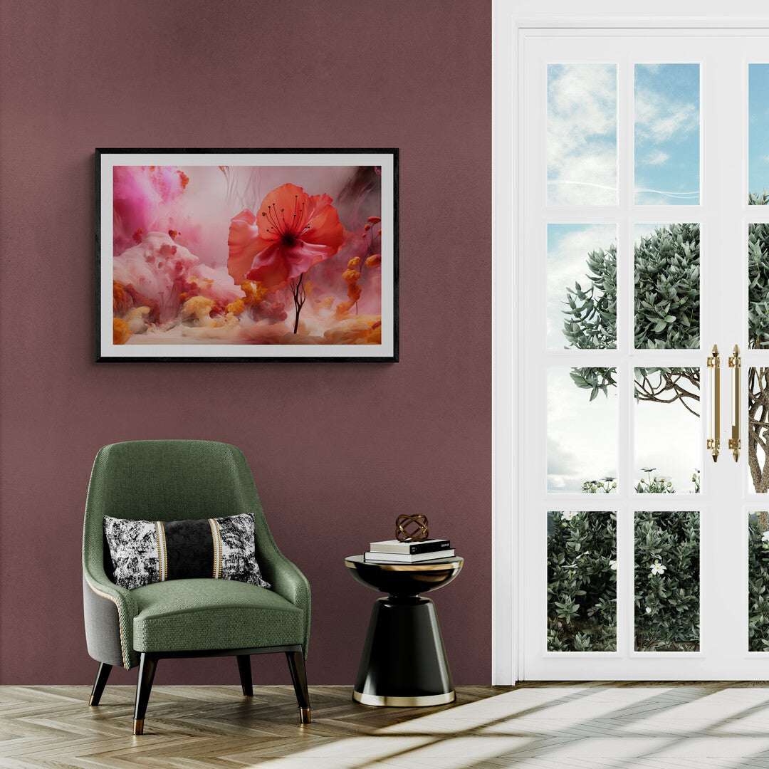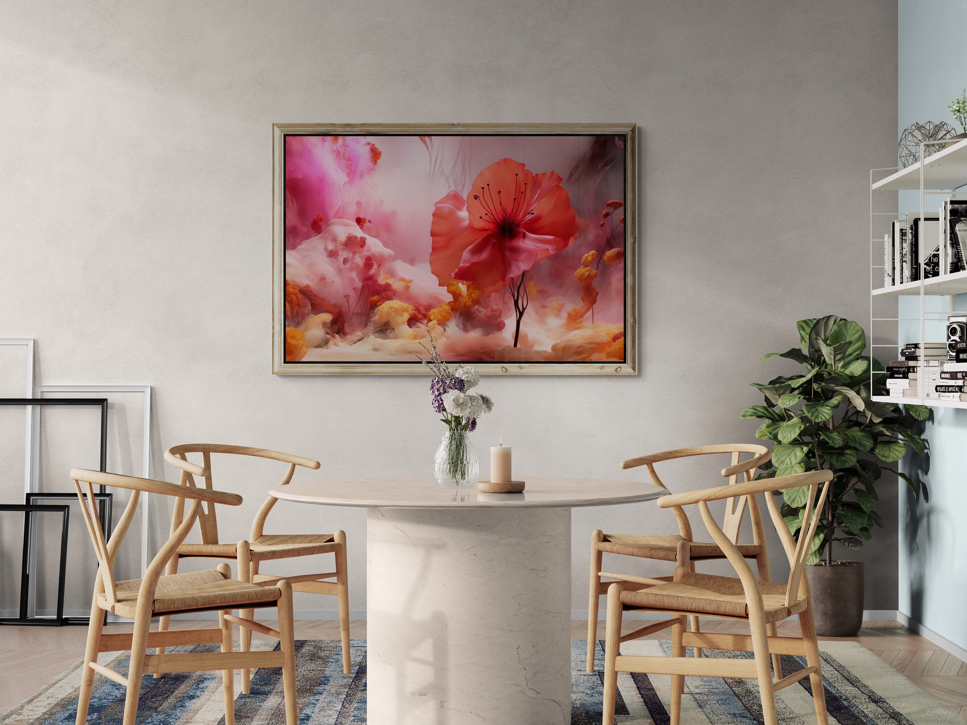 Ein leuchtender, fast surreal wirkender Mohn erhebt sich in einer verträumten Landschaft aus schwebenden Nebelschwaden und sanften Farbübergängen. Die Szenerie scheint aus fließenden Pigmenten und Wolken zu bestehen, in denen sich warme Rottöne mit sanften Pfirsich- und Goldnuancen vermischen. Der filigrane Blütenstempel ragt aus den üppigen Blättern heraus und verleiht dem Motiv eine fast skulpturale Eleganz. Eine Komposition, die Natur und Fantasie in einem atmosphärischen Farbspiel vereint.