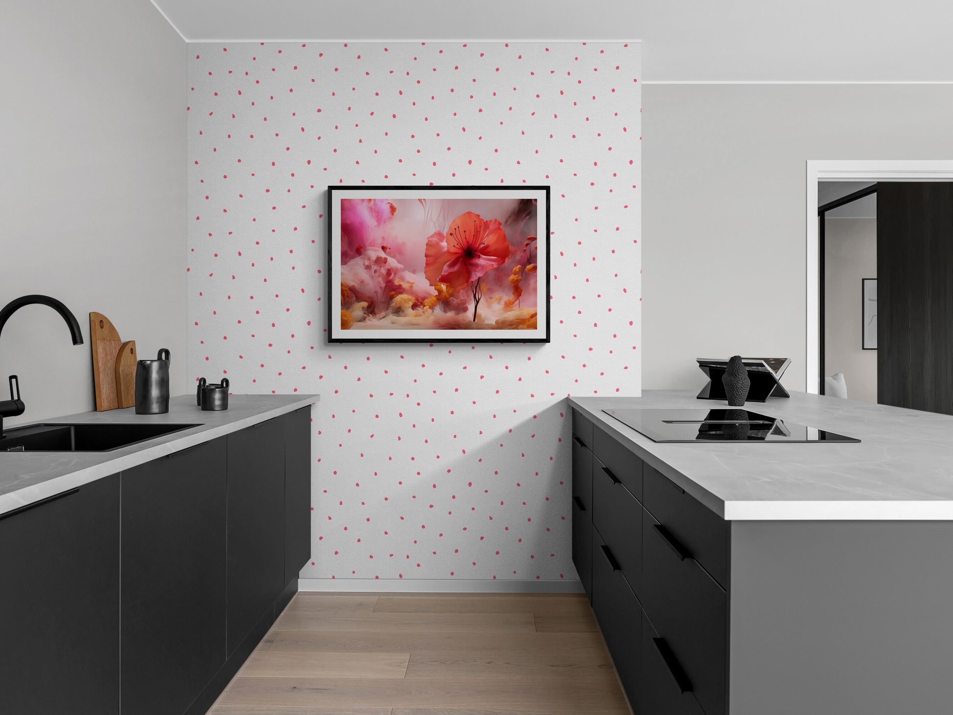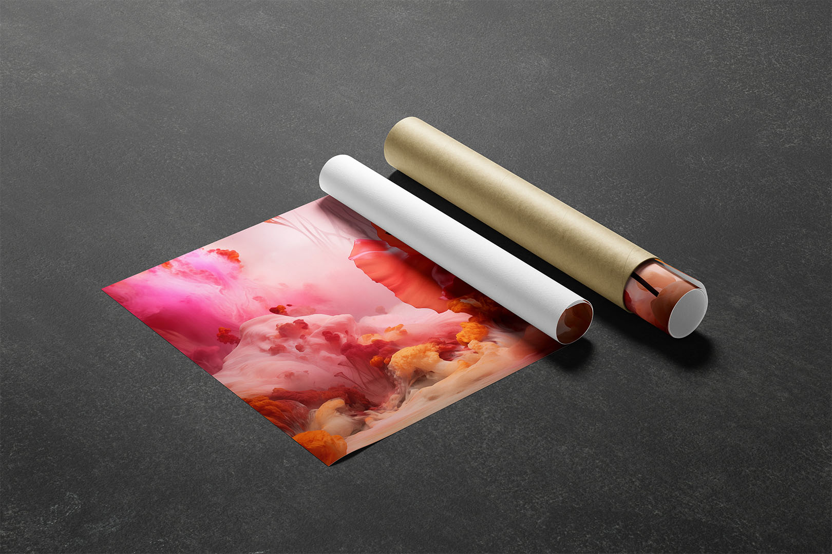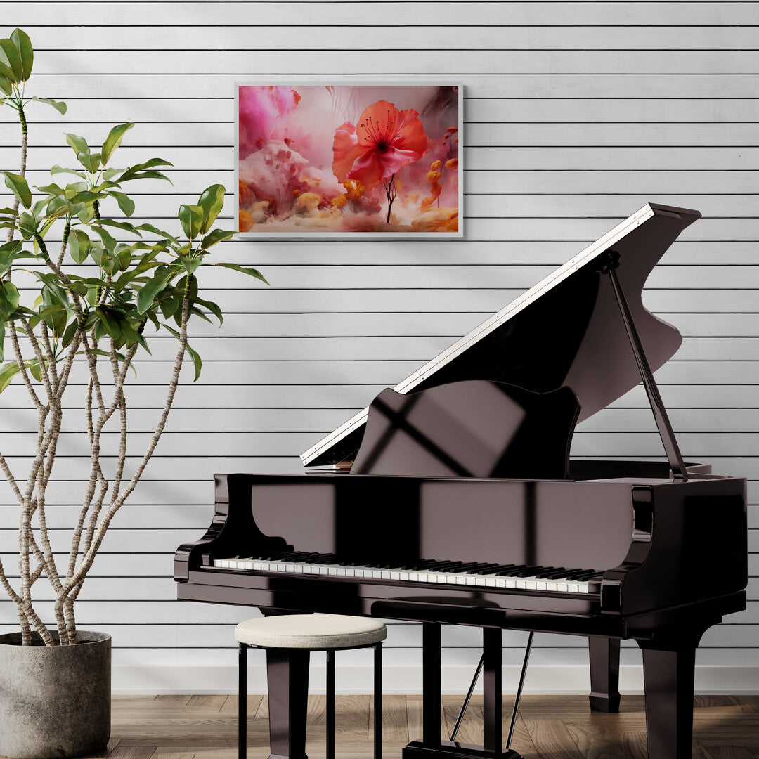Ein leuchtender, fast surreal wirkender Mohn erhebt sich in einer verträumten Landschaft aus schwebenden Nebelschwaden und sanften Farbübergängen. Die Szenerie scheint aus fließenden Pigmenten und Wolken zu bestehen, in denen sich warme Rottöne mit sanften Pfirsich- und Goldnuancen vermischen. Der filigrane Blütenstempel ragt aus den üppigen Blättern heraus und verleiht dem Motiv eine fast skulpturale Eleganz. Eine Komposition, die Natur und Fantasie in einem atmosphärischen Farbspiel vereint.