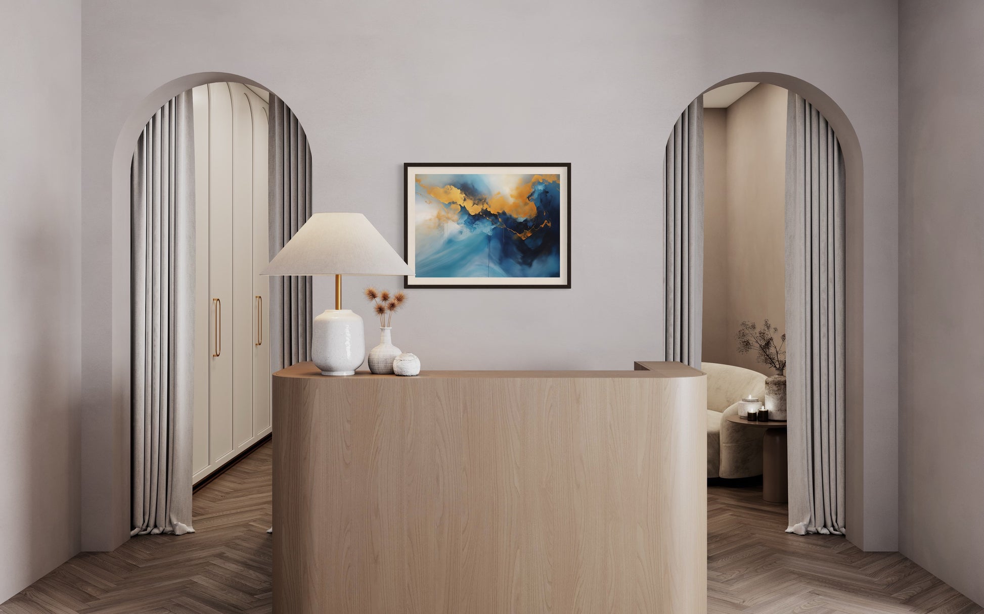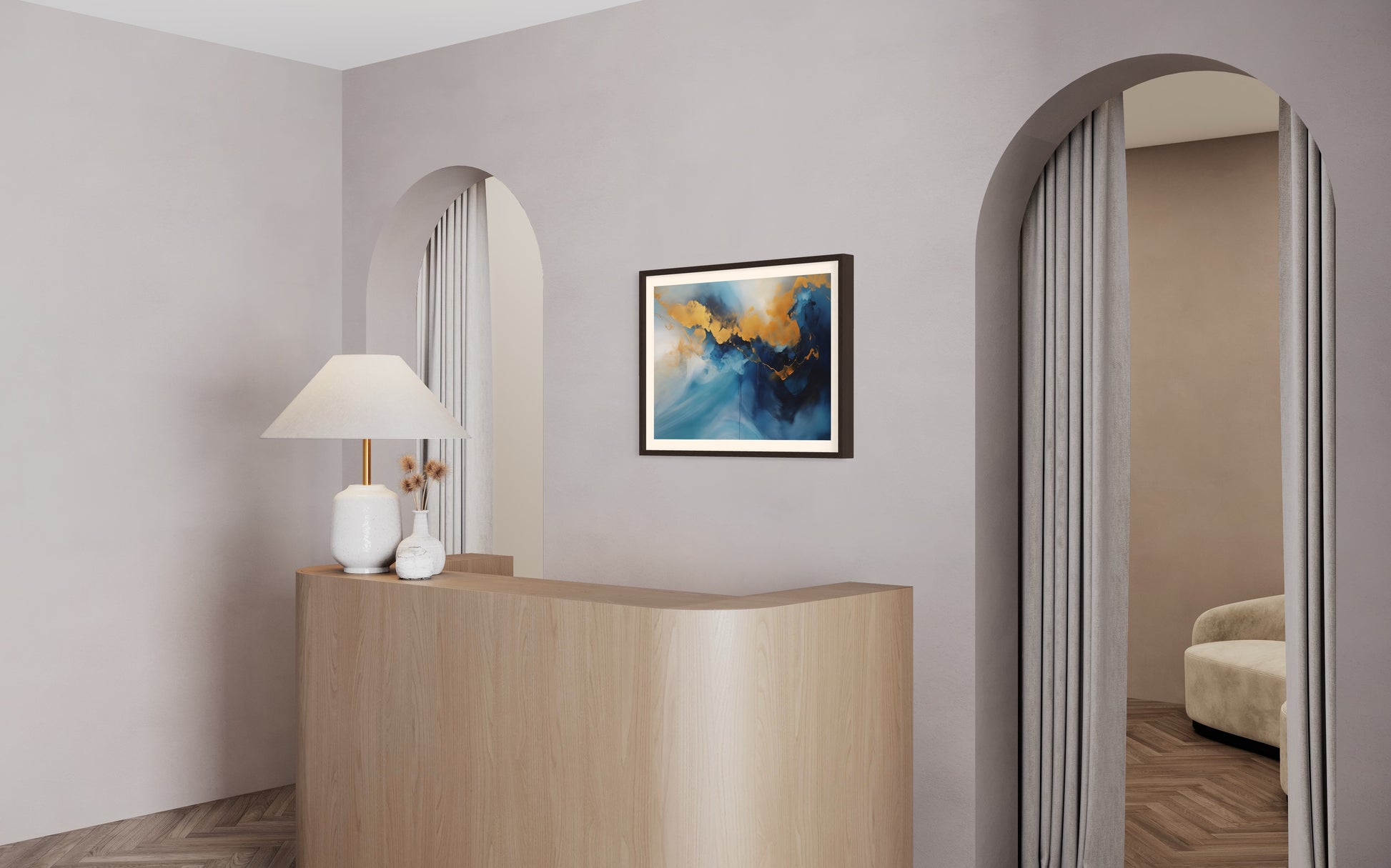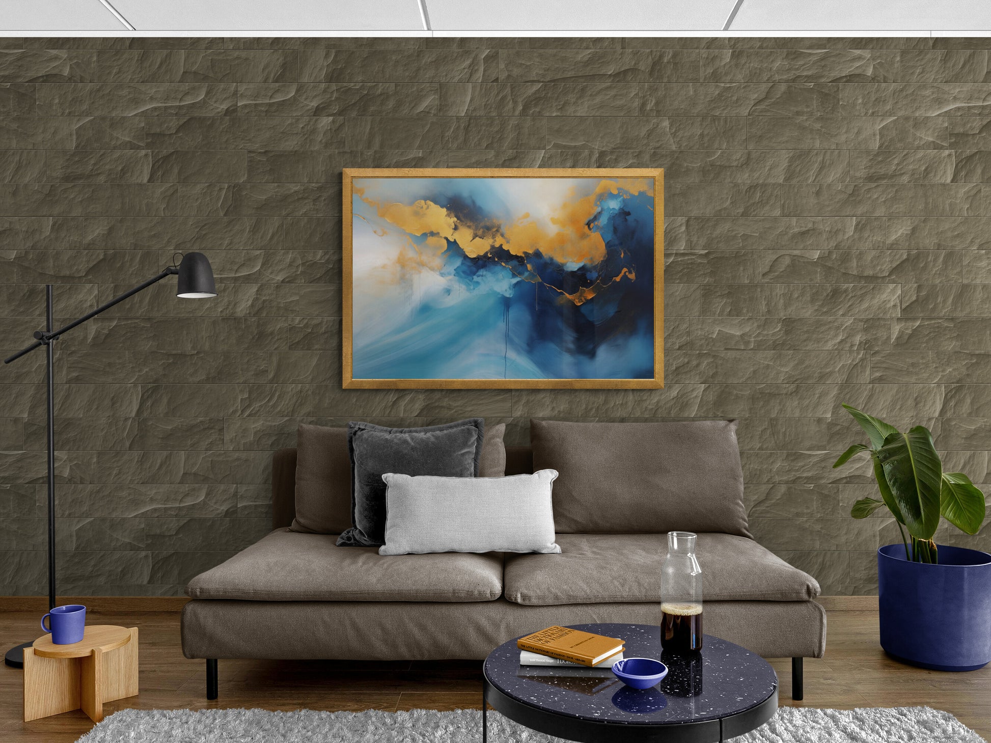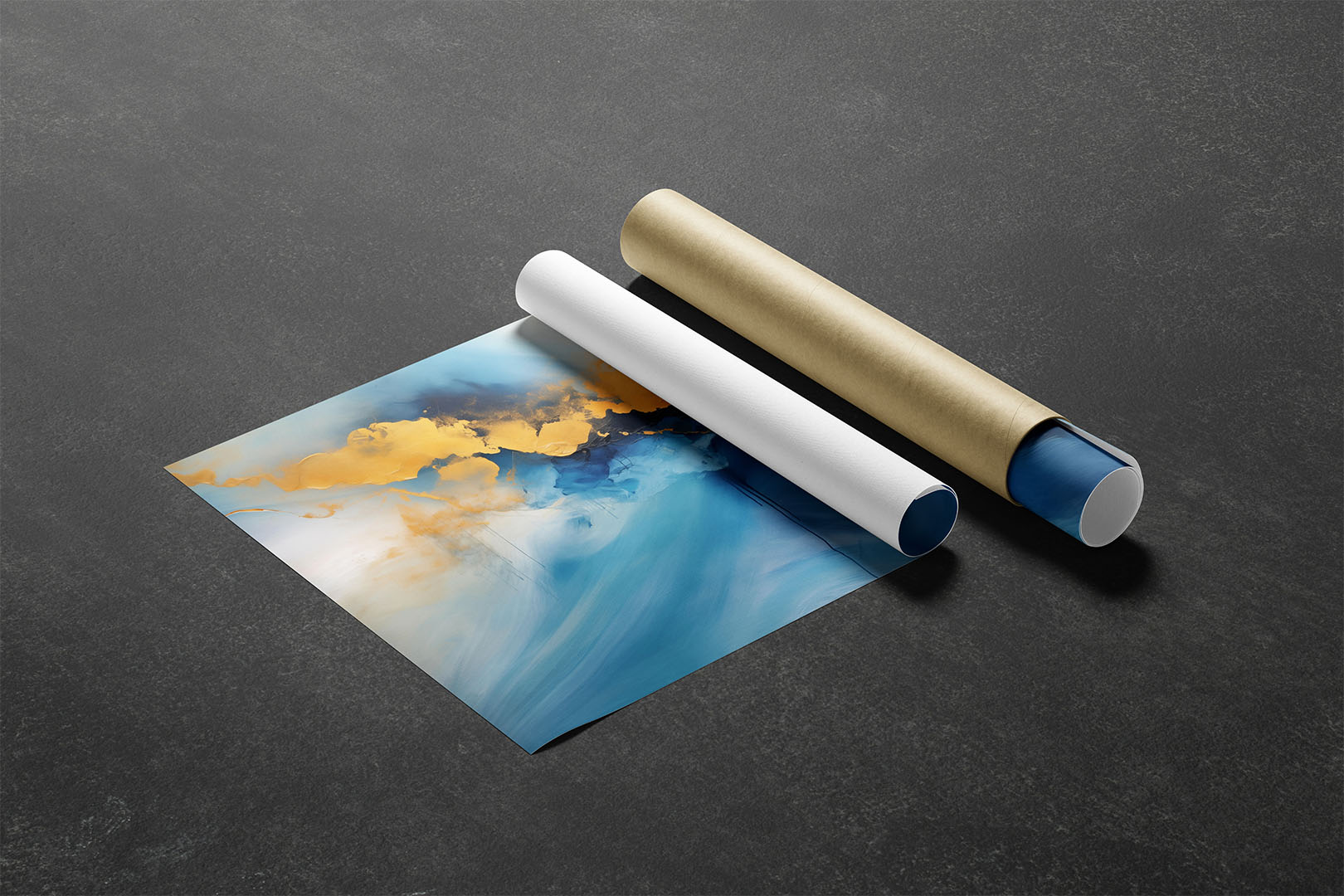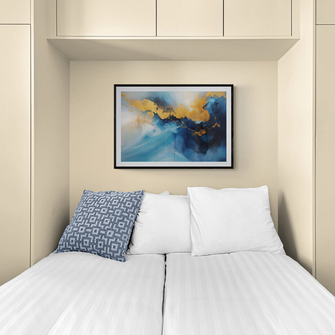 Ein faszinierendes abstraktes Kunstwerk, das intensive Blautöne mit goldenen Akzenten verbindet. Die goldfarbenen Strukturen fließen wie eine schimmernde Lichtlinie durch die dunkleren Bereiche und erzeugen einen beeindruckenden Kontrast. Die Komposition erinnert an eine atmosphärische Landschaft oder eine abstrakte Bergkette im Dunst. Der Farbverlauf von hellem zu tiefem Blau verleiht dem Bild eine dynamische Tiefe. Beim Druck erscheint das Gold als Gelb, wodurch der Effekt verändert, aber die kraftvolle Eleganz der Darstellung erhalten bleibt.