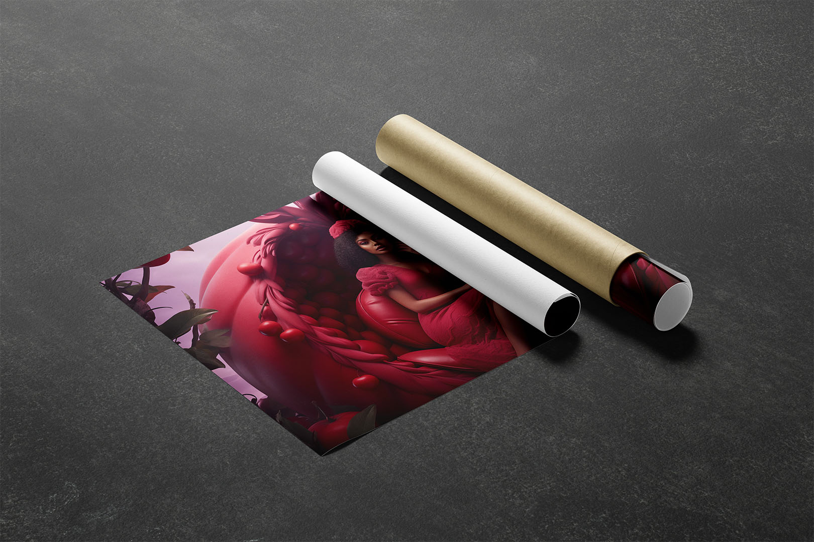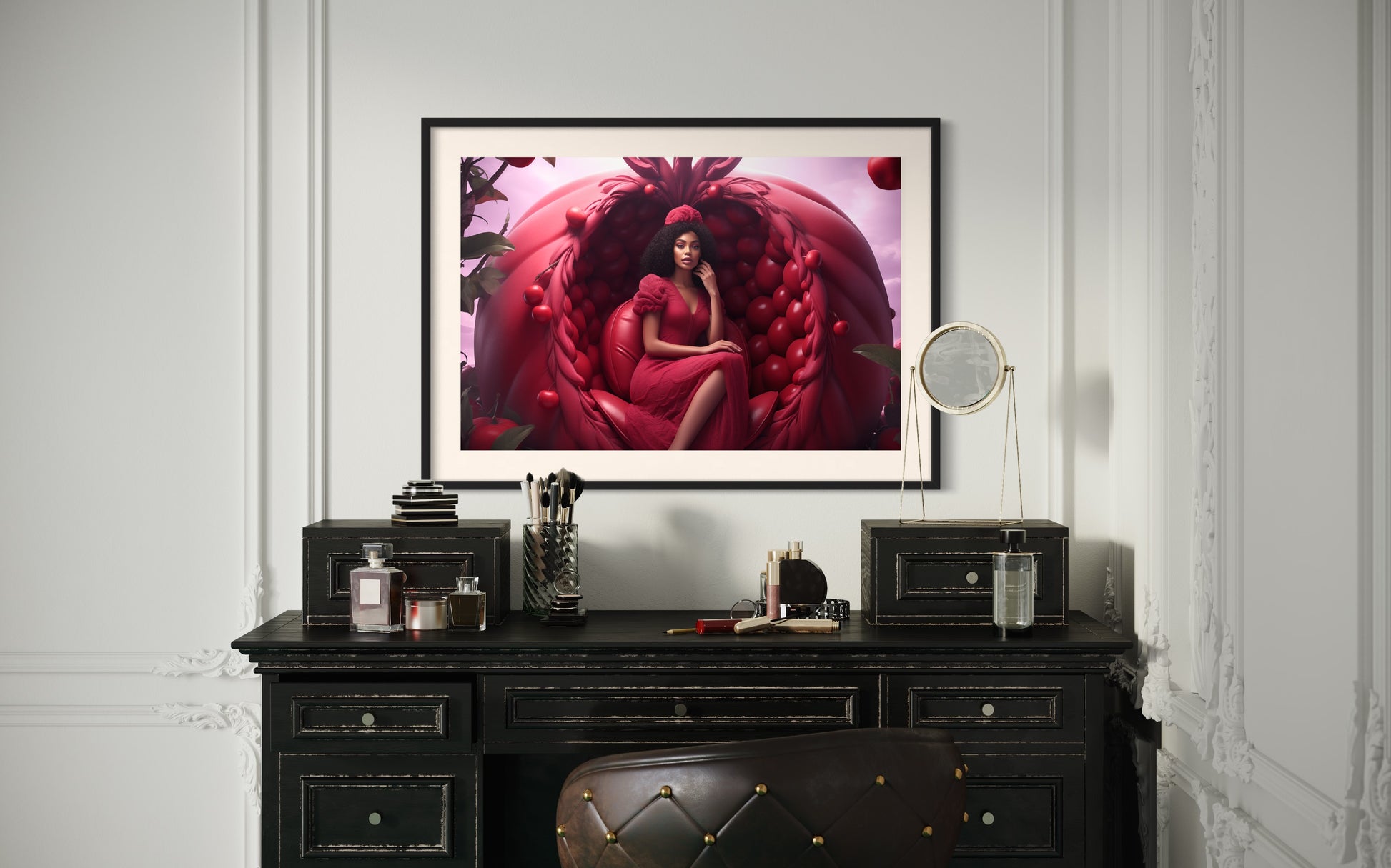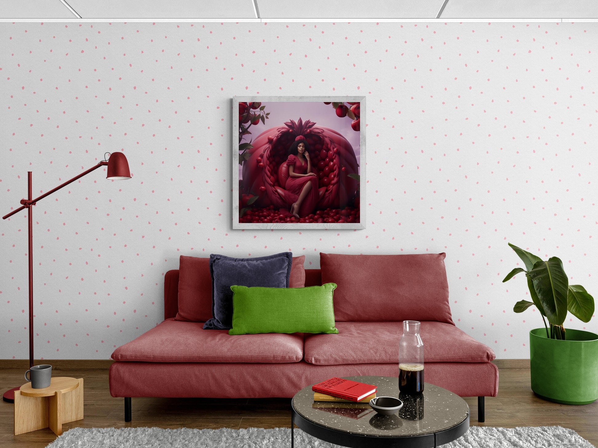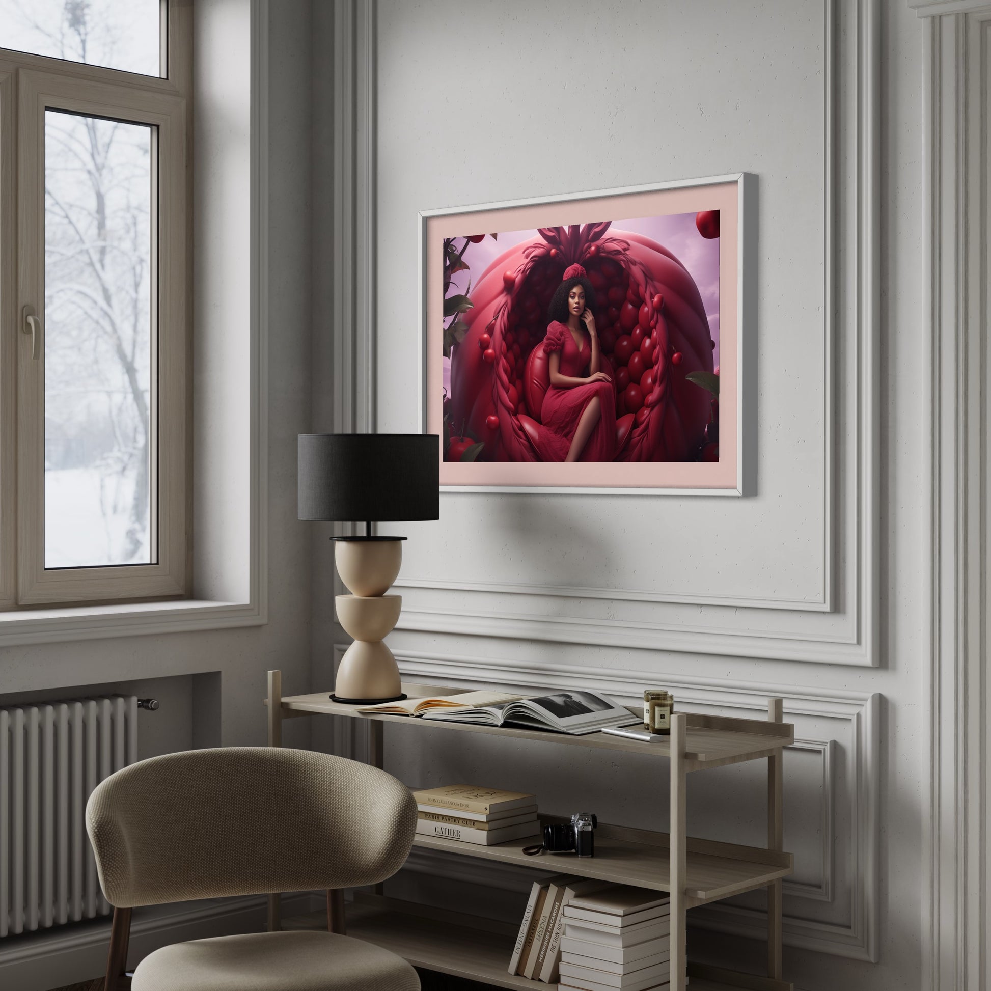 Eine elegante Frau mit dunklen Locken sitzt in einem kunstvollen, kirschroten Thronsessel, der die Form eines aufgeschnittenen Granatapfels hat. Ihr Kleid in tiefem Rot mit verspielten Puffärmeln fügt sich harmonisch in die opulente Szenerie ein. Die Hintergrundtöne aus sanftem Rosa und Purpur erzeugen eine geheimnisvolle, fast surreale Atmosphäre.