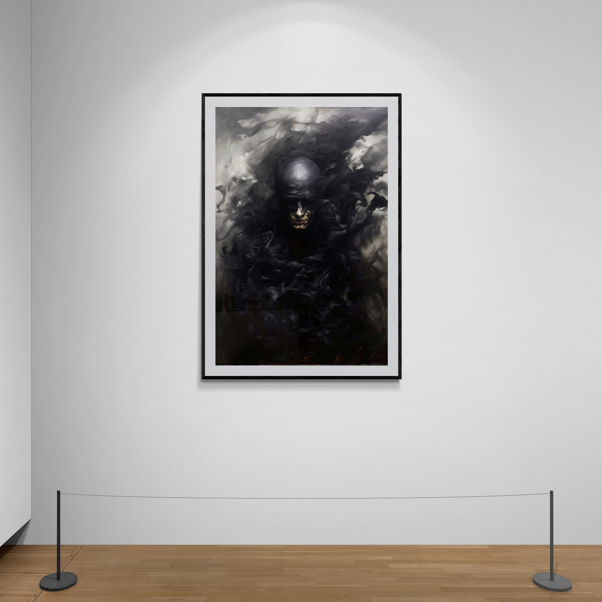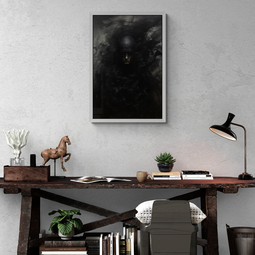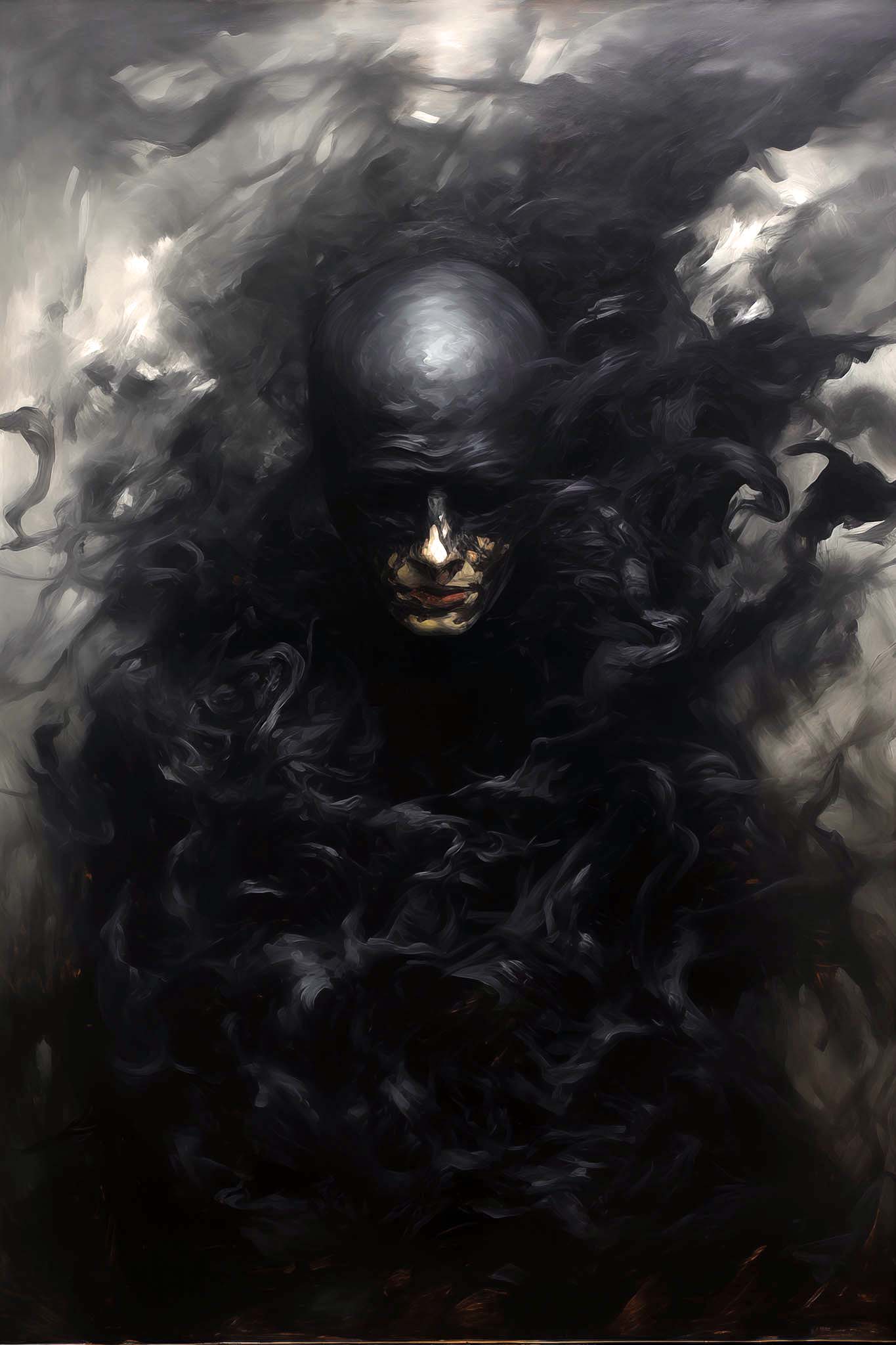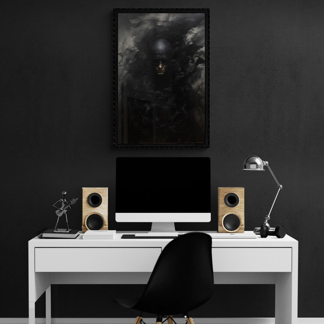 In diesem düsteren Porträt scheint eine vertraute Comicfigur in eine Schattenwelt abzutauchen. Die Gestalt – vage erkennbar als Batgirl – löst sich förmlich in schwarze Rauchwirbel auf. Ihr Gesicht ist halb verborgen, ihre Maske kaum mehr zu erkennen, als würde sie im Dunkel der eigenen Legende verschwinden. Die Farbgebung ist reduziert auf Schwarz- und Grautöne, mit kaum sichtbaren Lichtreflexen. Eine symbolische Darstellung des Verschwindens, der Auflösung von Heldentum oder Identität – still, kraftvoll, unheimlich schön.