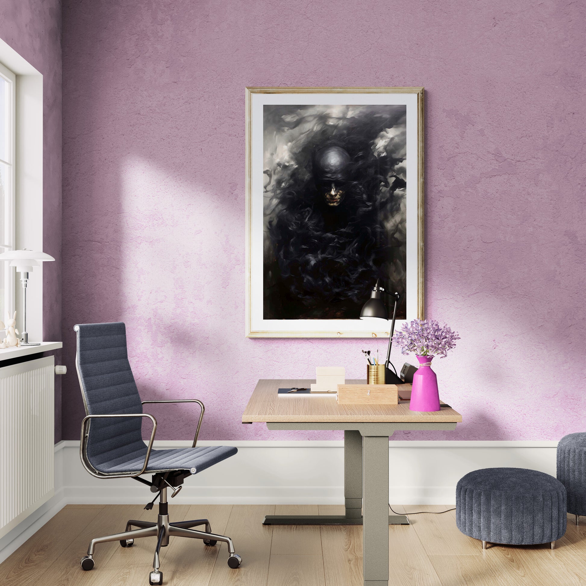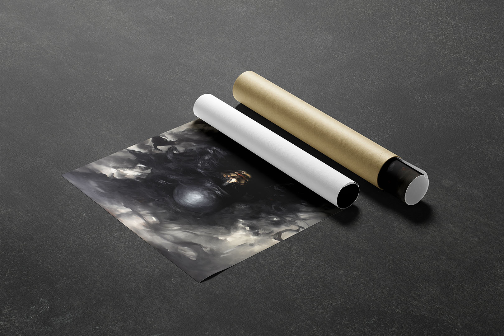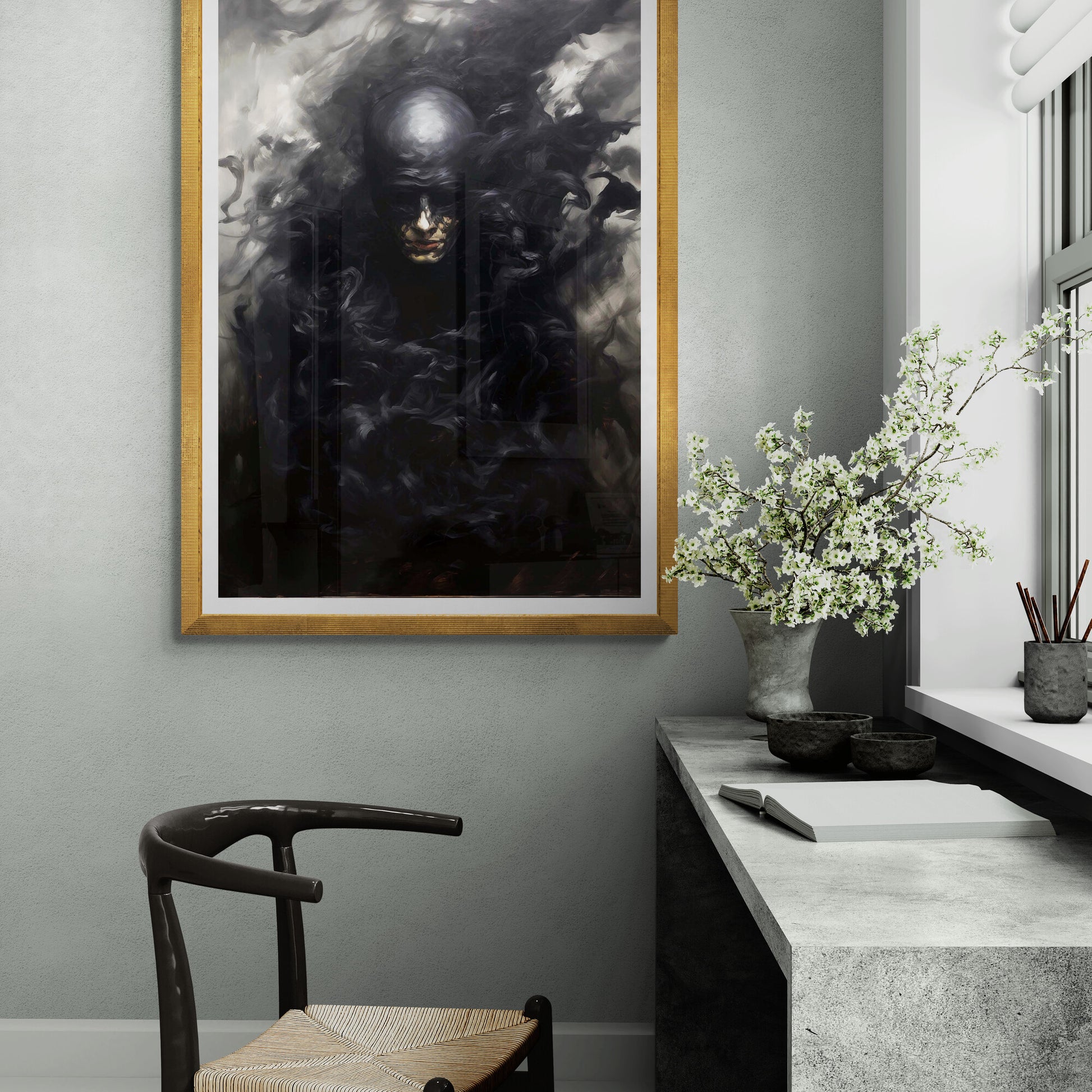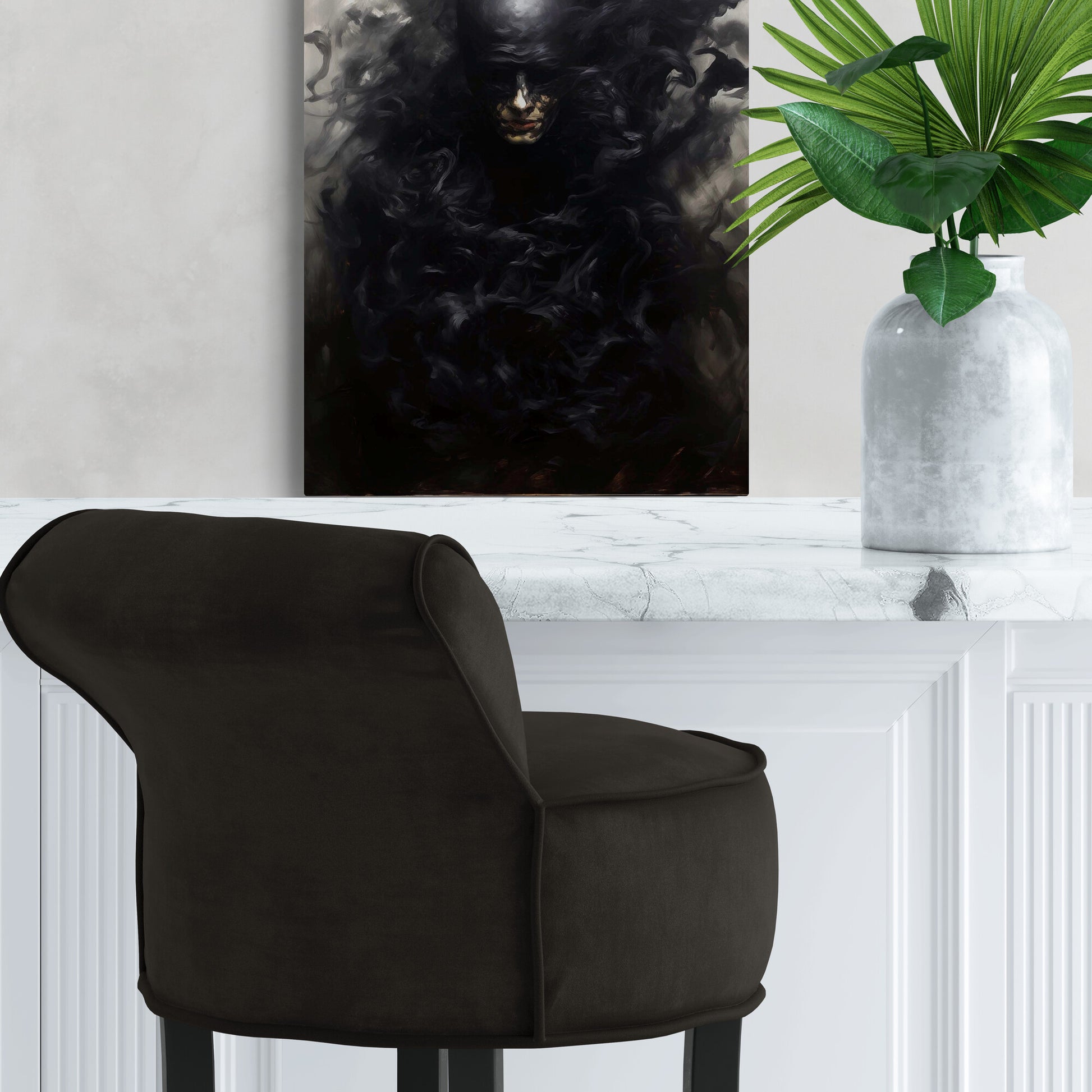 In diesem düsteren Porträt scheint eine vertraute Comicfigur in eine Schattenwelt abzutauchen. Die Gestalt – vage erkennbar als Batgirl – löst sich förmlich in schwarze Rauchwirbel auf. Ihr Gesicht ist halb verborgen, ihre Maske kaum mehr zu erkennen, als würde sie im Dunkel der eigenen Legende verschwinden. Die Farbgebung ist reduziert auf Schwarz- und Grautöne, mit kaum sichtbaren Lichtreflexen. Eine symbolische Darstellung des Verschwindens, der Auflösung von Heldentum oder Identität – still, kraftvoll, unheimlich schön.