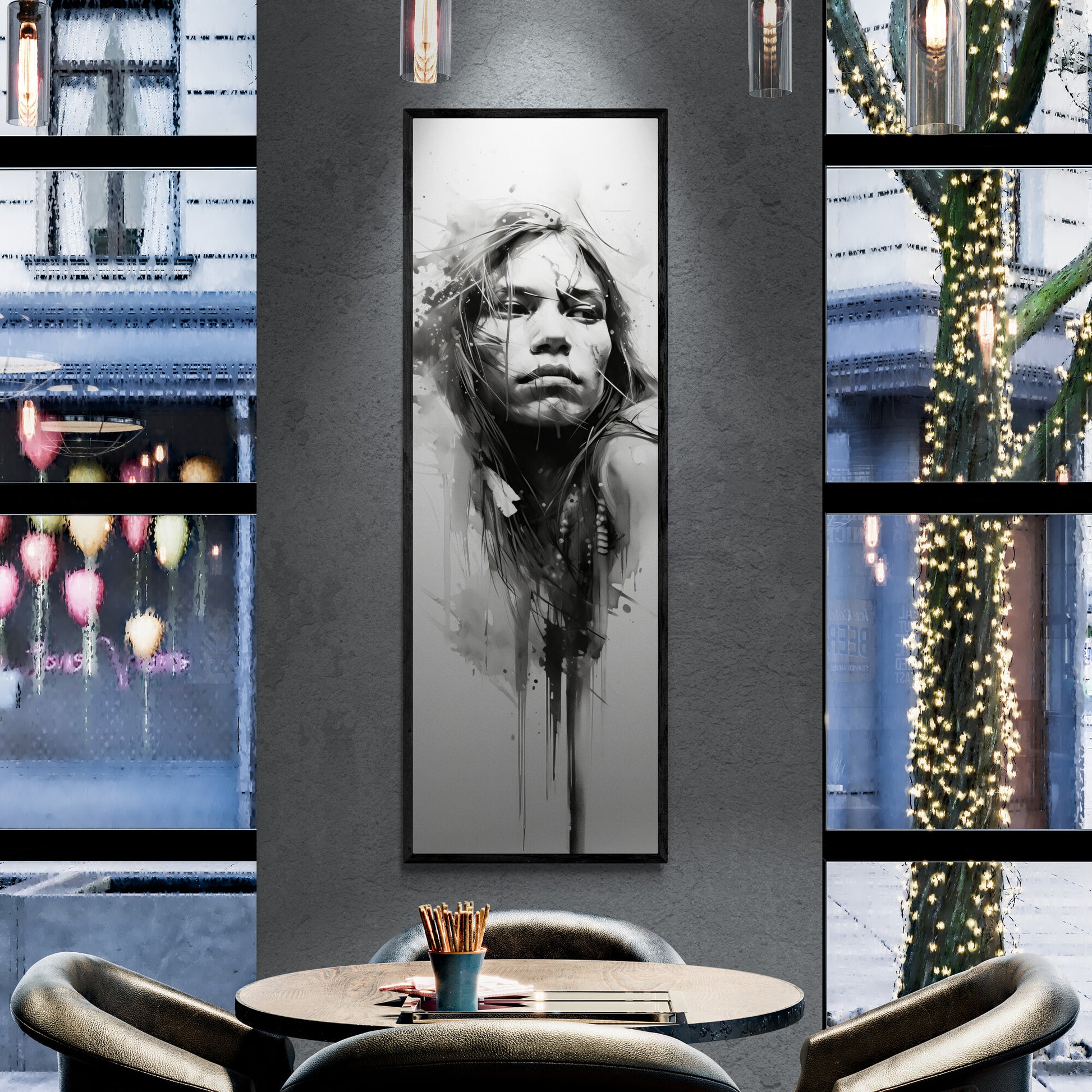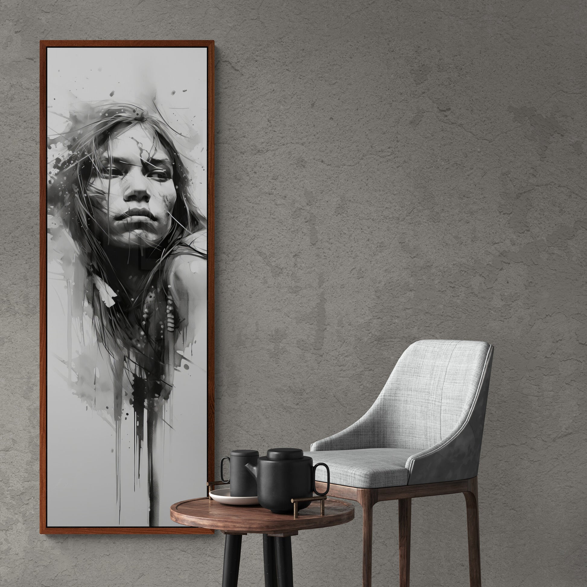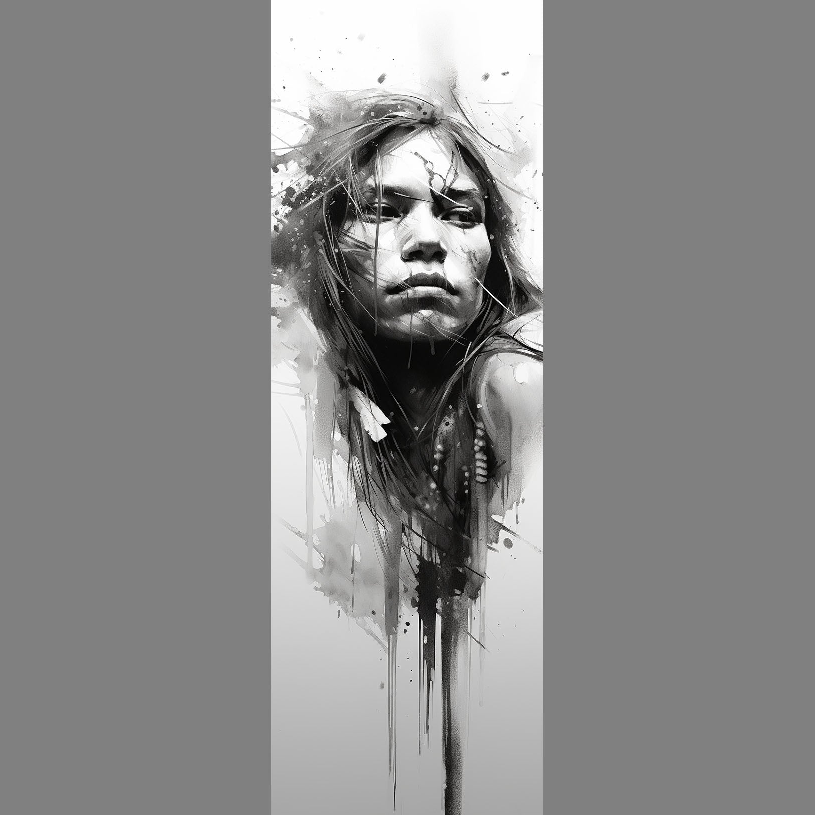 Das monochrome Porträt zeigt das Gesicht einer jungen Frau mit langen, ungebändigten Haaren, das kraftvoll und ruhig zugleich wirkt. Ihr Ausdruck ist ernst, fast trotzig, mit einem Blick, der nach innen wie nach außen gerichtet scheint. Die Komposition erinnert an Tuschmalerei: fließende Linien, tropfende Farben und gezielte Spritzer schaffen eine dynamische Textur. Die vertikale Ausrichtung des Bildes verstärkt den Eindruck von Aufstieg und Stärke. Graustufen und Kontraste betonen Details in Gesicht und Haar, ohne den Eindruck einer klassischen Darstellung zu vermitteln.