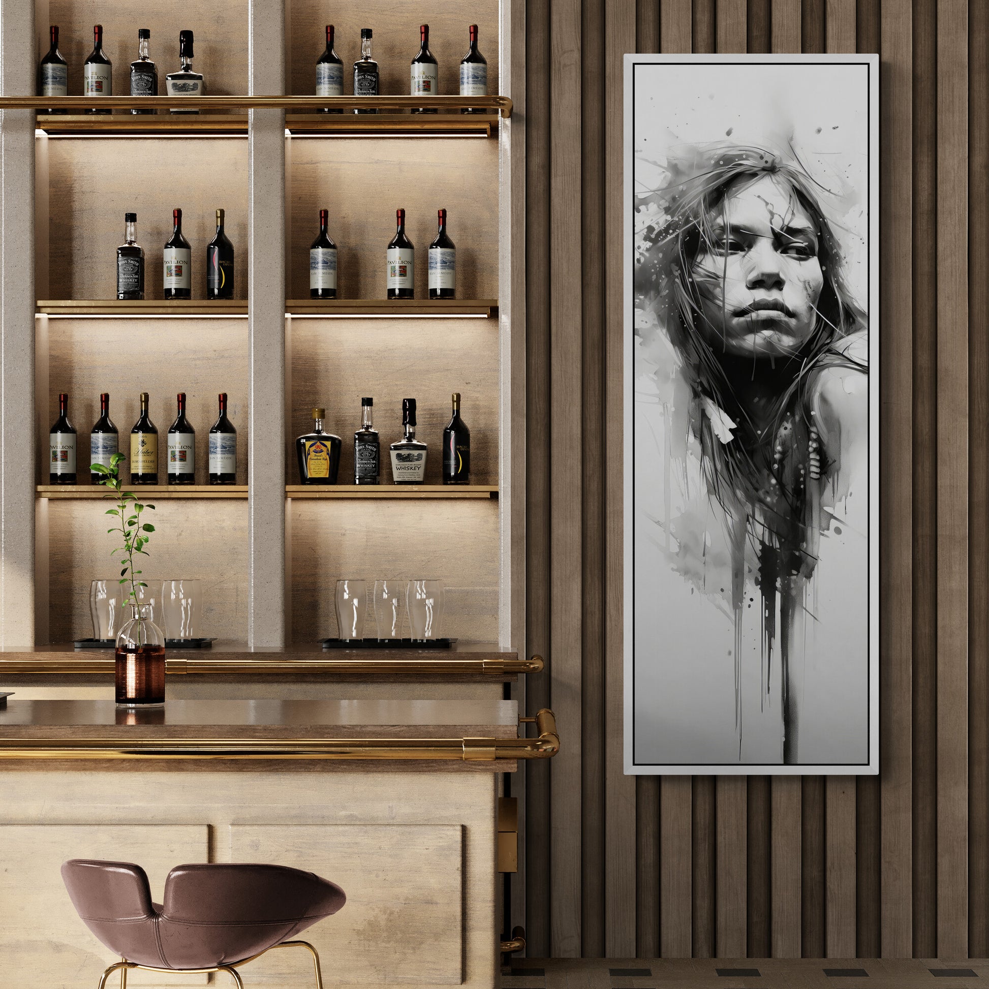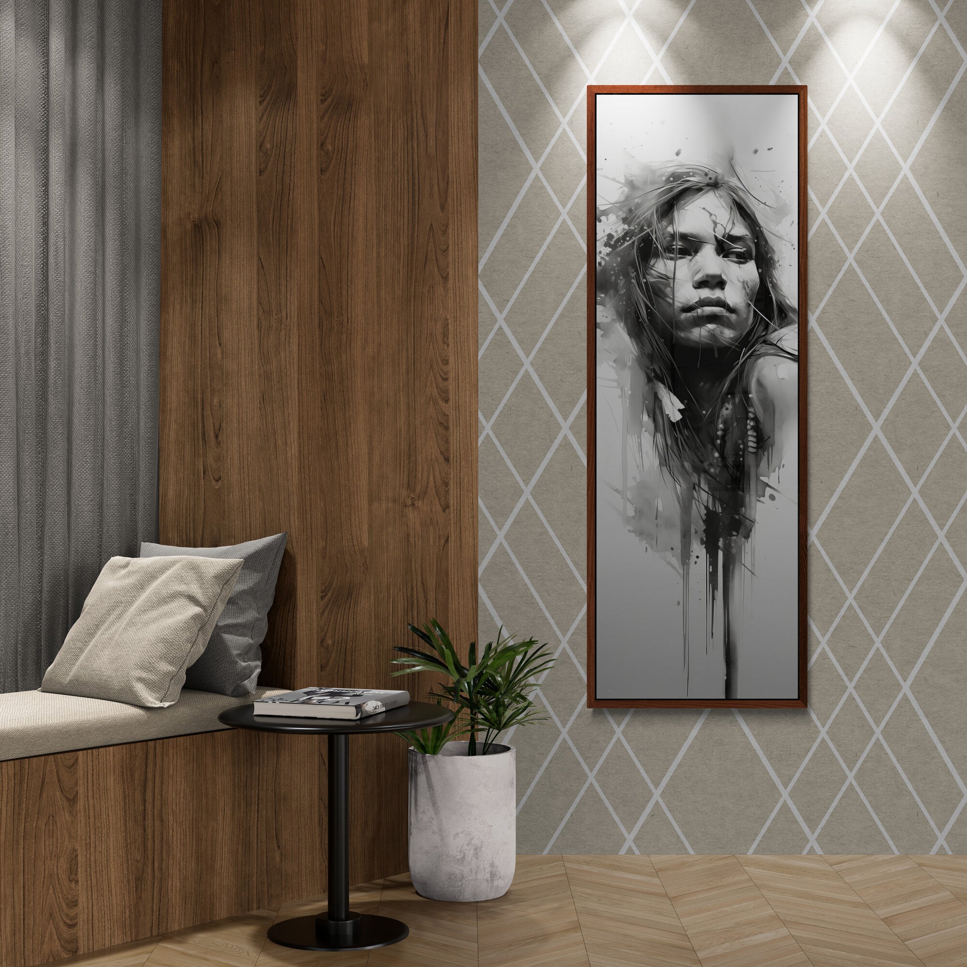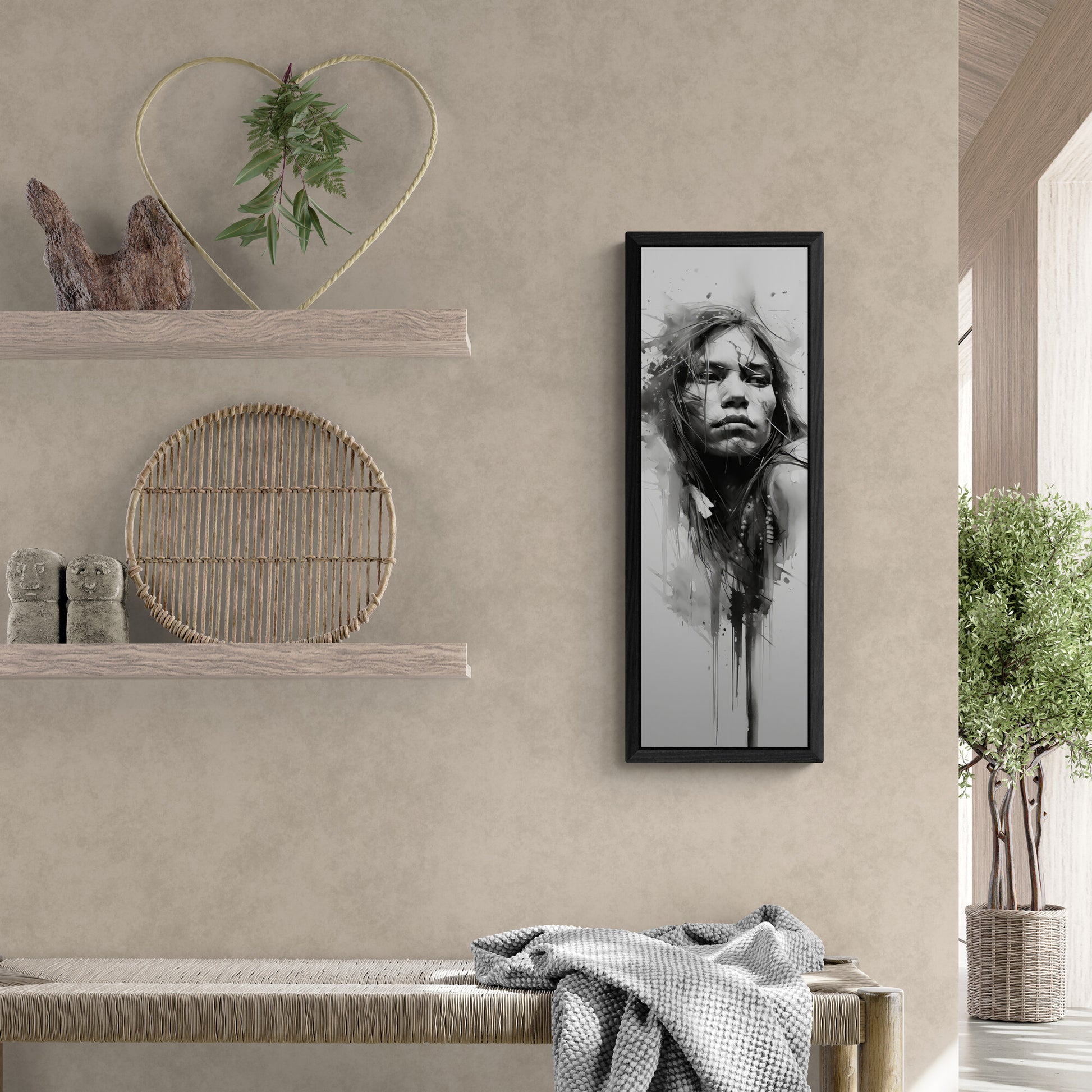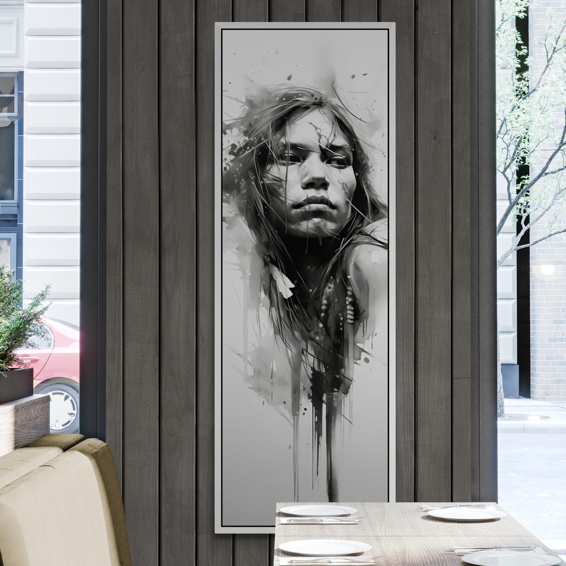 Das monochrome Porträt zeigt das Gesicht einer jungen Frau mit langen, ungebändigten Haaren, das kraftvoll und ruhig zugleich wirkt. Ihr Ausdruck ist ernst, fast trotzig, mit einem Blick, der nach innen wie nach außen gerichtet scheint. Die Komposition erinnert an Tuschmalerei: fließende Linien, tropfende Farben und gezielte Spritzer schaffen eine dynamische Textur. Die vertikale Ausrichtung des Bildes verstärkt den Eindruck von Aufstieg und Stärke. Graustufen und Kontraste betonen Details in Gesicht und Haar, ohne den Eindruck einer klassischen Darstellung zu vermitteln.