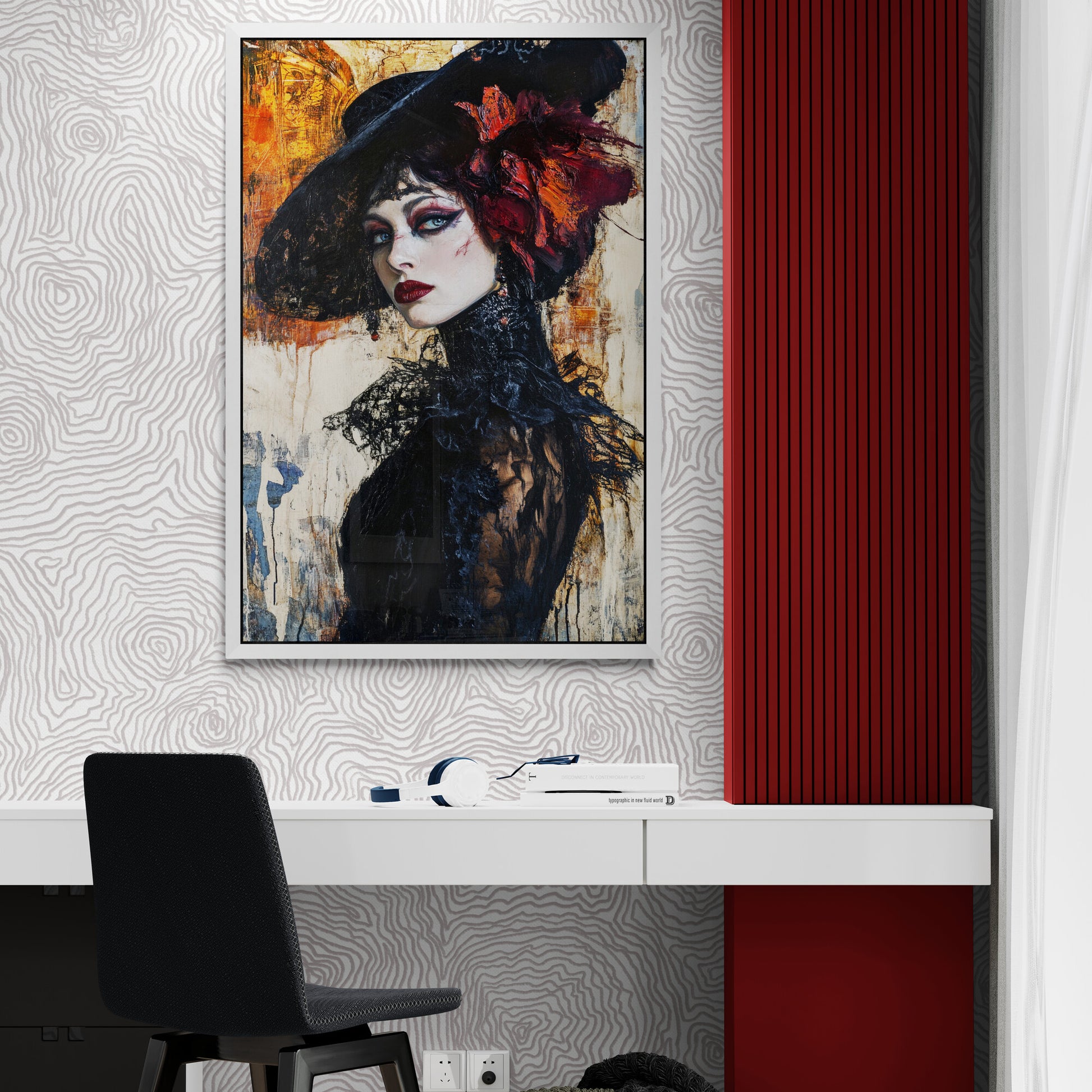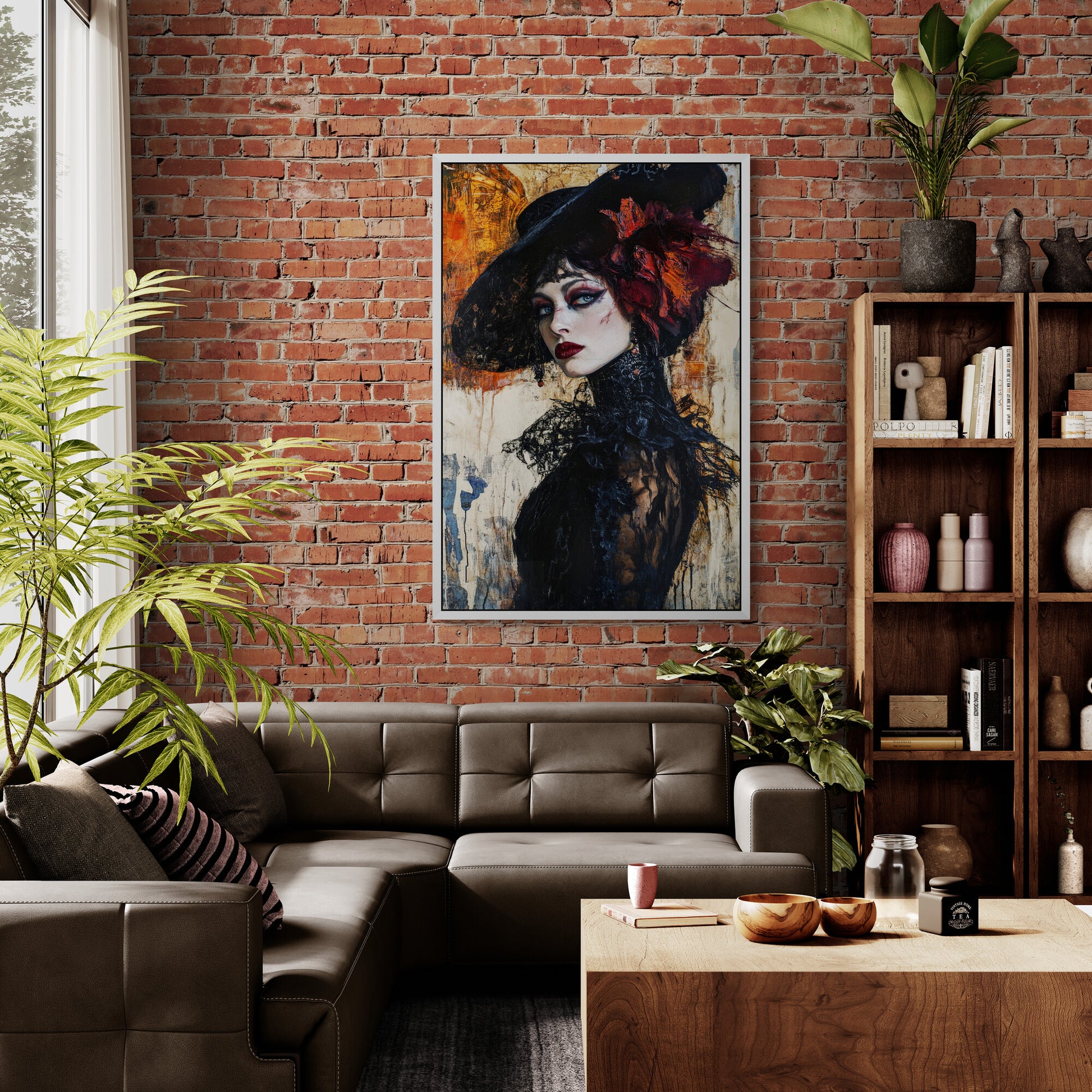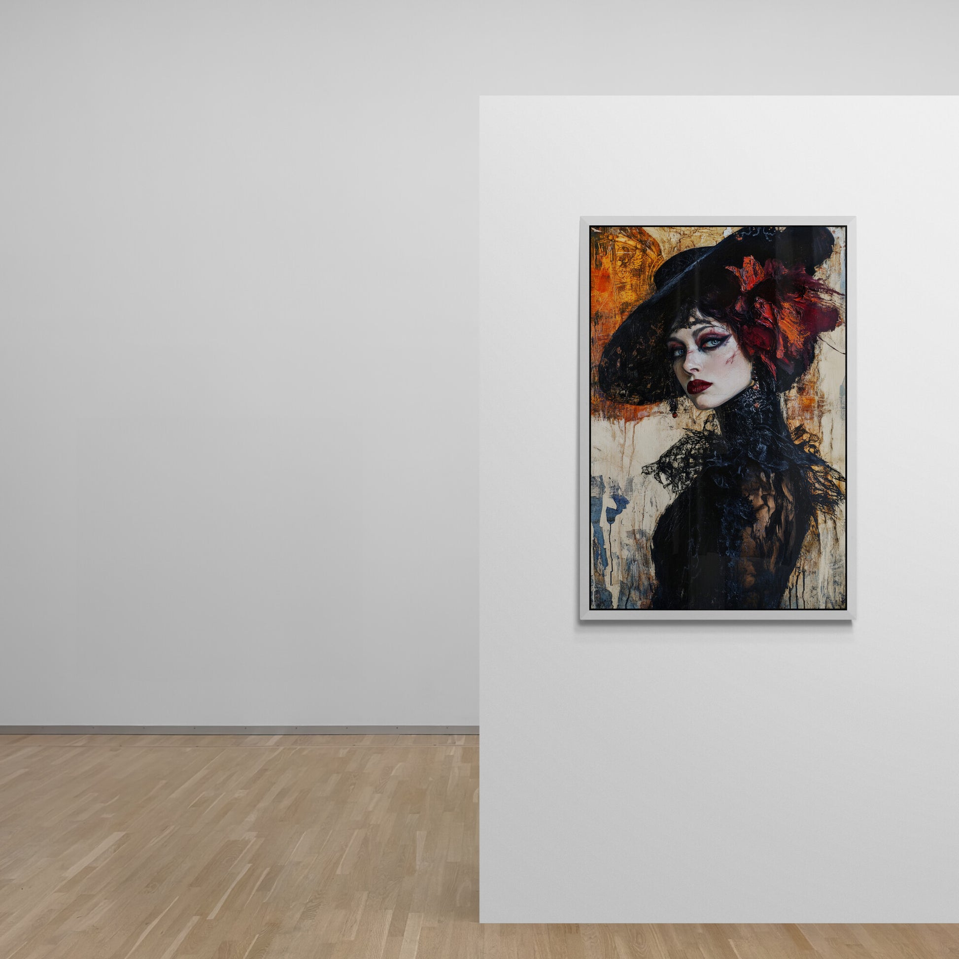 Ein ausdrucksstarkes Porträt einer jungen Frau im viktorianisch-gotischen Stil. Ihr blasser Teint, das dramatische Make-up und der tiefrote Lippenstift bilden einen intensiven Kontrast zur schwarzen Spitzenkleidung. Der große Hut mit einer überdimensionierten roten Blume verleiht der Figur theatralische Eleganz. Der Hintergrund mit seinen warmen, verwitterten Ocker- und Brauntönen erinnert an gealtertes Mauerwerk und verstärkt die düstere, barocke Atmosphäre des Bildes.