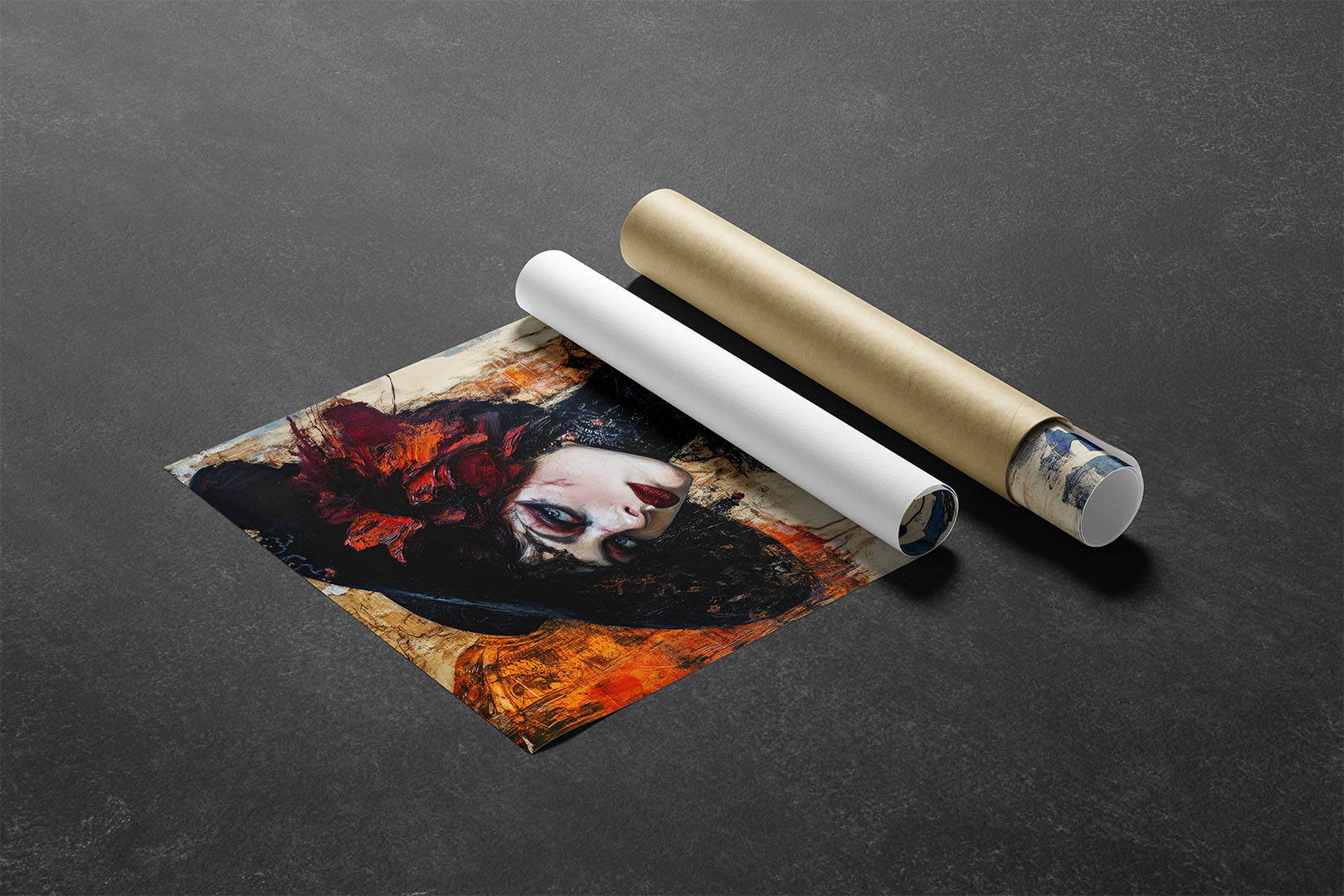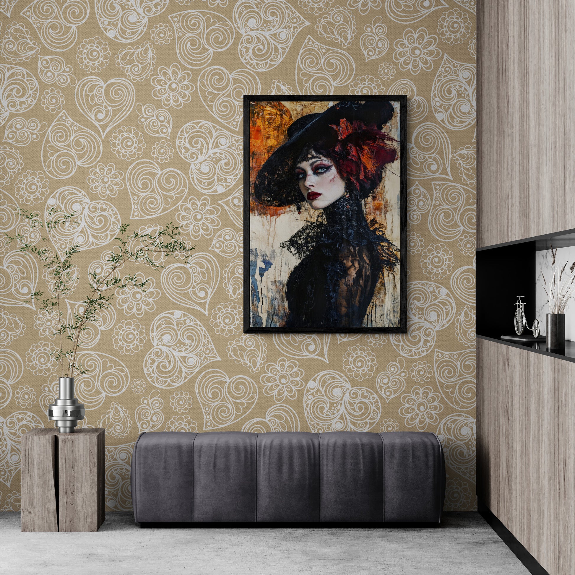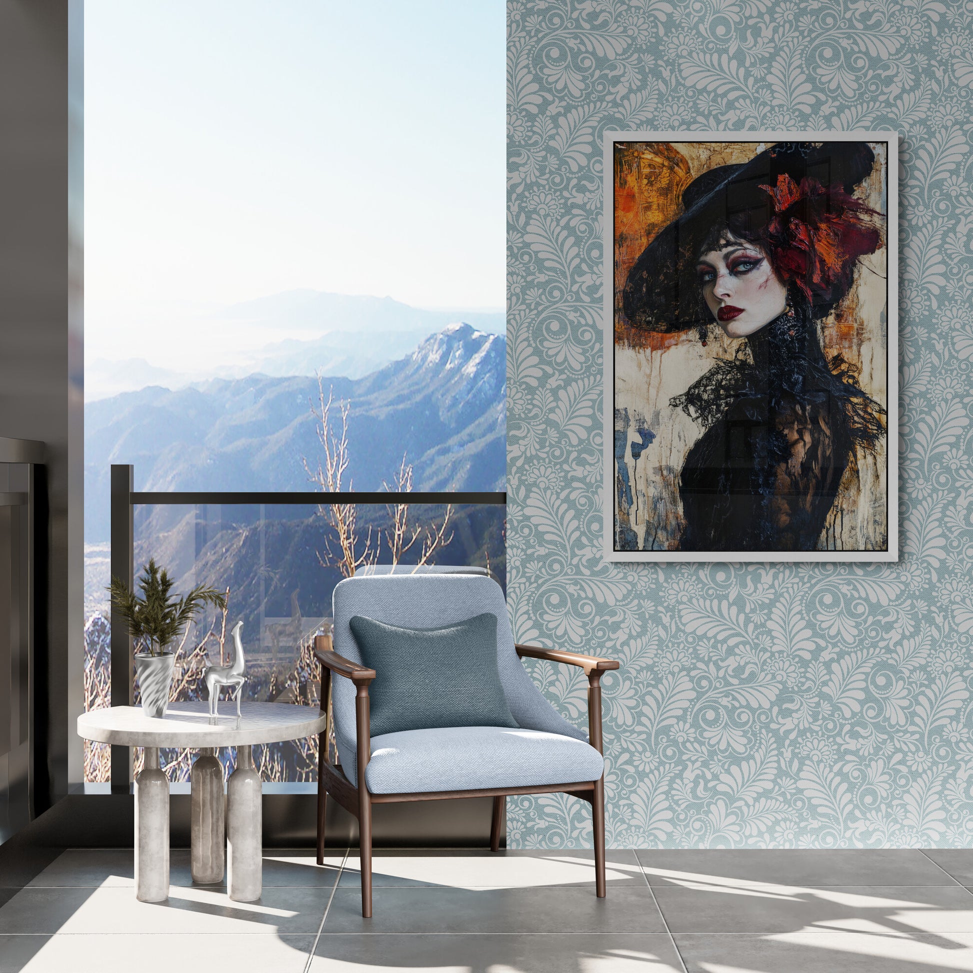 Ein ausdrucksstarkes Porträt einer jungen Frau im viktorianisch-gotischen Stil. Ihr blasser Teint, das dramatische Make-up und der tiefrote Lippenstift bilden einen intensiven Kontrast zur schwarzen Spitzenkleidung. Der große Hut mit einer überdimensionierten roten Blume verleiht der Figur theatralische Eleganz. Der Hintergrund mit seinen warmen, verwitterten Ocker- und Brauntönen erinnert an gealtertes Mauerwerk und verstärkt die düstere, barocke Atmosphäre des Bildes.
