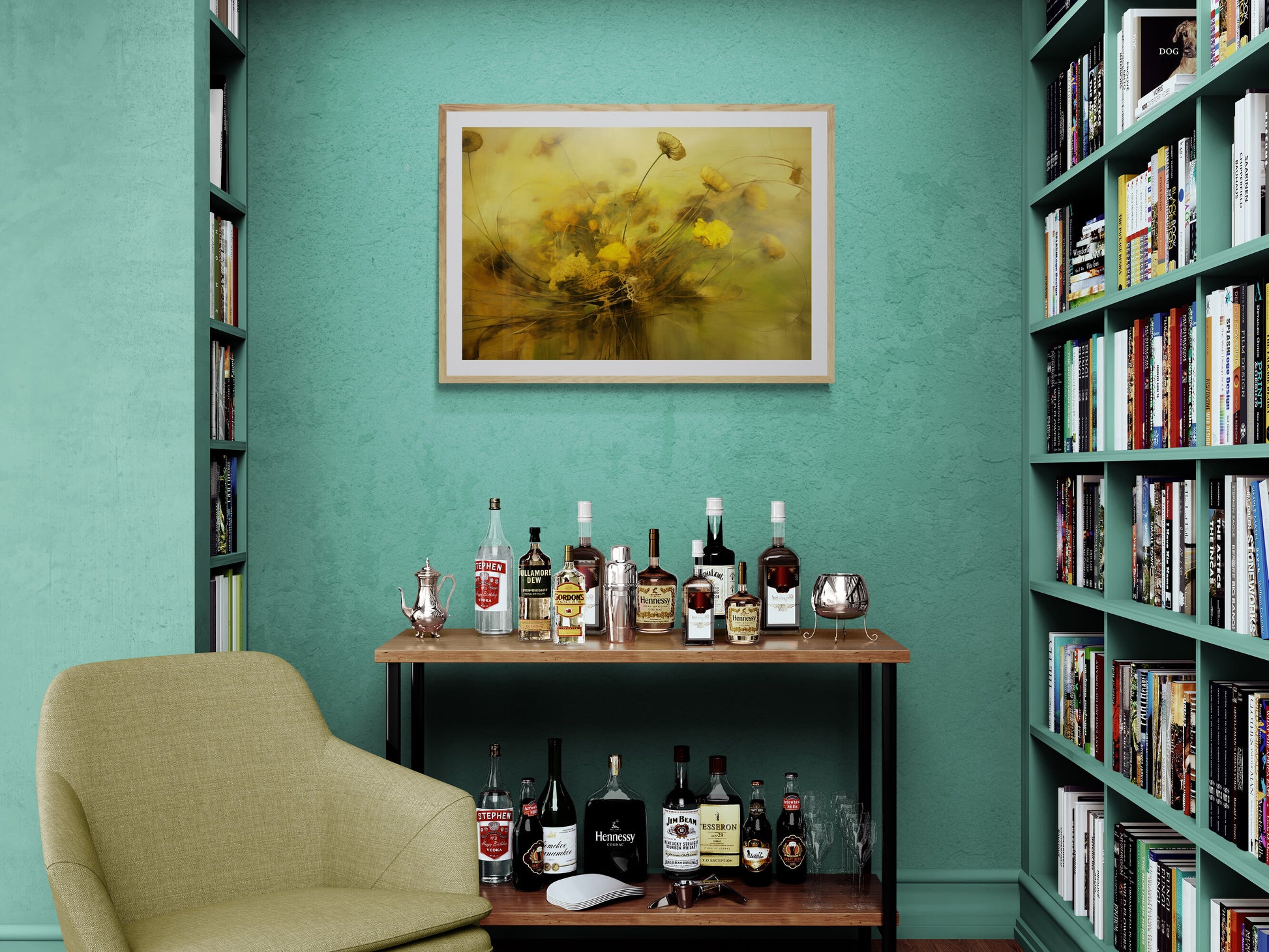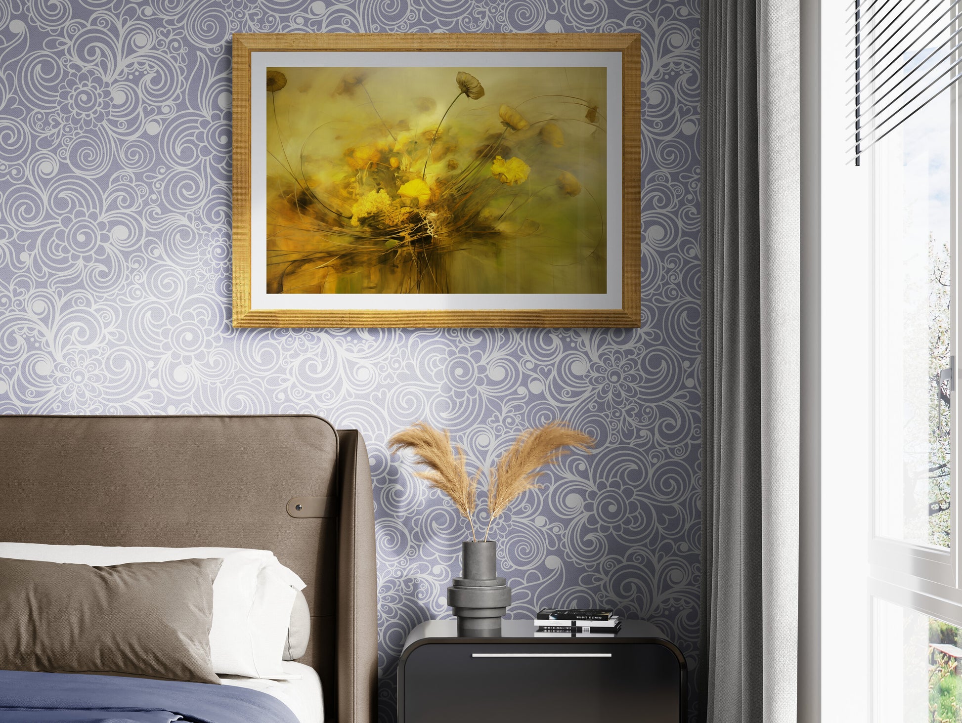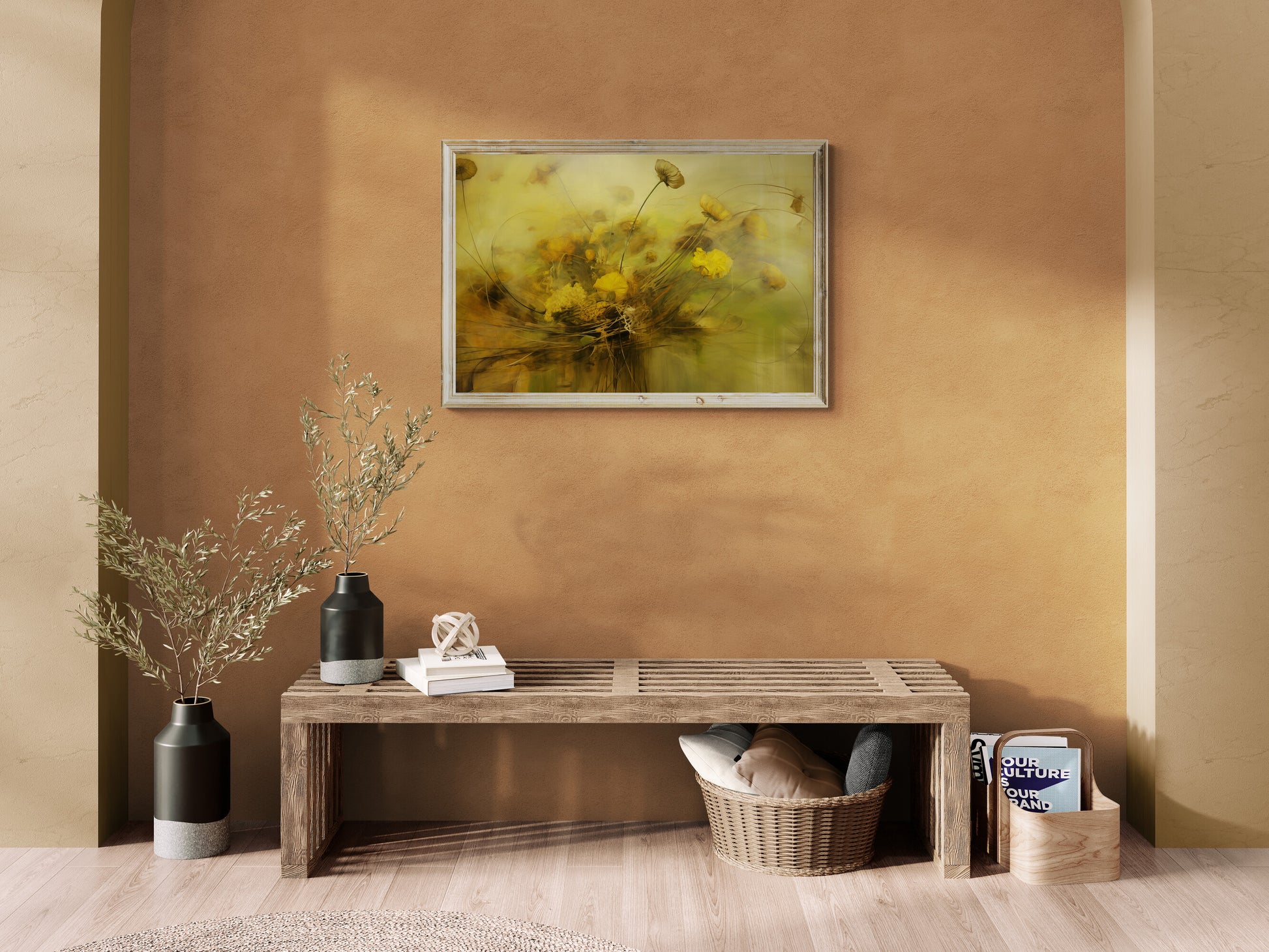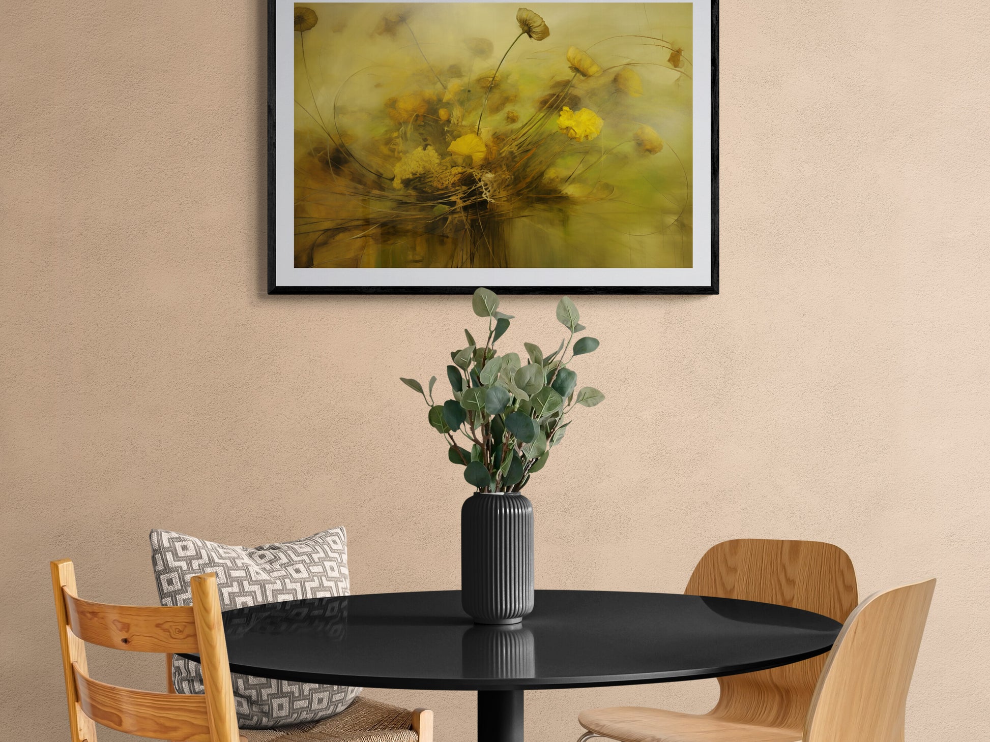 Ein impressionistisches Kunstwerk mit einer Komposition aus gelben Blüten, die sich in einem zarten Nebel aus warmen Gold- und Grüntönen auflösen. Feine, geschwungene Linien durchziehen das Bild, verleihen ihm Dynamik und erinnern an verwitterte Gräser im Wind. Die leuchtenden Blüten scheinen in einem Moment zwischen Verfall und Blüte gefangen zu sein, was dem Bild eine poetische Melancholie verleiht.