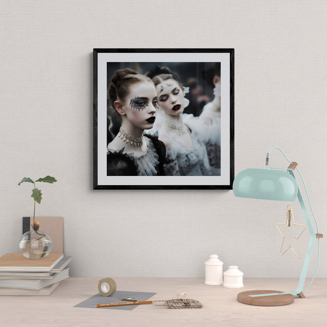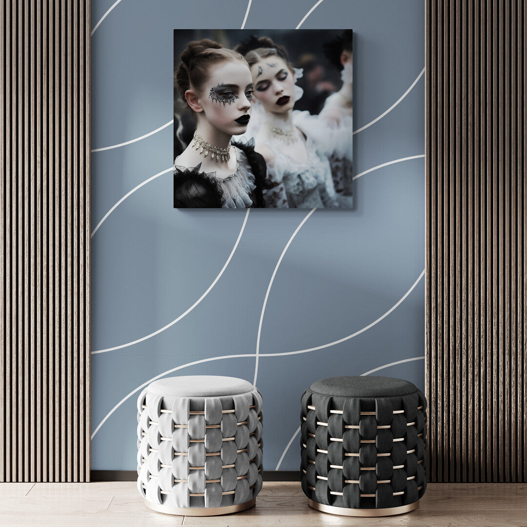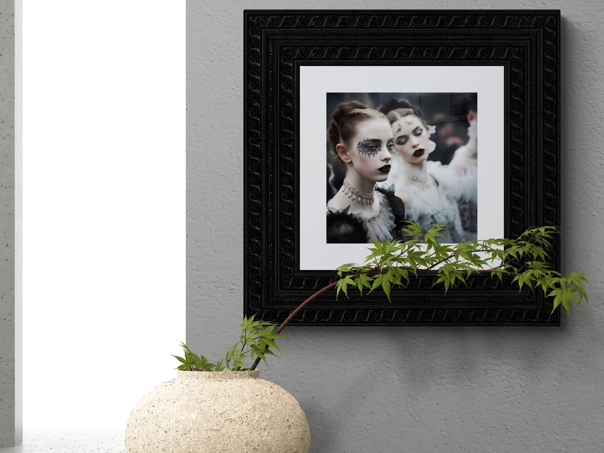 In diesem düsteren, eleganten Szenario fängt die Kamera den intensiven Blick einer jungen Frau ein. Ihr Make-up erinnert an zerrissene Spitzenmuster, die sich um ihre Augen legen und ihre schwarze Lippenfarbe noch dramatischer wirken lassen. Sie trägt ein opulentes Choker-Kollier mit filigranen Anhängern, das perfekt zu den transparenten, mit schwarzen Rüschen verzierten Ärmeln ihres Kleides passt. Im Hintergrund bewegen sich weitere Gestalten in gotischer Mode, ihre Gesichter blass, die Blicke entrückt. Ein Moment voller mystischer Anziehungskraft, eingefangen in monochromer Eleganz.