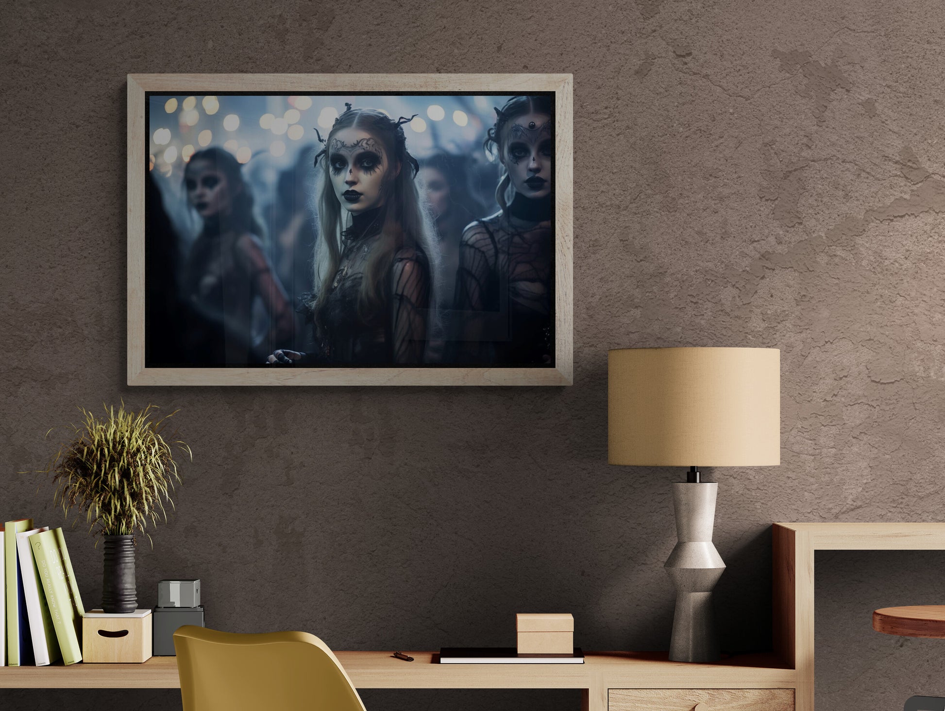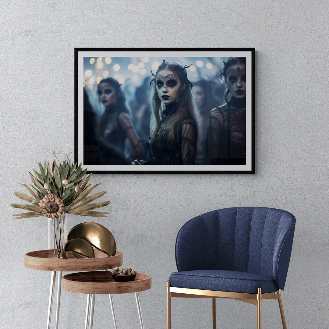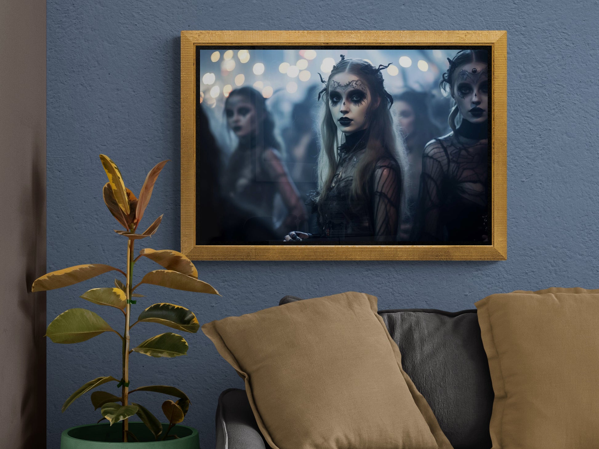Inmitten eines geheimnisvoll beleuchteten Raumes steht eine junge Frau mit durchdringendem Blick. Ihr bleiches Gesicht ist mit kunstvollen, dunklen Ornamenten verziert, die sich um ihre Augen und Stirn winden, während ihre tiefschwarzen Lippen einen starken Kontrast bilden. Feine, antik anmutende Schmuckstücke zieren ihren Hals, und ihre langen, offenen Haare sind mit kleinen, astähnlichen Verzierungen versehen. Ihr durchscheinendes schwarzes Kleid, durchzogen von spinnennetzartigen Mustern, verstärkt den ätherischen Eindruck. Im Hintergrund sind weitere Gestalten in dunkler Eleganz zu erkennen, während Lichter wie ferne Sterne schimmern. Eine Szene voller Mystik, wie aus einem gotischen Märchen entsprungen.