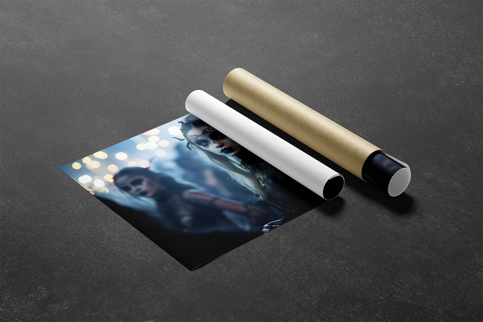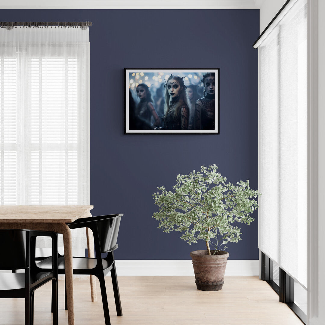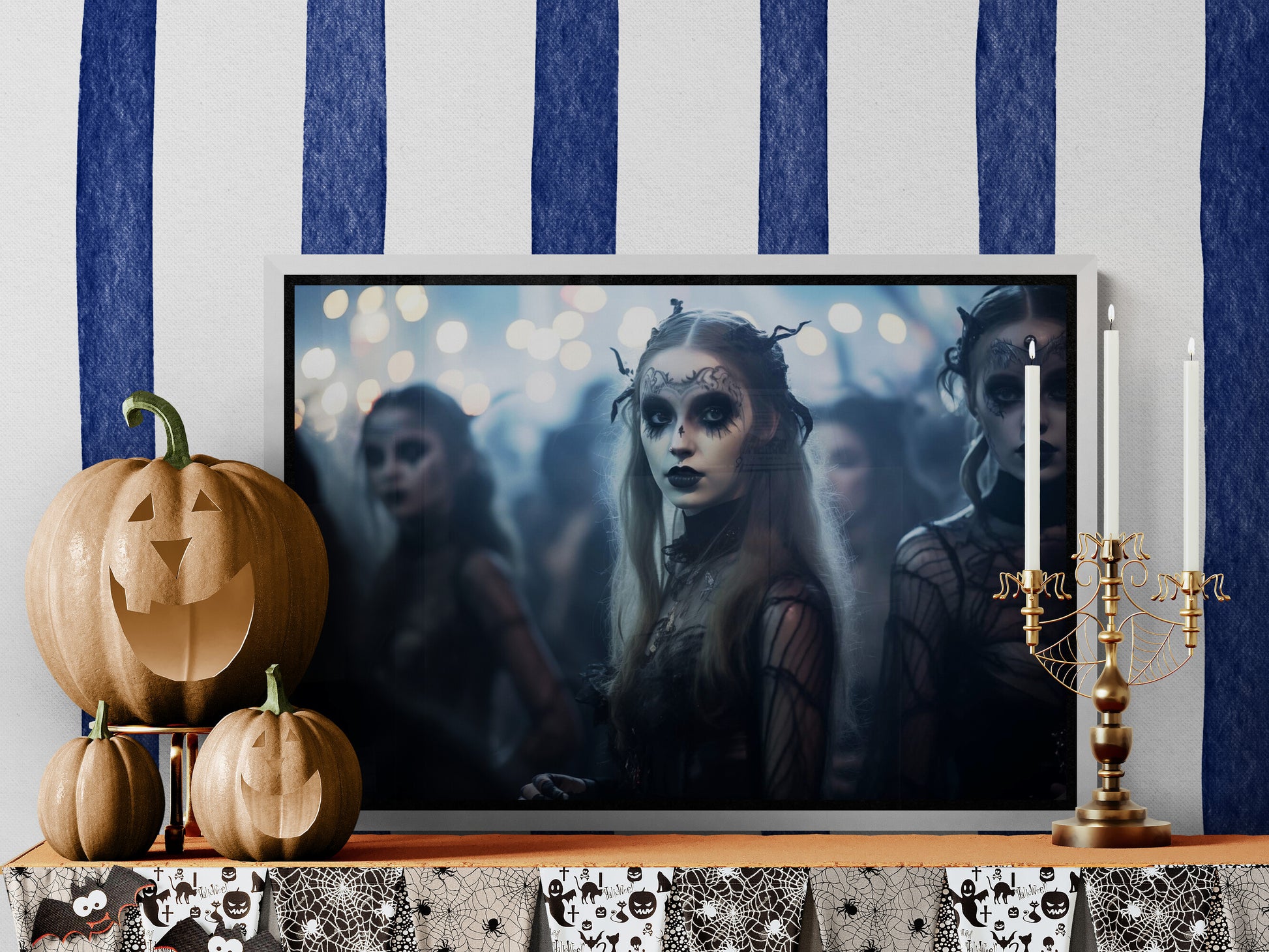 Inmitten eines geheimnisvoll beleuchteten Raumes steht eine junge Frau mit durchdringendem Blick. Ihr bleiches Gesicht ist mit kunstvollen, dunklen Ornamenten verziert, die sich um ihre Augen und Stirn winden, während ihre tiefschwarzen Lippen einen starken Kontrast bilden. Feine, antik anmutende Schmuckstücke zieren ihren Hals, und ihre langen, offenen Haare sind mit kleinen, astähnlichen Verzierungen versehen. Ihr durchscheinendes schwarzes Kleid, durchzogen von spinnennetzartigen Mustern, verstärkt den ätherischen Eindruck. Im Hintergrund sind weitere Gestalten in dunkler Eleganz zu erkennen, während Lichter wie ferne Sterne schimmern. Eine Szene voller Mystik, wie aus einem gotischen Märchen entsprungen.