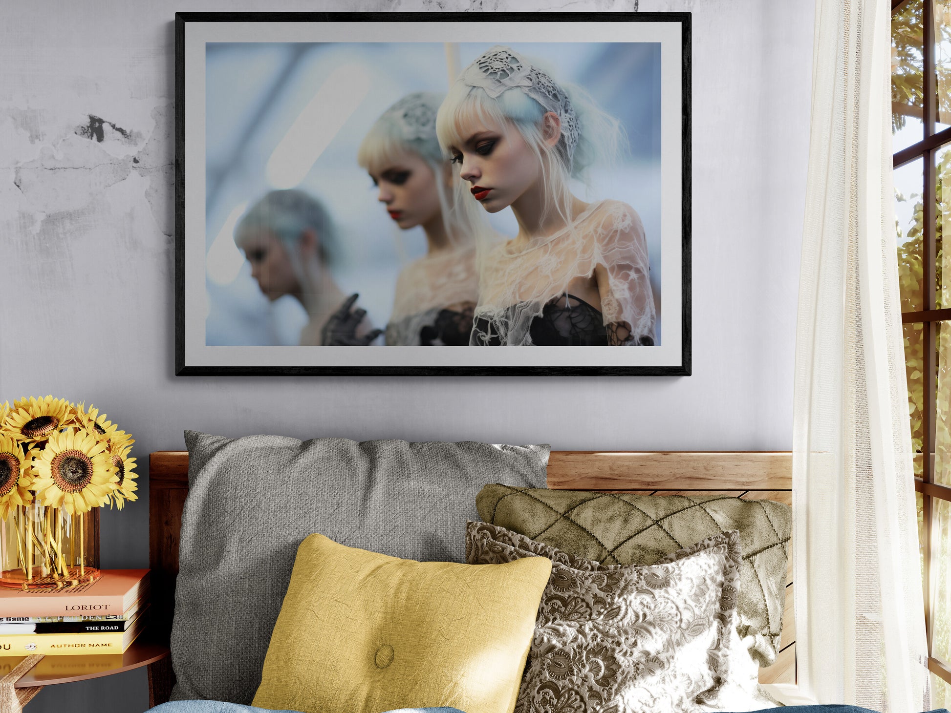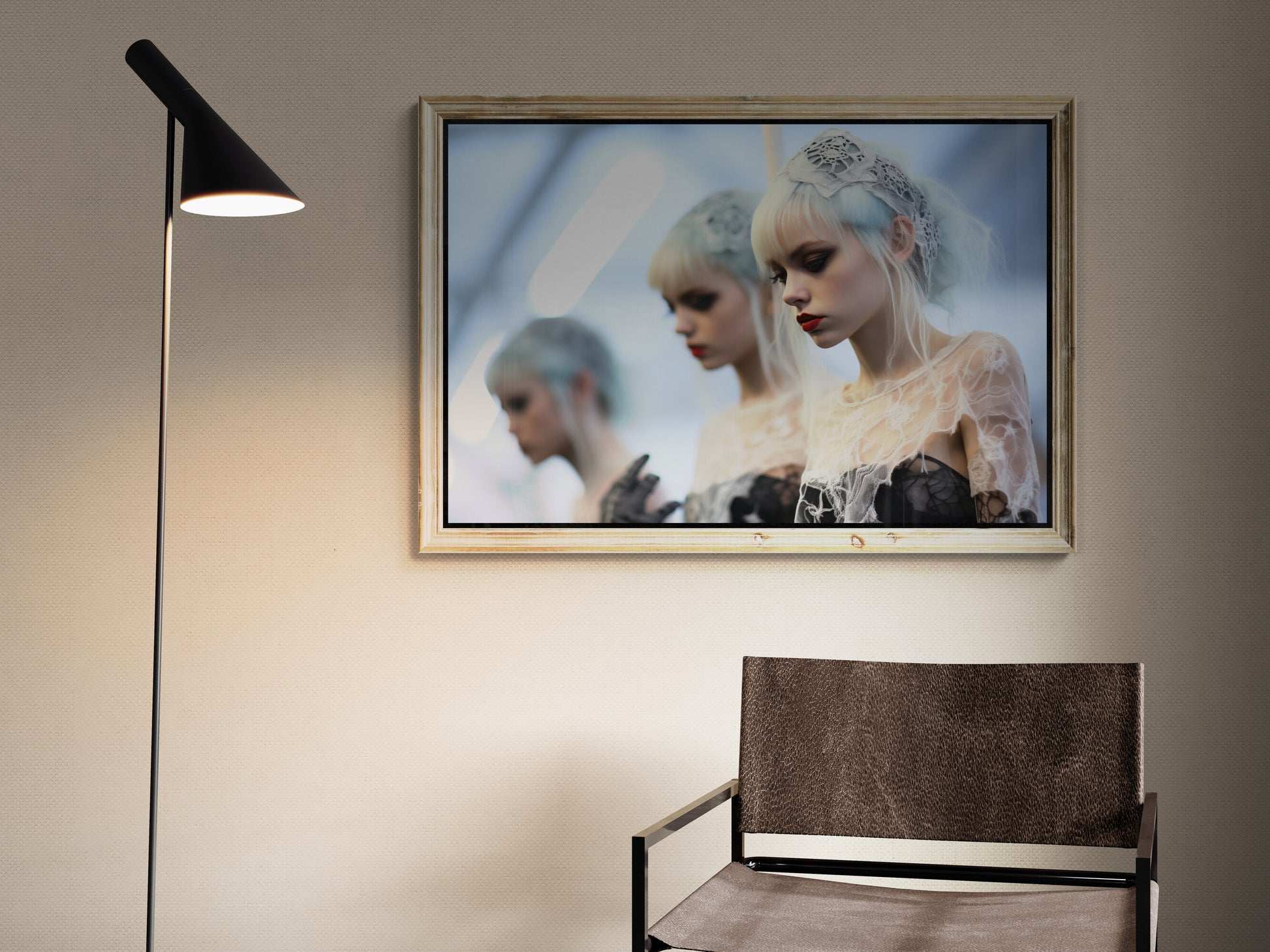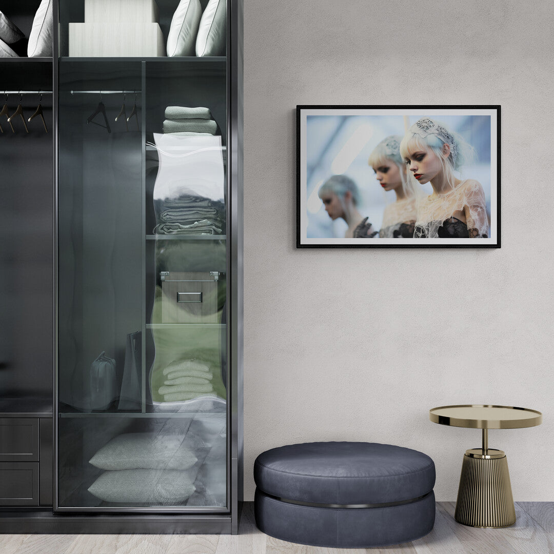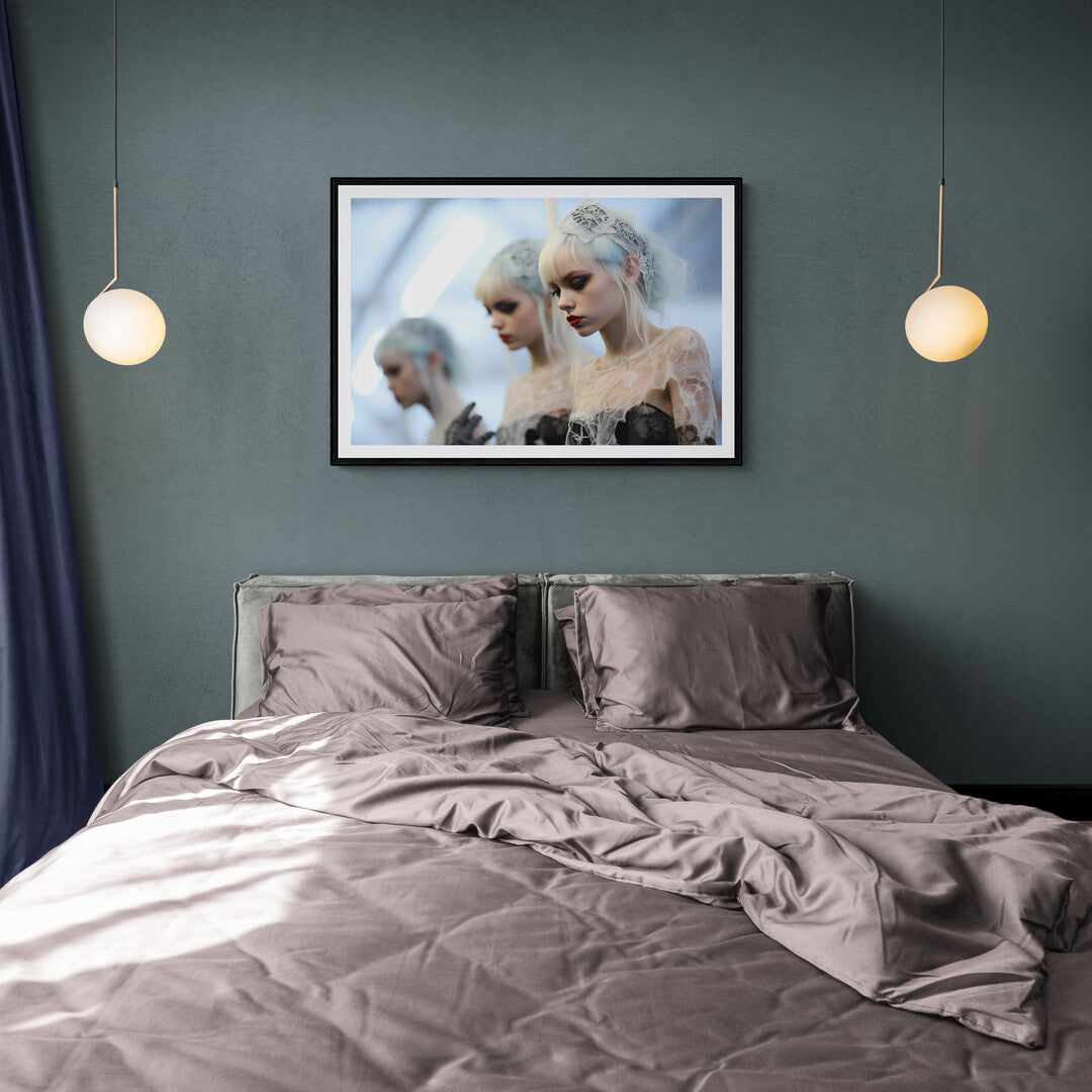 Eine junge Frau mit eisblauem Haar und blasser Haut steht im Mittelpunkt dieser traumhaften, fast surrealen Szene. Ihr Blick ist nachdenklich gesenkt, die Lippen in tiefem Rot ein markanter Kontrast zu ihrer kühlen Erscheinung. Feine, spinnennetzartige Spitze legt sich wie ein Schleier über ihre Schultern, während ein zartes Spitzenband ihr Haar schmückt. Im Hintergrund verschwimmen zwei weitere Frauen mit ähnlichem Erscheinungsbild, als wären sie Reflexionen in einem Spiegel oder Schatten einer Erinnerung. Die kalte, diffuse Beleuchtung verstärkt den ätherischen, beinahe geisterhaften Charakter dieses Bildes – ein visuelles Gedicht aus Eleganz und Melancholie.