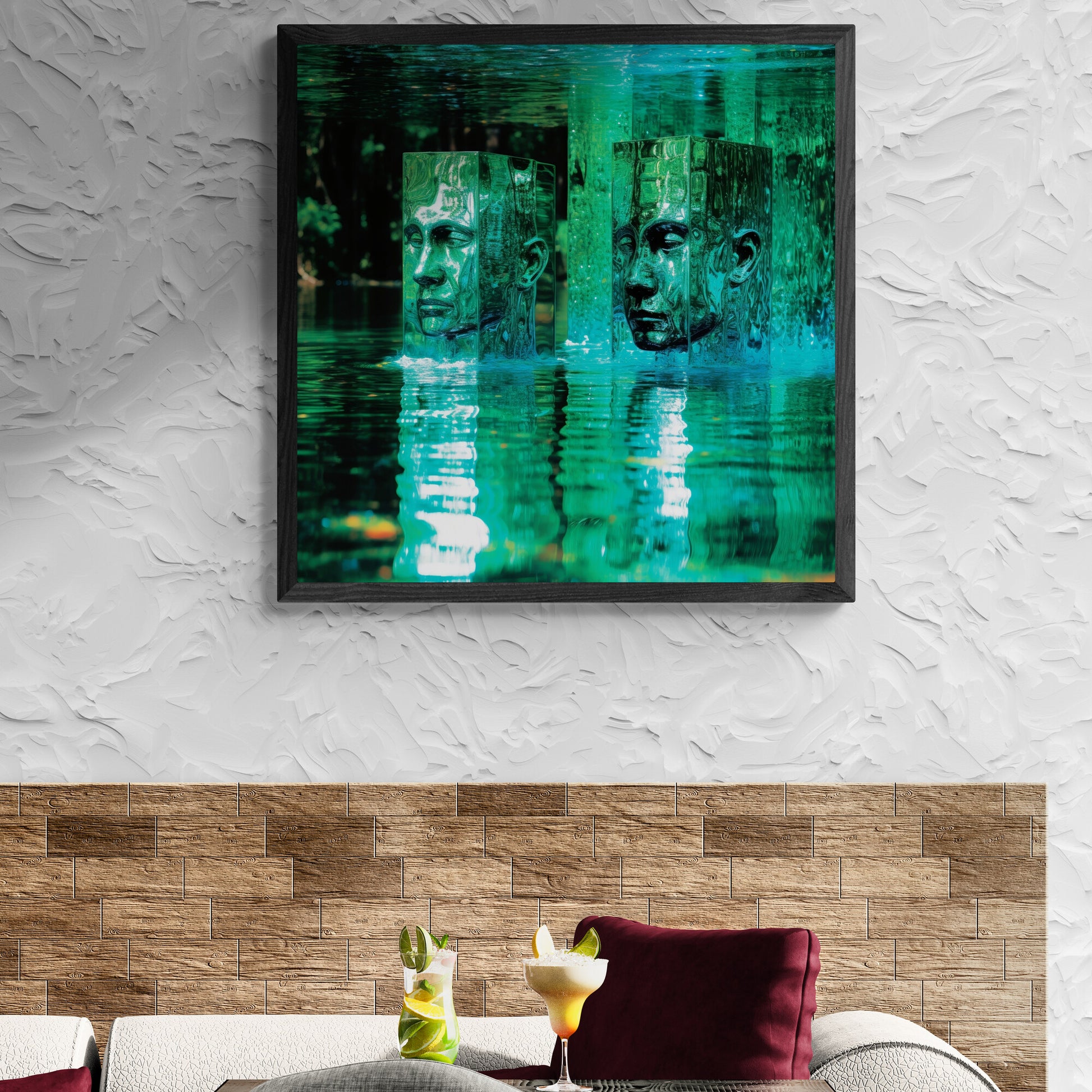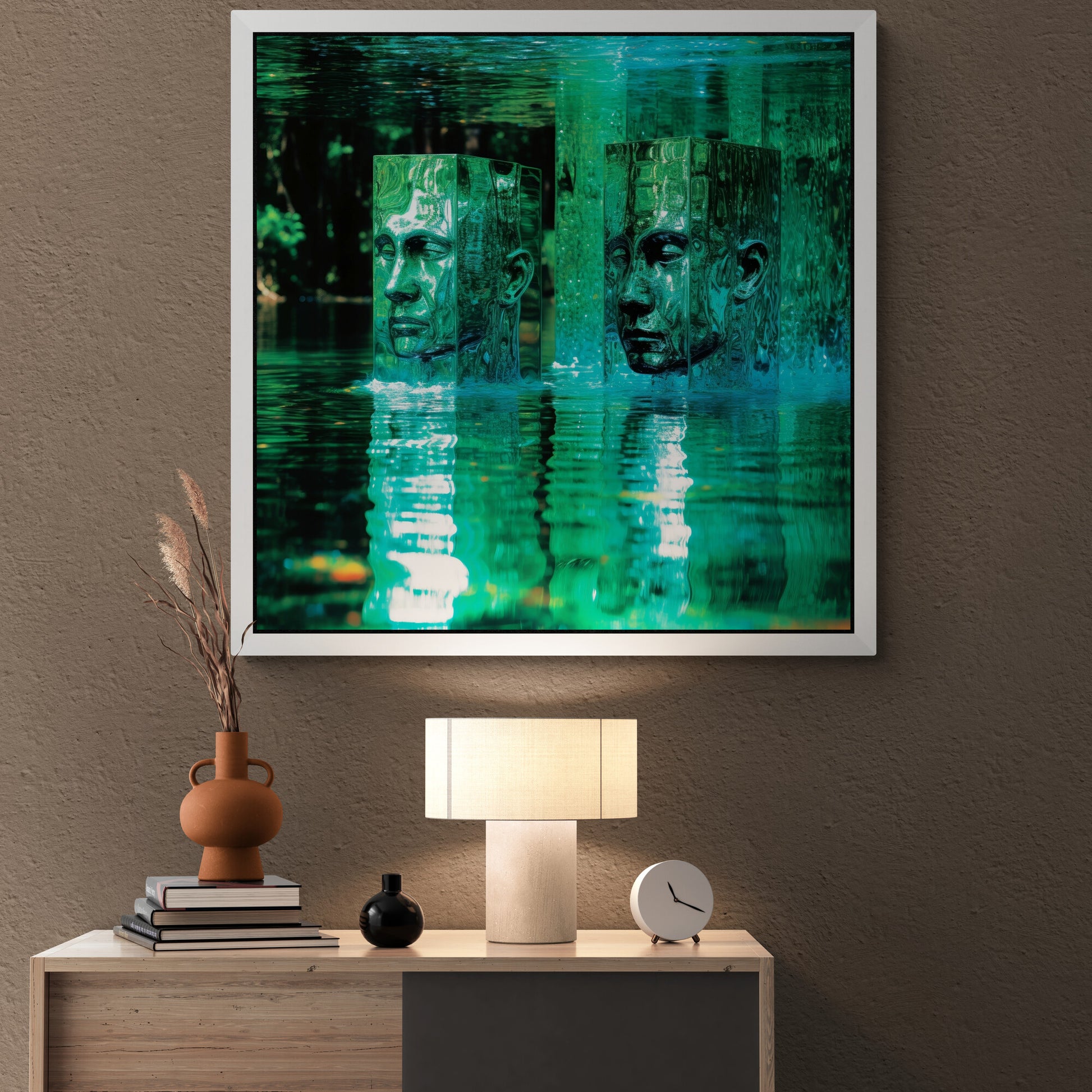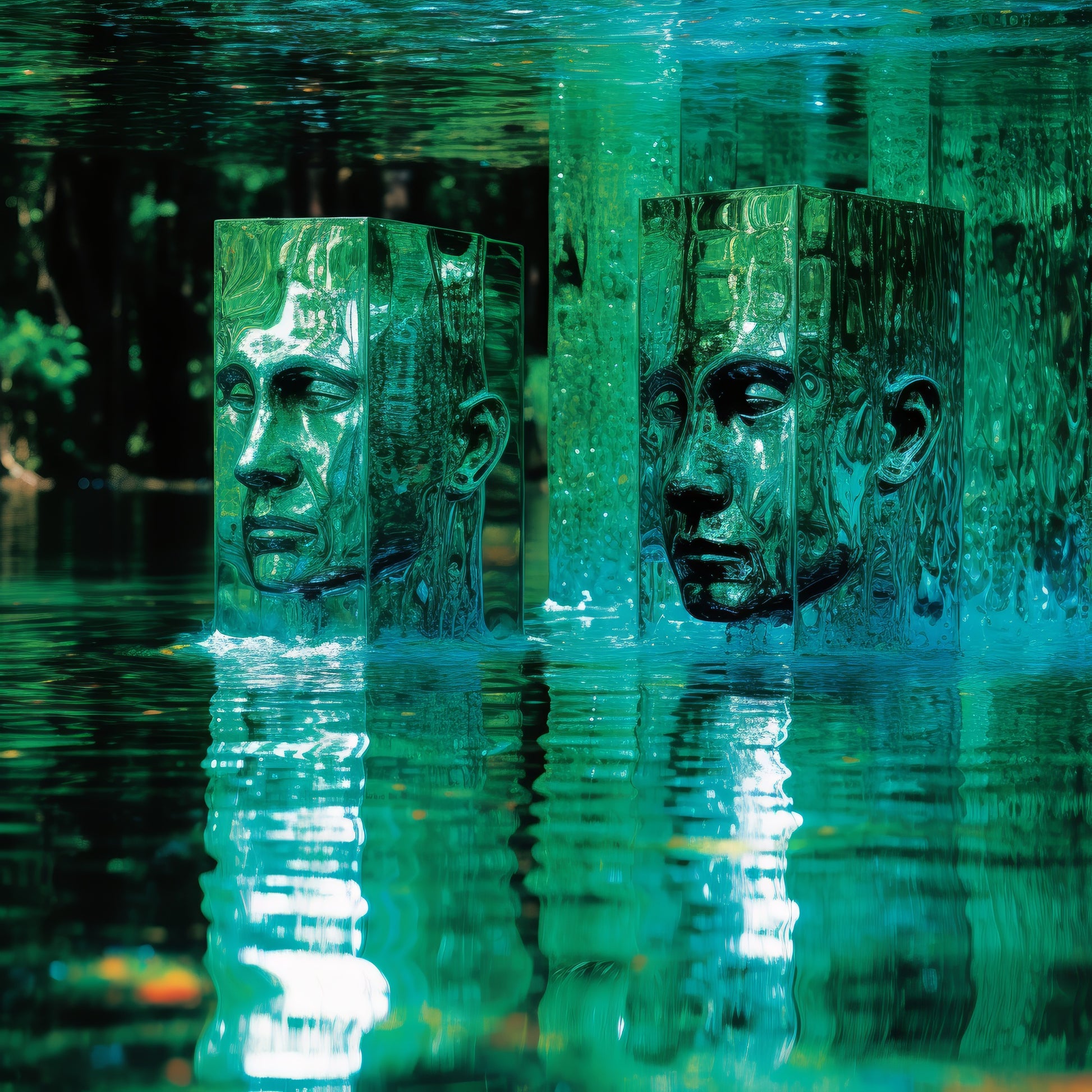 Zwei stilisierte, männliche Gesichter sind in rechteckige Glas- oder Acrylsäulen eingelassen, die halb aus einem smaragdgrünen, spiegelnden Wasser aufsteigen. Die plastischen Köpfe wirken ernst und nachdenklich, ihre Oberfläche schimmert metallisch und reflektiert das Licht ihrer Umgebung. Das Lichtspiel auf der Wasseroberfläche verstärkt die surreale, fast meditative Wirkung des Motivs.