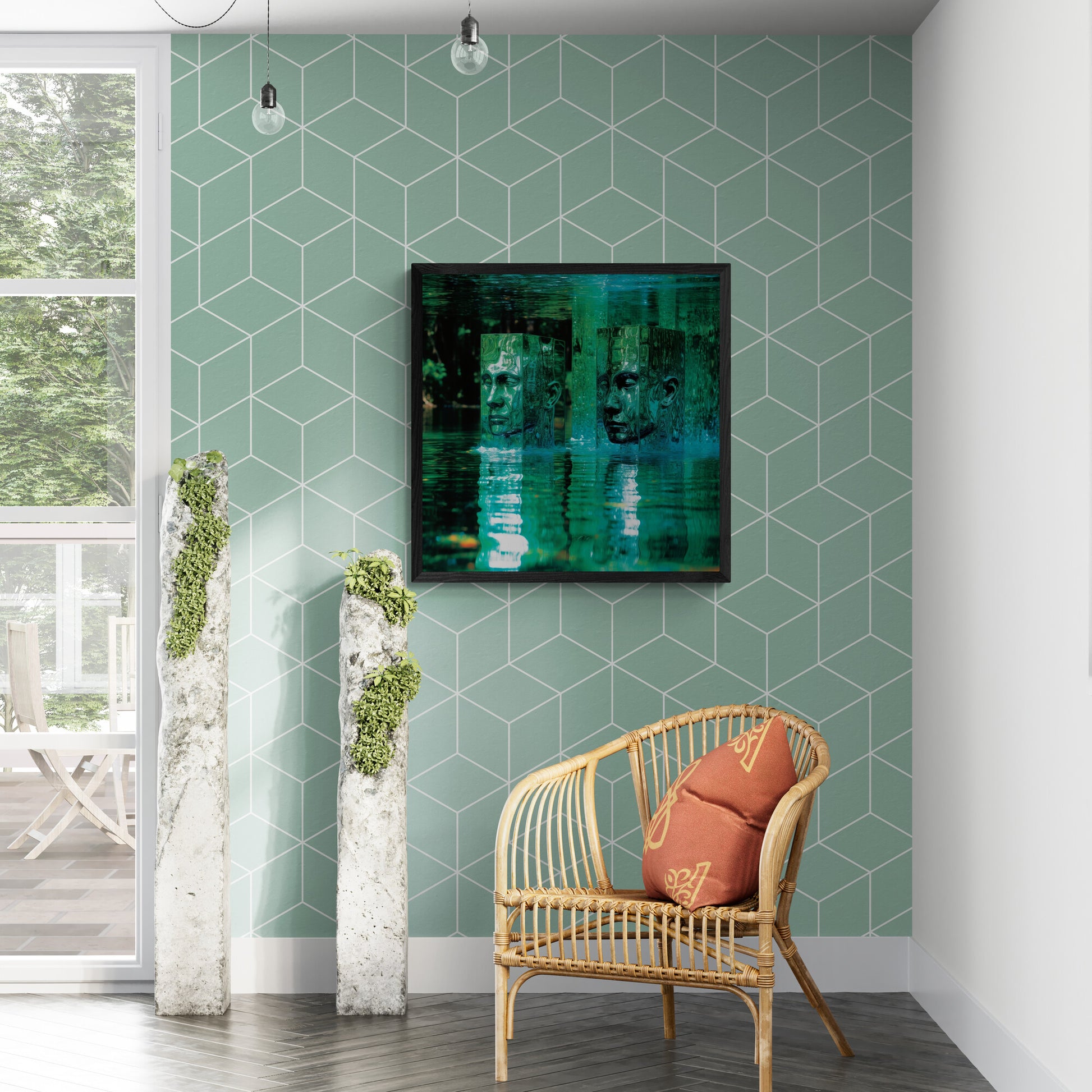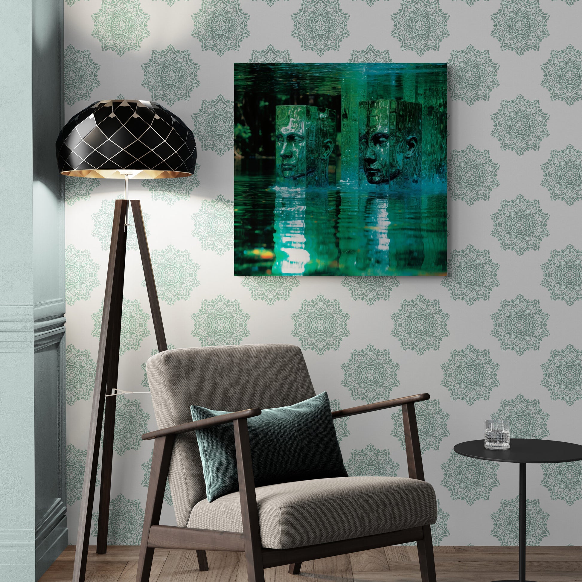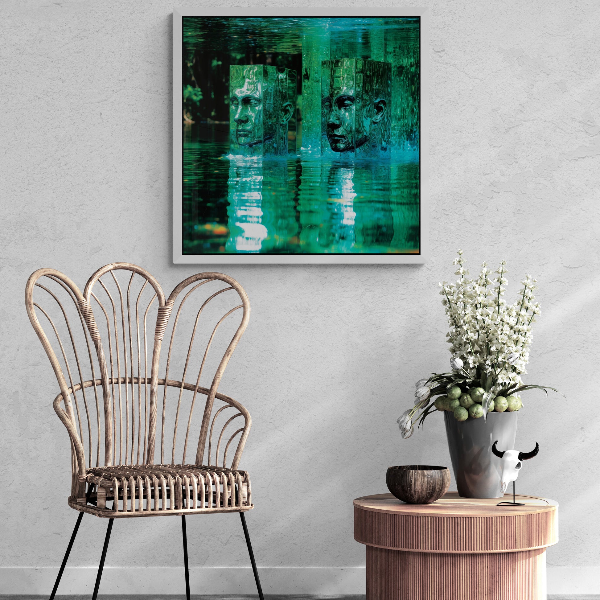 Zwei stilisierte, männliche Gesichter sind in rechteckige Glas- oder Acrylsäulen eingelassen, die halb aus einem smaragdgrünen, spiegelnden Wasser aufsteigen. Die plastischen Köpfe wirken ernst und nachdenklich, ihre Oberfläche schimmert metallisch und reflektiert das Licht ihrer Umgebung. Das Lichtspiel auf der Wasseroberfläche verstärkt die surreale, fast meditative Wirkung des Motivs.