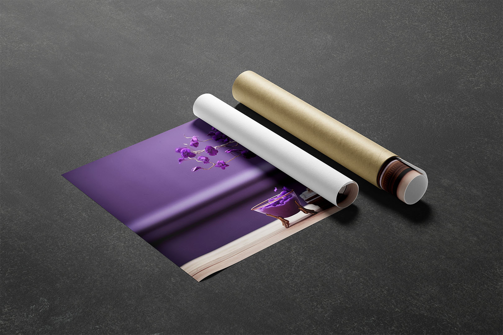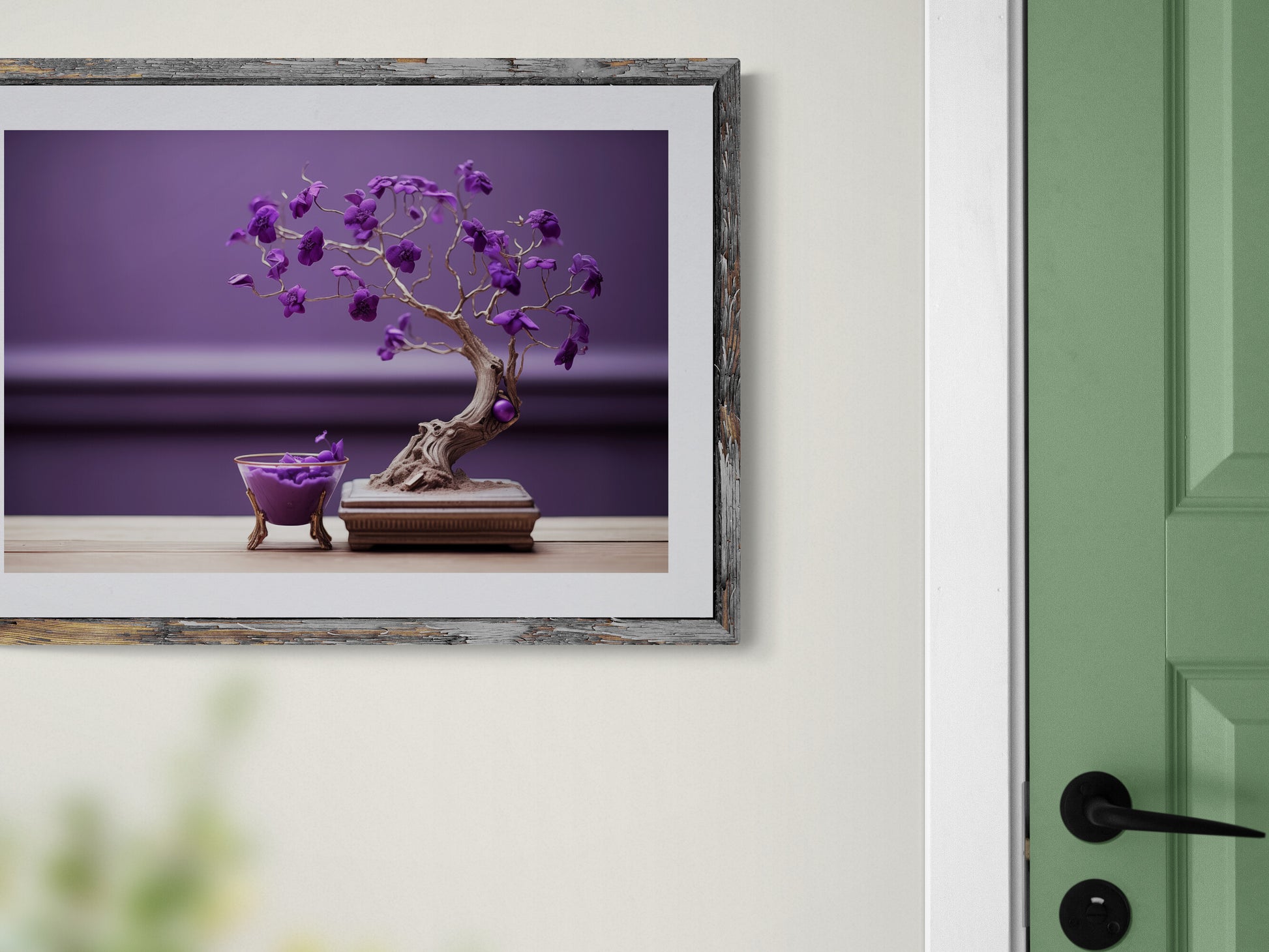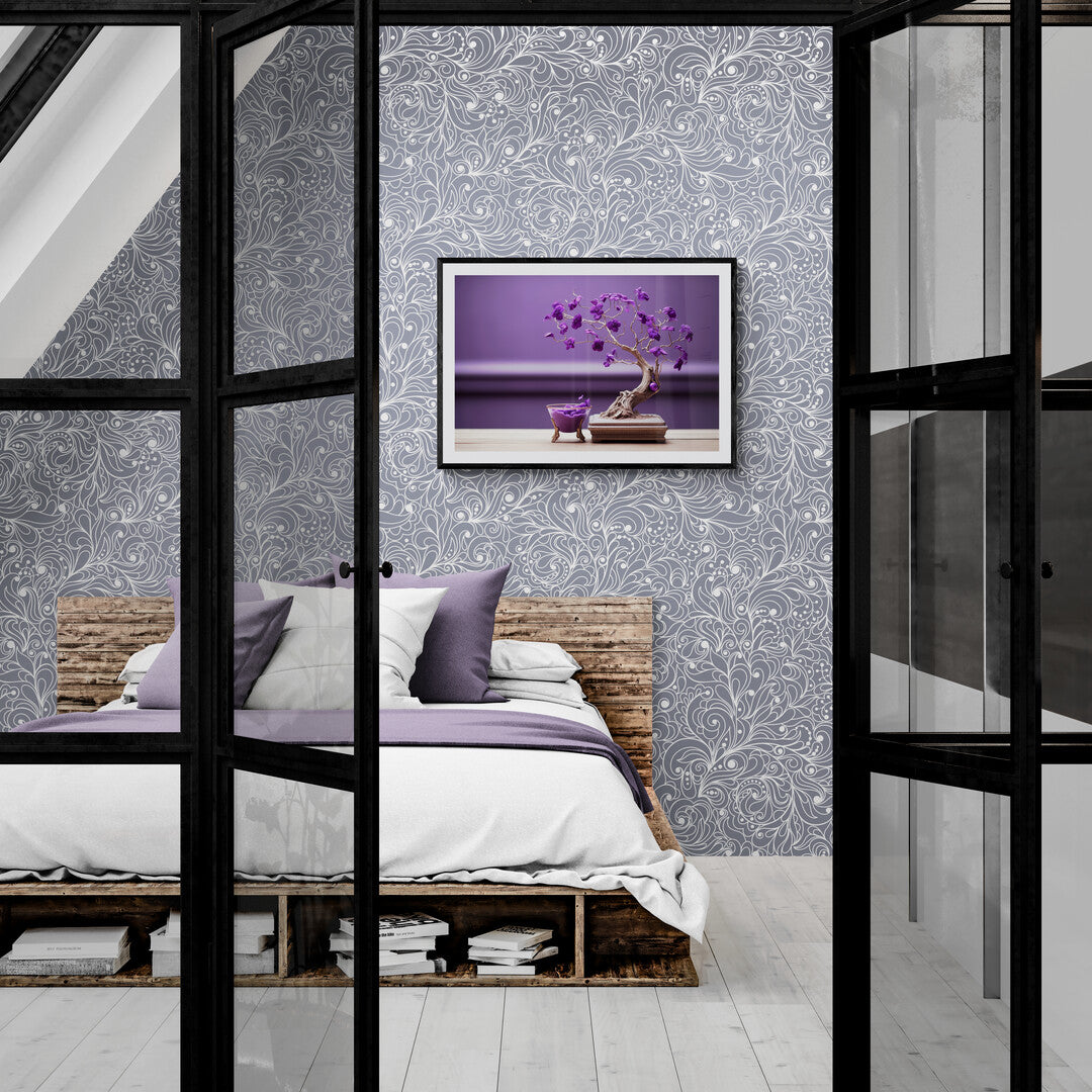 Ein kunstvoll inszenierter Bonsai-Baum mit violetten Blüten steht auf einer edlen, hölzernen Basis. Die filigranen Äste winden sich elegant in verschiedene Richtungen und tragen leuchtende Blüten in einem satten Lilaton. Daneben steht eine kleine Schale auf zierlichen, goldenen Beinen, gefüllt mit der gleichen violetten Blütenmasse, als ob der Baum seine Blüten verliert. Der Hintergrund ist in einem harmonischen Violett gehalten, wodurch das Motiv eine fast surrealistische Ästhetik erhält.