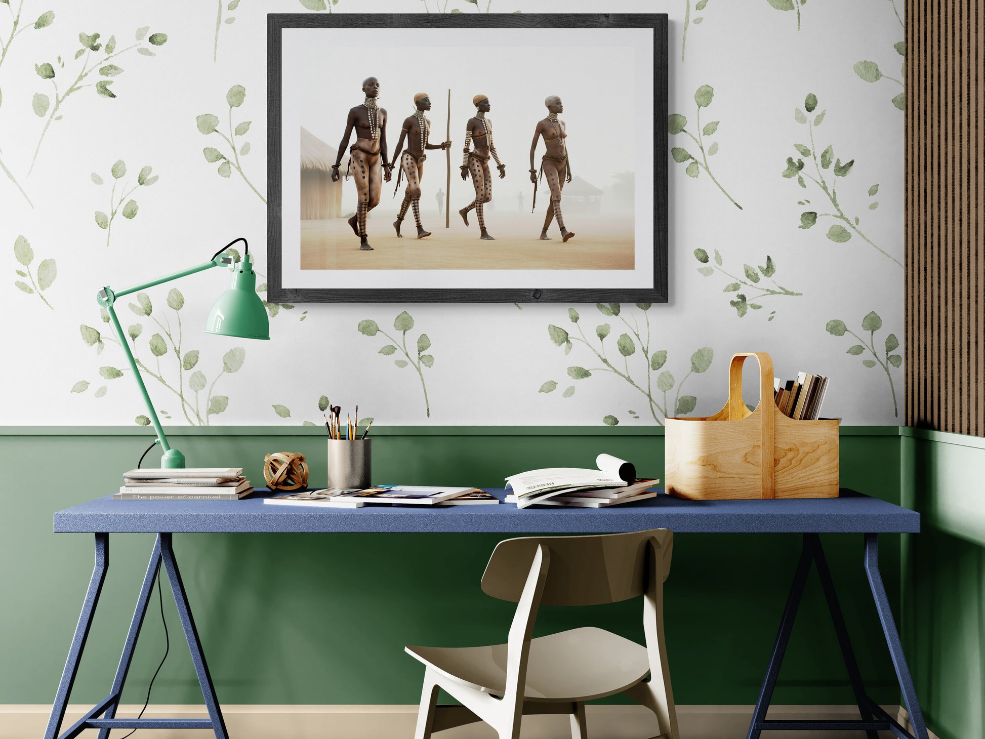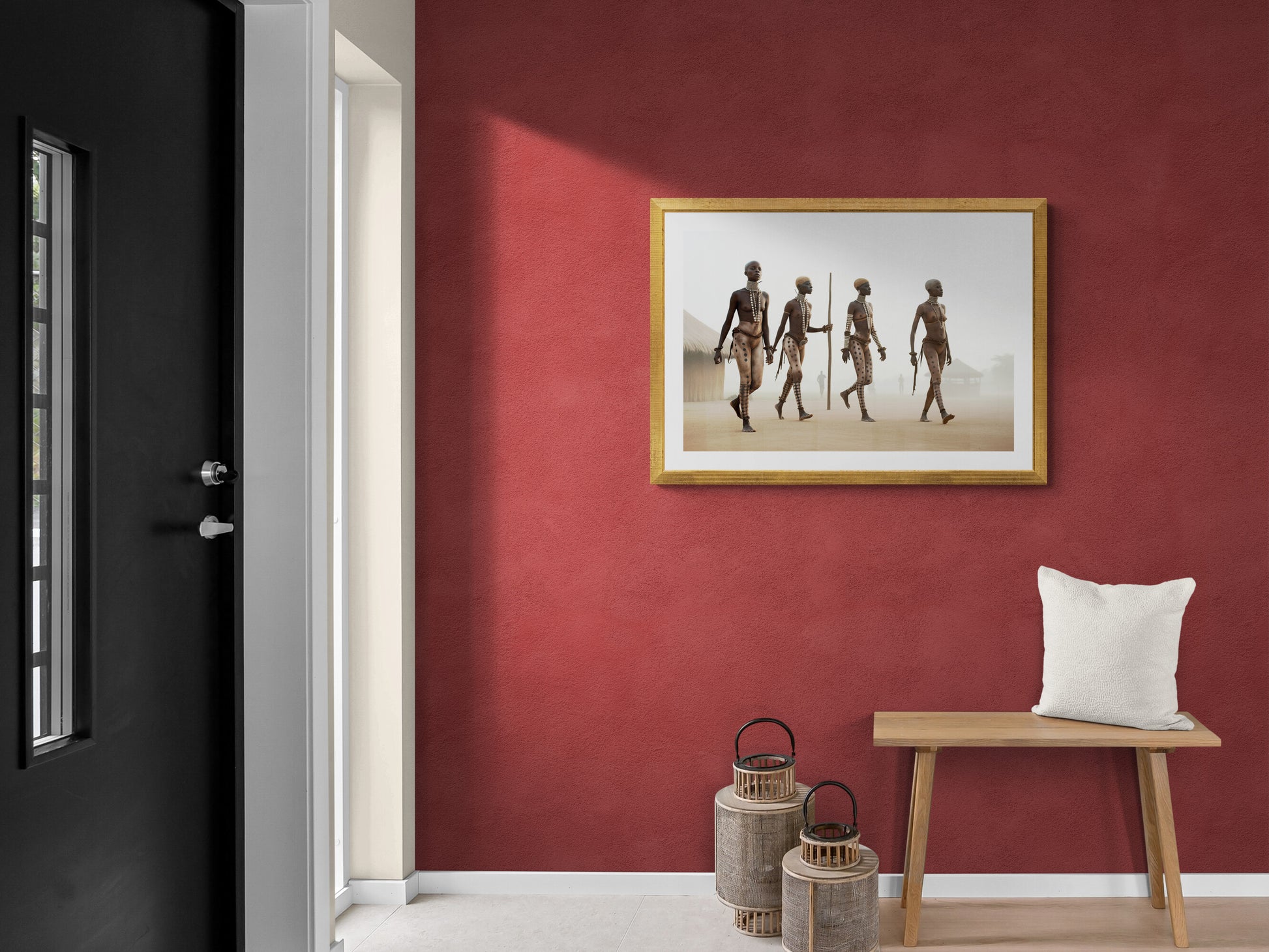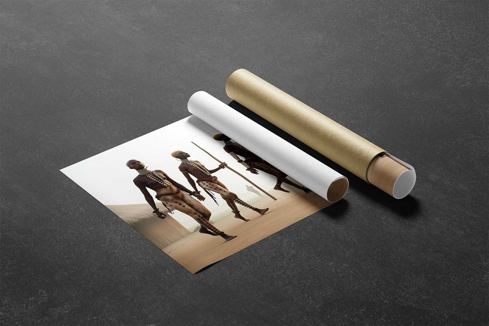 „Nuba Queen #1“ zeigt vier Frauen, die in einer Reihe schreiten. Die Körper sind mit großflächigen Tätowierungen überzogen, die zugleich an Stammesmuster und moderne Ornamentik erinnern. Der Schritt ist ruhig, der Blick nach vorn gerichtet. Die Szene verweist auf Leni Riefenstahls Fotografien des Nuba-Stammes, ist jedoch keine ethnografische Dokumentation, sondern eine digitale Interpretation. Kulturelle Erinnerung und moderne Fantasie überlagern sich zu einer neuen Ästhetik.