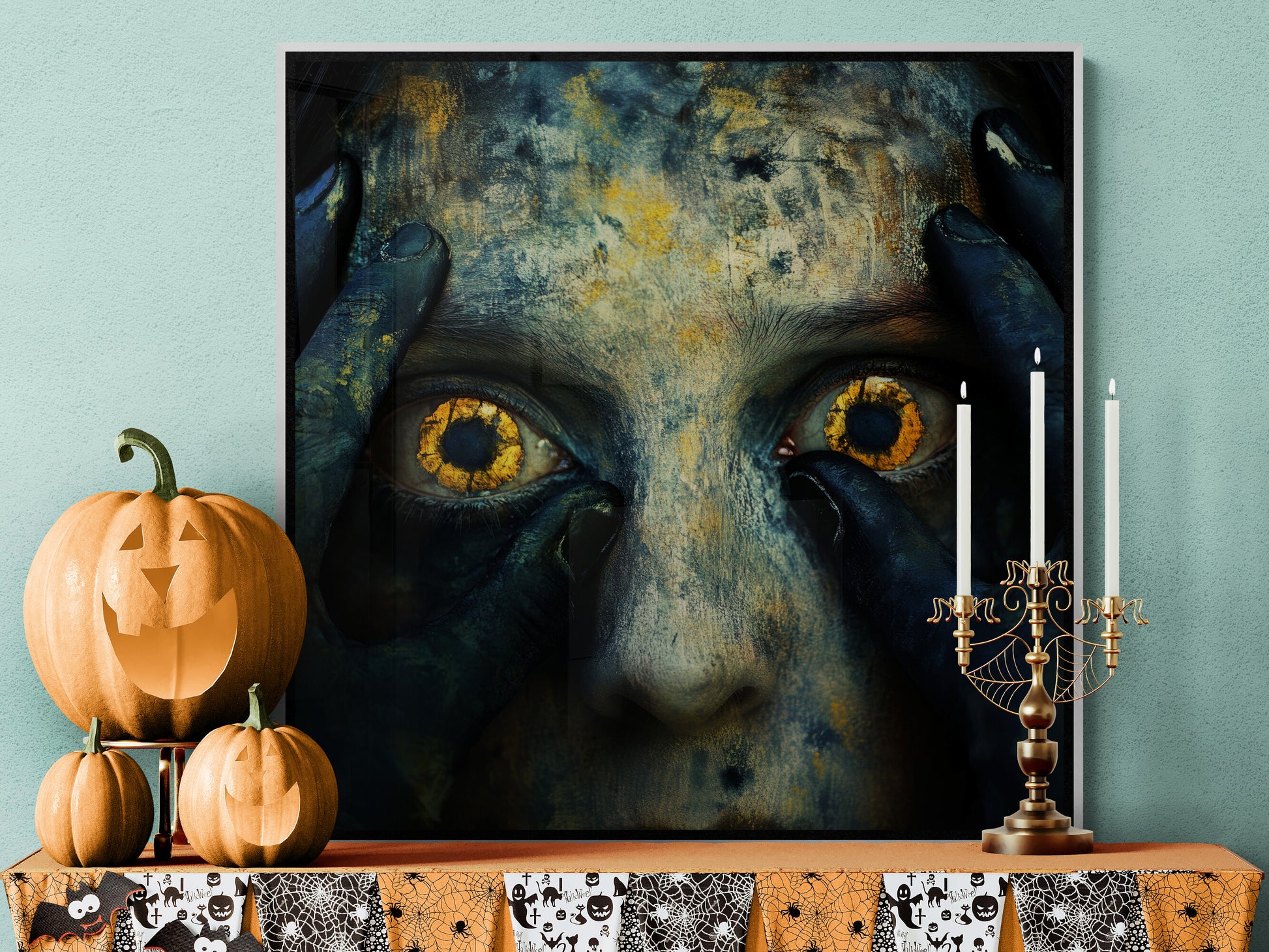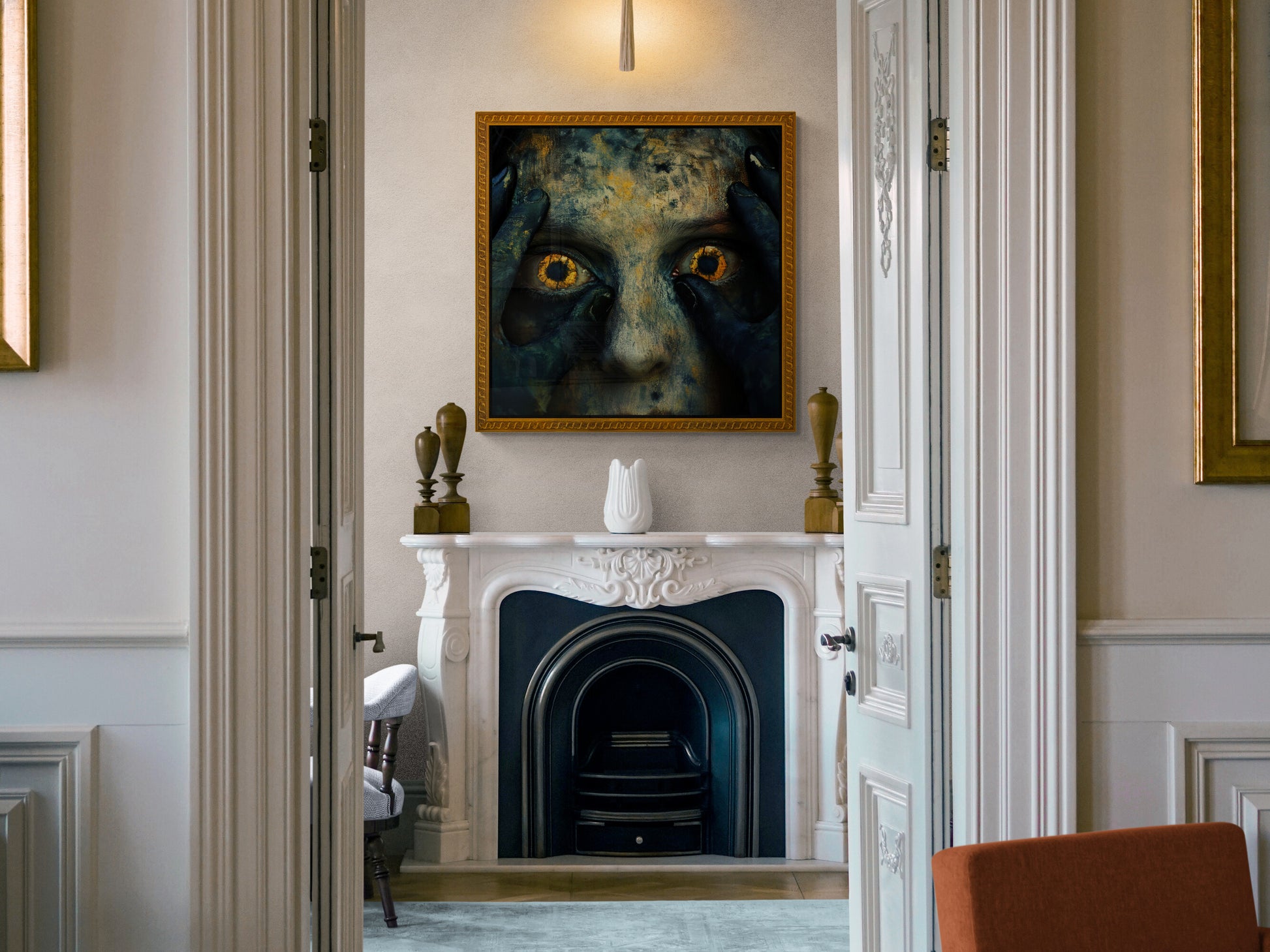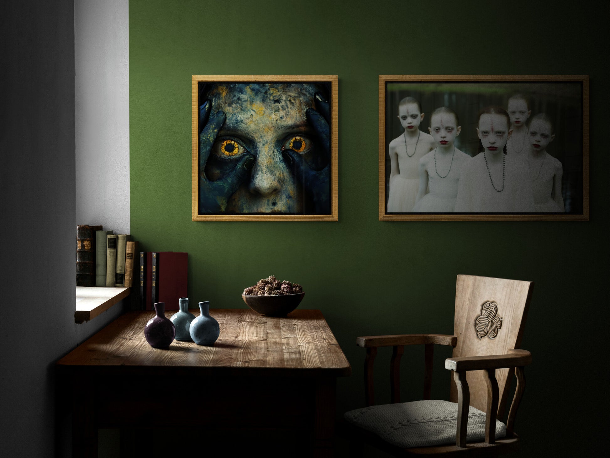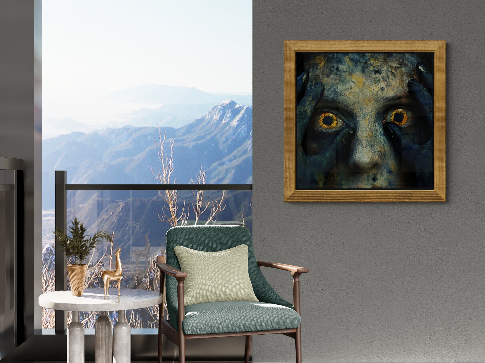 Ein Gesicht, überzogen von rissiger, malerisch aufgetragener Farbe in düsteren Blau- und Grüntönen, durchsetzt mit leuchtenden Goldfragmenten. Die Augen, weit aufgerissen und von bernsteinfarbenem, gesprungenem Licht durchzogen, scheinen vor Schock zu erstarren. Schwarze, bemalte Hände halten das Gesicht fest – nicht als Schutz, sondern als Ausdruck innerer Zerrissenheit. Dieses Bild ist mehr als ein Porträt: Es ist das visuelle Echo jener Angst, die viele traditionelle Künstler empfinden, wenn ihre jahrzehntelange Handwerkskunst plötzlich mit der kalten, fremdartigen Präzision künstlicher Intelligenz konkurrieren muss. Ein stummes Aufschreien, festgehalten in digitaler Farbe.