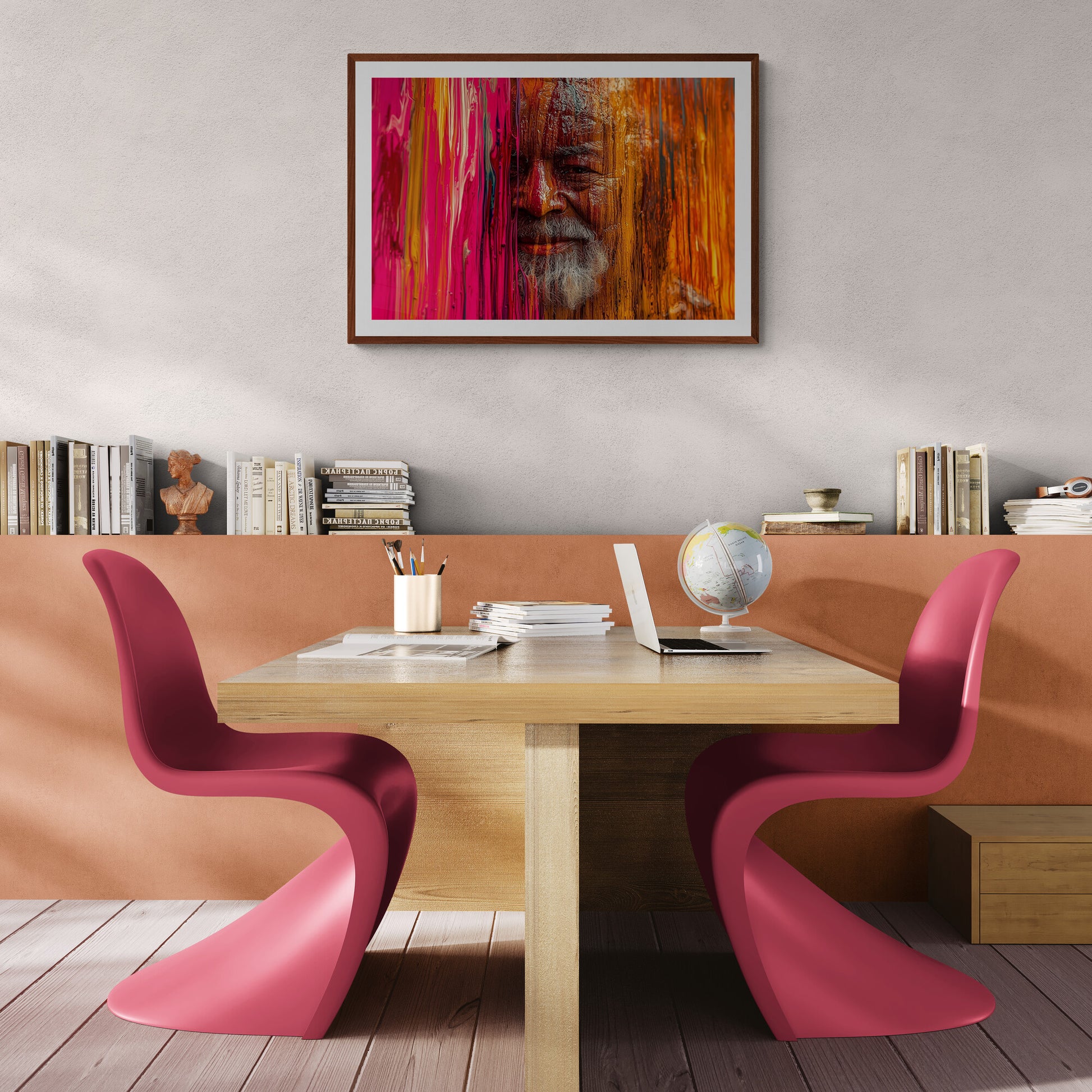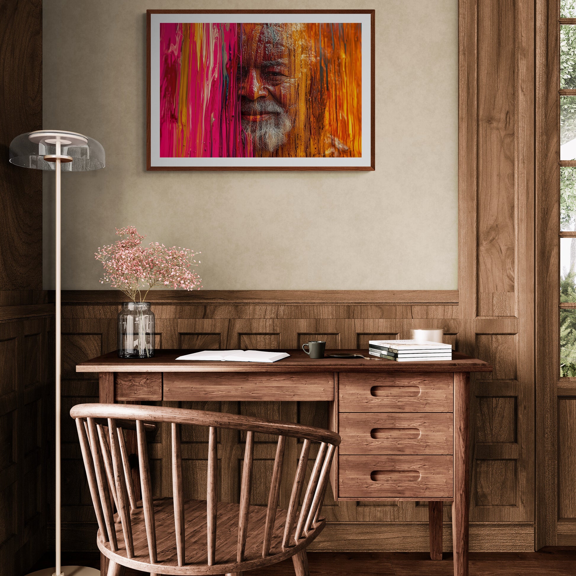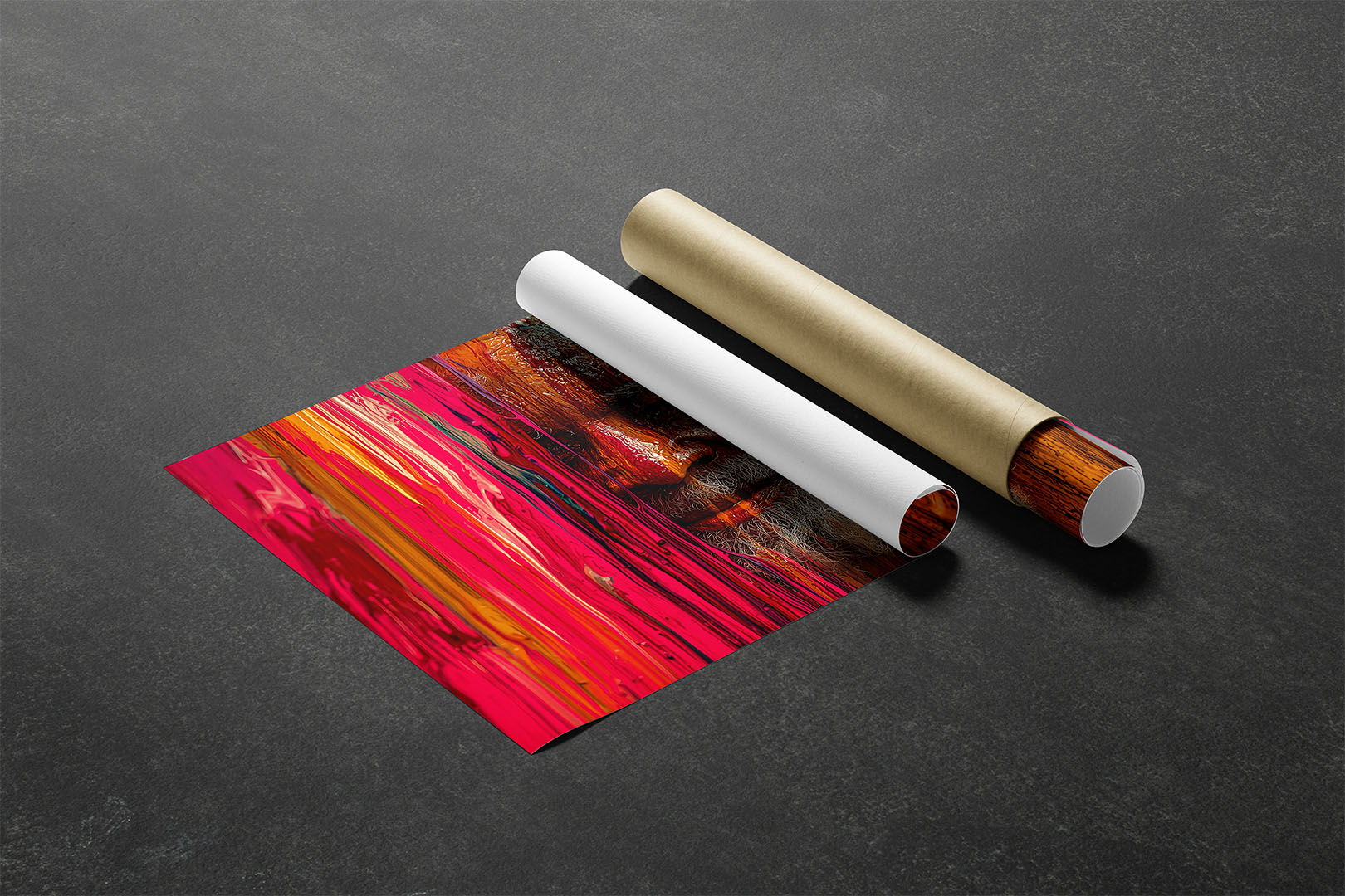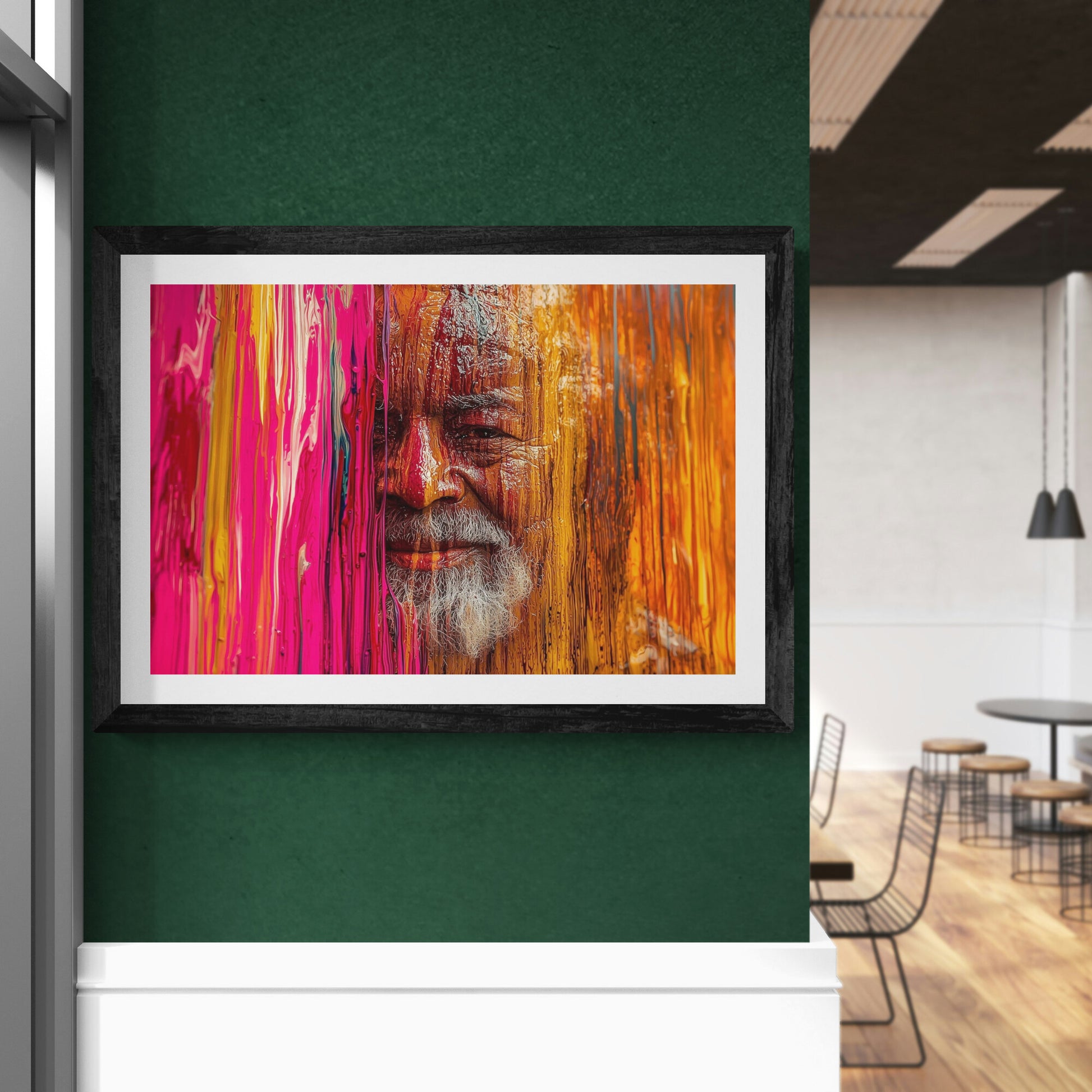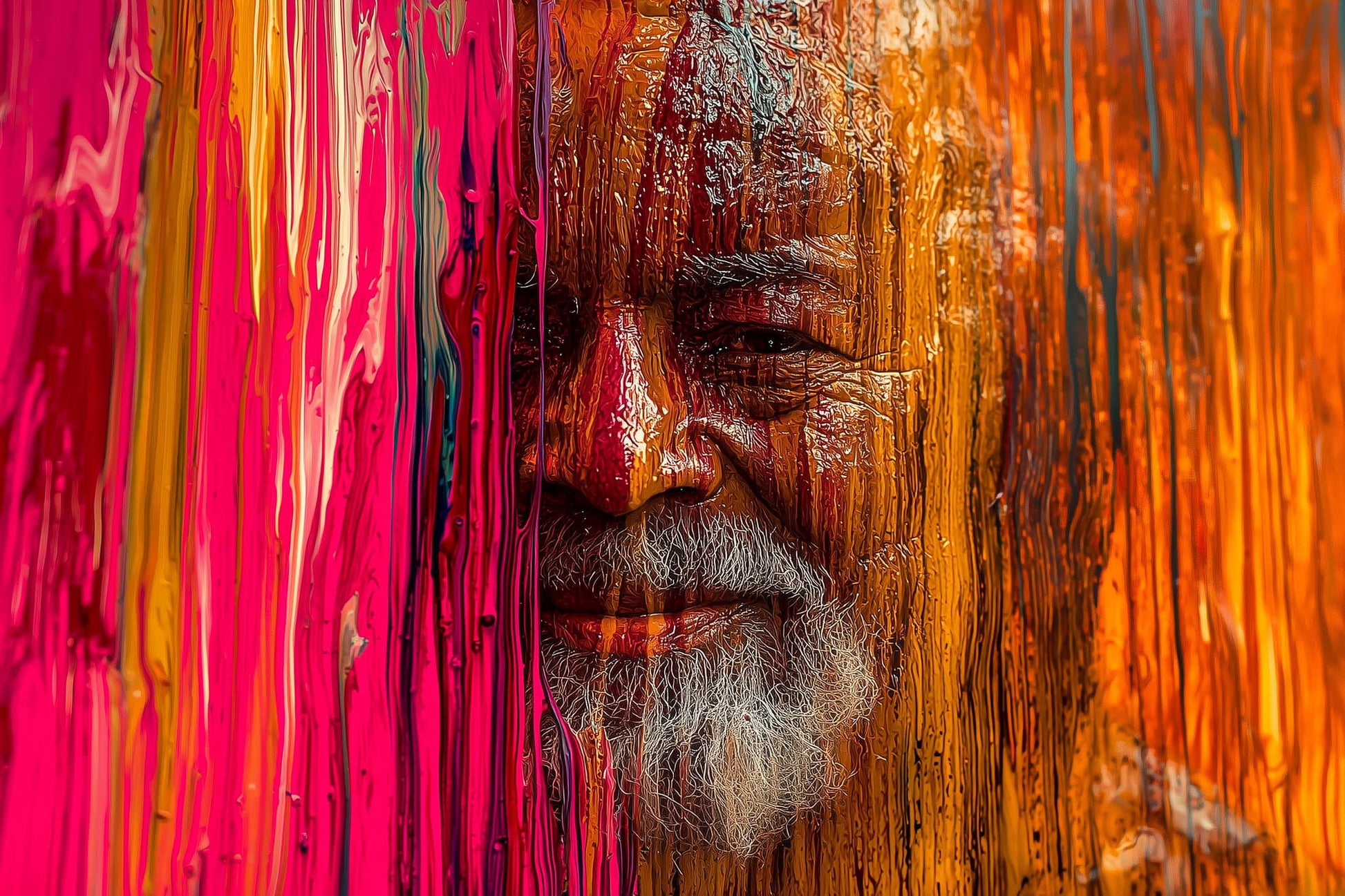 Ein weiser alter Mann taucht aus einem Meer aus fließender Farbe auf – sein Gesicht halb verborgen hinter einer leuchtenden Wand aus Rot, Pink und Orange. Die Struktur der flüssigen Farbe scheint sich mit seiner Haut zu verbinden, als wäre er Teil des Kunstwerks selbst. Seine Augen strahlen Ruhe und Lebenserfahrung aus, während sein silberner Bart einen Kontrast zur warmen Farbpalette bildet. Eine kraftvolle Darstellung von Identität, Weisheit und der Verschmelzung von Mensch und Kunst.
