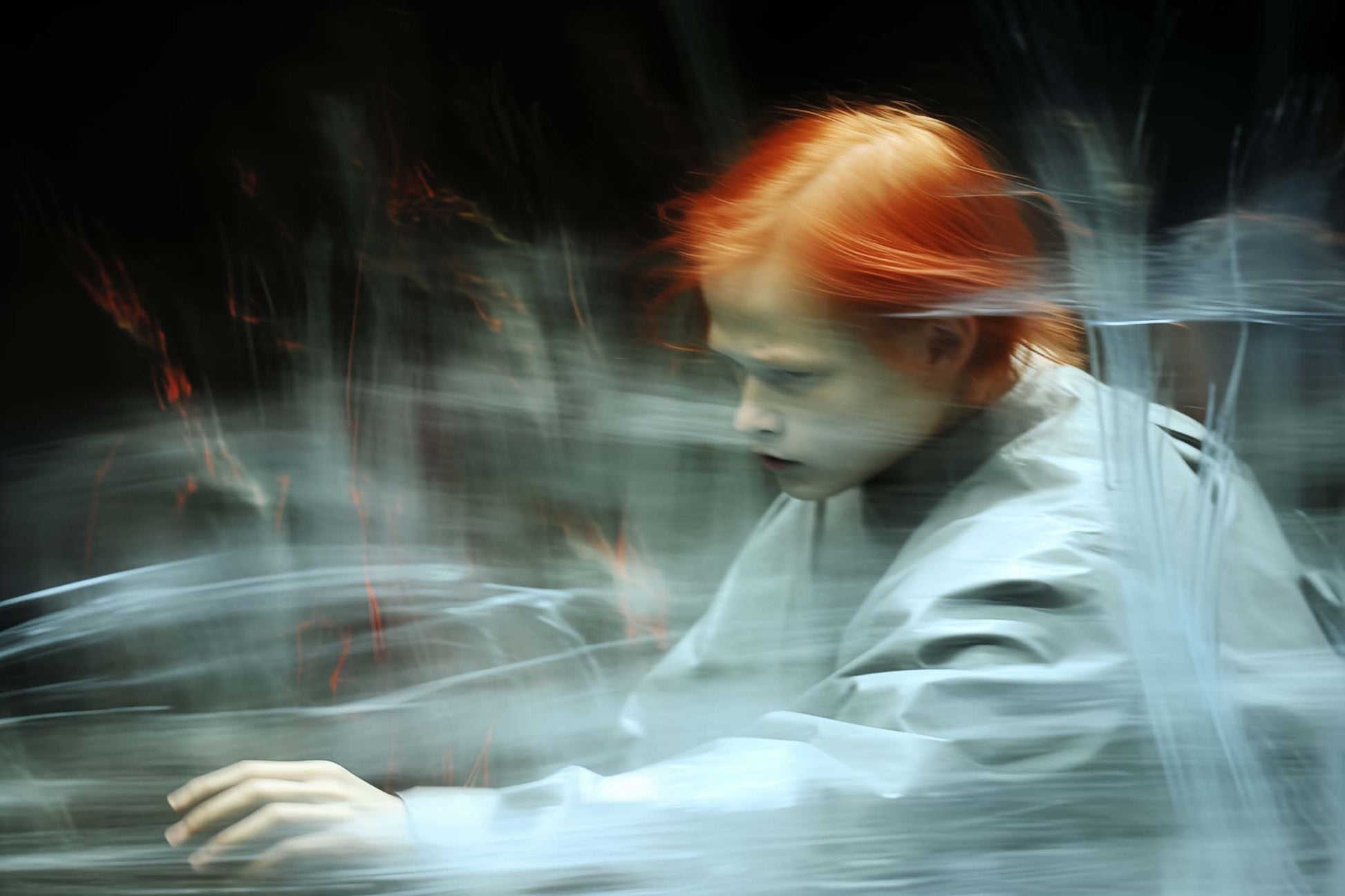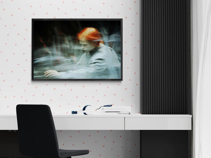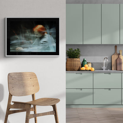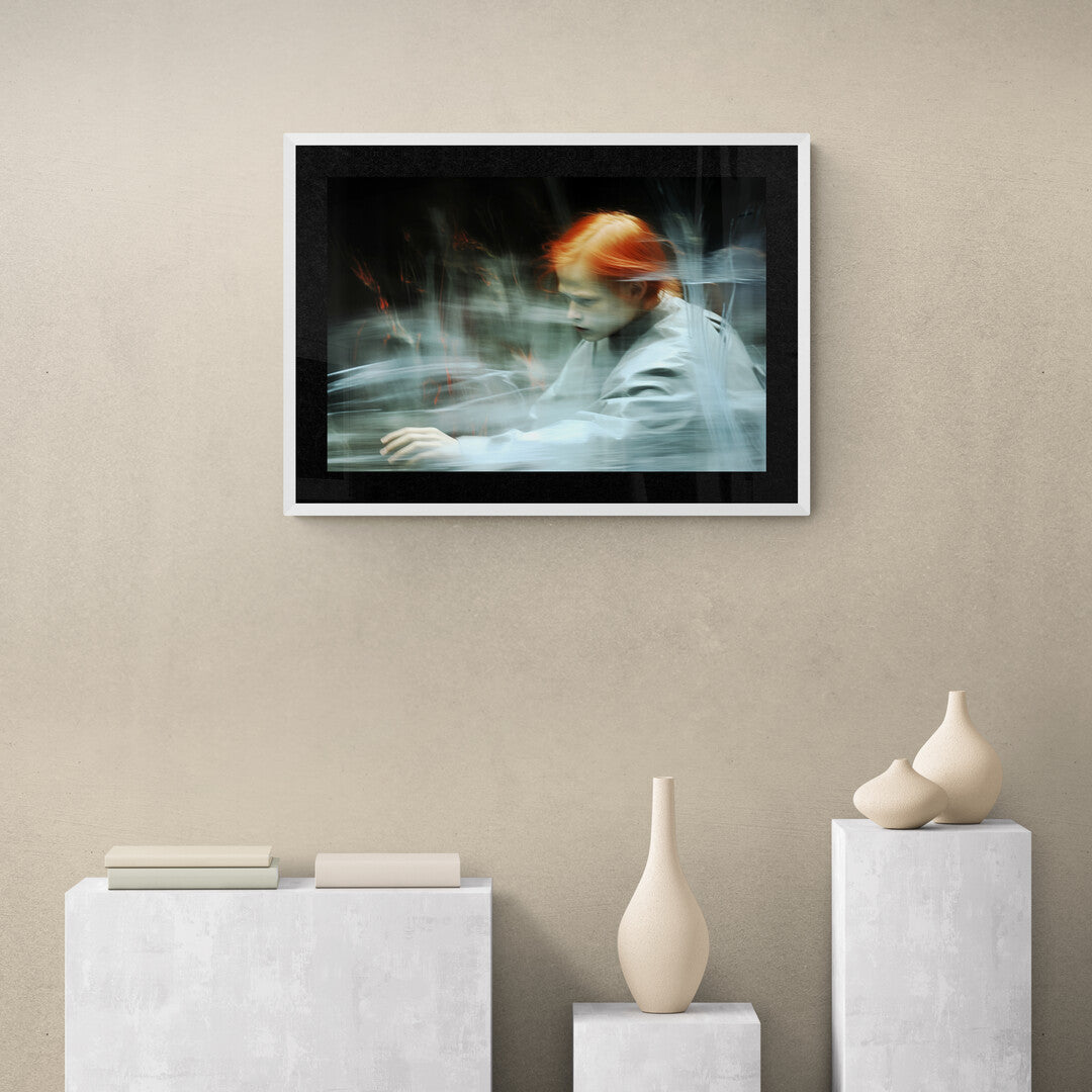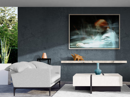 Ein faszinierendes Porträt mit surrealer Dynamik: Eine Person mit leuchtend orangefarbenem Haar bewegt sich durch einen Raum, umgeben von fließenden, nebelartigen Strukturen. Die Unschärfe und die Strichbewegungen verleihen der Szene eine fast traumhafte Qualität, als ob der Moment zwischen den Dimensionen eingefangen wurde. Kühle Blautöne und diffuse Lichtspuren kontrastieren mit der Wärme der Haare, wodurch eine geheimnisvolle Spannung entsteht.