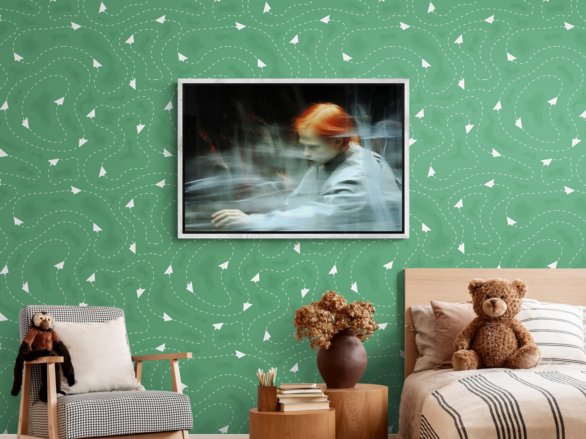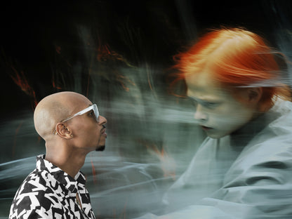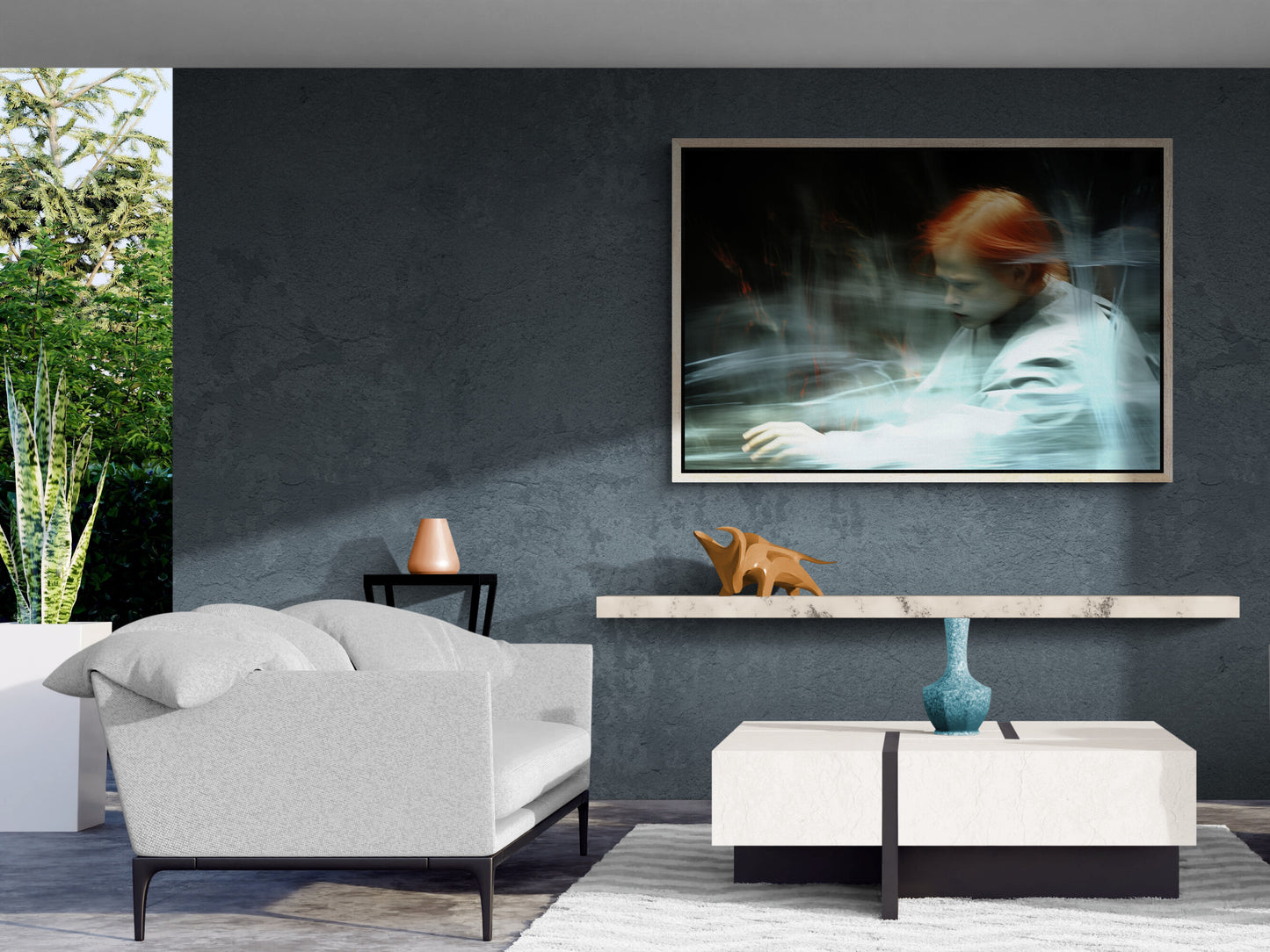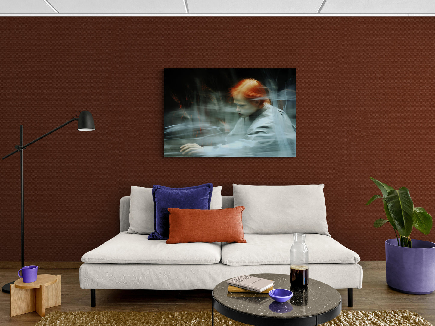 Ein faszinierendes Porträt mit surrealer Dynamik: Eine Person mit leuchtend orangefarbenem Haar bewegt sich durch einen Raum, umgeben von fließenden, nebelartigen Strukturen. Die Unschärfe und die Strichbewegungen verleihen der Szene eine fast traumhafte Qualität, als ob der Moment zwischen den Dimensionen eingefangen wurde. Kühle Blautöne und diffuse Lichtspuren kontrastieren mit der Wärme der Haare, wodurch eine geheimnisvolle Spannung entsteht.