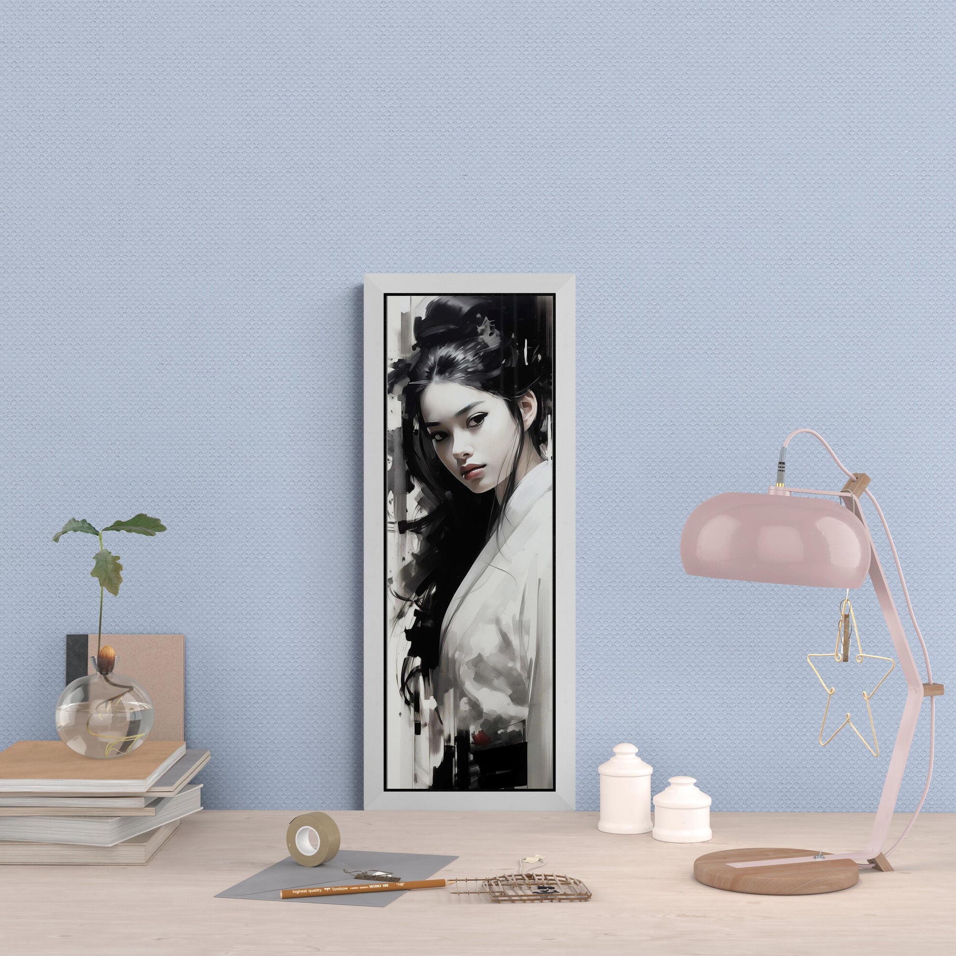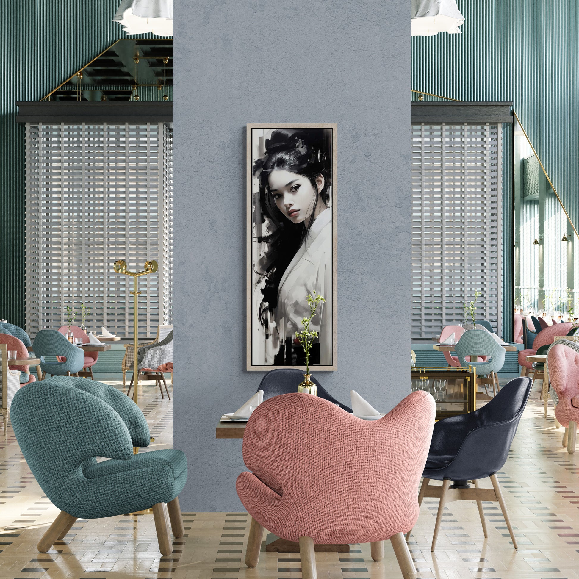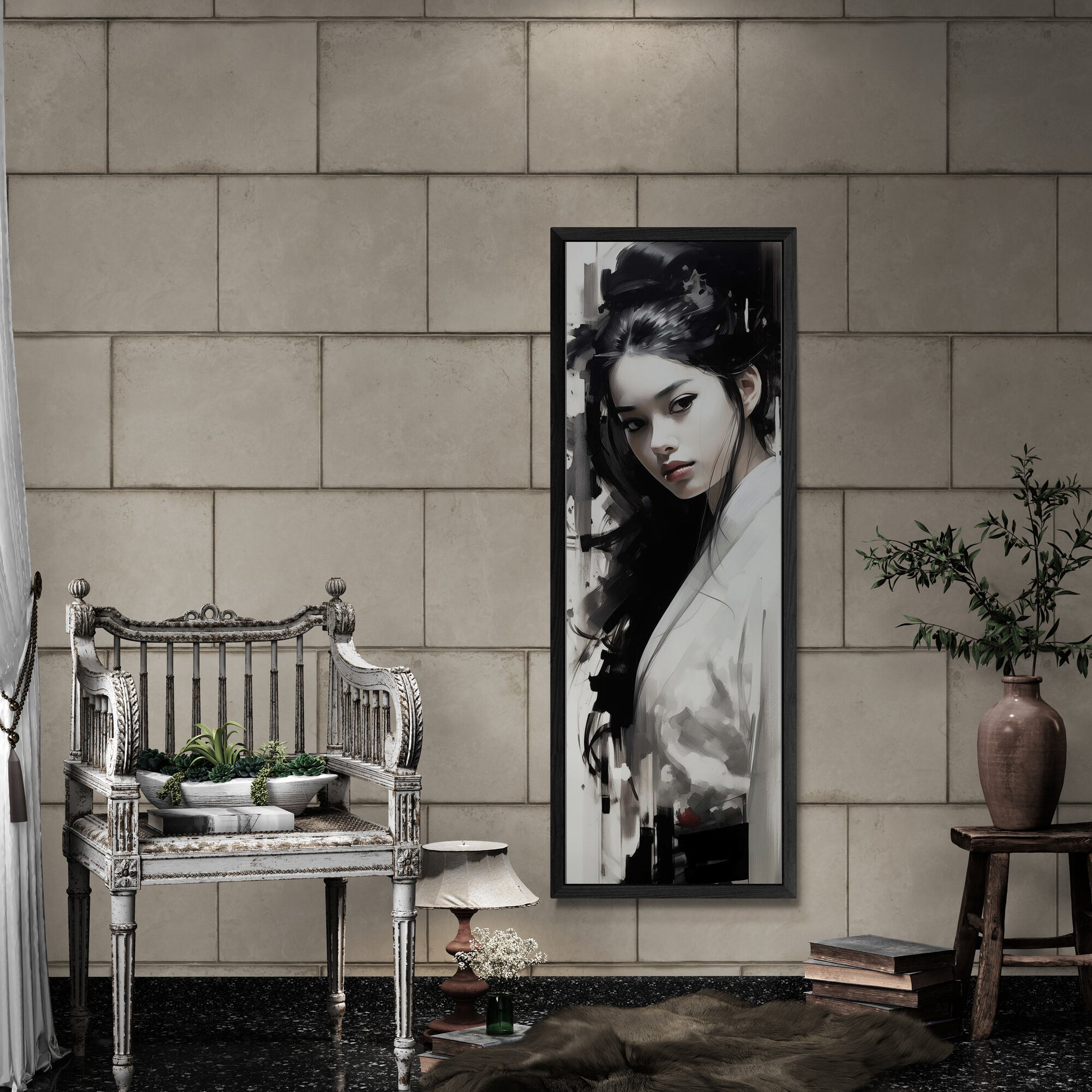 Ein digitales Porträt im Panorama-Hochformat zeigt eine junge asiatische Frau mit langem, schwarzem Haar in kunstvoller Hochsteckfrisur. Ihr Gesicht ist leicht abgewandt, der Blick jedoch direkt und durchdringend. Die monochrome Farbpalette reicht von tiefem Schwarz über Grautöne bis zu gebrochenem Weiß. Die Kleidung erinnert an ein traditionelles Gewand, modern interpretiert. Pinselstriche und abstrakte Strukturen im Hintergrund verstärken die künstlerische Wirkung des Motivs. Trotz digitaler Entstehung wirkt das Bild malerisch, beinahe wie ein Tintenporträt.
