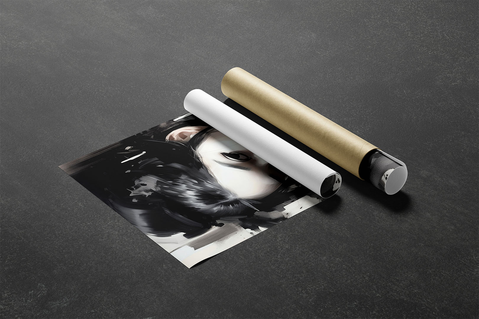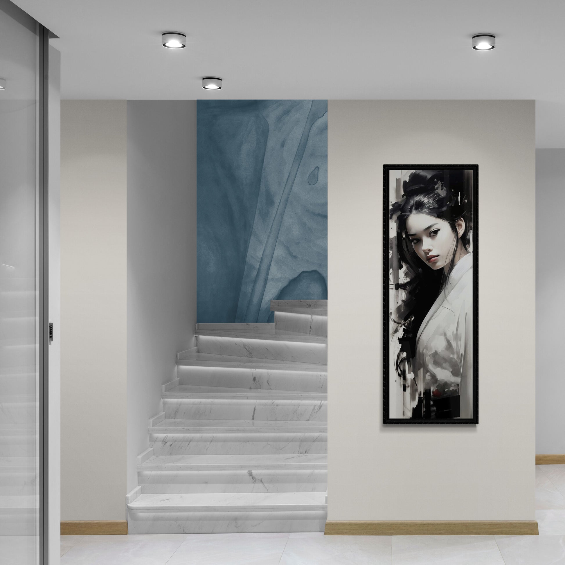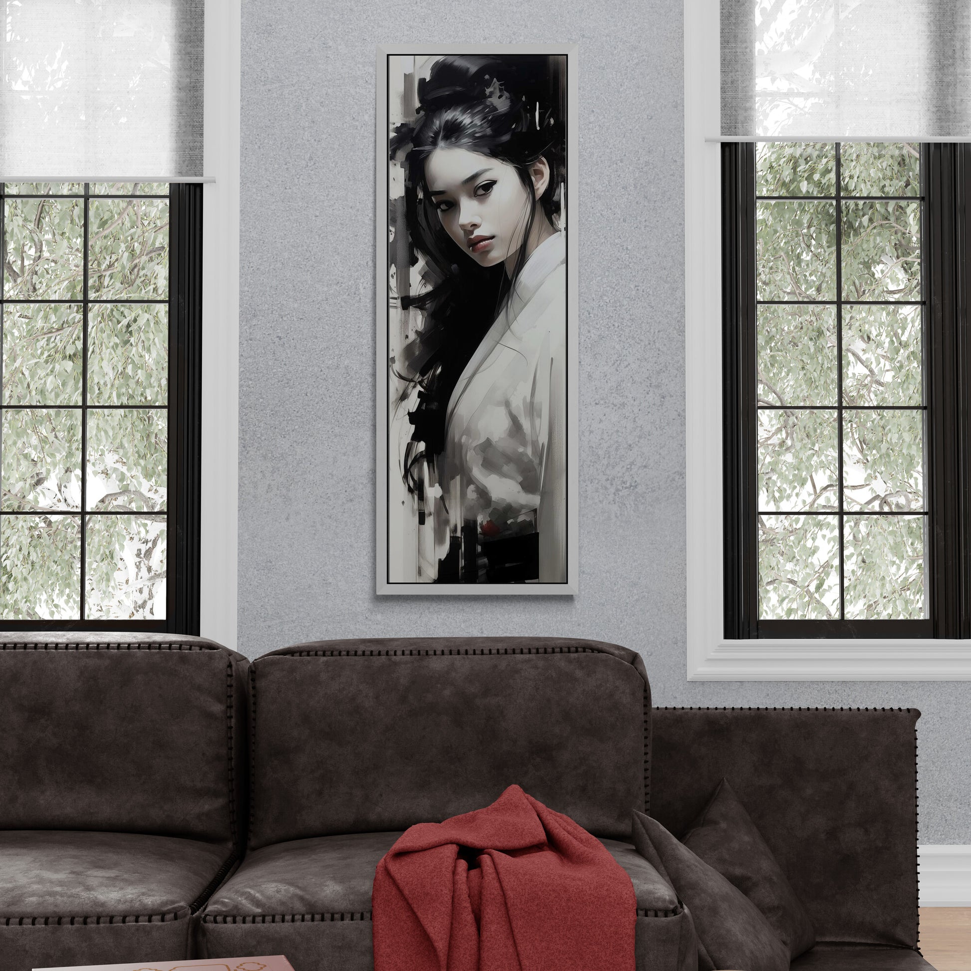 Ein digitales Porträt im Panorama-Hochformat zeigt eine junge asiatische Frau mit langem, schwarzem Haar in kunstvoller Hochsteckfrisur. Ihr Gesicht ist leicht abgewandt, der Blick jedoch direkt und durchdringend. Die monochrome Farbpalette reicht von tiefem Schwarz über Grautöne bis zu gebrochenem Weiß. Die Kleidung erinnert an ein traditionelles Gewand, modern interpretiert. Pinselstriche und abstrakte Strukturen im Hintergrund verstärken die künstlerische Wirkung des Motivs. Trotz digitaler Entstehung wirkt das Bild malerisch, beinahe wie ein Tintenporträt.