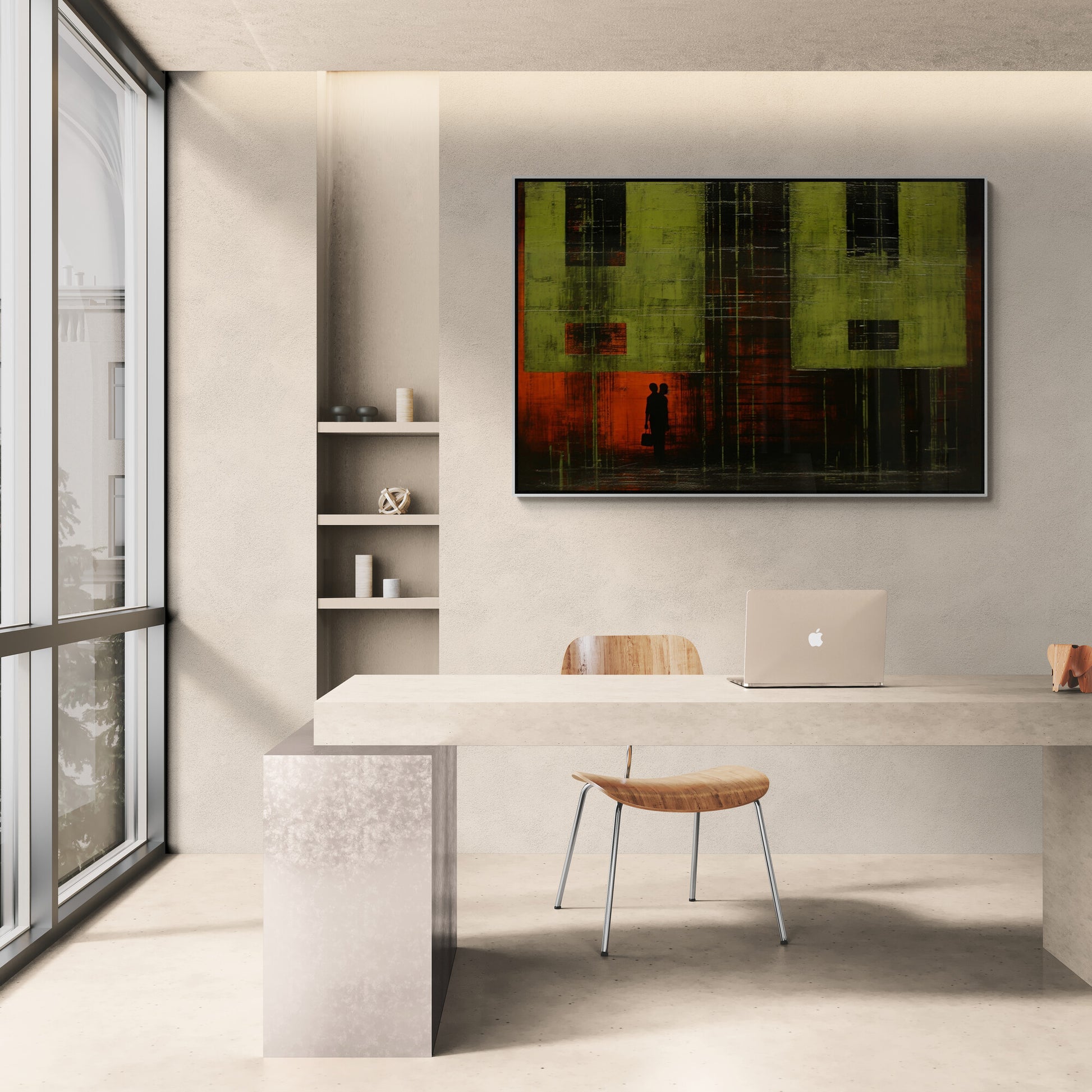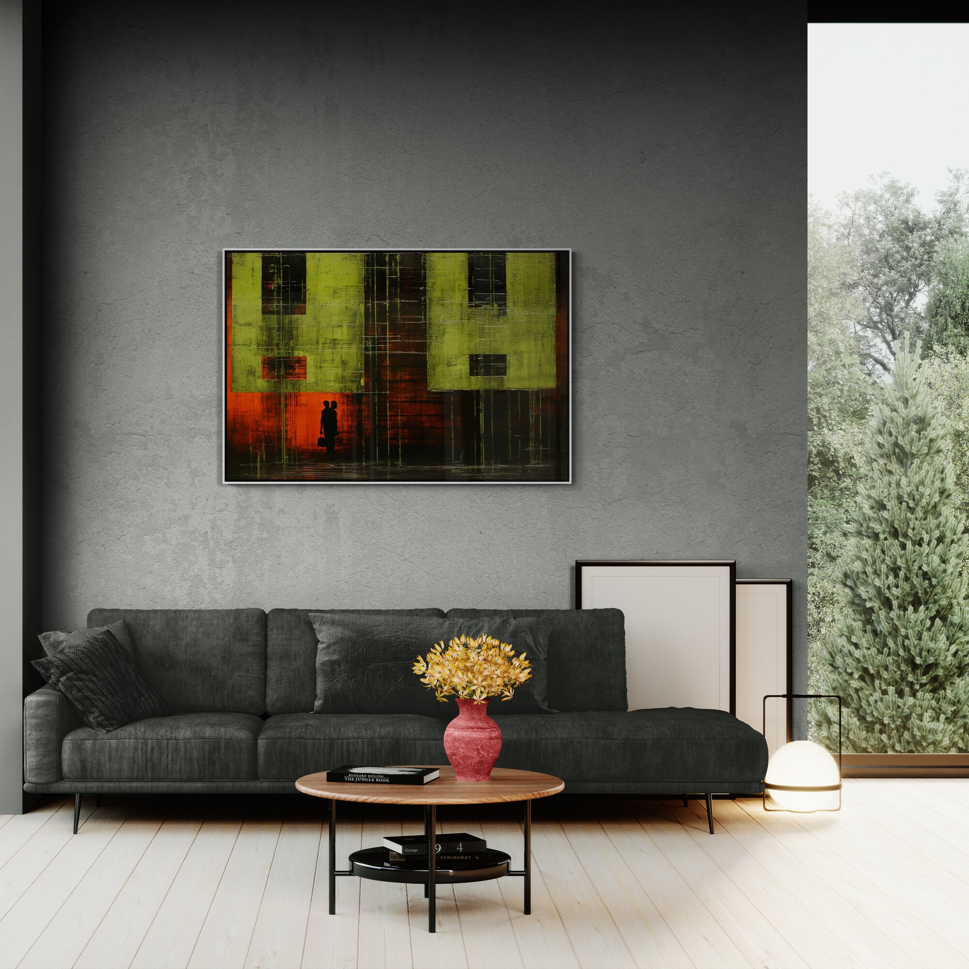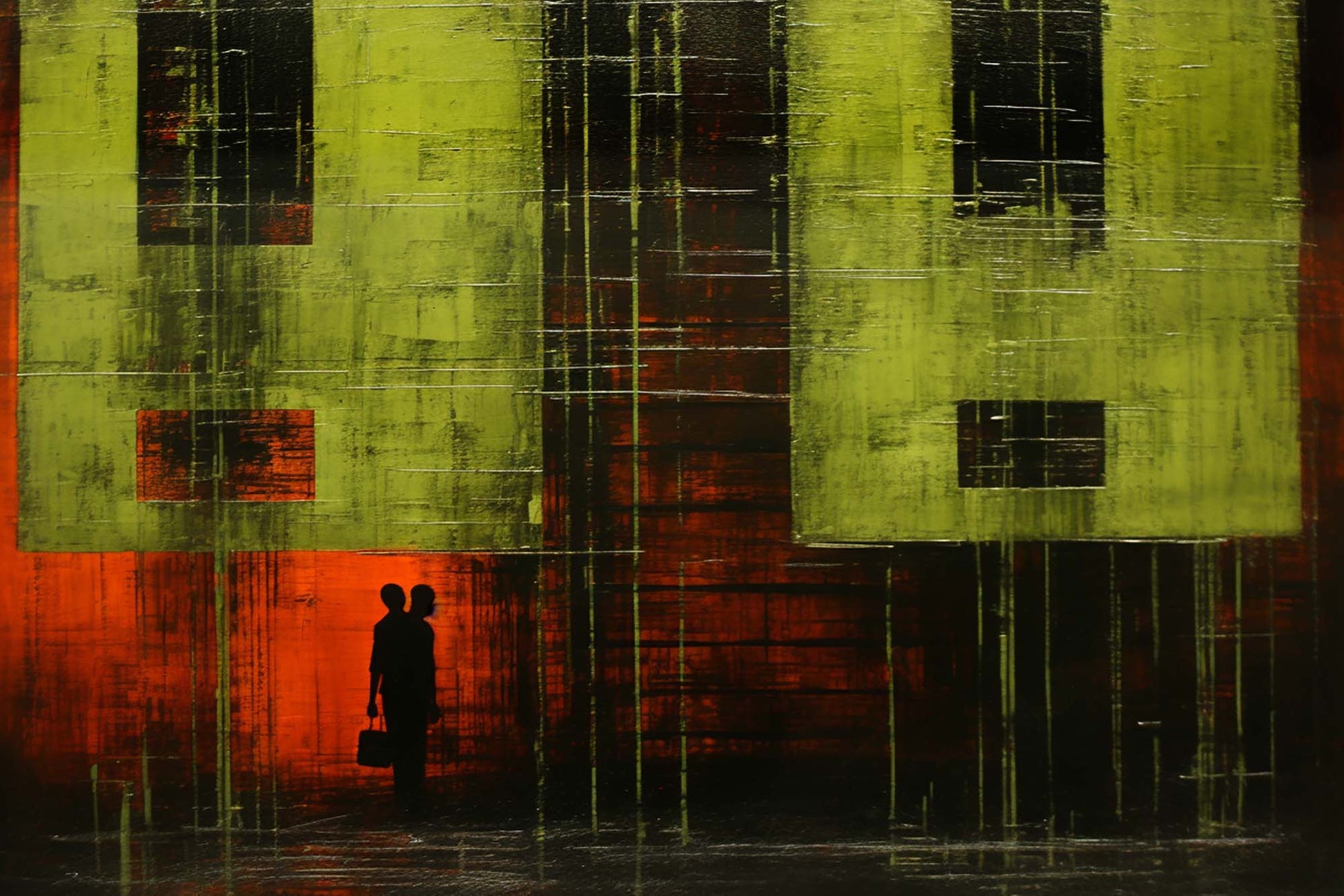 Wie ein Gedanke, der sich in Schichten aus Farbe und Struktur verfängt: „Thunder in my Mind“ ist eine Hommage an die innere Spannung zwischen Ordnung und Emotion. Die streng vertikalen Linien erinnern an Fassaden, Raster, Systeme – doch dahinter pulsiert ein Glühen, ein Sturm aus Rot und Schwarz. Die kleinen Menschen am unteren Rand scheinen von der Wucht des Raums verschluckt zu werden, und doch behaupten sie sich – als Sinnbild des Denkens, das nicht zur Ruhe kommt. Ein Werk von stiller Gewalt, ideal für Räume, die Tiefe und Nachhall vertragen.